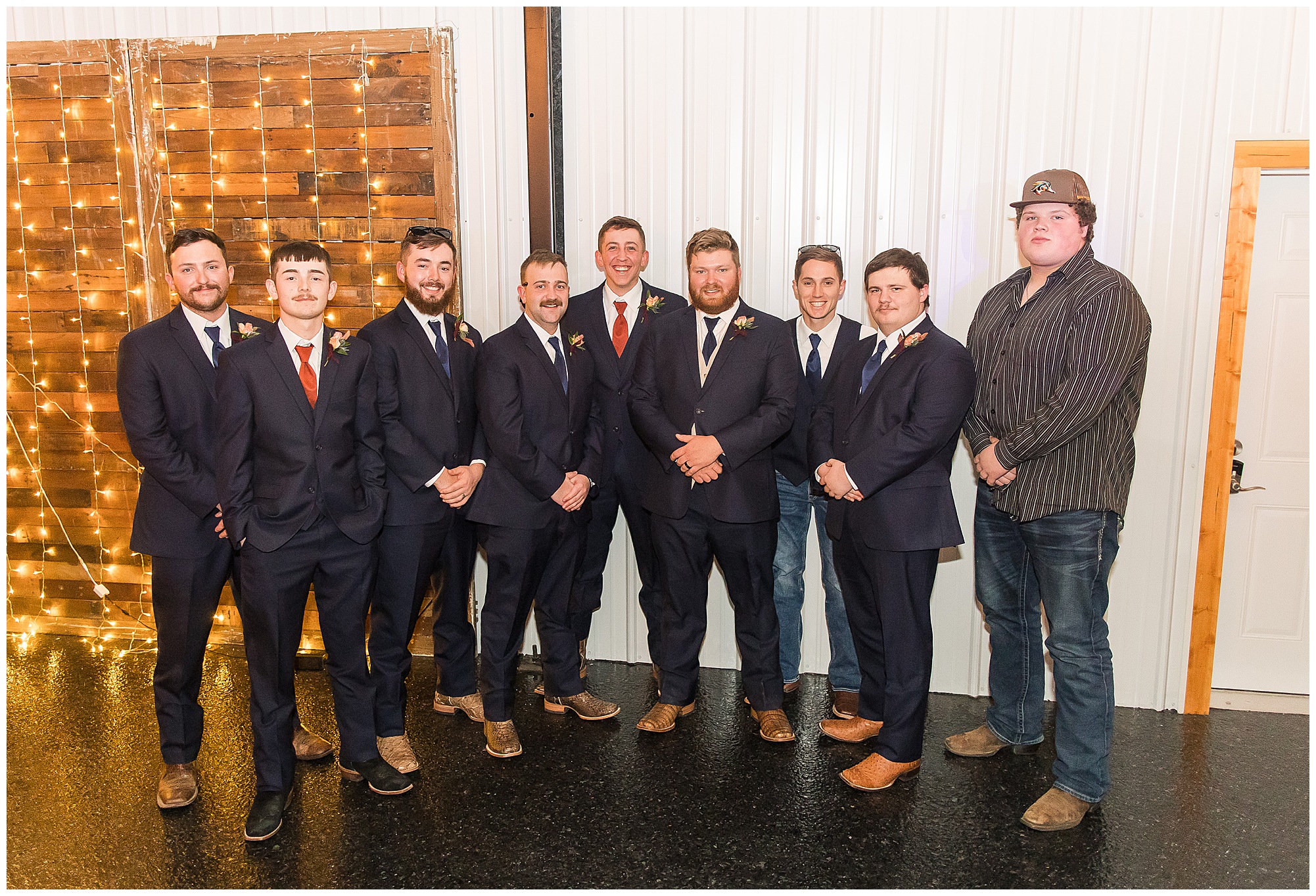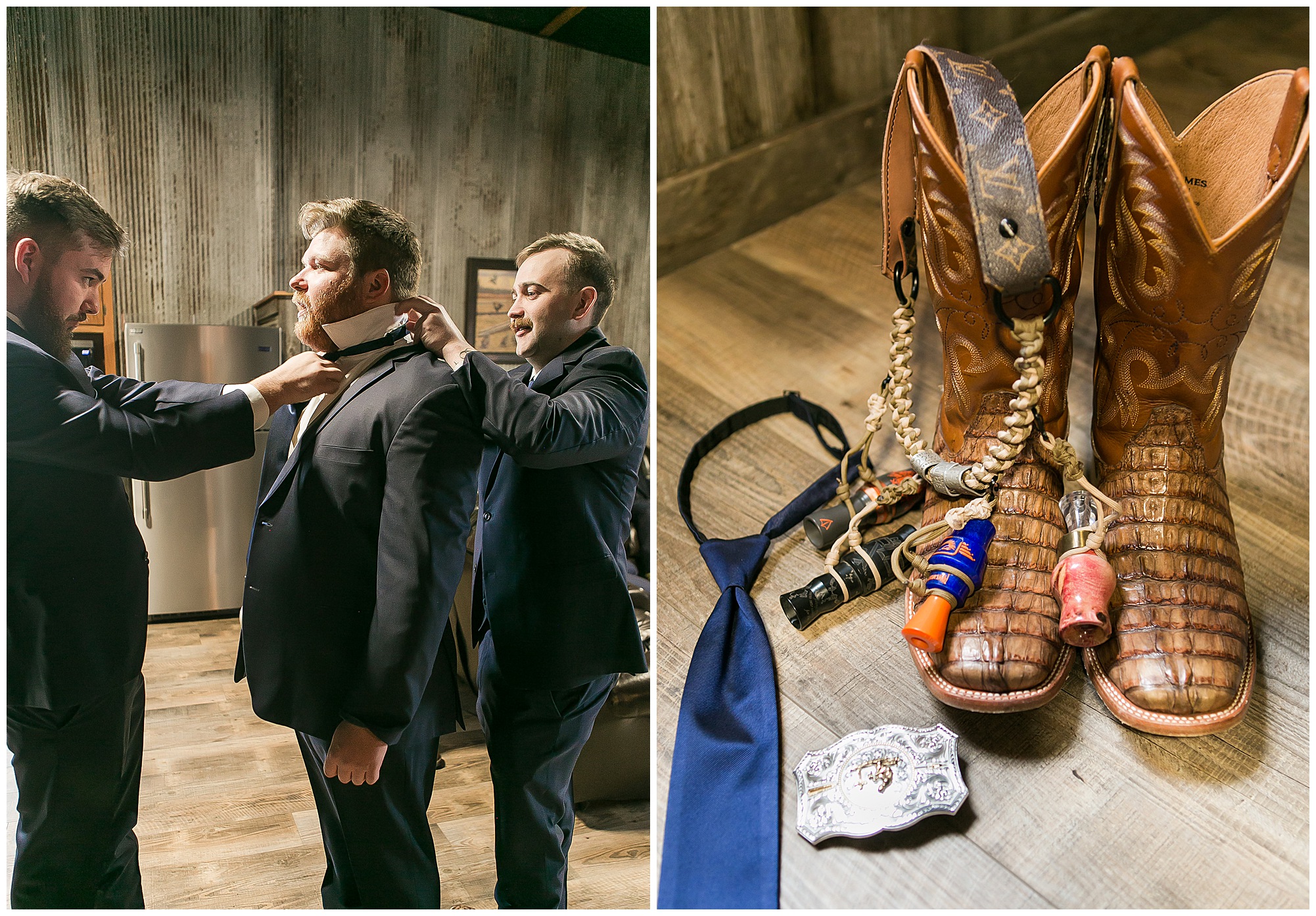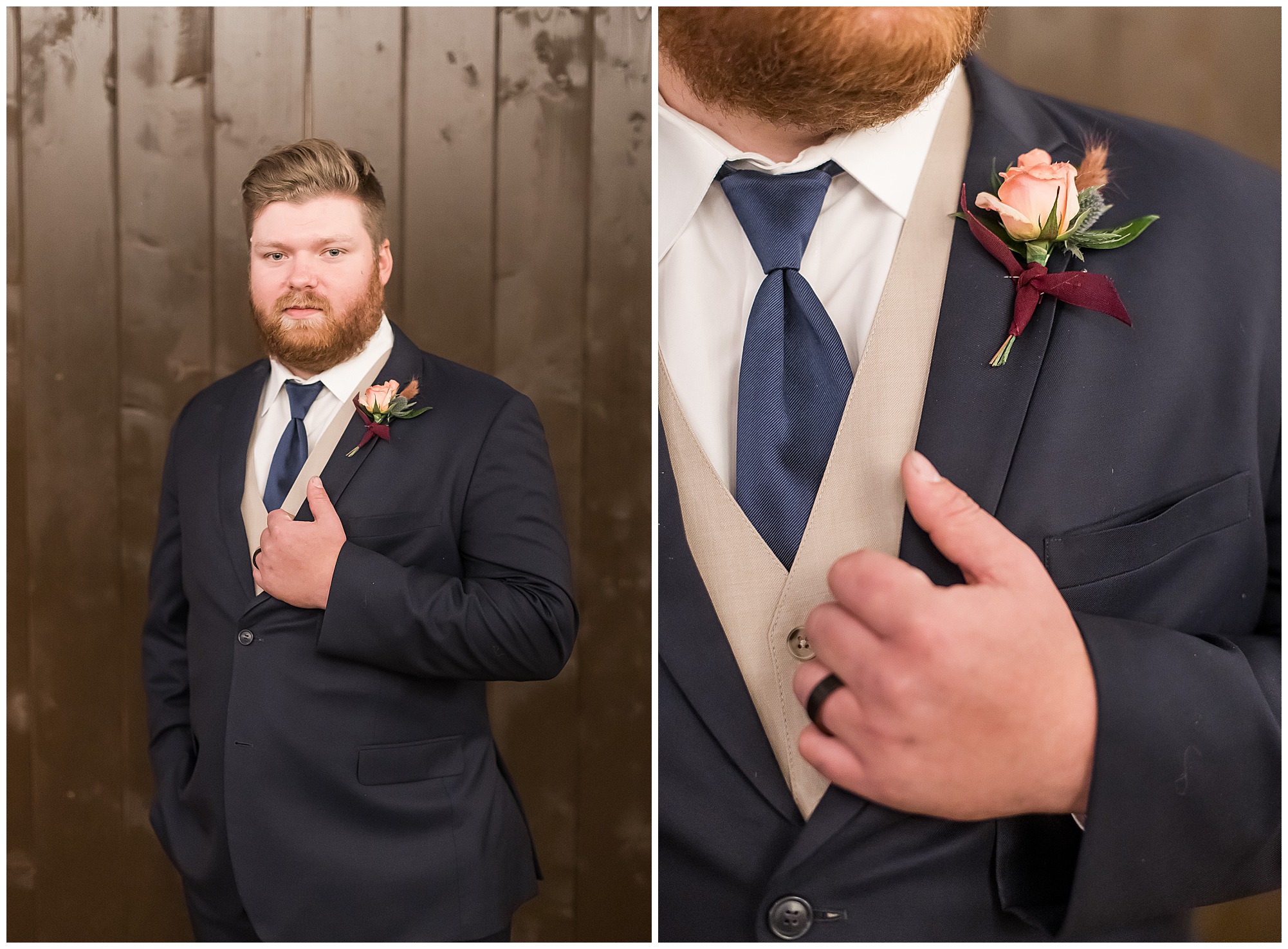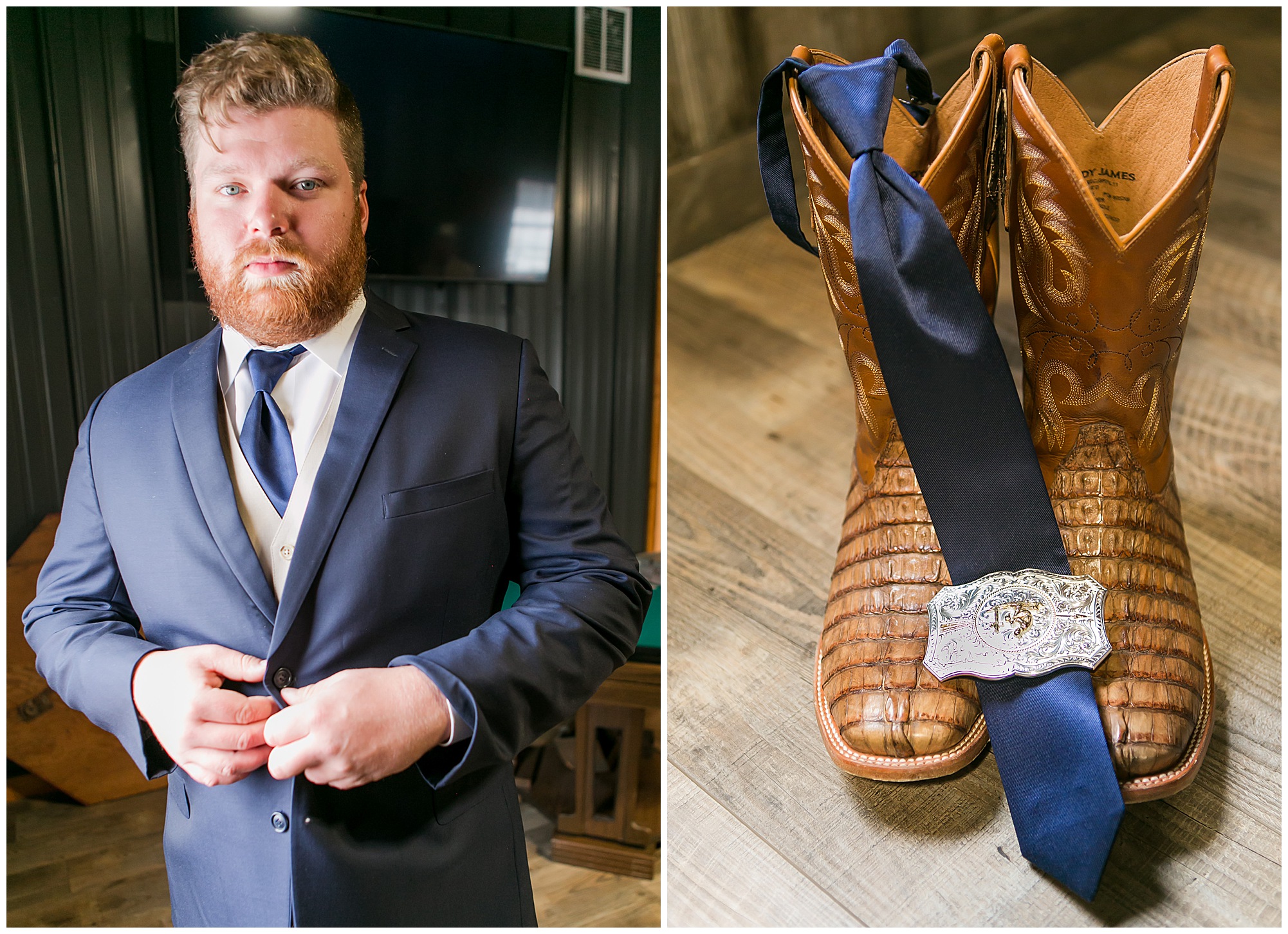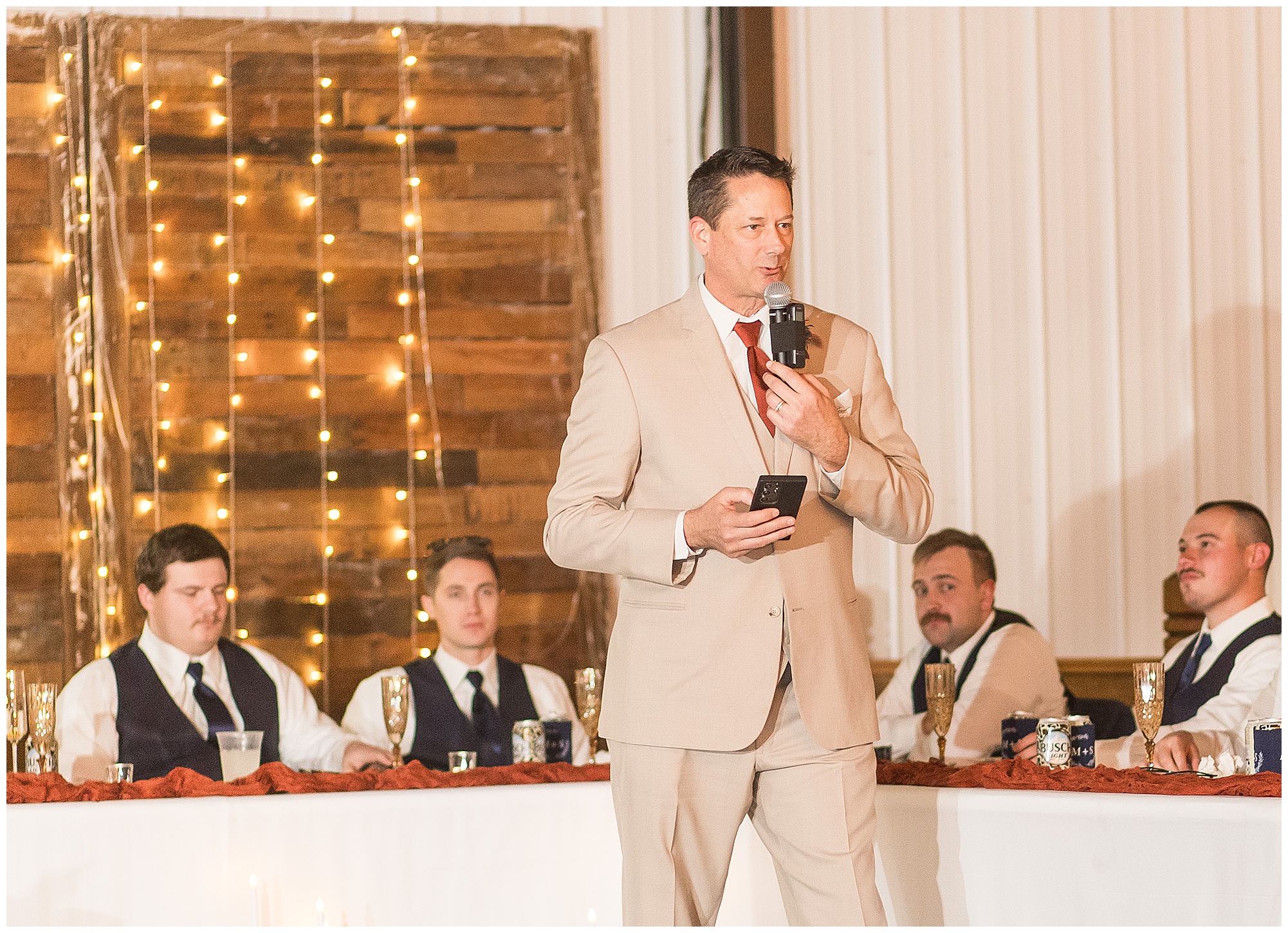 Mikaela and Scott’s wedding day the Saturday after Thanksgiving brought out some joyful emotions, a bunch of laughter among family and friends, plus a touch of winter magic! These two loved the feel The Rustic Venues in Girard, Illinois provided for their celebration. A space where both the bride and groom, along with all of their loved ones could get ready in the morning without running into each other. Plus an options for photos and their reception to host all of their most treasured people. My morning began with Mikaela and her ladies in the bridal suite as she was getting her hair done and the suite was bustling with all the last minute things the girls do on wedding day. This bride was fairly laid back and simply ready to get to the part where she sees here groom, but since they chose not to see one another prior to the ceremony, she and Scott did have a little bit longer to wait. Mikaela’s mom, Shauna and sister, Sophie (and Maid of Honor) helped her into her dress and she was simply stunning! The dress was a classic “A-frame” with a sweetheart neckline and off the shoulder straps. She had a little belt with some bling to match her rhinestone boots to bring her whole look together! Mikaela was allowing her father to see her with a first look, which was incredibly sweet. They took in one other’s outfits, shared some laughs, and Mikaela gifted her dad with an embroidered handkerchief. While all this was going on, Scott and his groomsmen were only a building away, getting ready for the big day themselves. The guys wore navy suites, with matching navy ties and vests. Scott stood apart with a gold vest and looked dapper with his guys as they prepared for the ceremony.