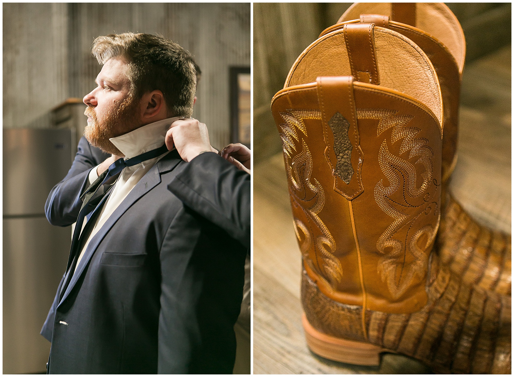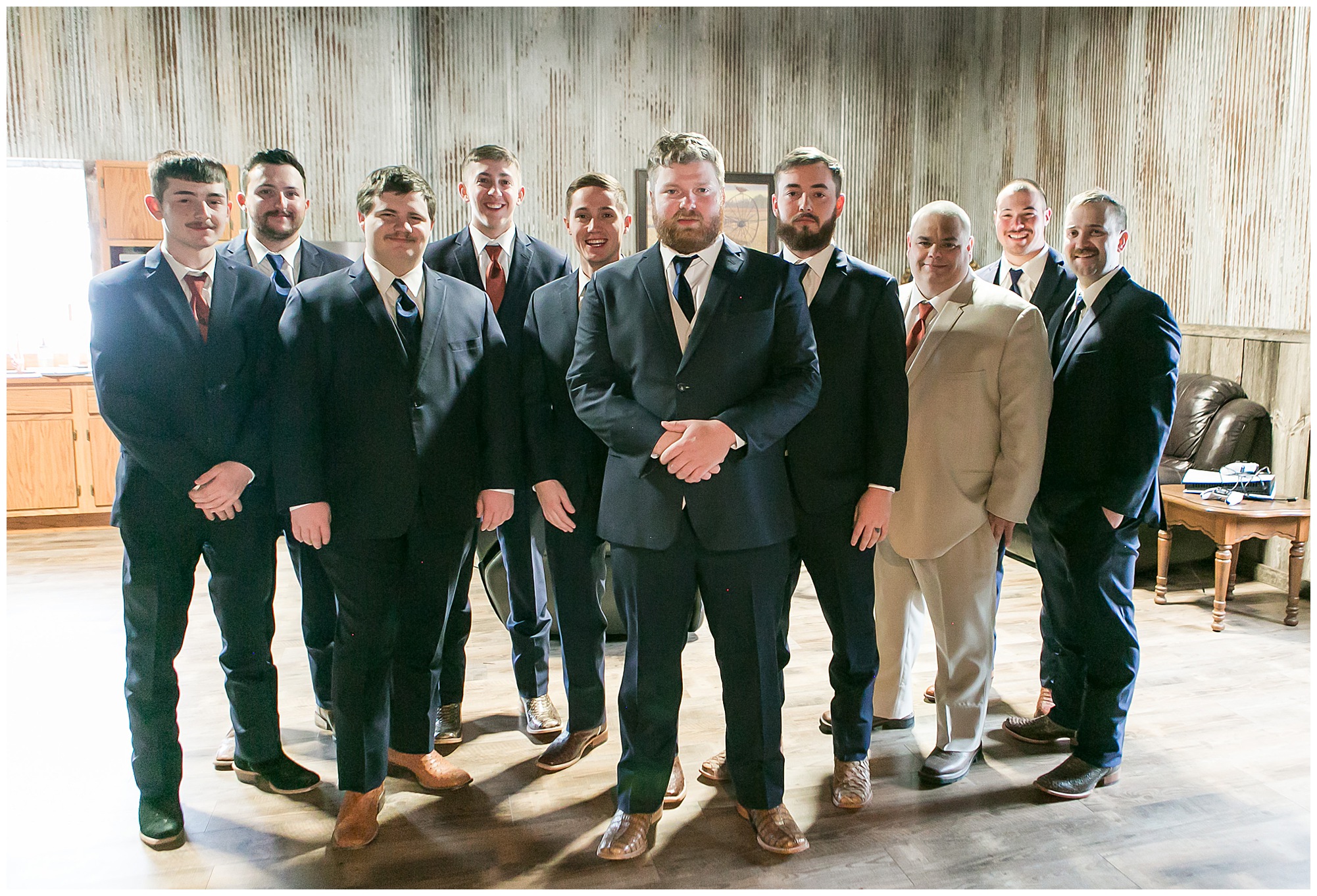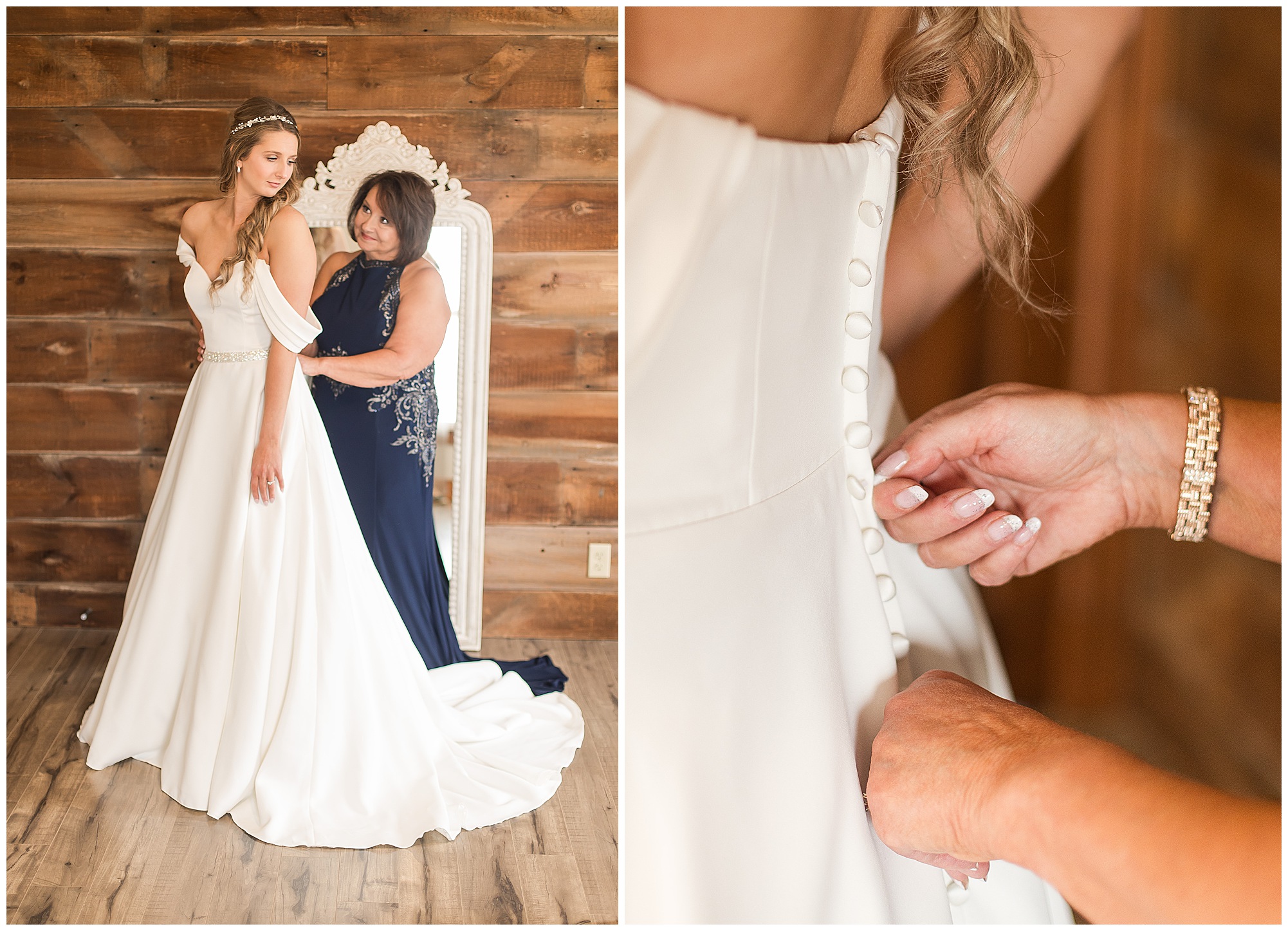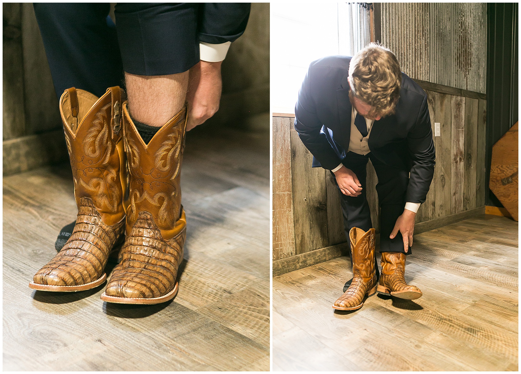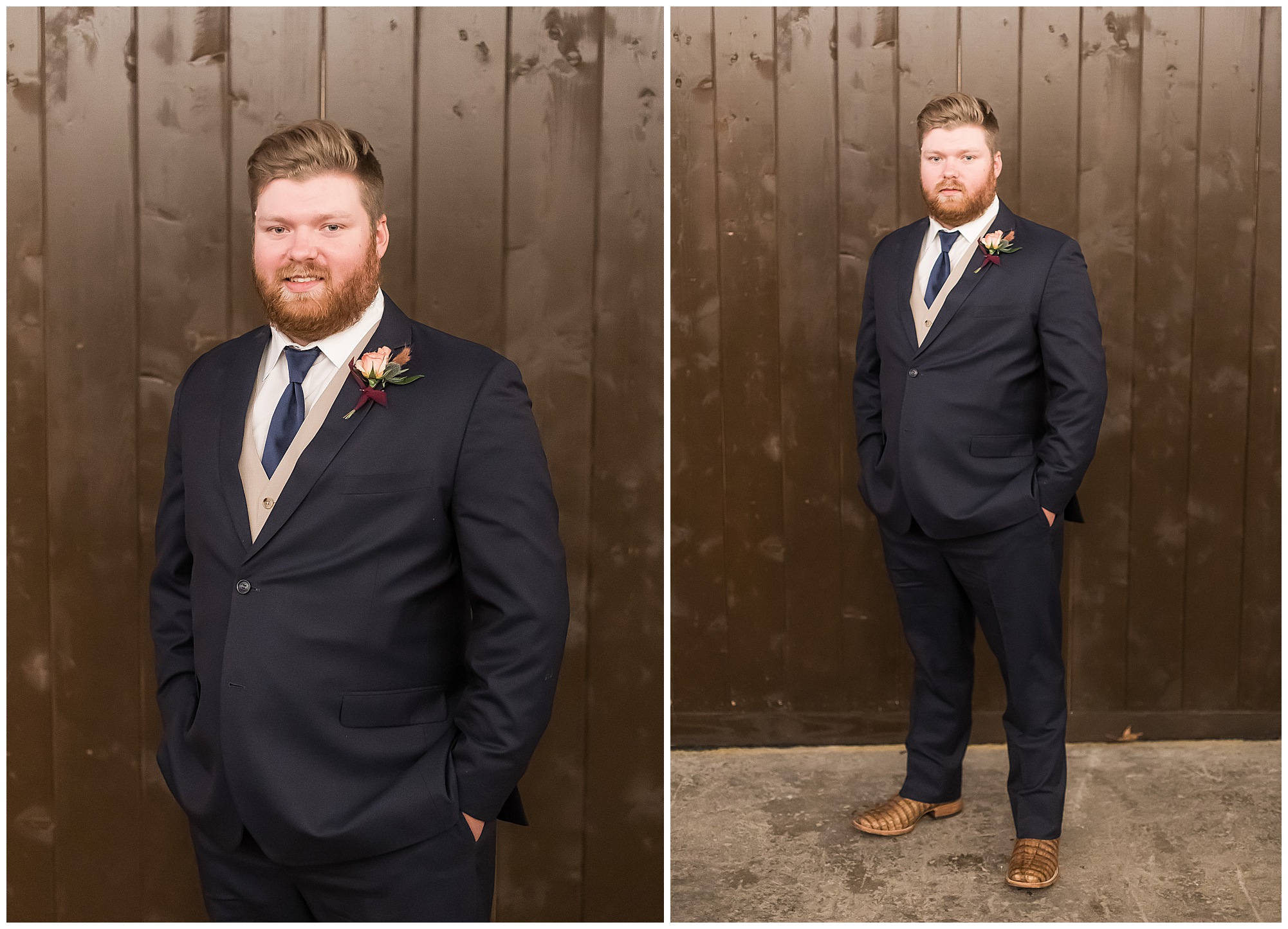 Mikaela and Scott’s wedding day the Saturday after Thanksgiving brought out some joyful emotions, a bunch of laughter among family and friends, plus a touch of winter magic! These two loved the feel The Rustic Venues in Girard, Illinois provided for their celebration. A space where both the bride and groom, along with all of their loved ones could get ready in the morning without running into each other. Plus an options for photos and their reception to host all of their most treasured people. My morning began with Mikaela and her ladies in the bridal suite as she was getting her hair done and the suite was bustling with all the last minute things the girls do on wedding day. This bride was fairly laid back and simply ready to get to the part where she sees here groom, but since they chose not to see one another prior to the ceremony, she and Scott did have a little bit longer to wait. Mikaela’s mom, Shauna and sister, Sophie (and Maid of Honor) helped her into her dress and she was simply stunning! The dress was a classic “A-frame” with a sweetheart neckline and off the shoulder straps. She had a little belt with some bling to match her rhinestone boots to bring her whole look together! Mikaela was allowing her father to see her with a first look, which was incredibly sweet. They took in one other’s outfits, shared some laughs, and Mikaela gifted her dad with an embroidered handkerchief. While all this was going on, Scott and his groomsmen were only a building away, getting ready for the big day themselves. The guys wore navy suites, with matching navy ties and vests. Scott stood apart with a gold vest and looked dapper with his guys as they prepared for the ceremony.