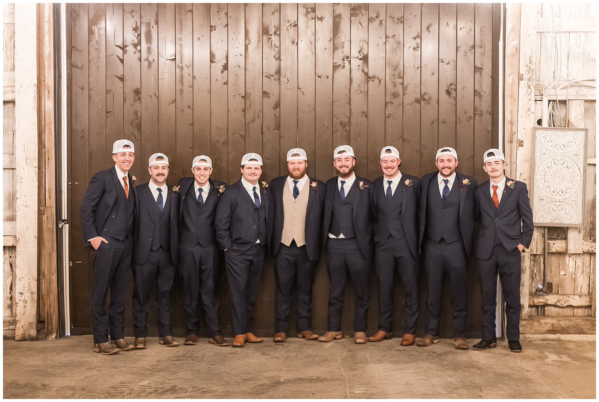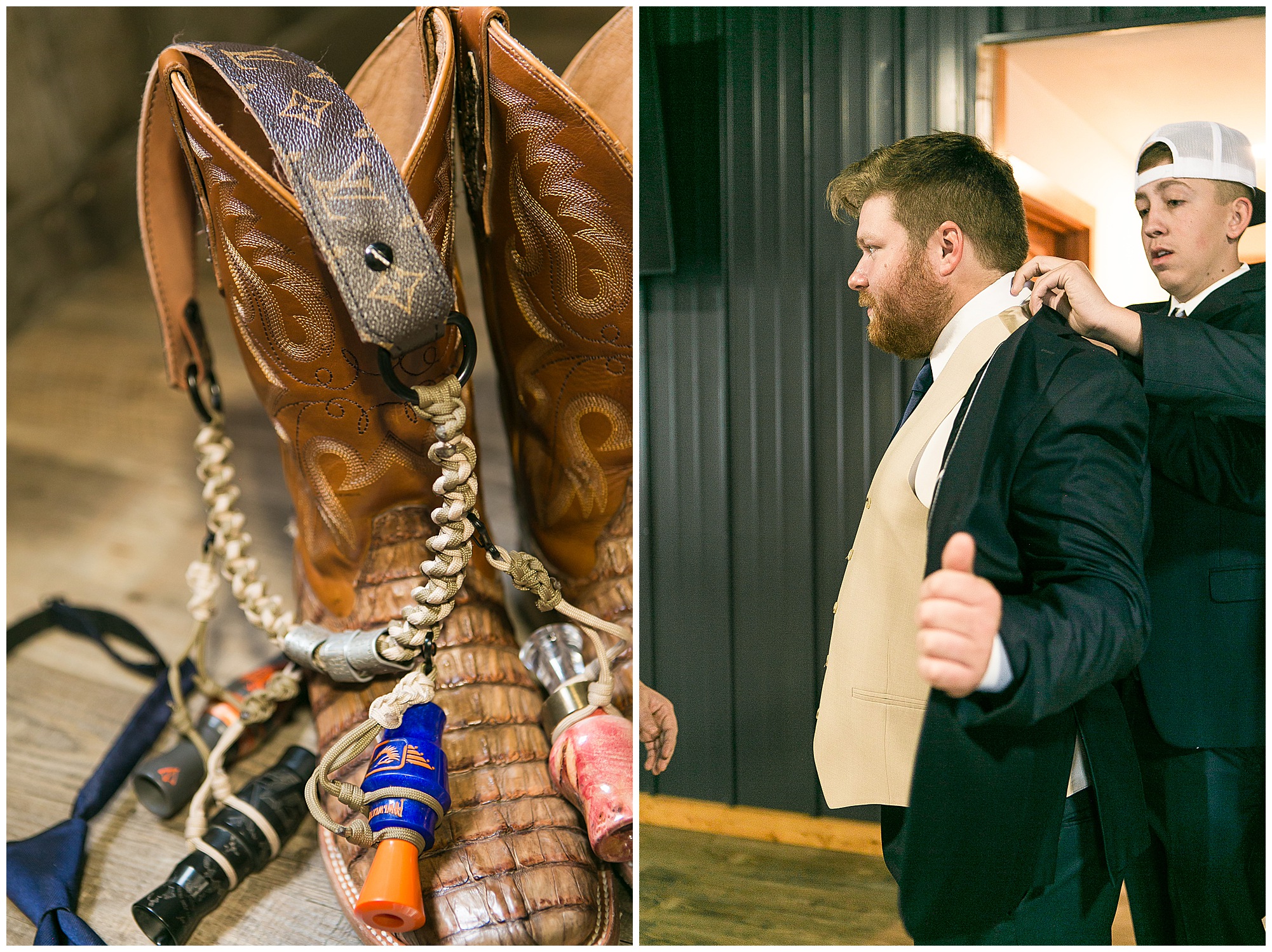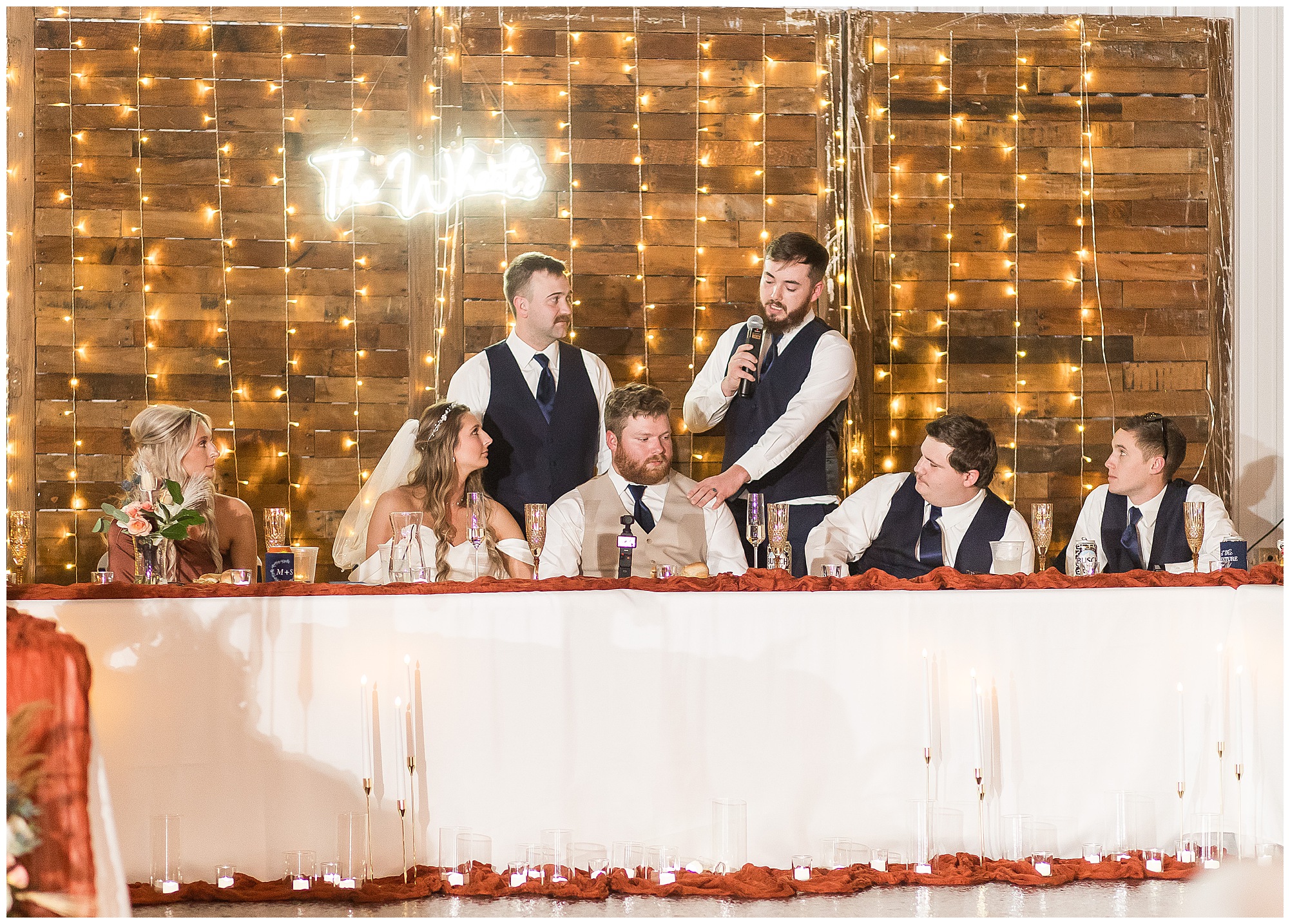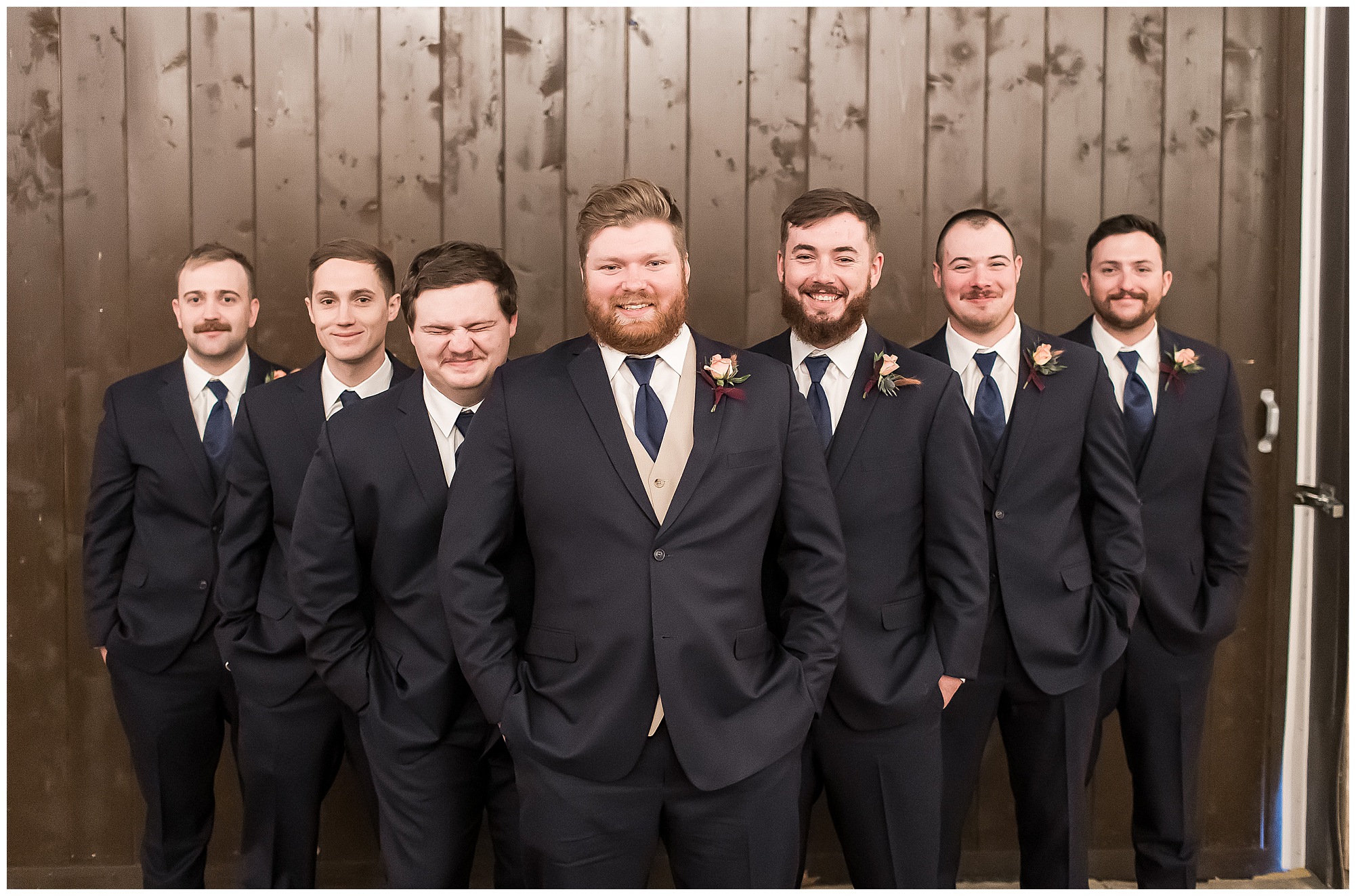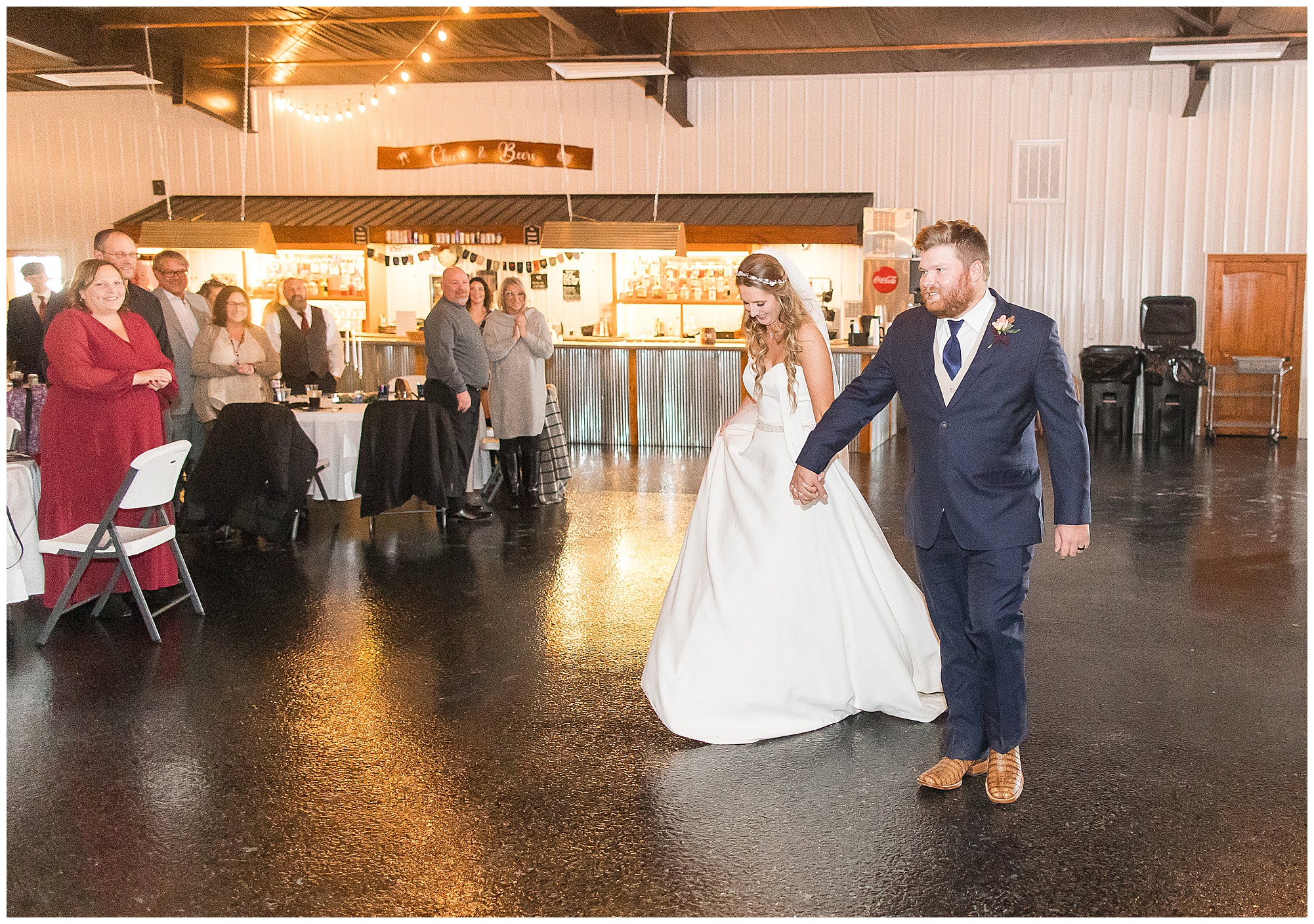 Mikaela and Scott’s wedding day the Saturday after Thanksgiving brought out some joyful emotions, a bunch of laughter among family and friends, plus a touch of winter magic! These two loved the feel The Rustic Venues in Girard, Illinois provided for their celebration. A space where both the bride and groom, along with all of their loved ones could get ready in the morning without running into each other. Plus an options for photos and their reception to host all of their most treasured people. My morning began with Mikaela and her ladies in the bridal suite as she was getting her hair done and the suite was bustling with all the last minute things the girls do on wedding day. This bride was fairly laid back and simply ready to get to the part where she sees here groom, but since they chose not to see one another prior to the ceremony, she and Scott did have a little bit longer to wait. Mikaela’s mom, Shauna and sister, Sophie (and Maid of Honor) helped her into her dress and she was simply stunning! The dress was a classic “A-frame” with a sweetheart neckline and off the shoulder straps. She had a little belt with some bling to match her rhinestone boots to bring her whole look together! Mikaela was allowing her father to see her with a first look, which was incredibly sweet. They took in one other’s outfits, shared some laughs, and Mikaela gifted her dad with an embroidered handkerchief. While all this was going on, Scott and his groomsmen were only a building away, getting ready for the big day themselves. The guys wore navy suites, with matching navy ties and vests. Scott stood apart with a gold vest and looked dapper with his guys as they prepared for the ceremony.