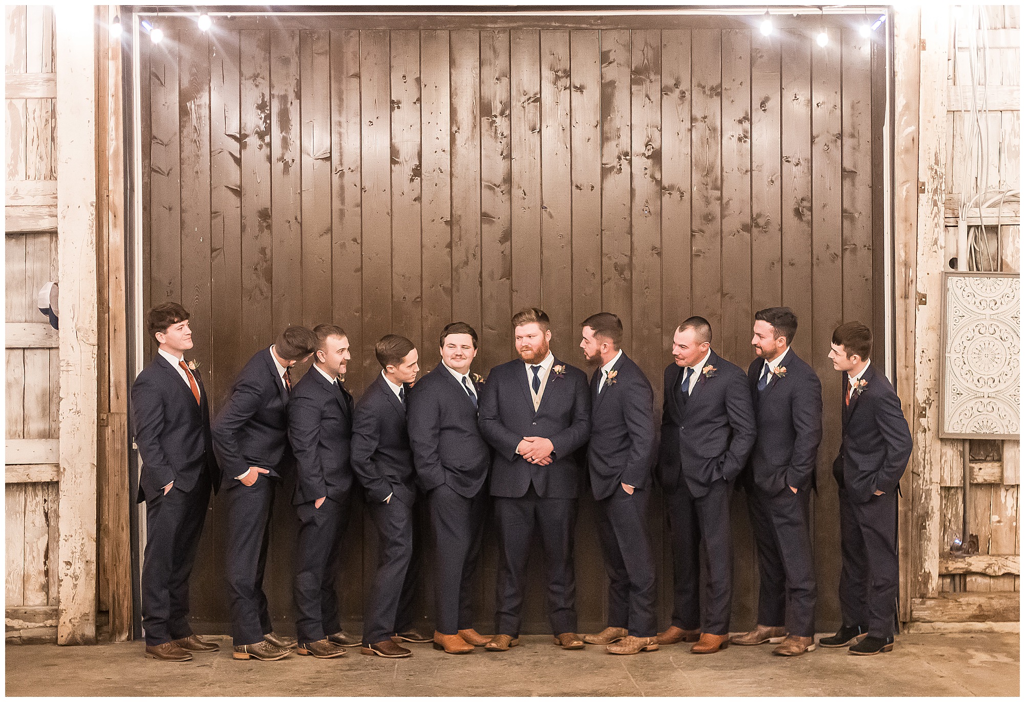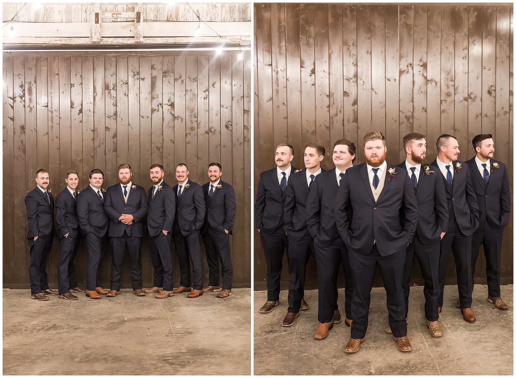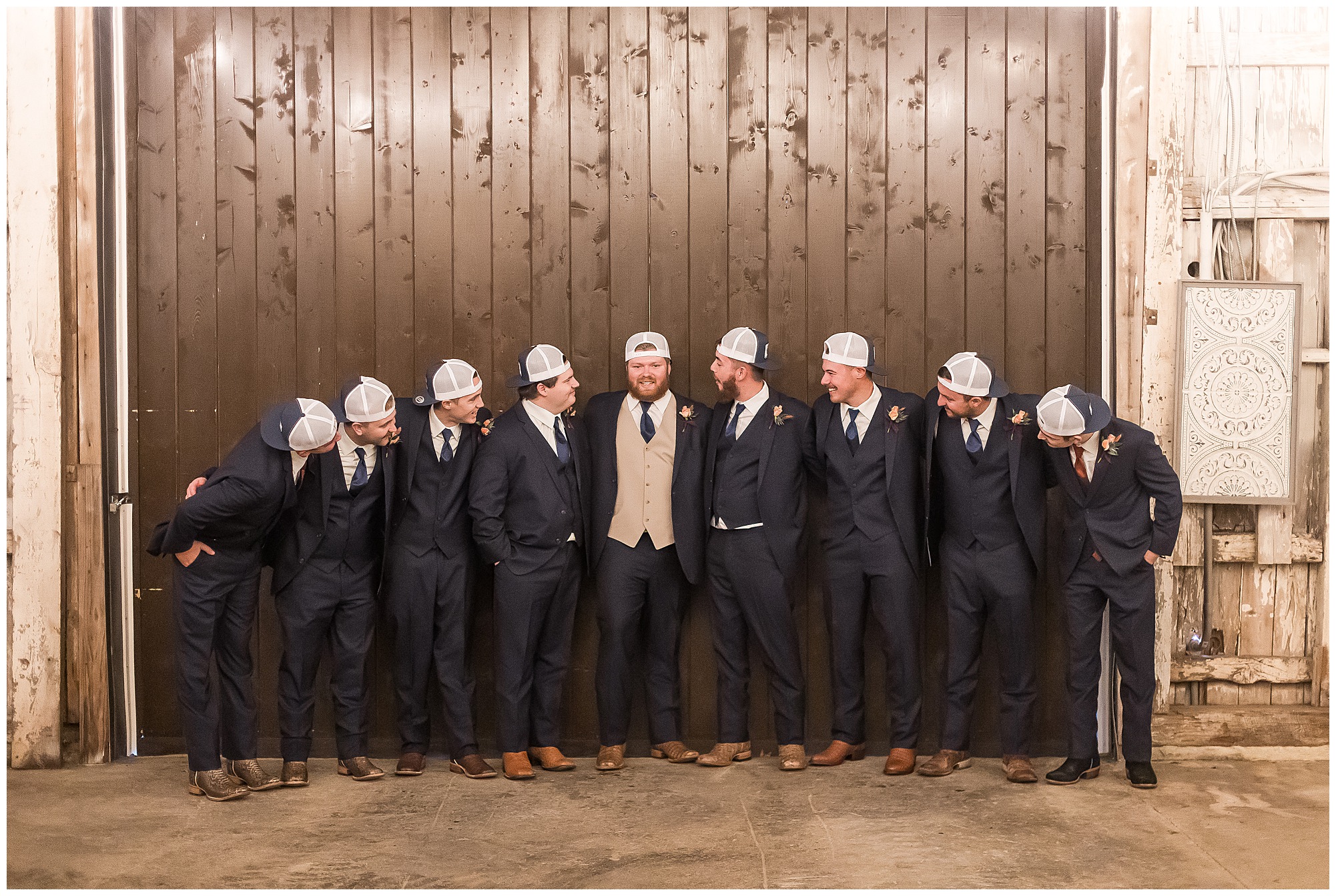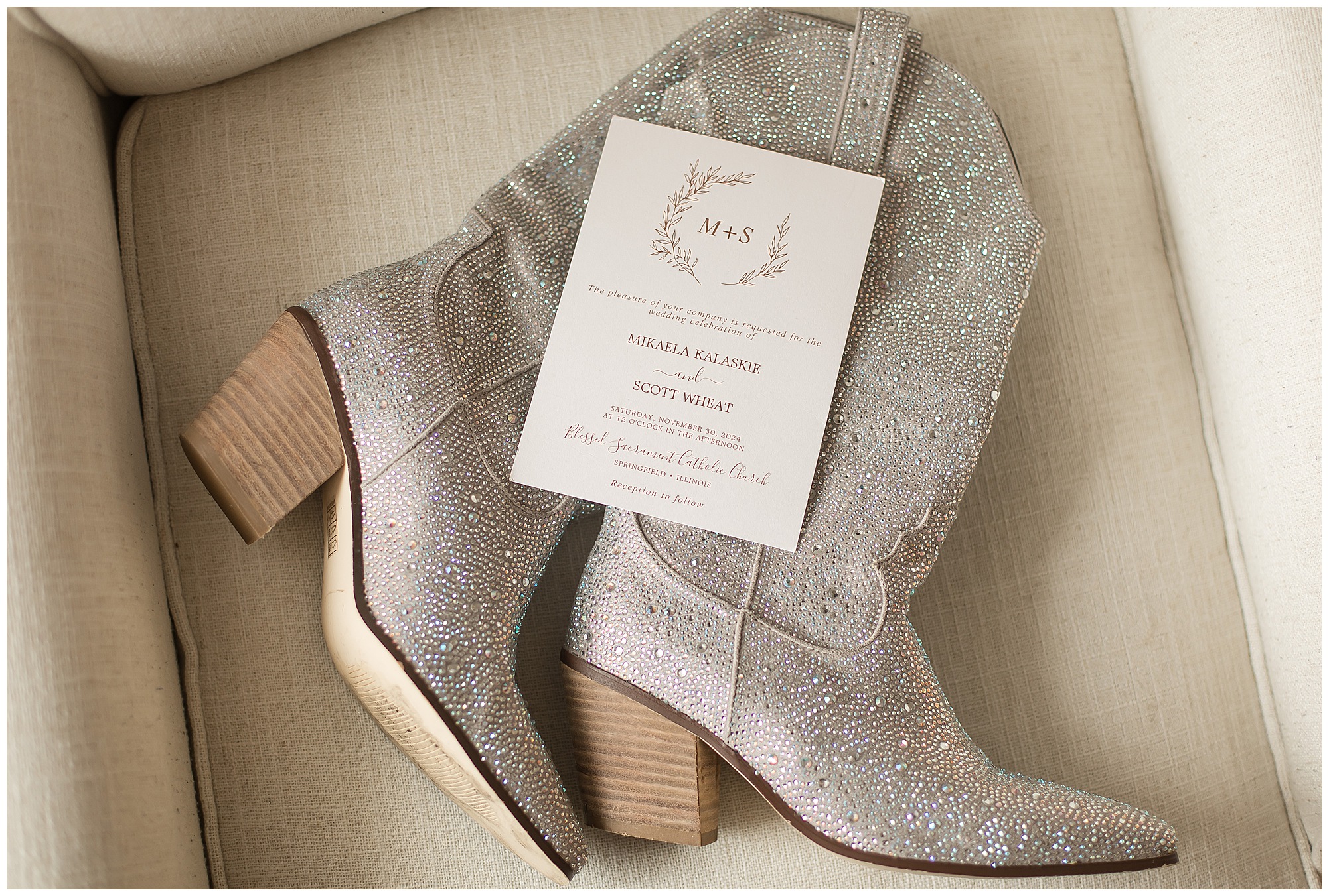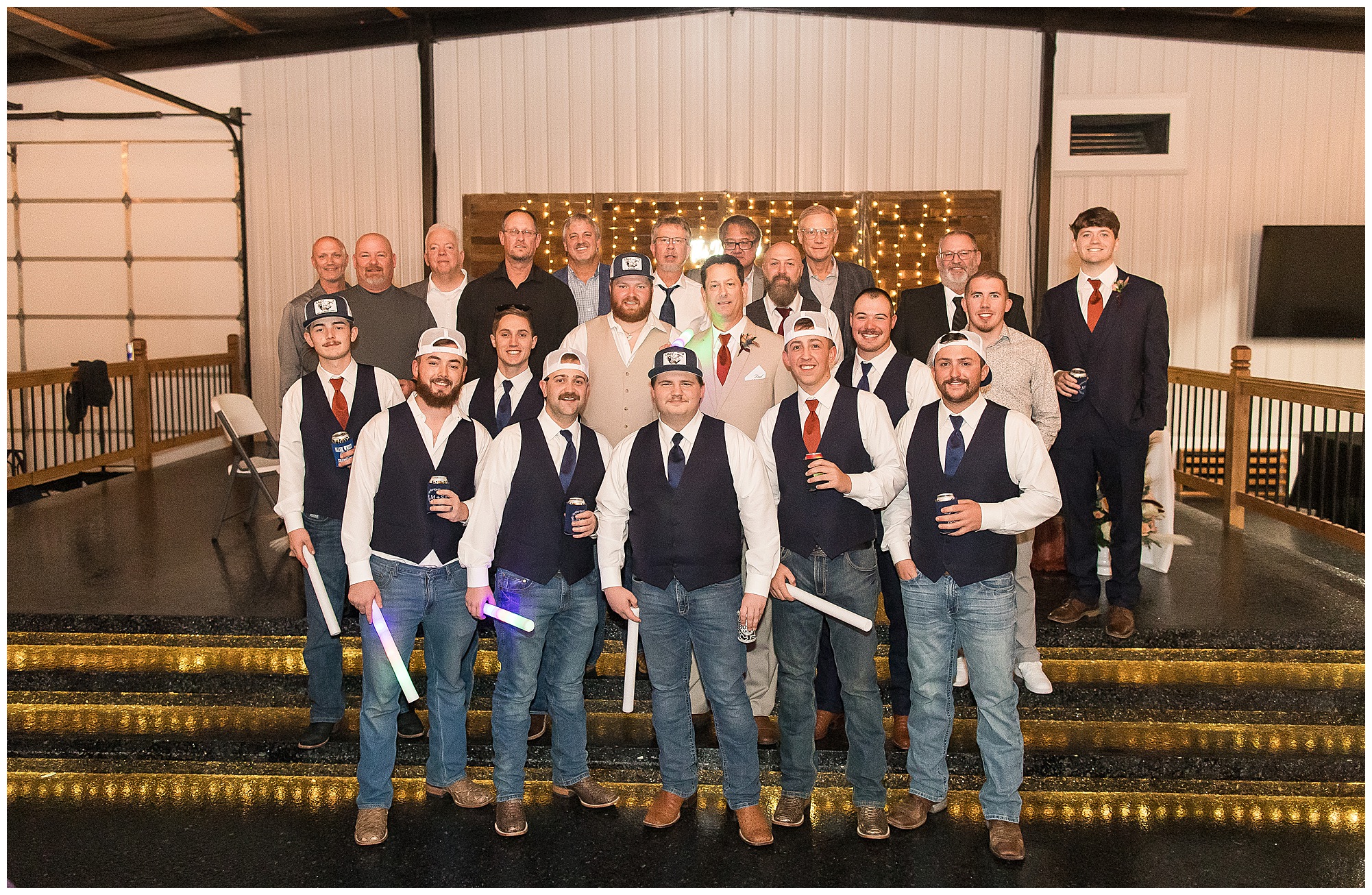 Mikaela and Scott’s wedding day the Saturday after Thanksgiving brought out some joyful emotions, a bunch of laughter among family and friends, plus a touch of winter magic! These two loved the feel The Rustic Venues in Girard, Illinois provided for their celebration. A space where both the bride and groom, along with all of their loved ones could get ready in the morning without running into each other. Plus an options for photos and their reception to host all of their most treasured people. My morning began with Mikaela and her ladies in the bridal suite as she was getting her hair done and the suite was bustling with all the last minute things the girls do on wedding day. This bride was fairly laid back and simply ready to get to the part where she sees here groom, but since they chose not to see one another prior to the ceremony, she and Scott did have a little bit longer to wait. Mikaela’s mom, Shauna and sister, Sophie (and Maid of Honor) helped her into her dress and she was simply stunning! The dress was a classic “A-frame” with a sweetheart neckline and off the shoulder straps. She had a little belt with some bling to match her rhinestone boots to bring her whole look together! Mikaela was allowing her father to see her with a first look, which was incredibly sweet. They took in one other’s outfits, shared some laughs, and Mikaela gifted her dad with an embroidered handkerchief. While all this was going on, Scott and his groomsmen were only a building away, getting ready for the big day themselves. The guys wore navy suites, with matching navy ties and vests. Scott stood apart with a gold vest and looked dapper with his guys as they prepared for the ceremony.