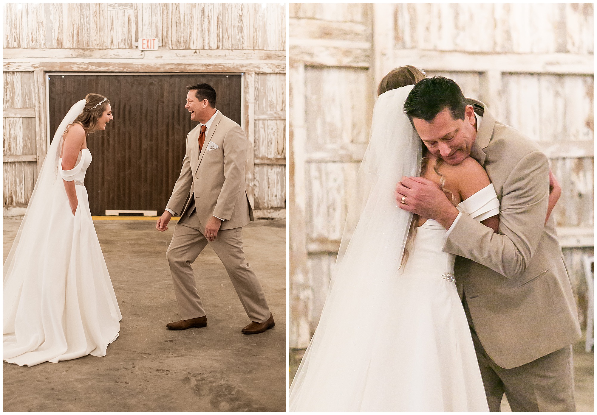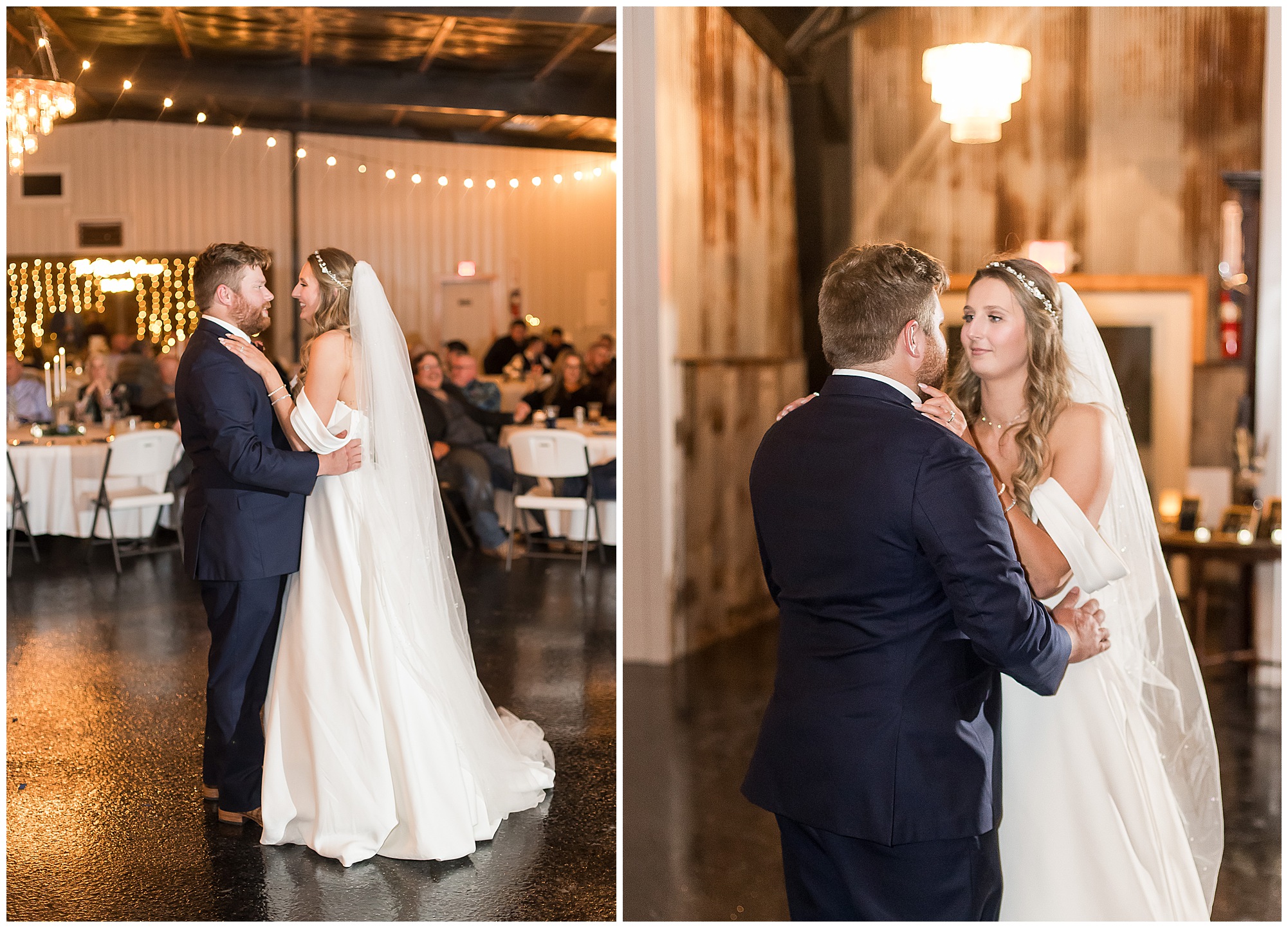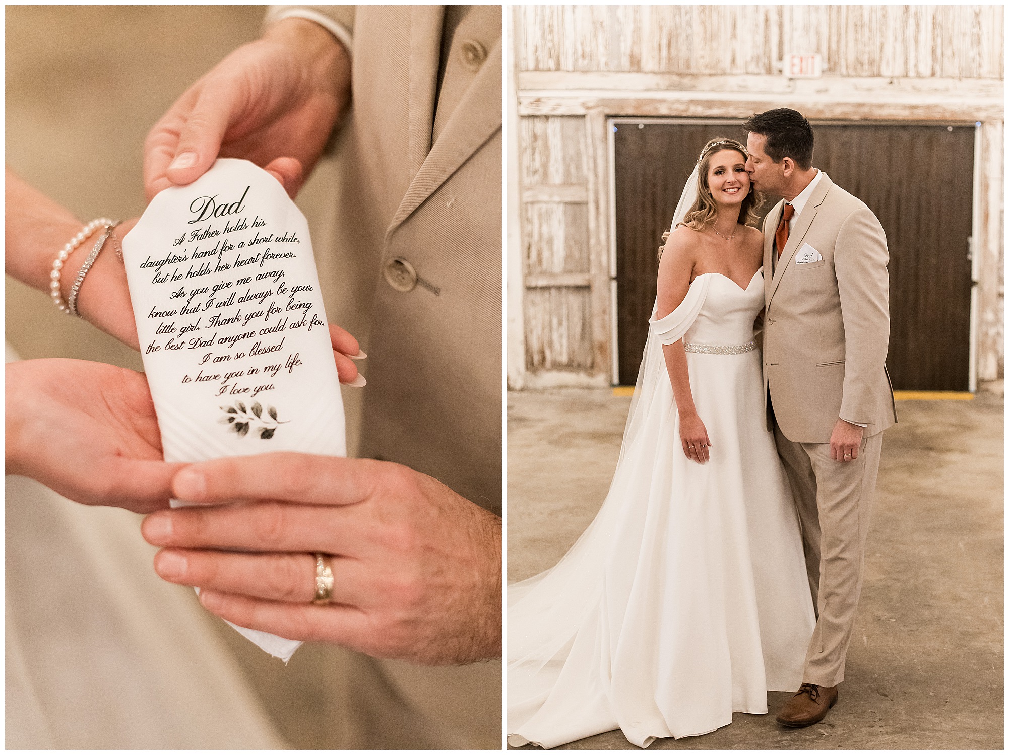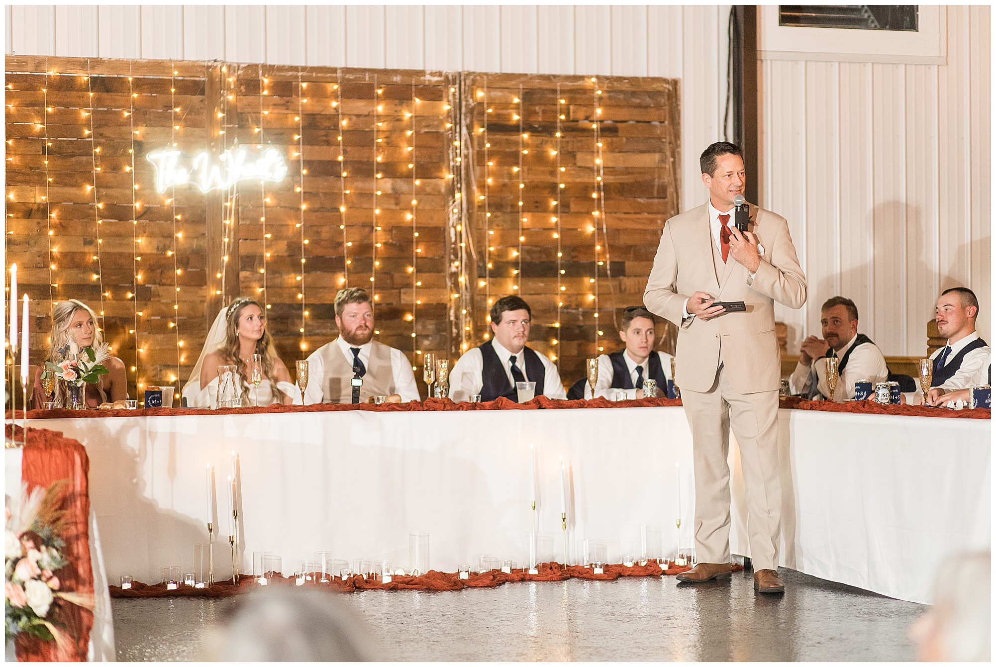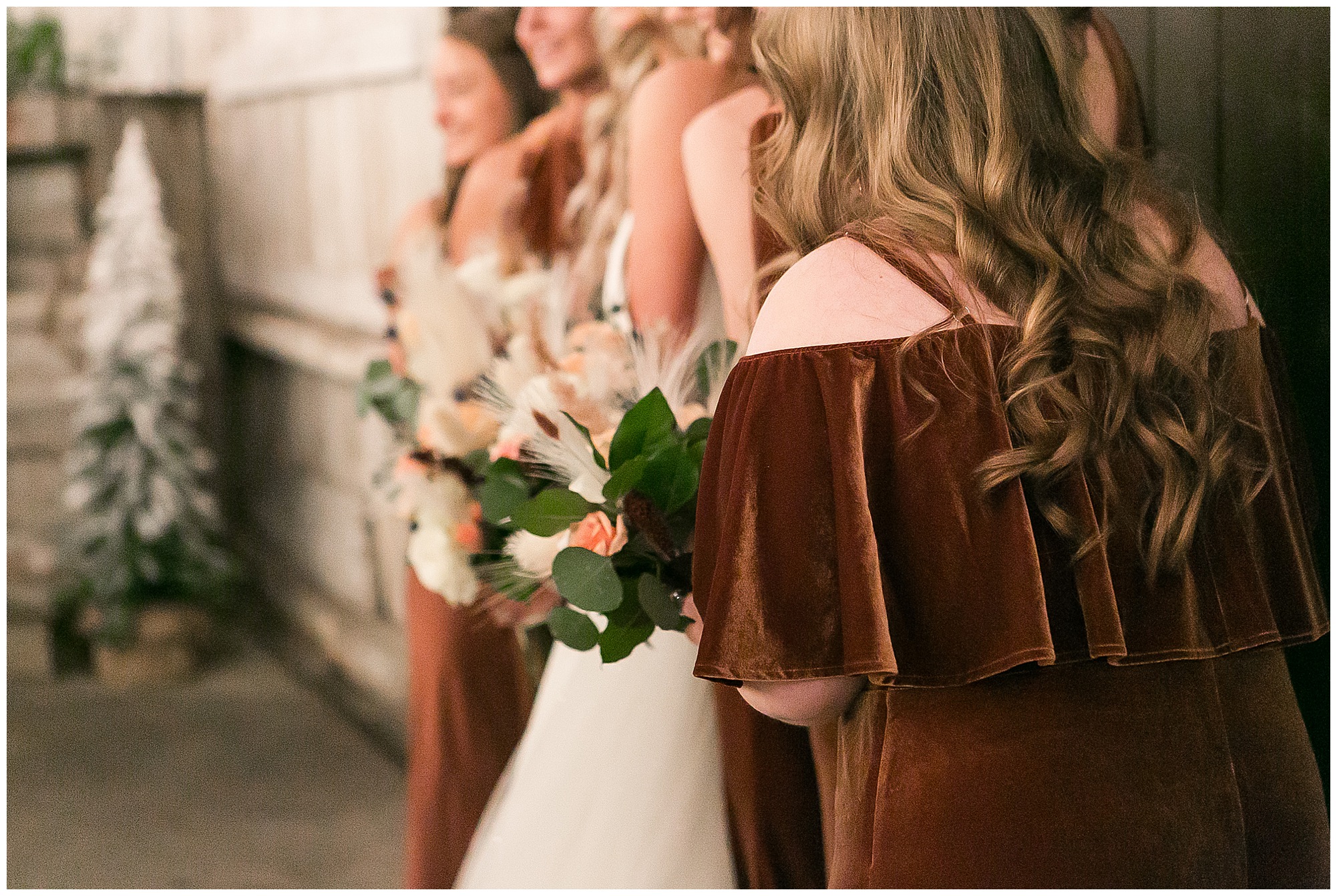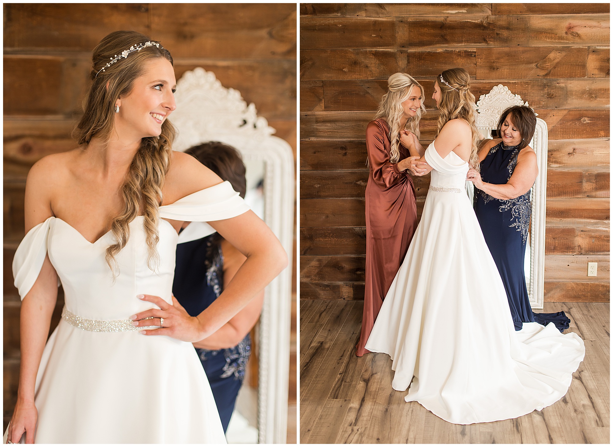 Mikaela and Scott’s wedding day the Saturday after Thanksgiving brought out some joyful emotions, a bunch of laughter among family and friends, plus a touch of winter magic! These two loved the feel The Rustic Venues in Girard, Illinois provided for their celebration. A space where both the bride and groom, along with all of their loved ones could get ready in the morning without running into each other. Plus an options for photos and their reception to host all of their most treasured people. My morning began with Mikaela and her ladies in the bridal suite as she was getting her hair done and the suite was bustling with all the last minute things the girls do on wedding day. This bride was fairly laid back and simply ready to get to the part where she sees here groom, but since they chose not to see one another prior to the ceremony, she and Scott did have a little bit longer to wait. Mikaela’s mom, Shauna and sister, Sophie (and Maid of Honor) helped her into her dress and she was simply stunning! The dress was a classic “A-frame” with a sweetheart neckline and off the shoulder straps. She had a little belt with some bling to match her rhinestone boots to bring her whole look together! Mikaela was allowing her father to see her with a first look, which was incredibly sweet. They took in one other’s outfits, shared some laughs, and Mikaela gifted her dad with an embroidered handkerchief. While all this was going on, Scott and his groomsmen were only a building away, getting ready for the big day themselves. The guys wore navy suites, with matching navy ties and vests. Scott stood apart with a gold vest and looked dapper with his guys as they prepared for the ceremony.