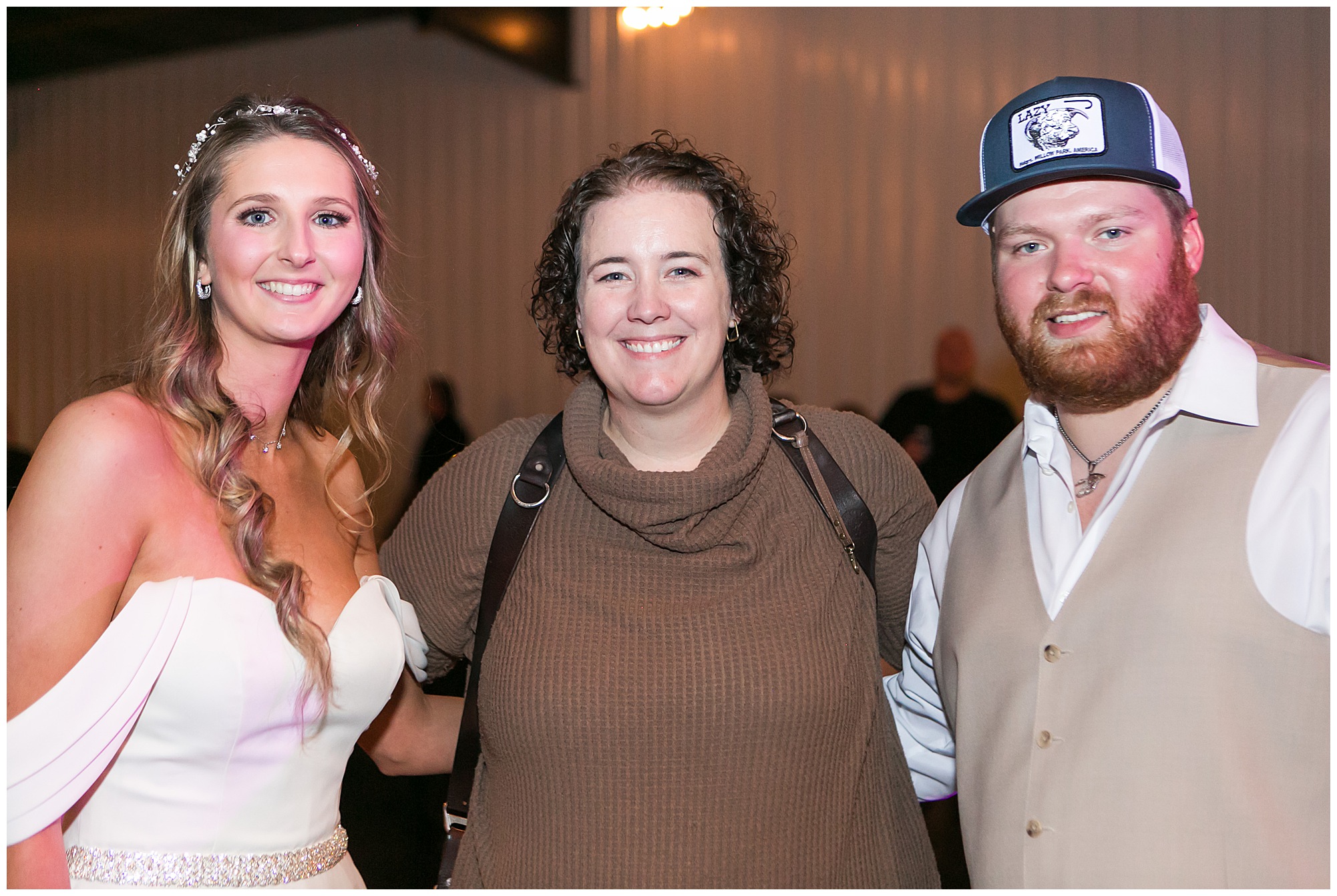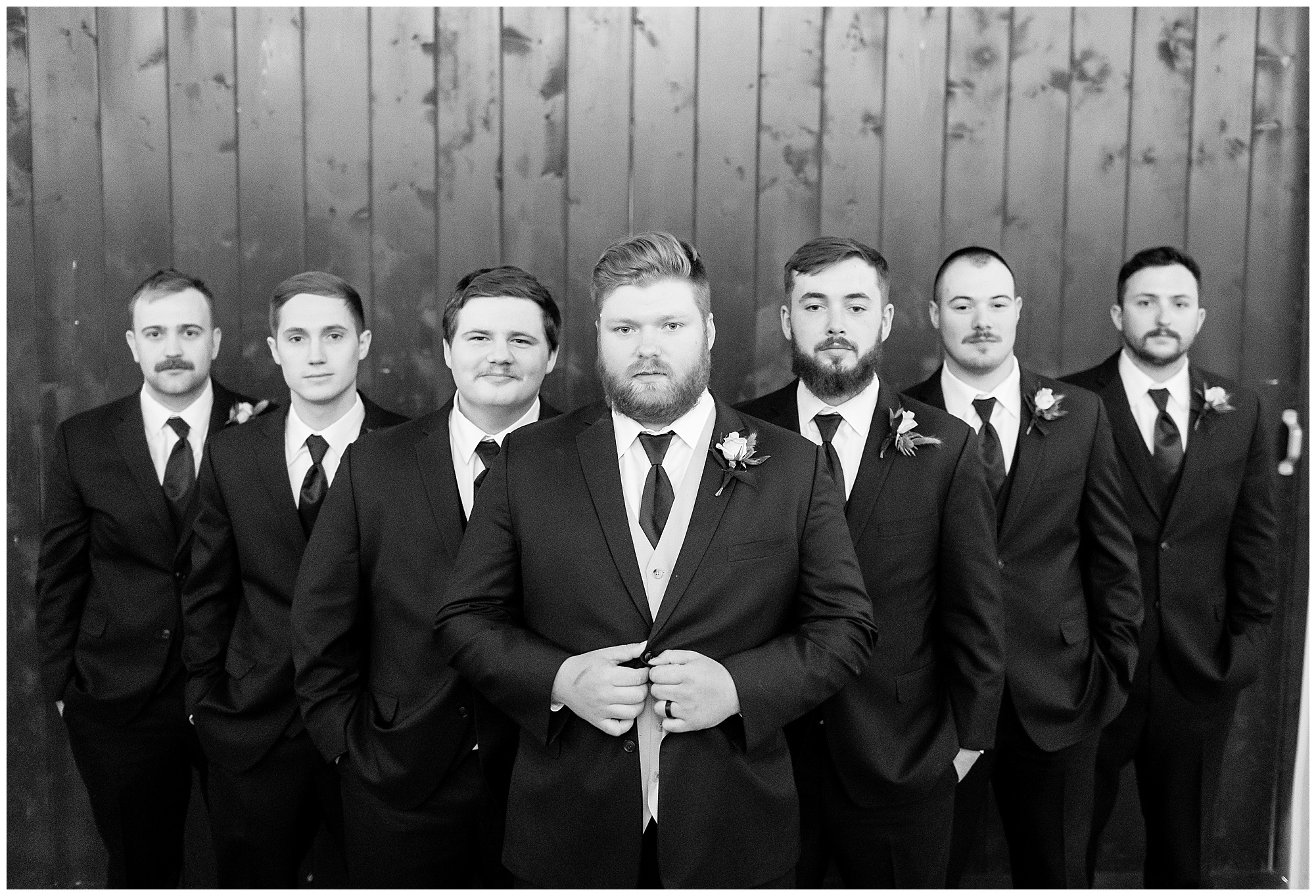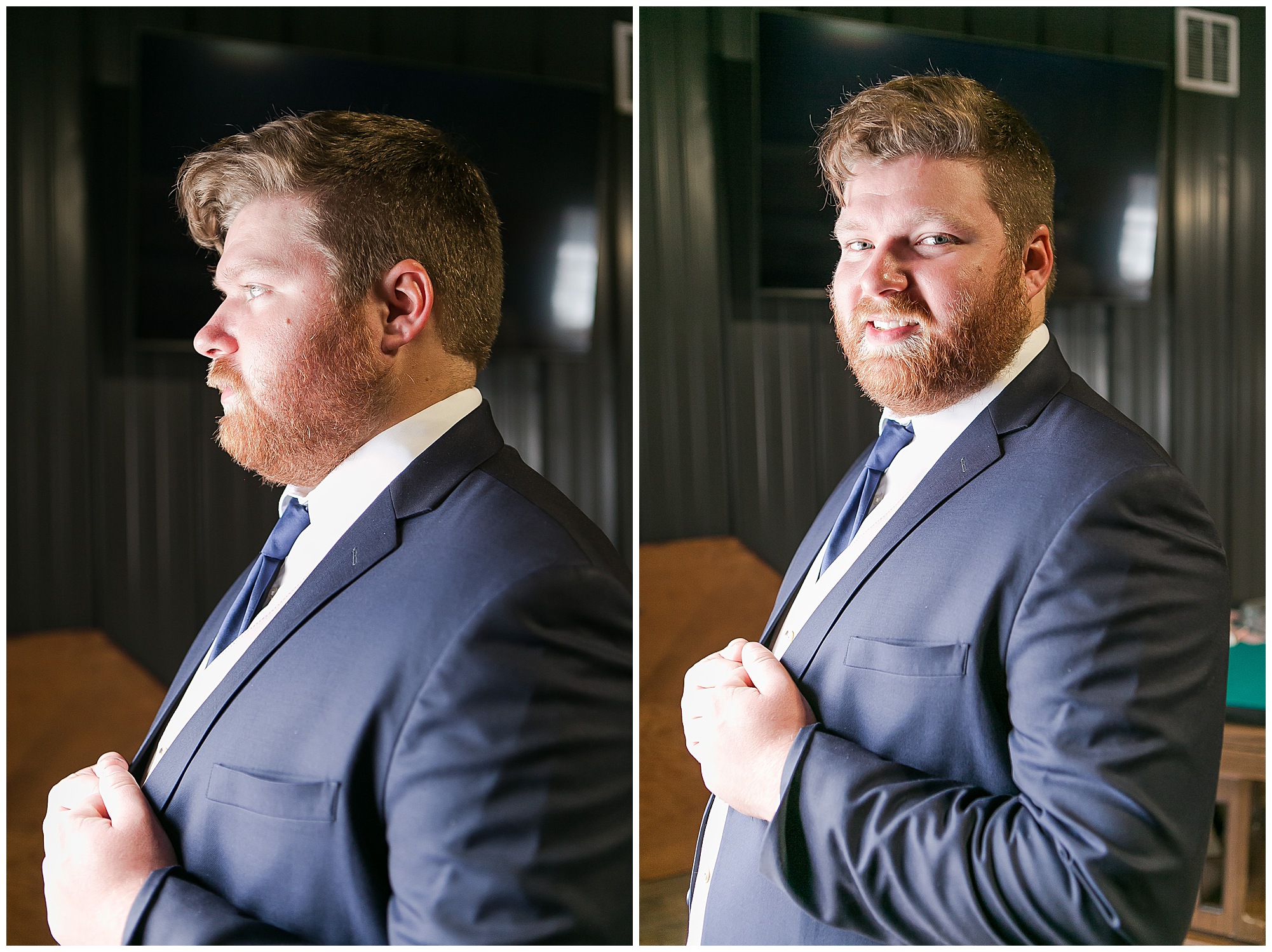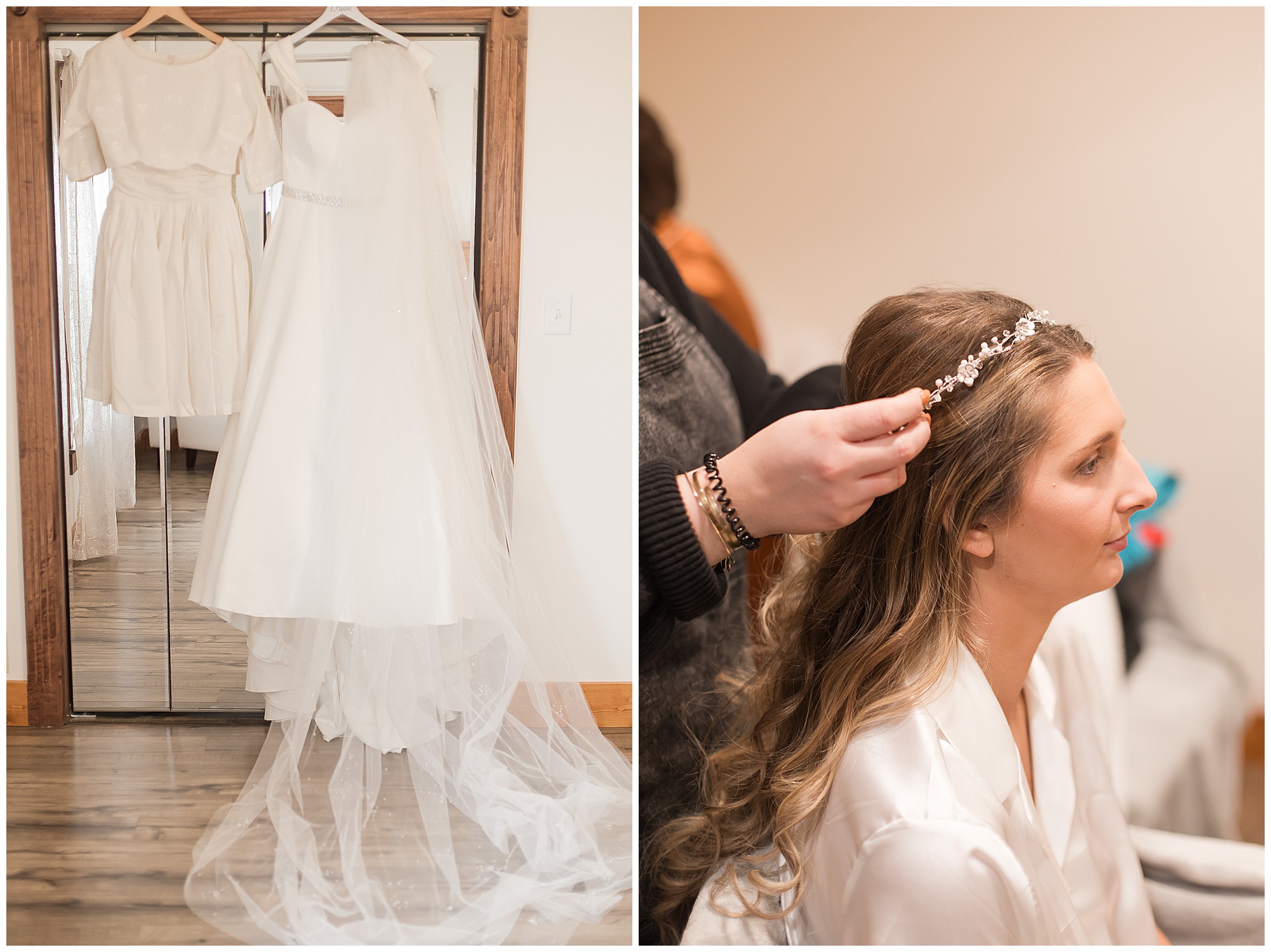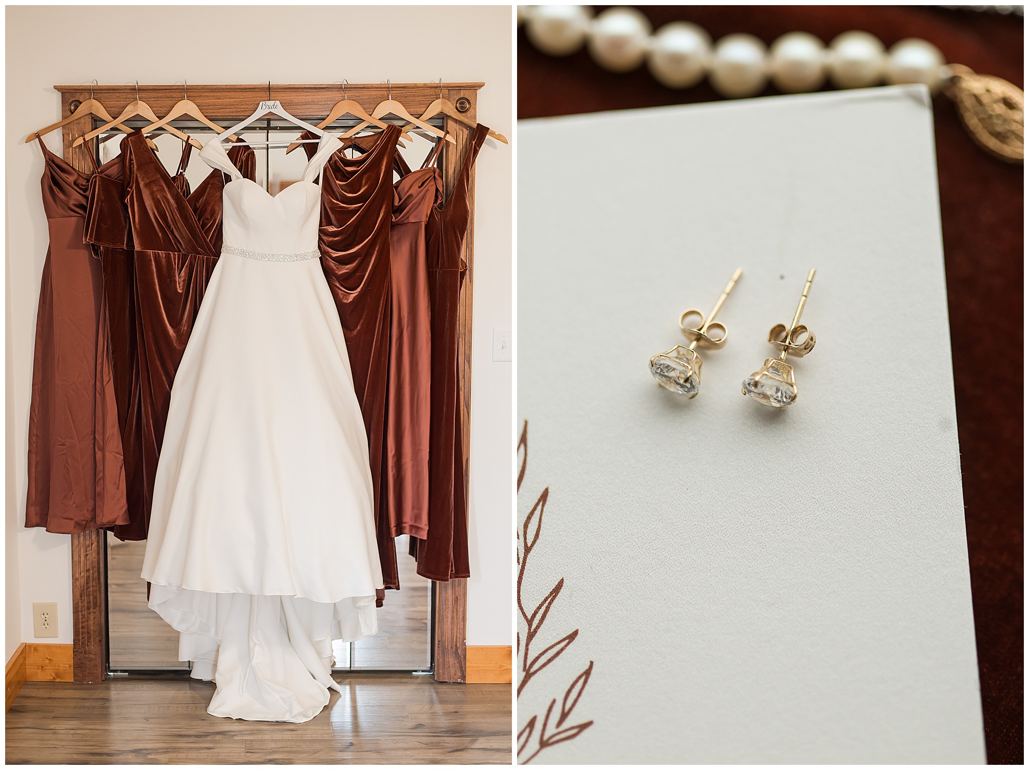 Mikaela and Scott’s wedding day the Saturday after Thanksgiving brought out some joyful emotions, a bunch of laughter among family and friends, plus a touch of winter magic! These two loved the feel The Rustic Venues in Girard, Illinois provided for their celebration. A space where both the bride and groom, along with all of their loved ones could get ready in the morning without running into each other. Plus an options for photos and their reception to host all of their most treasured people. My morning began with Mikaela and her ladies in the bridal suite as she was getting her hair done and the suite was bustling with all the last minute things the girls do on wedding day. This bride was fairly laid back and simply ready to get to the part where she sees here groom, but since they chose not to see one another prior to the ceremony, she and Scott did have a little bit longer to wait. Mikaela’s mom, Shauna and sister, Sophie (and Maid of Honor) helped her into her dress and she was simply stunning! The dress was a classic “A-frame” with a sweetheart neckline and off the shoulder straps. She had a little belt with some bling to match her rhinestone boots to bring her whole look together! Mikaela was allowing her father to see her with a first look, which was incredibly sweet. They took in one other’s outfits, shared some laughs, and Mikaela gifted her dad with an embroidered handkerchief. While all this was going on, Scott and his groomsmen were only a building away, getting ready for the big day themselves. The guys wore navy suites, with matching navy ties and vests. Scott stood apart with a gold vest and looked dapper with his guys as they prepared for the ceremony.