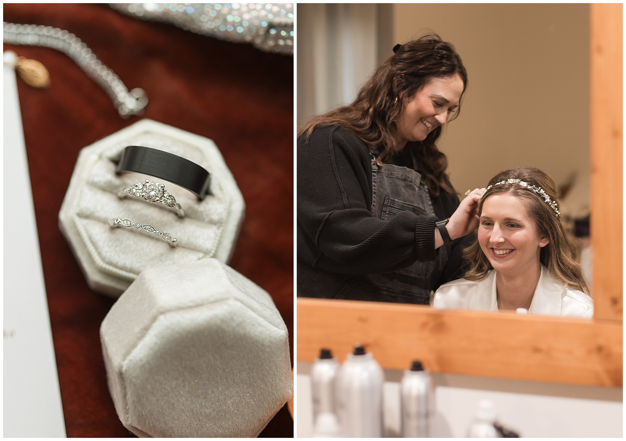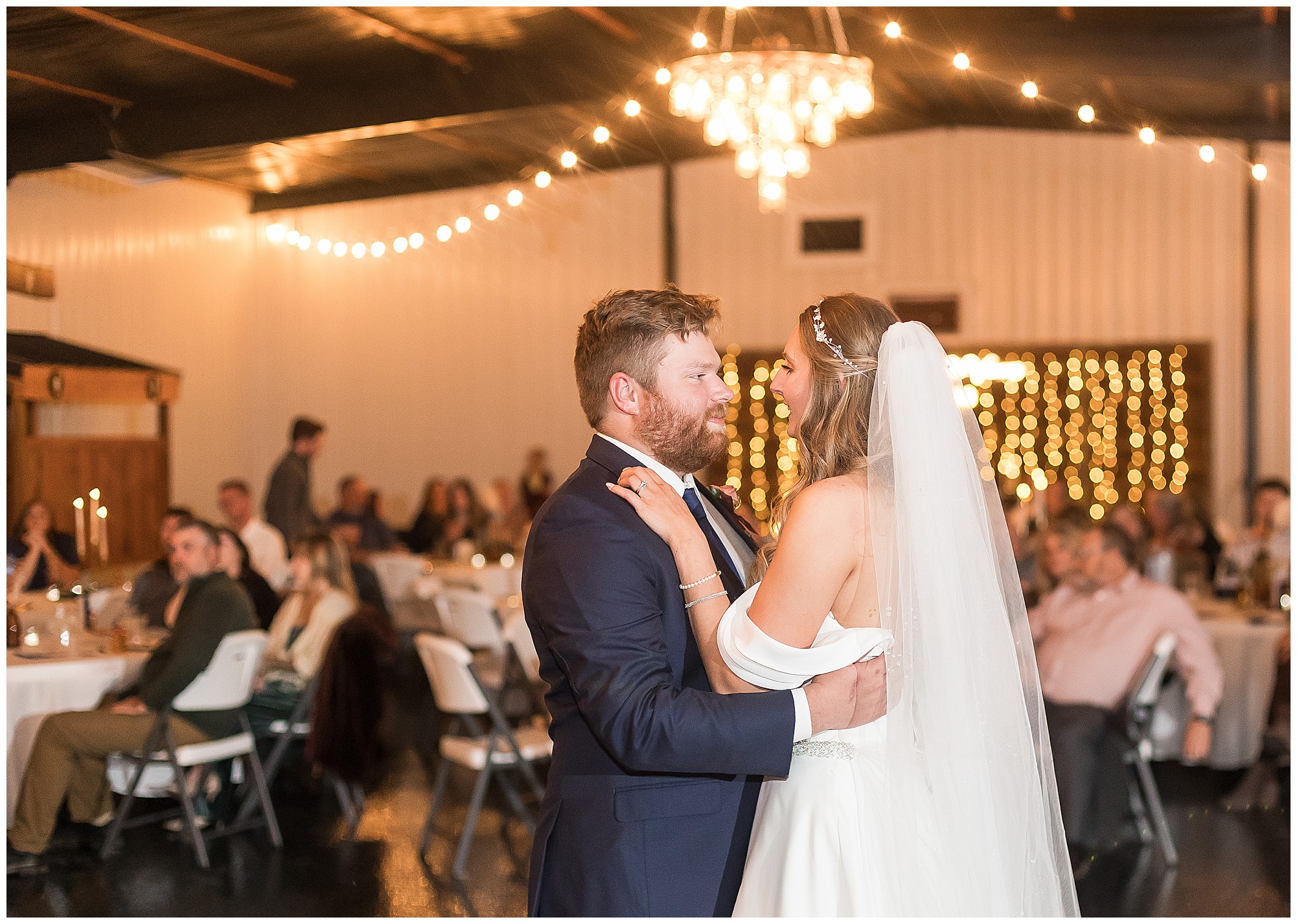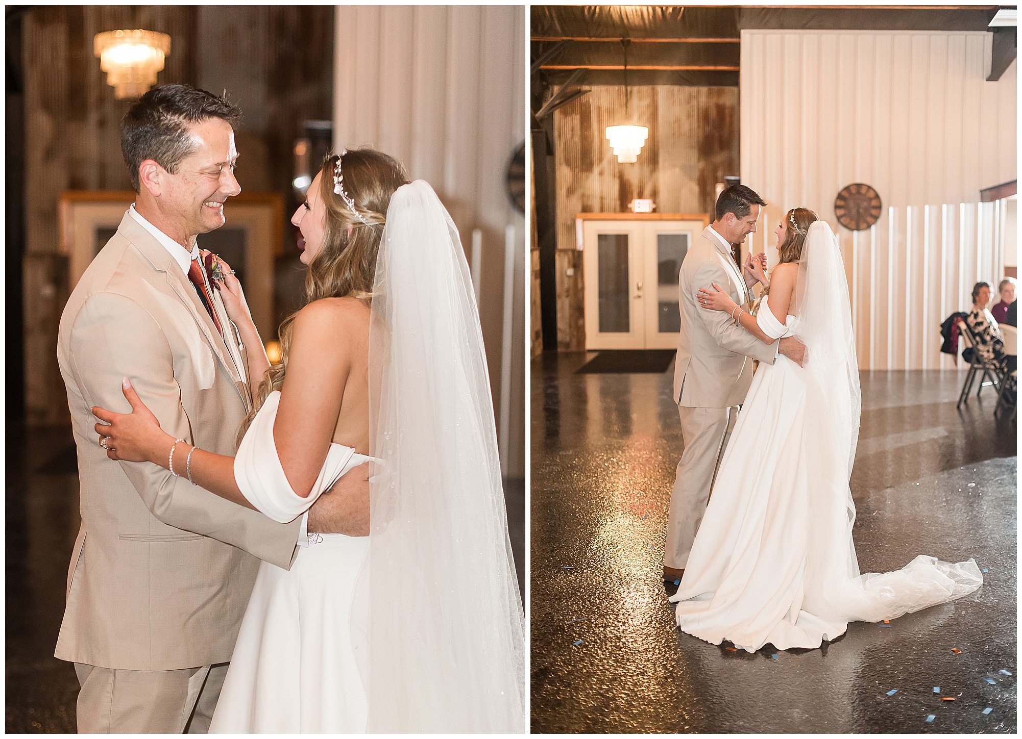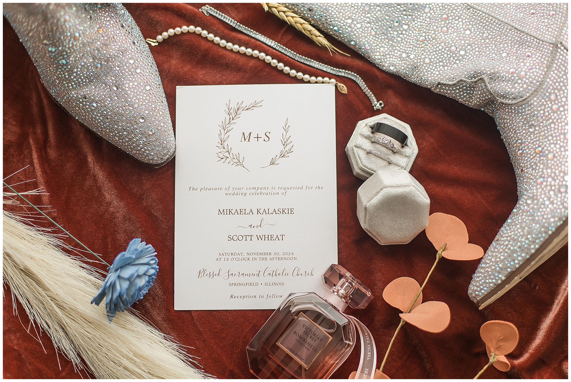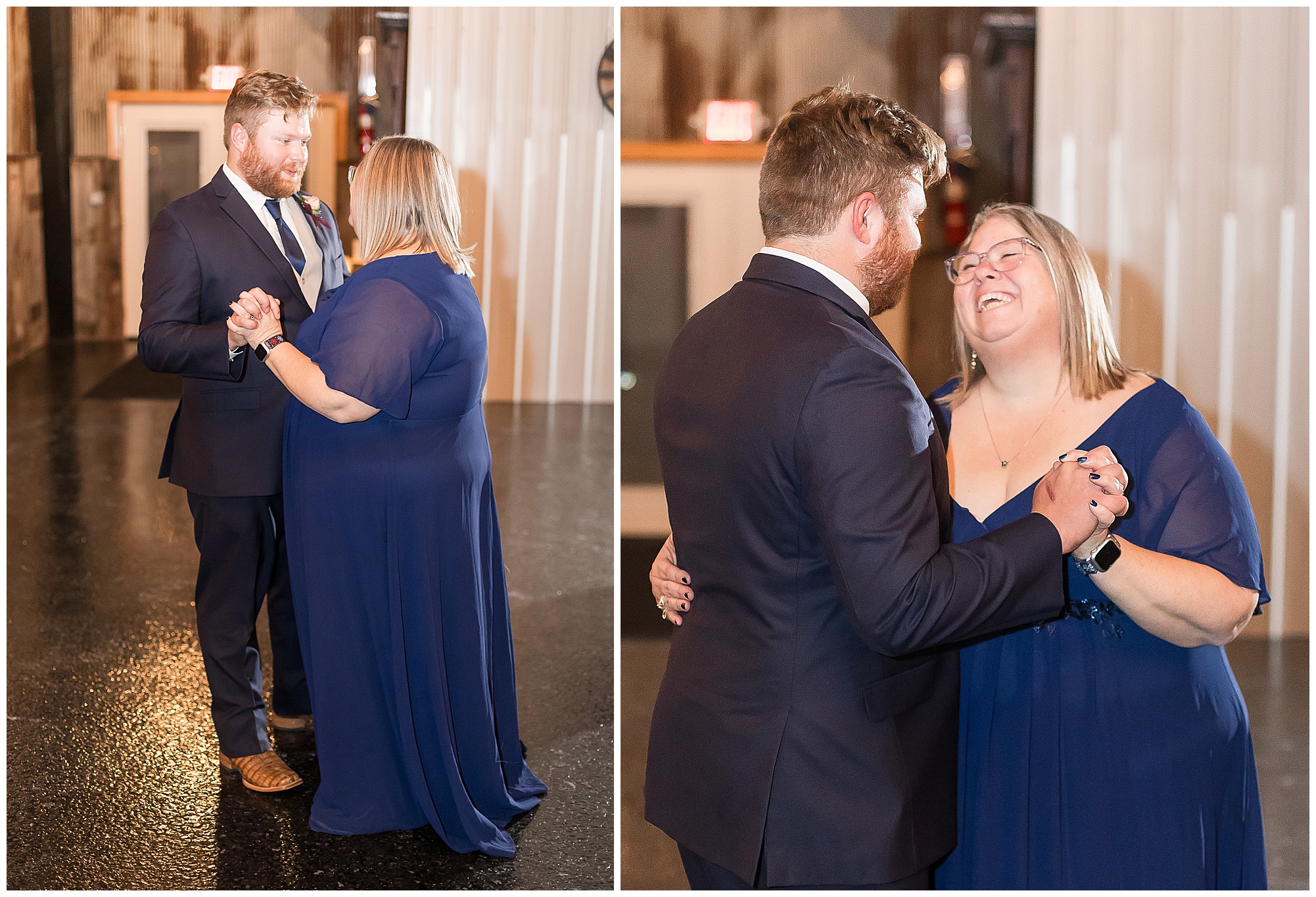 Mikaela and Scott’s wedding day the Saturday after Thanksgiving brought out some joyful emotions, a bunch of laughter among family and friends, plus a touch of winter magic! These two loved the feel The Rustic Venues in Girard, Illinois provided for their celebration. A space where both the bride and groom, along with all of their loved ones could get ready in the morning without running into each other. Plus an options for photos and their reception to host all of their most treasured people. My morning began with Mikaela and her ladies in the bridal suite as she was getting her hair done and the suite was bustling with all the last minute things the girls do on wedding day. This bride was fairly laid back and simply ready to get to the part where she sees here groom, but since they chose not to see one another prior to the ceremony, she and Scott did have a little bit longer to wait. Mikaela’s mom, Shauna and sister, Sophie (and Maid of Honor) helped her into her dress and she was simply stunning! The dress was a classic “A-frame” with a sweetheart neckline and off the shoulder straps. She had a little belt with some bling to match her rhinestone boots to bring her whole look together! Mikaela was allowing her father to see her with a first look, which was incredibly sweet. They took in one other’s outfits, shared some laughs, and Mikaela gifted her dad with an embroidered handkerchief. While all this was going on, Scott and his groomsmen were only a building away, getting ready for the big day themselves. The guys wore navy suites, with matching navy ties and vests. Scott stood apart with a gold vest and looked dapper with his guys as they prepared for the ceremony.