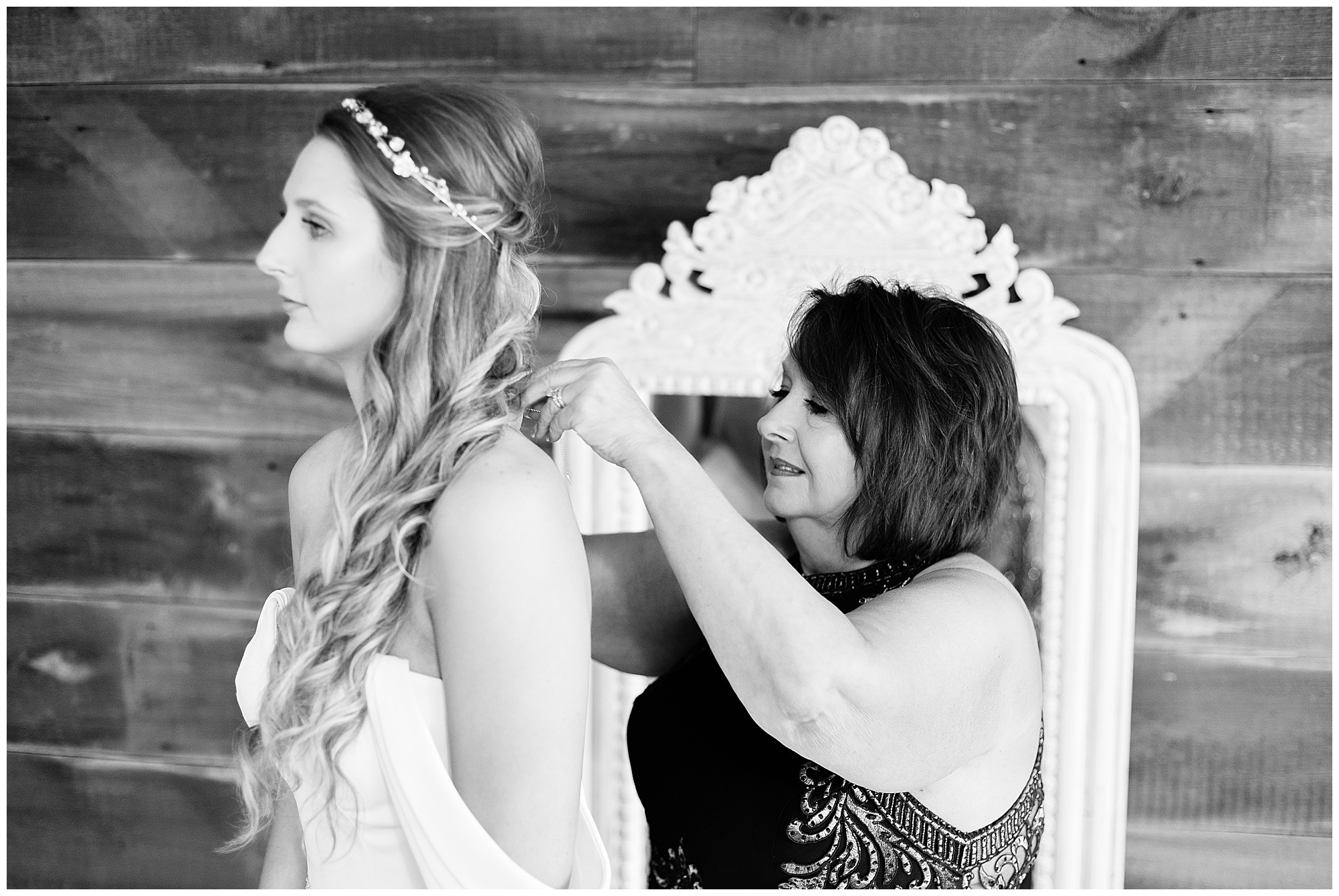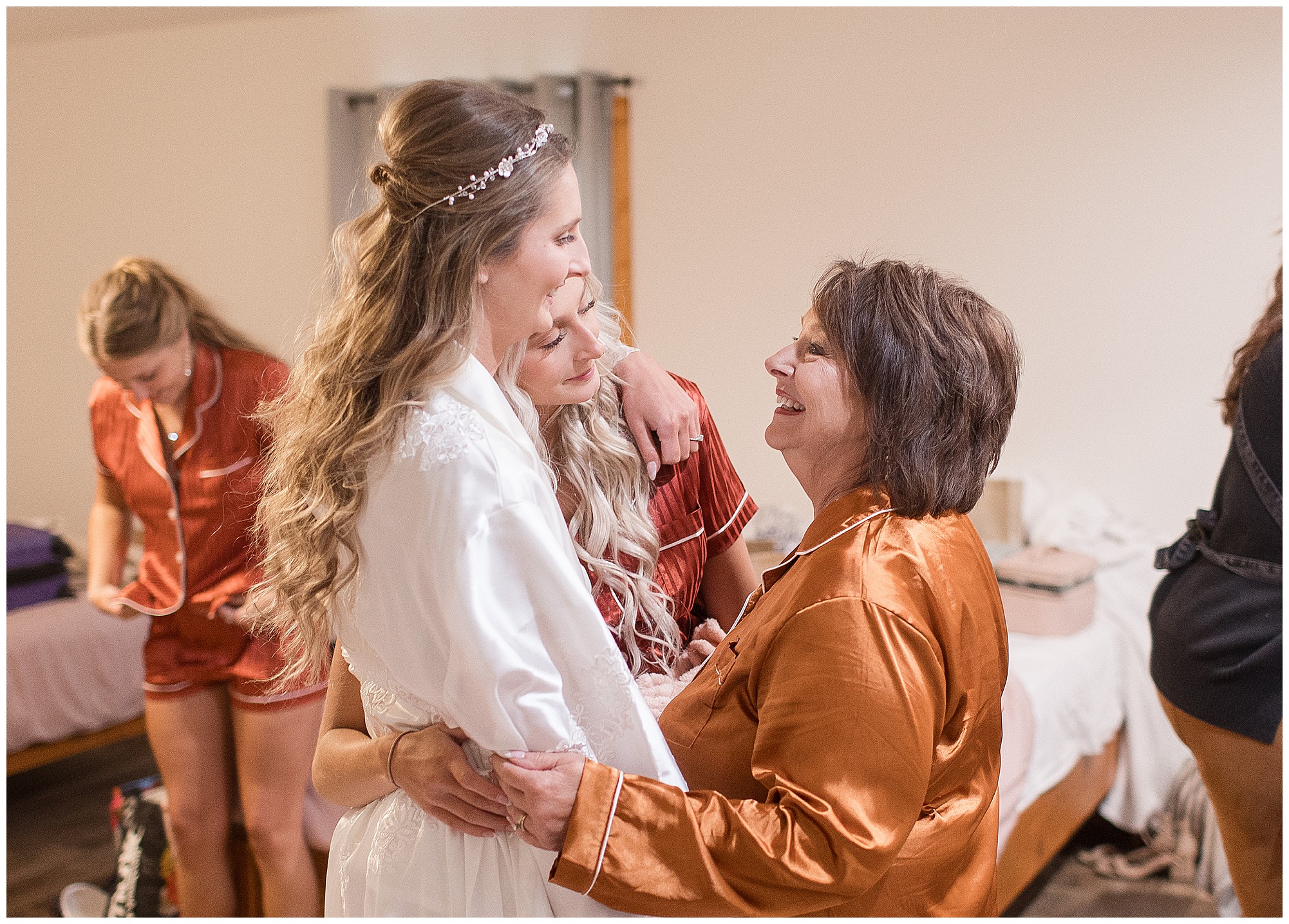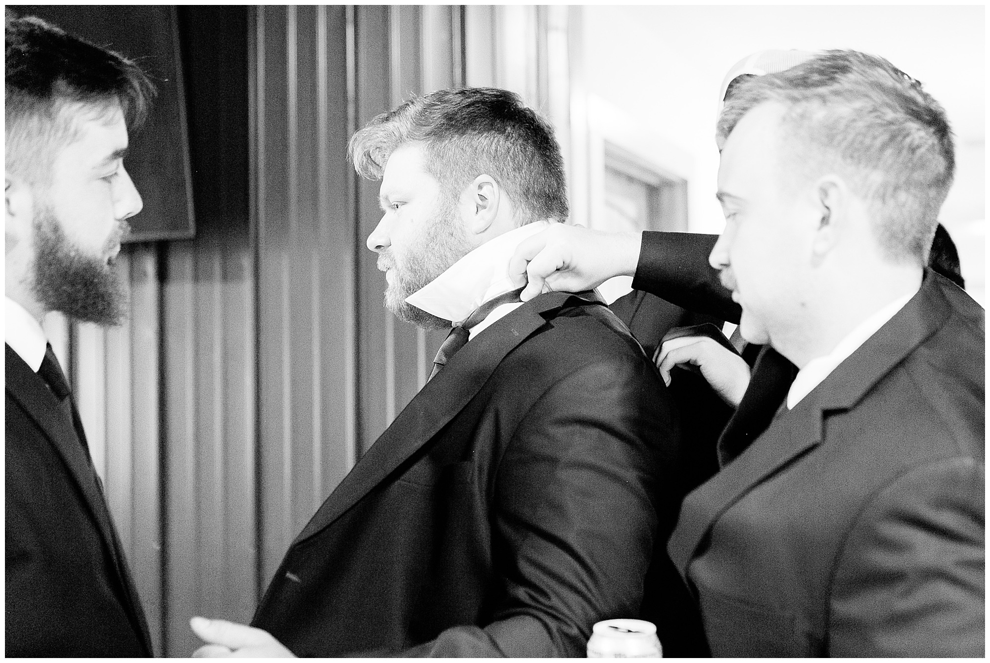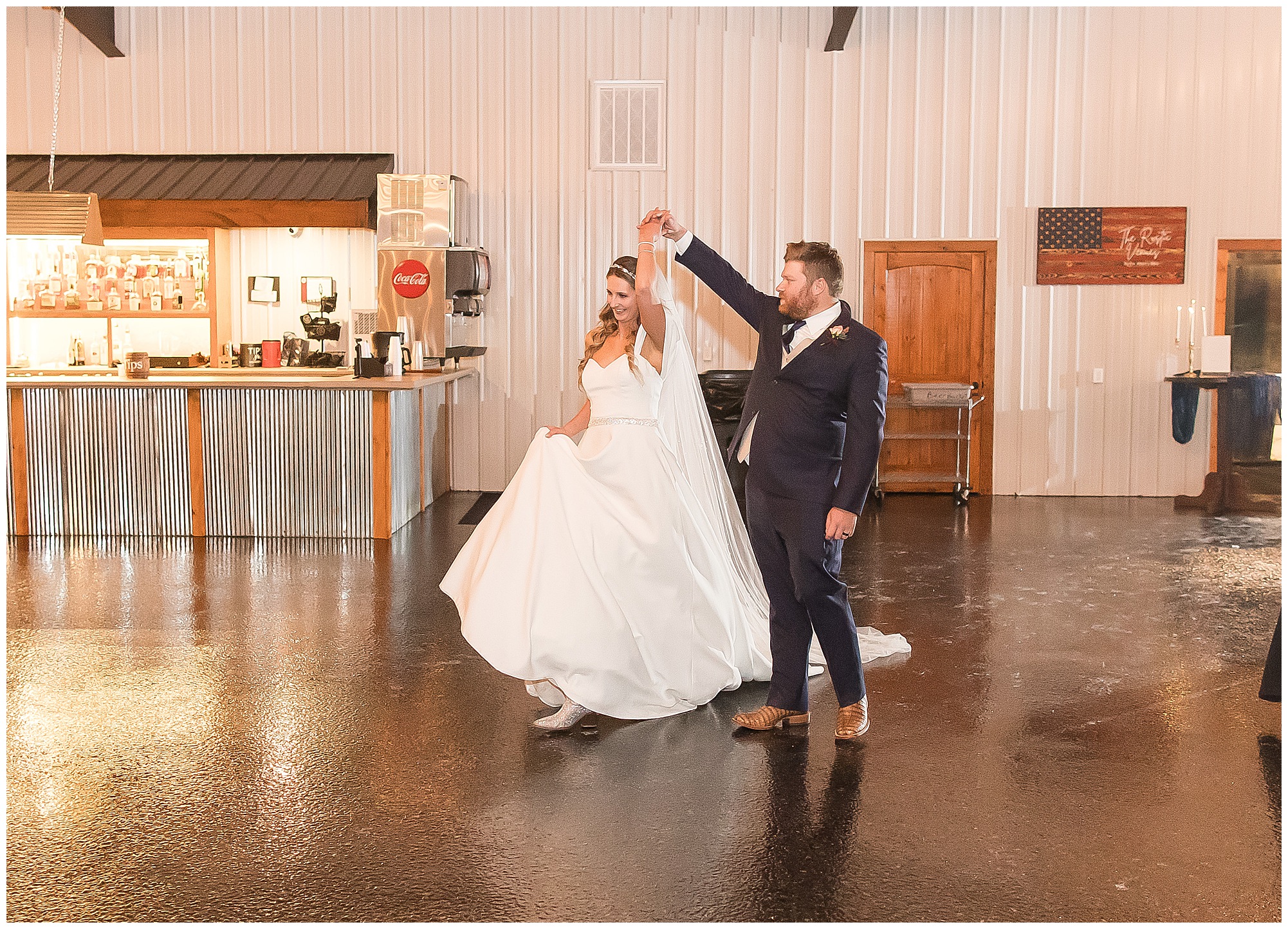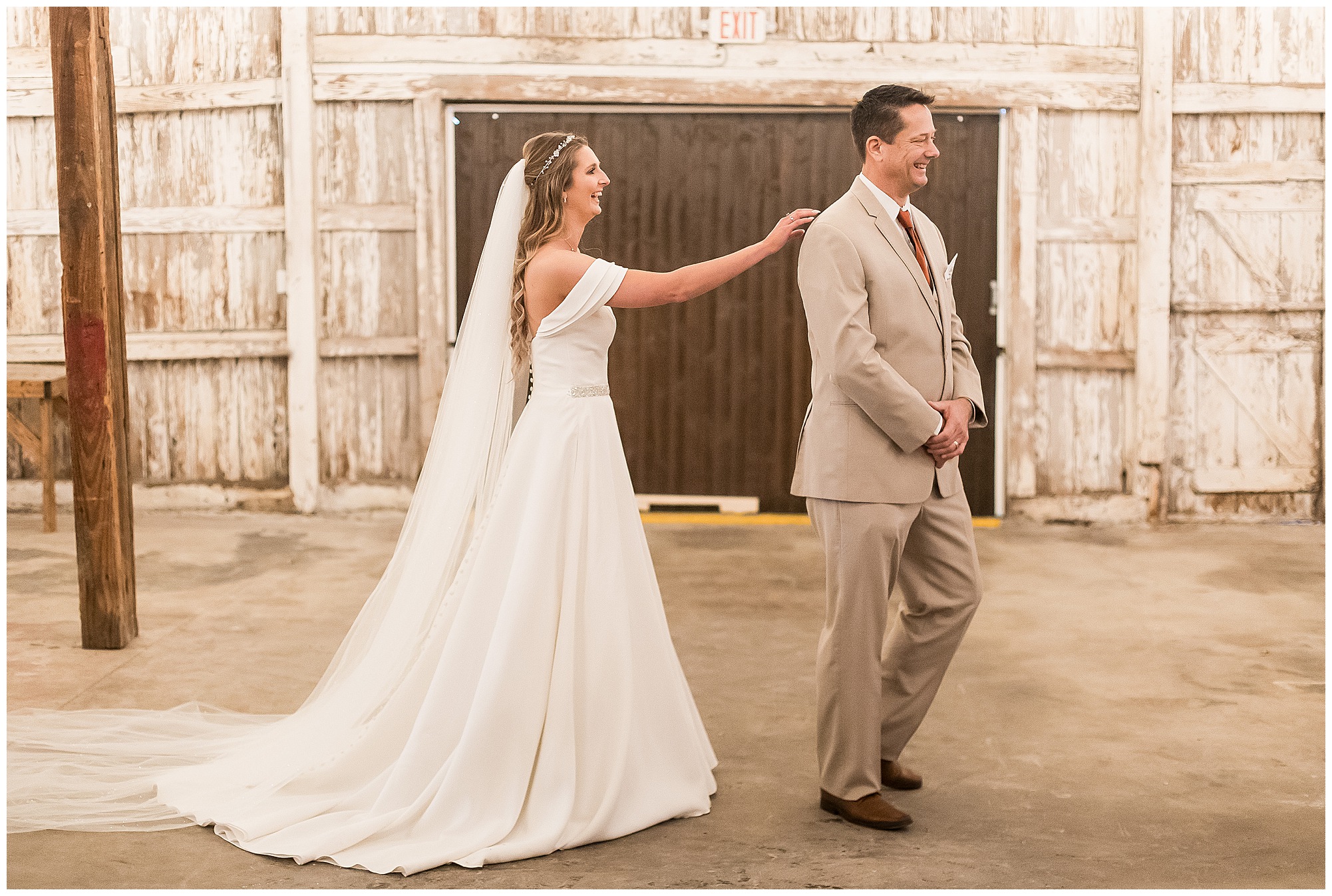 Mikaela and Scott’s wedding day the Saturday after Thanksgiving brought out some joyful emotions, a bunch of laughter among family and friends, plus a touch of winter magic! These two loved the feel The Rustic Venues in Girard, Illinois provided for their celebration. A space where both the bride and groom, along with all of their loved ones could get ready in the morning without running into each other. Plus an options for photos and their reception to host all of their most treasured people. My morning began with Mikaela and her ladies in the bridal suite as she was getting her hair done and the suite was bustling with all the last minute things the girls do on wedding day. This bride was fairly laid back and simply ready to get to the part where she sees here groom, but since they chose not to see one another prior to the ceremony, she and Scott did have a little bit longer to wait. Mikaela’s mom, Shauna and sister, Sophie (and Maid of Honor) helped her into her dress and she was simply stunning! The dress was a classic “A-frame” with a sweetheart neckline and off the shoulder straps. She had a little belt with some bling to match her rhinestone boots to bring her whole look together! Mikaela was allowing her father to see her with a first look, which was incredibly sweet. They took in one other’s outfits, shared some laughs, and Mikaela gifted her dad with an embroidered handkerchief. While all this was going on, Scott and his groomsmen were only a building away, getting ready for the big day themselves. The guys wore navy suites, with matching navy ties and vests. Scott stood apart with a gold vest and looked dapper with his guys as they prepared for the ceremony.