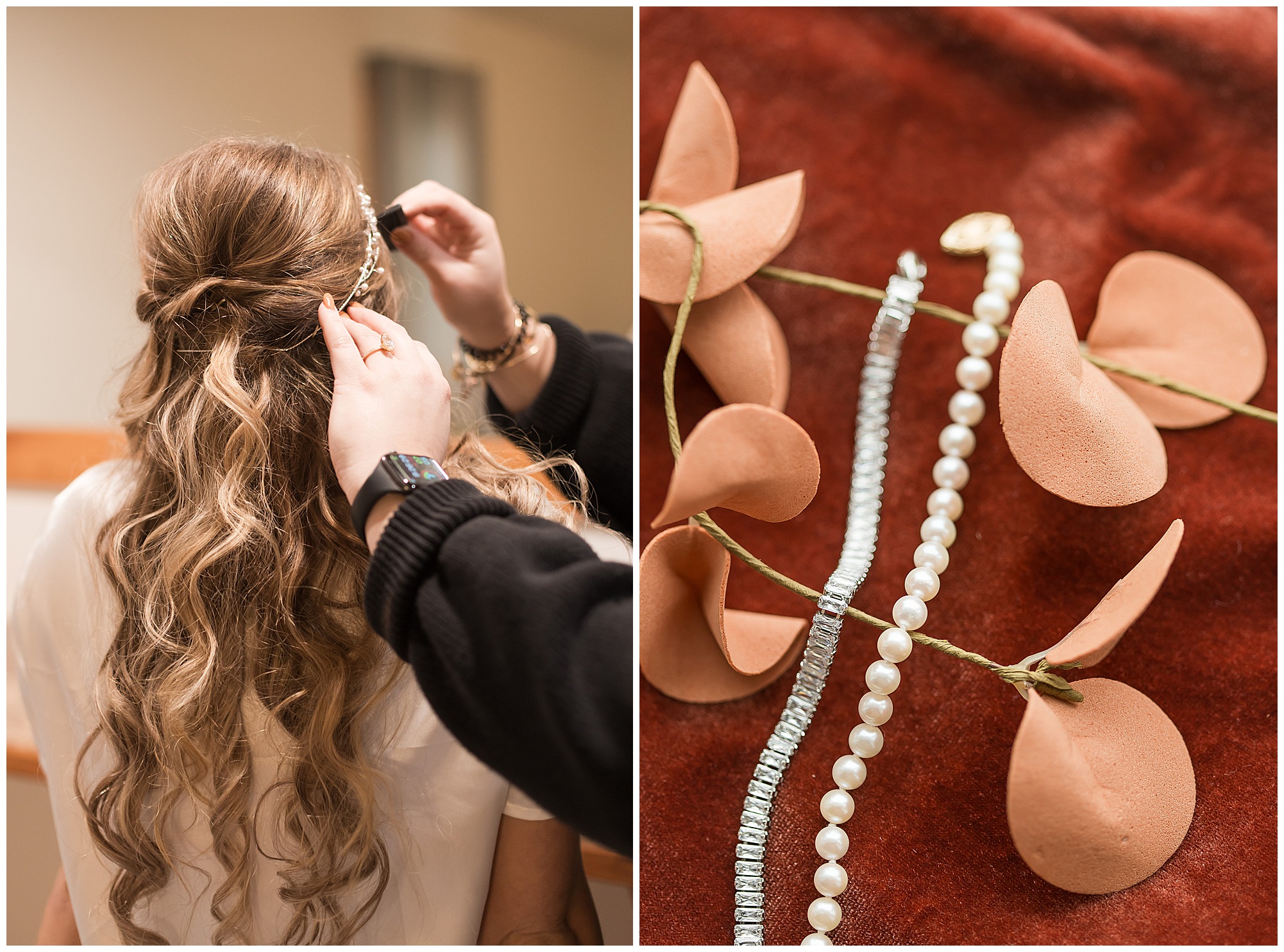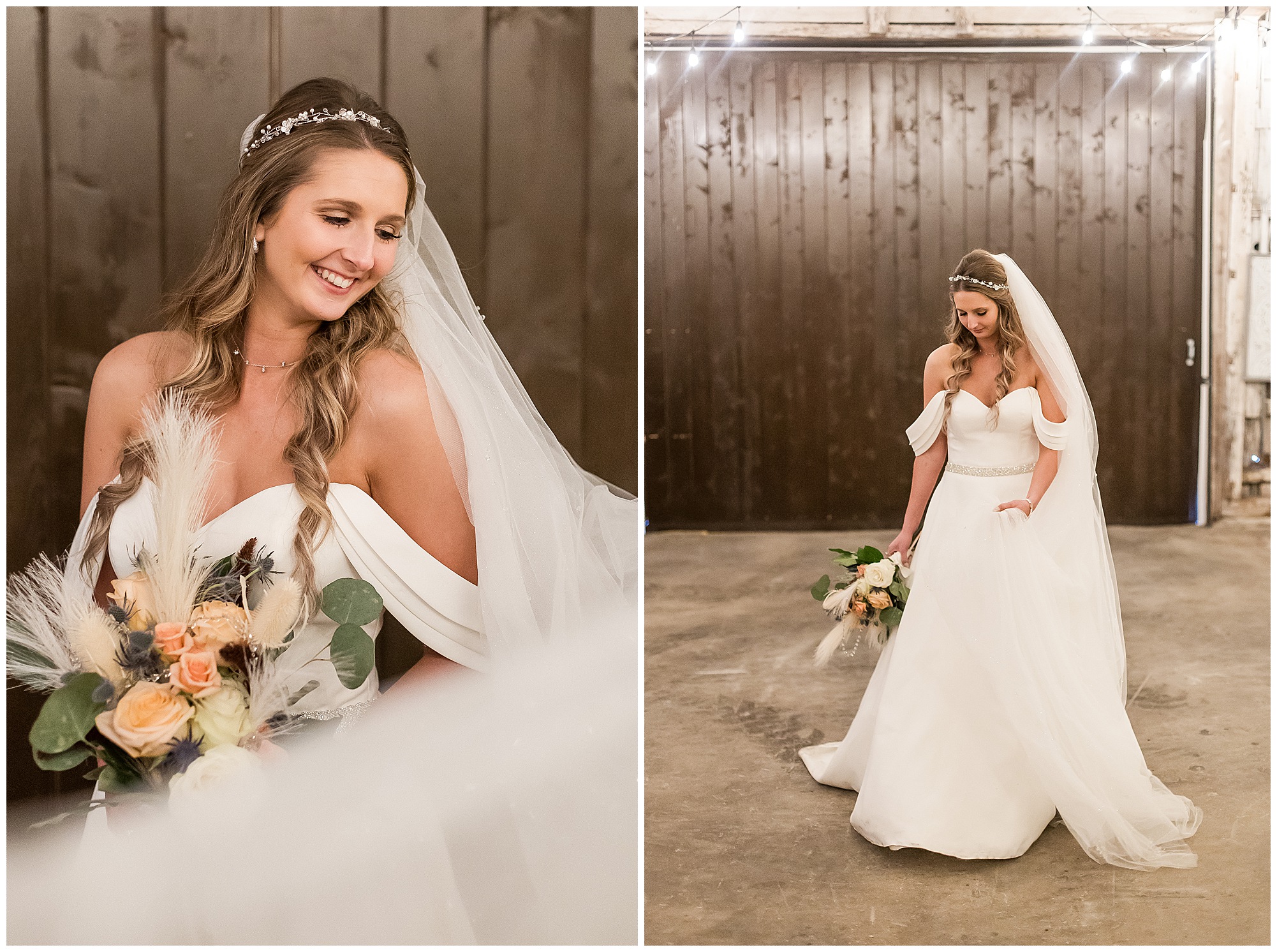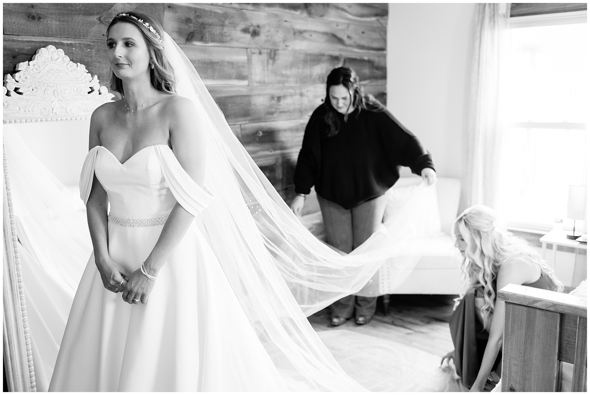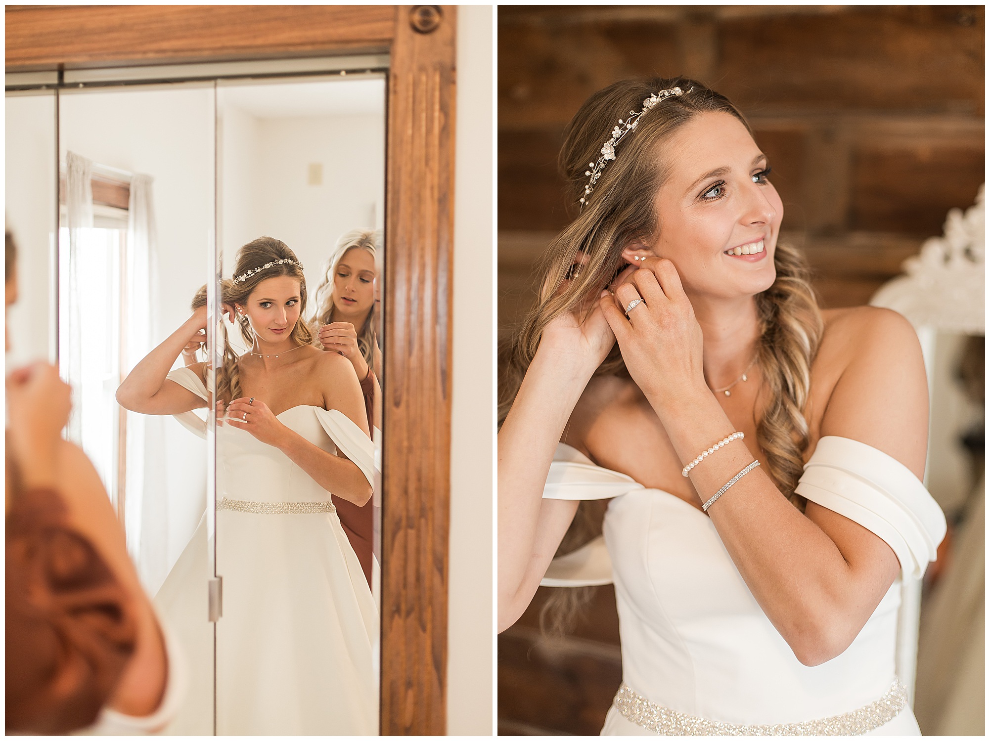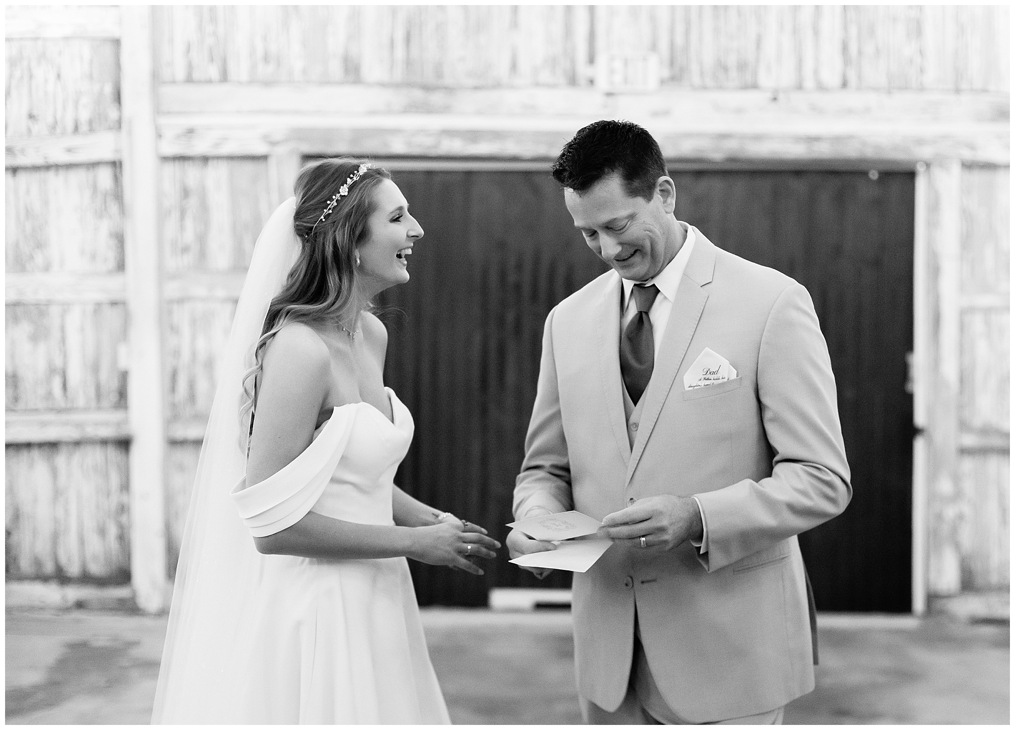 Mikaela and Scott’s wedding day the Saturday after Thanksgiving brought out some joyful emotions, a bunch of laughter among family and friends, plus a touch of winter magic! These two loved the feel The Rustic Venues in Girard, Illinois provided for their celebration. A space where both the bride and groom, along with all of their loved ones could get ready in the morning without running into each other. Plus an options for photos and their reception to host all of their most treasured people. My morning began with Mikaela and her ladies in the bridal suite as she was getting her hair done and the suite was bustling with all the last minute things the girls do on wedding day. This bride was fairly laid back and simply ready to get to the part where she sees here groom, but since they chose not to see one another prior to the ceremony, she and Scott did have a little bit longer to wait. Mikaela’s mom, Shauna and sister, Sophie (and Maid of Honor) helped her into her dress and she was simply stunning! The dress was a classic “A-frame” with a sweetheart neckline and off the shoulder straps. She had a little belt with some bling to match her rhinestone boots to bring her whole look together! Mikaela was allowing her father to see her with a first look, which was incredibly sweet. They took in one other’s outfits, shared some laughs, and Mikaela gifted her dad with an embroidered handkerchief. While all this was going on, Scott and his groomsmen were only a building away, getting ready for the big day themselves. The guys wore navy suites, with matching navy ties and vests. Scott stood apart with a gold vest and looked dapper with his guys as they prepared for the ceremony.