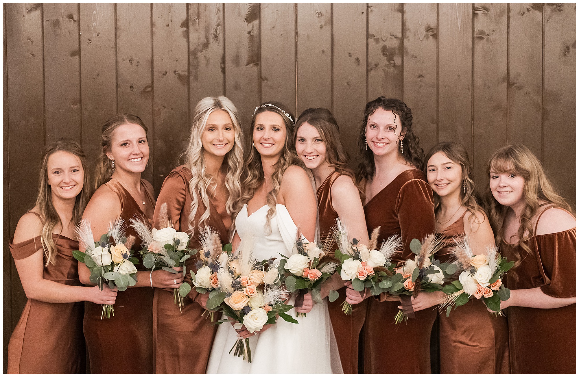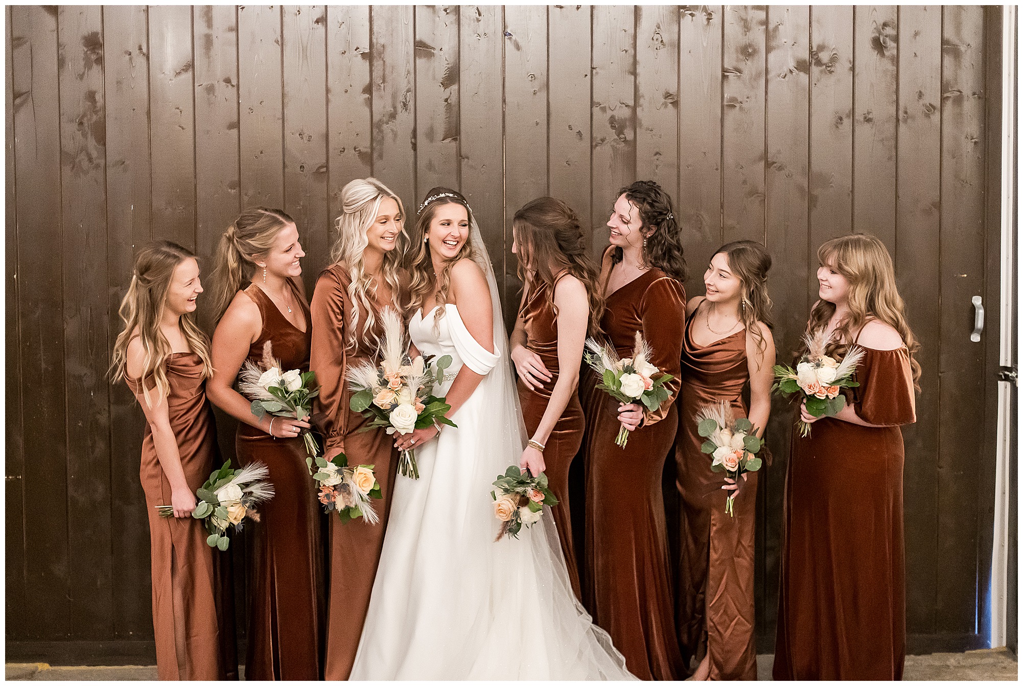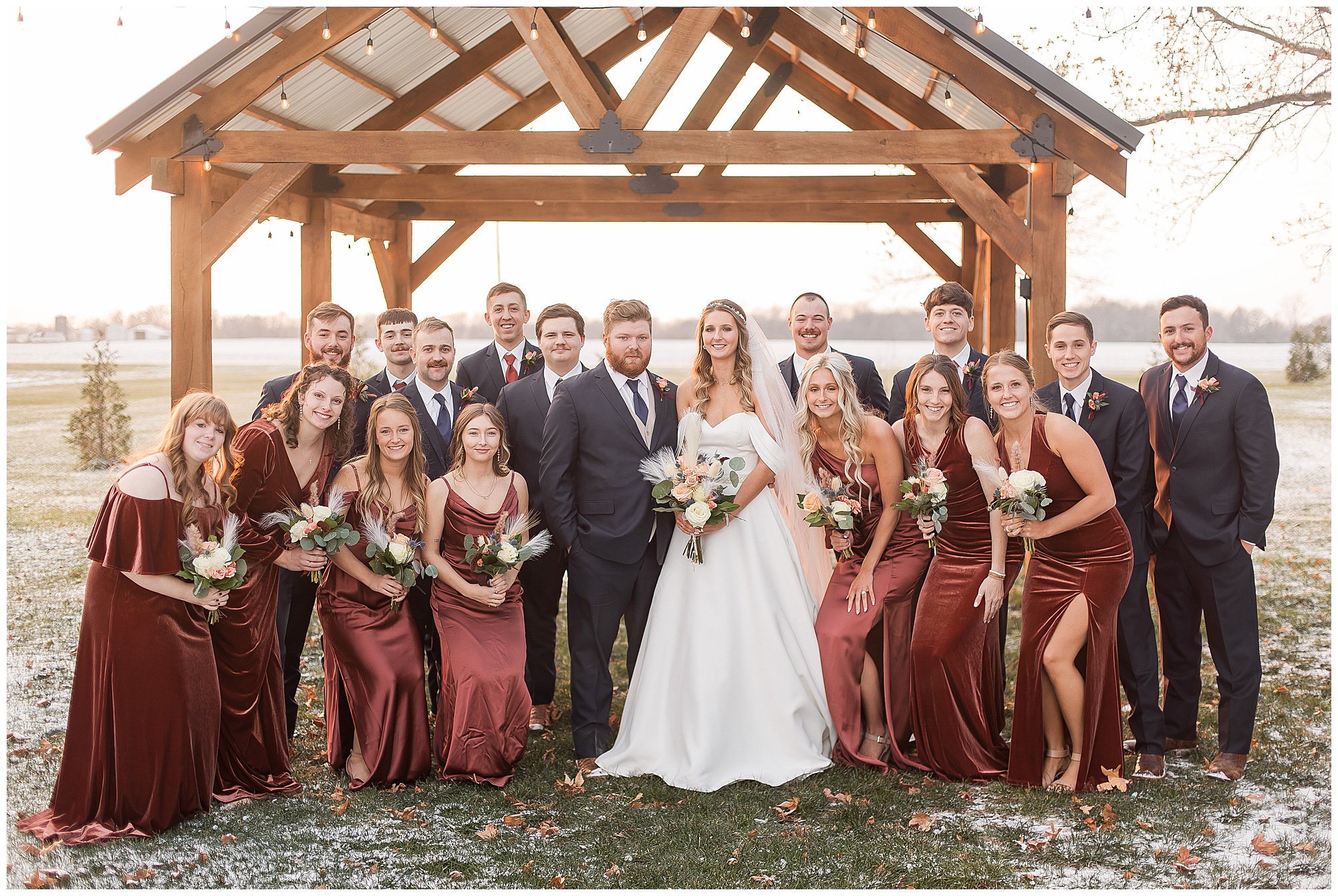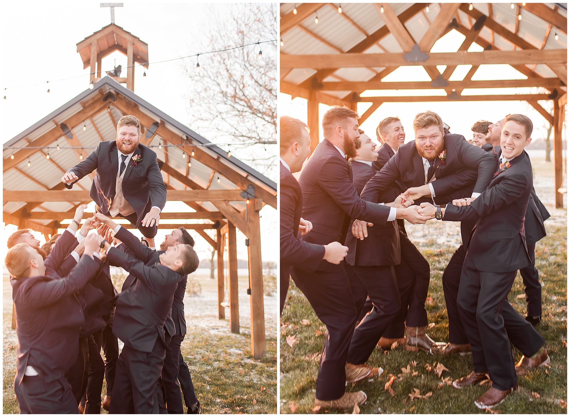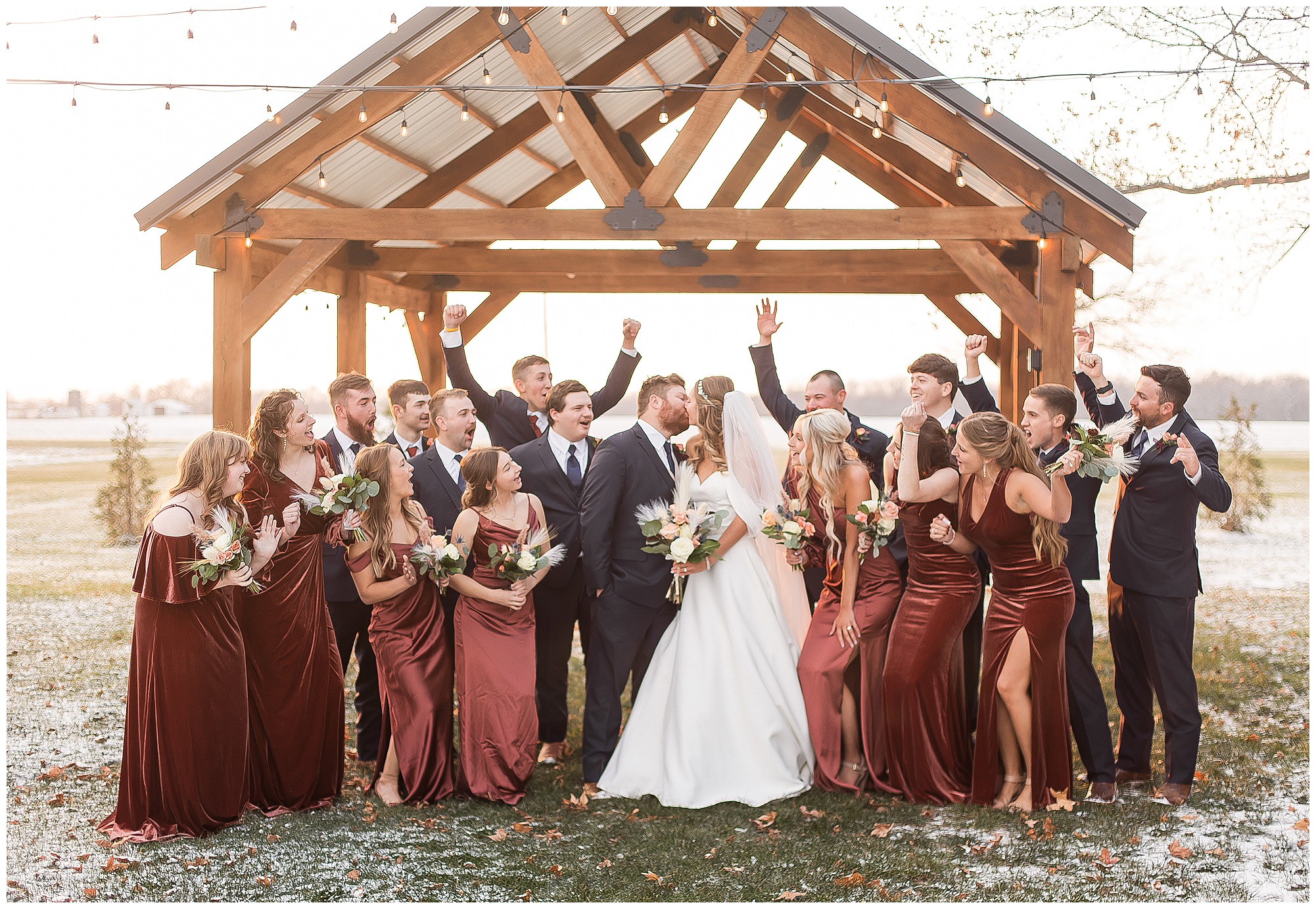 By the time we were making the 40 minute drive back to The Rustic Venues, the cold autumn afternoon had given way to skies allowing for some falling snow. Of course no one loved the idea of driving in the snow. Luckily, everyone made it back safely and Mikaela and Scott had the beautiful barn at the venues for us to keep us warm while we had portrait time. This bridal crew was a blast, keeping our time together light-hearted and fun. I loved the look of the girl’s rust orange dresses next to the guy’s navy suits in the rustic barn. We took some time with the newlyweds inside to give them a few moments together. Then I caught a glimpse of some golden glow happening outside and I convinced everyone to head out to see. The wind had died down, there was the perfect dusting of fluffy white snow on the ground, and the sun had peeked out from behind the clouds! We grabbed a few bridal party photos, including the groomsmen throwing Scott (which he fully gave the “OK” for and was their idea…Not mine)! Before it was just Mr. & Mrs. Wheat for some of my most FAVORITE photos of all time! Mikaela and Scott were just enjoying the moment and the sun and snow were paid actors for their wedding day photos! I’m thrilled we got these two outside for a few photos considering this pair LOVES the outdoors in their every day lives.