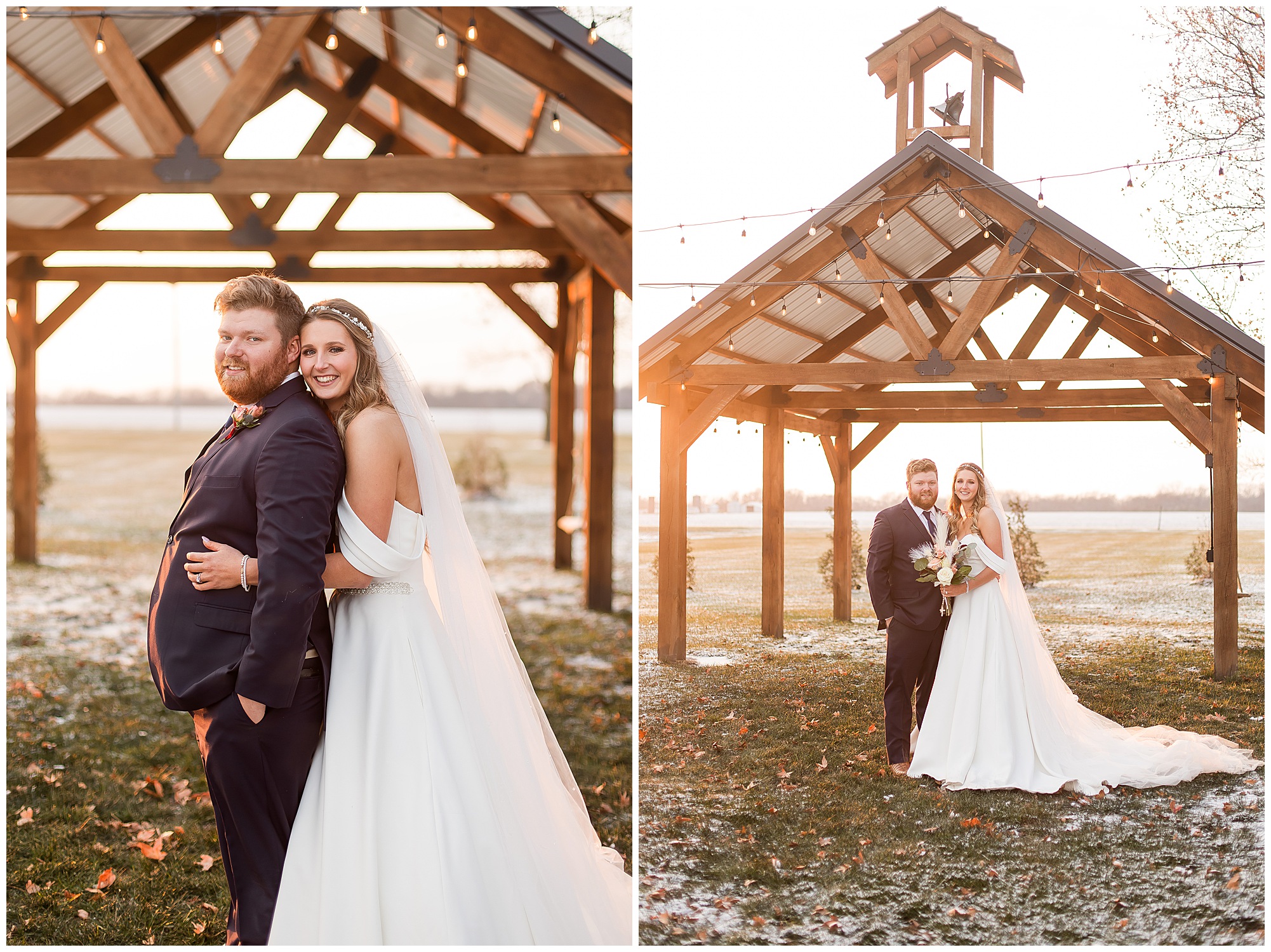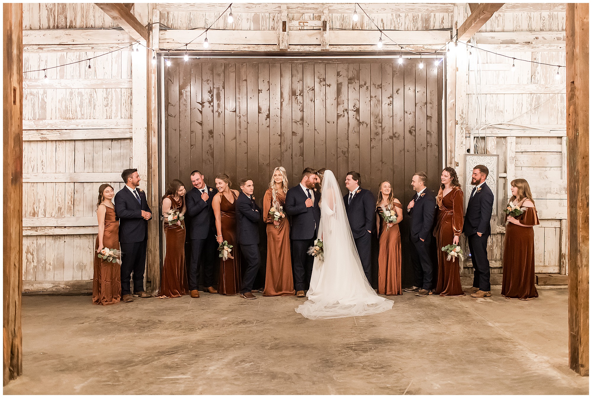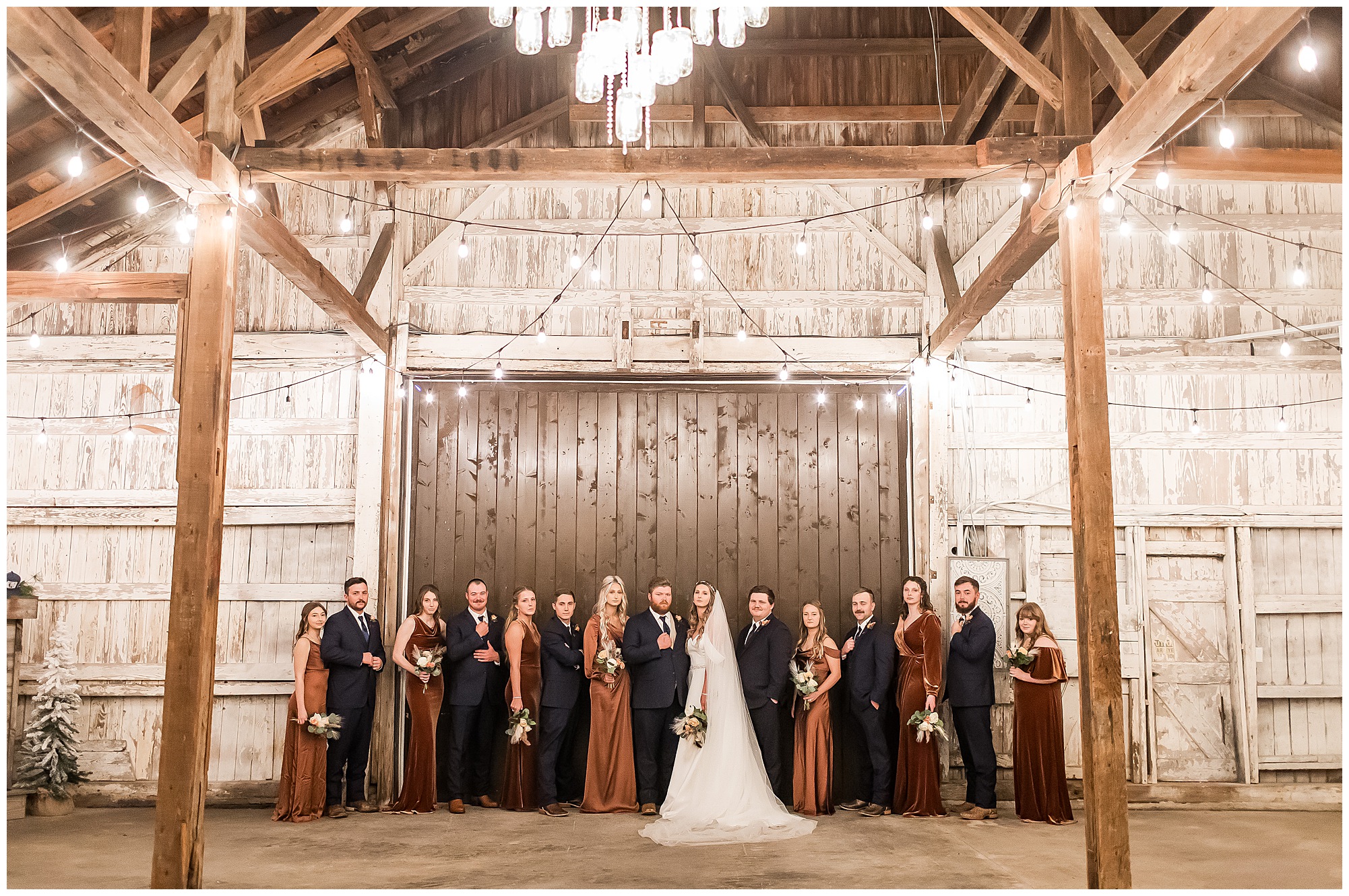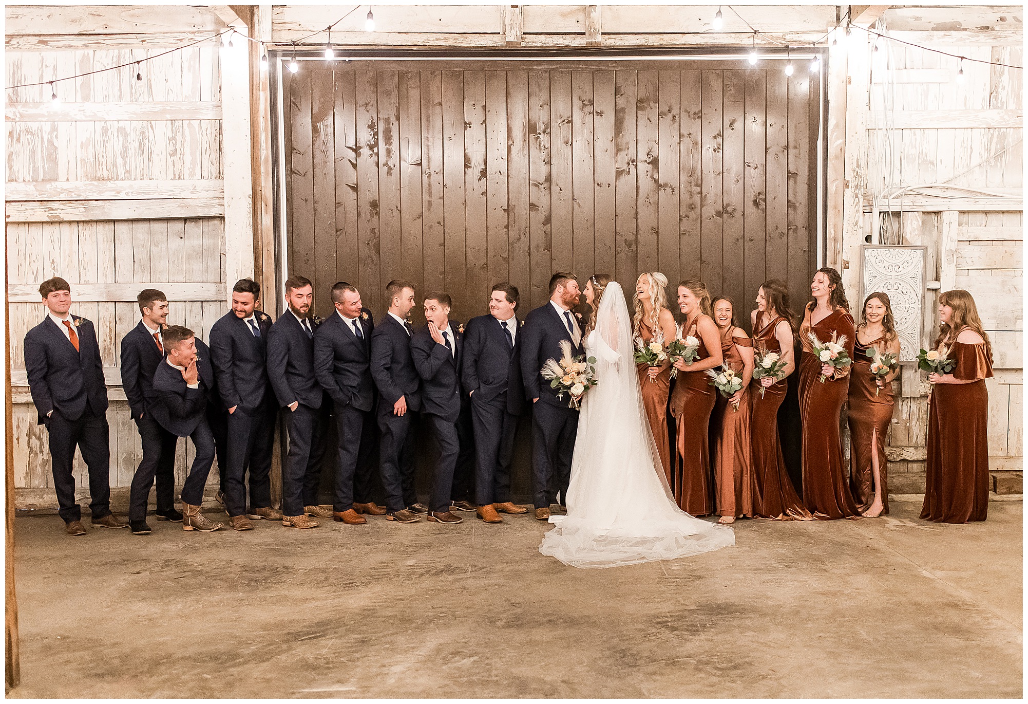 By the time we were making the 40 minute drive back to The Rustic Venues, the cold autumn afternoon had given way to skies allowing for some falling snow. Of course no one loved the idea of driving in the snow. Luckily, everyone made it back safely and Mikaela and Scott had the beautiful barn at the venues for us to keep us warm while we had portrait time. This bridal crew was a blast, keeping our time together light-hearted and fun. I loved the look of the girl’s rust orange dresses next to the guy’s navy suits in the rustic barn. We took some time with the newlyweds inside to give them a few moments together. Then I caught a glimpse of some golden glow happening outside and I convinced everyone to head out to see. The wind had died down, there was the perfect dusting of fluffy white snow on the ground, and the sun had peeked out from behind the clouds! We grabbed a few bridal party photos, including the groomsmen throwing Scott (which he fully gave the “OK” for and was their idea…Not mine)! Before it was just Mr. & Mrs. Wheat for some of my most FAVORITE photos of all time! Mikaela and Scott were just enjoying the moment and the sun and snow were paid actors for their wedding day photos! I’m thrilled we got these two outside for a few photos considering this pair LOVES the outdoors in their every day lives.