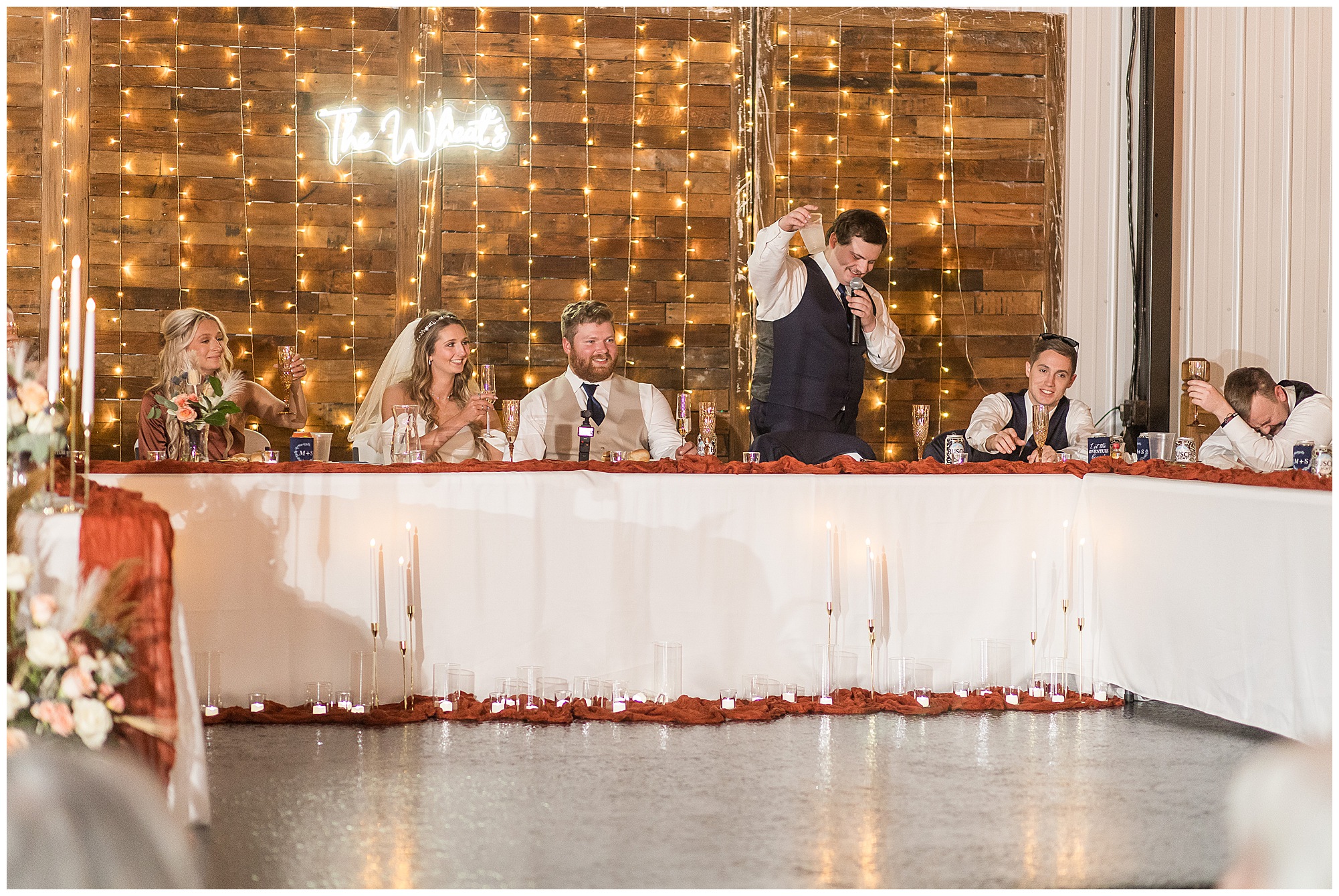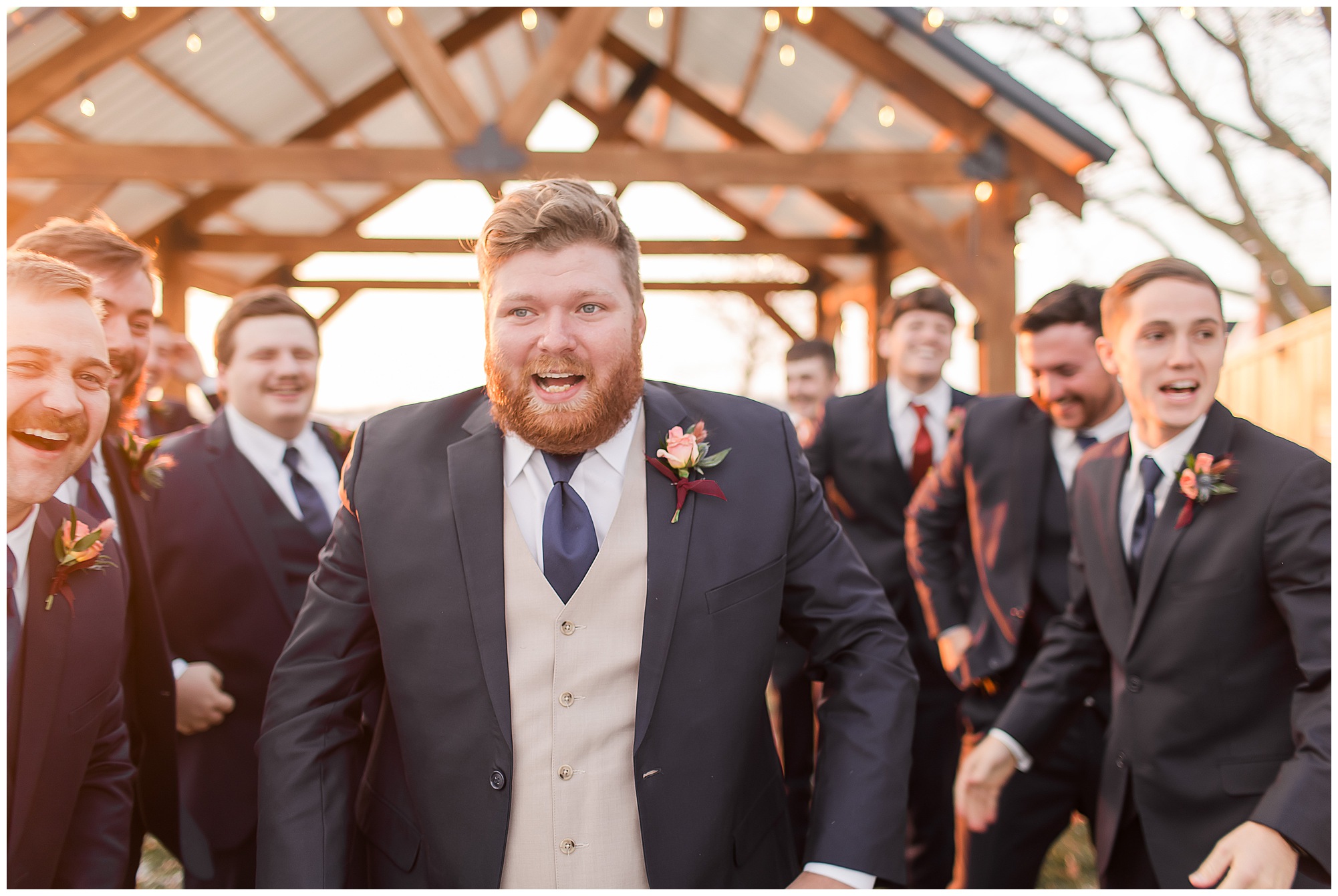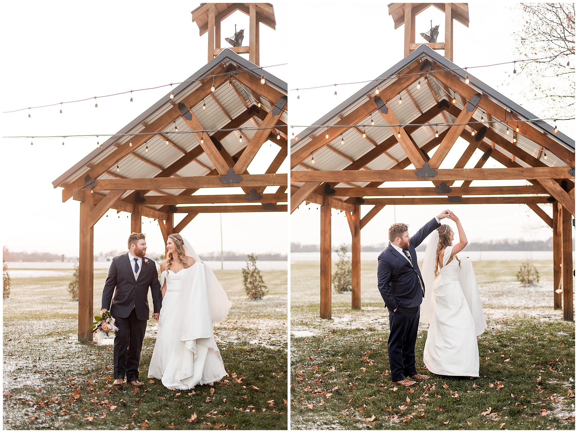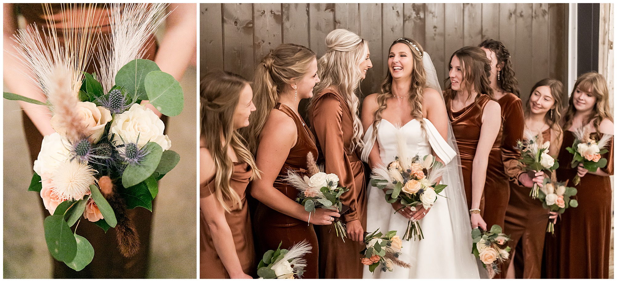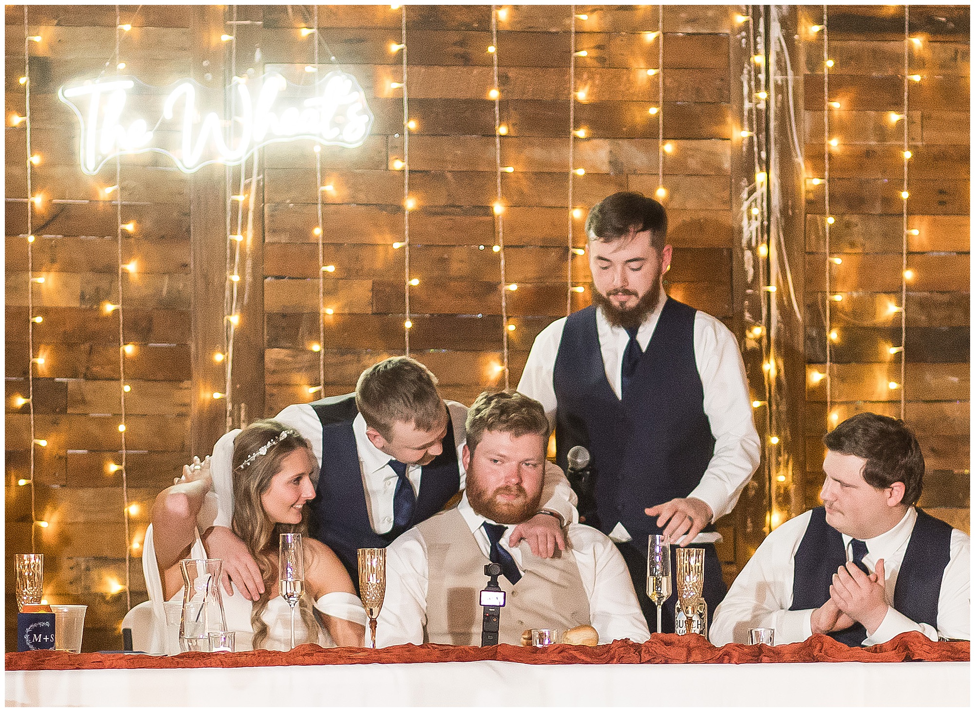 By the time we were making the 40 minute drive back to The Rustic Venues, the cold autumn afternoon had given way to skies allowing for some falling snow. Of course no one loved the idea of driving in the snow. Luckily, everyone made it back safely and Mikaela and Scott had the beautiful barn at the venues for us to keep us warm while we had portrait time. This bridal crew was a blast, keeping our time together light-hearted and fun. I loved the look of the girl’s rust orange dresses next to the guy’s navy suits in the rustic barn. We took some time with the newlyweds inside to give them a few moments together. Then I caught a glimpse of some golden glow happening outside and I convinced everyone to head out to see. The wind had died down, there was the perfect dusting of fluffy white snow on the ground, and the sun had peeked out from behind the clouds! We grabbed a few bridal party photos, including the groomsmen throwing Scott (which he fully gave the “OK” for and was their idea…Not mine)! Before it was just Mr. & Mrs. Wheat for some of my most FAVORITE photos of all time! Mikaela and Scott were just enjoying the moment and the sun and snow were paid actors for their wedding day photos! I’m thrilled we got these two outside for a few photos considering this pair LOVES the outdoors in their every day lives.