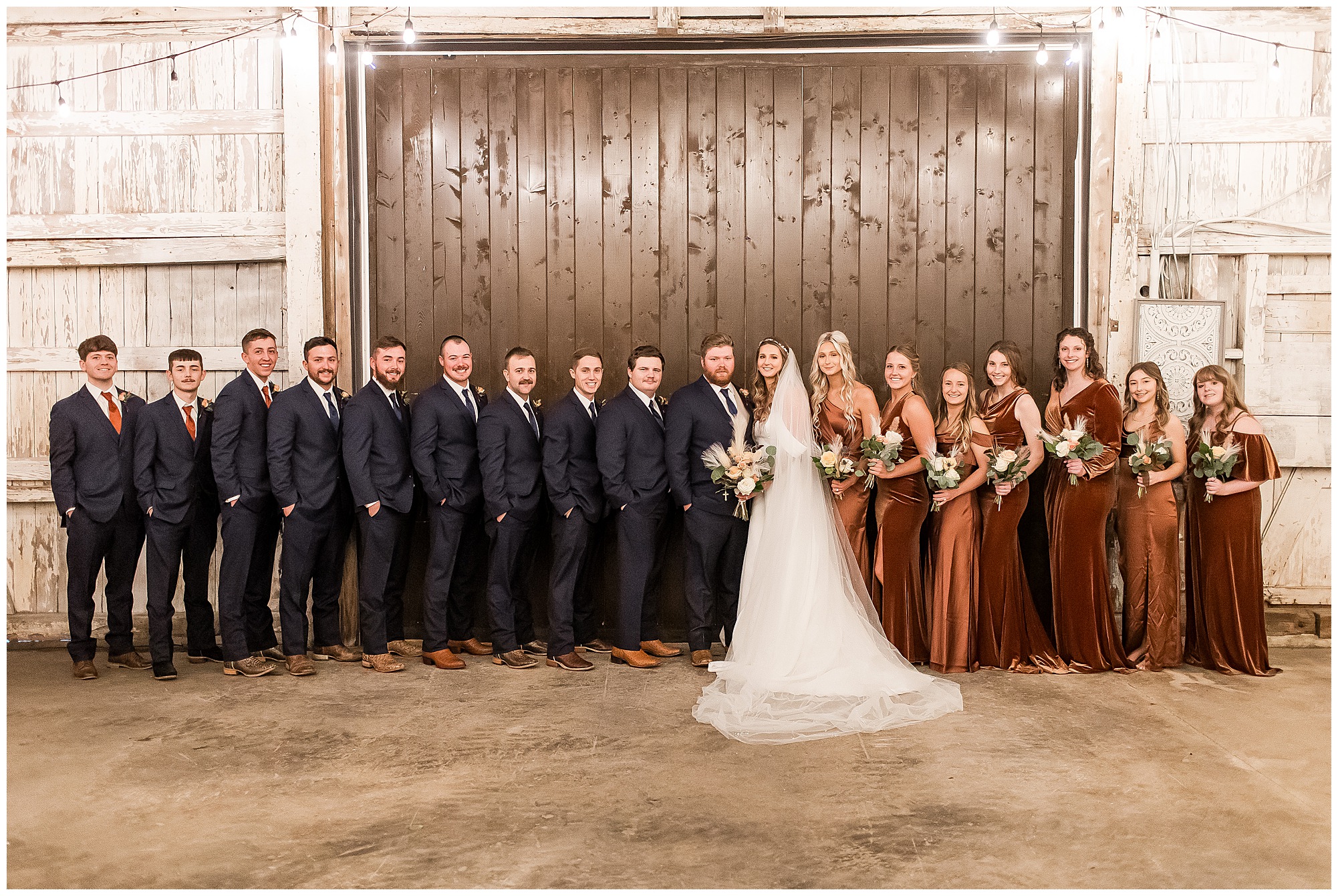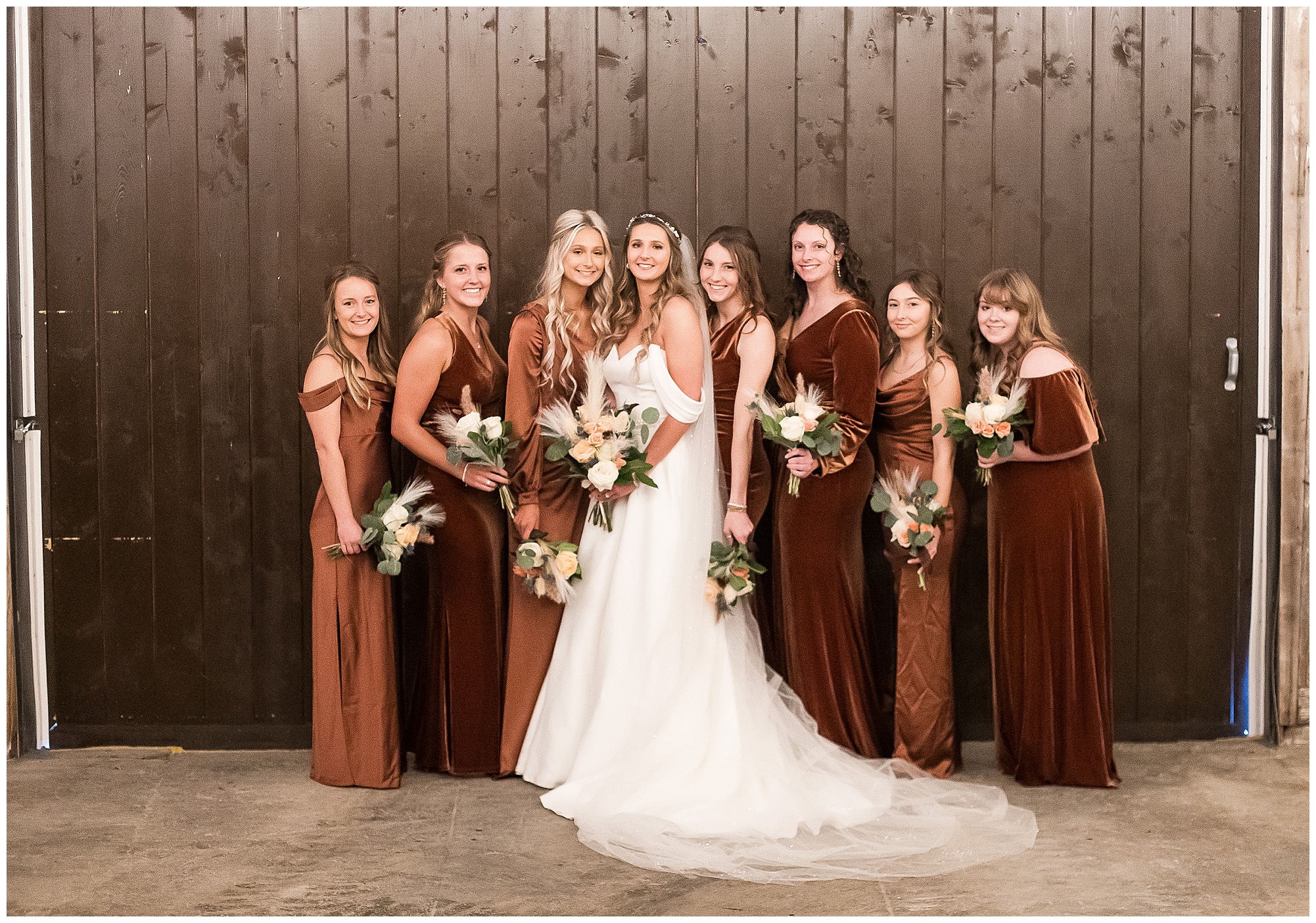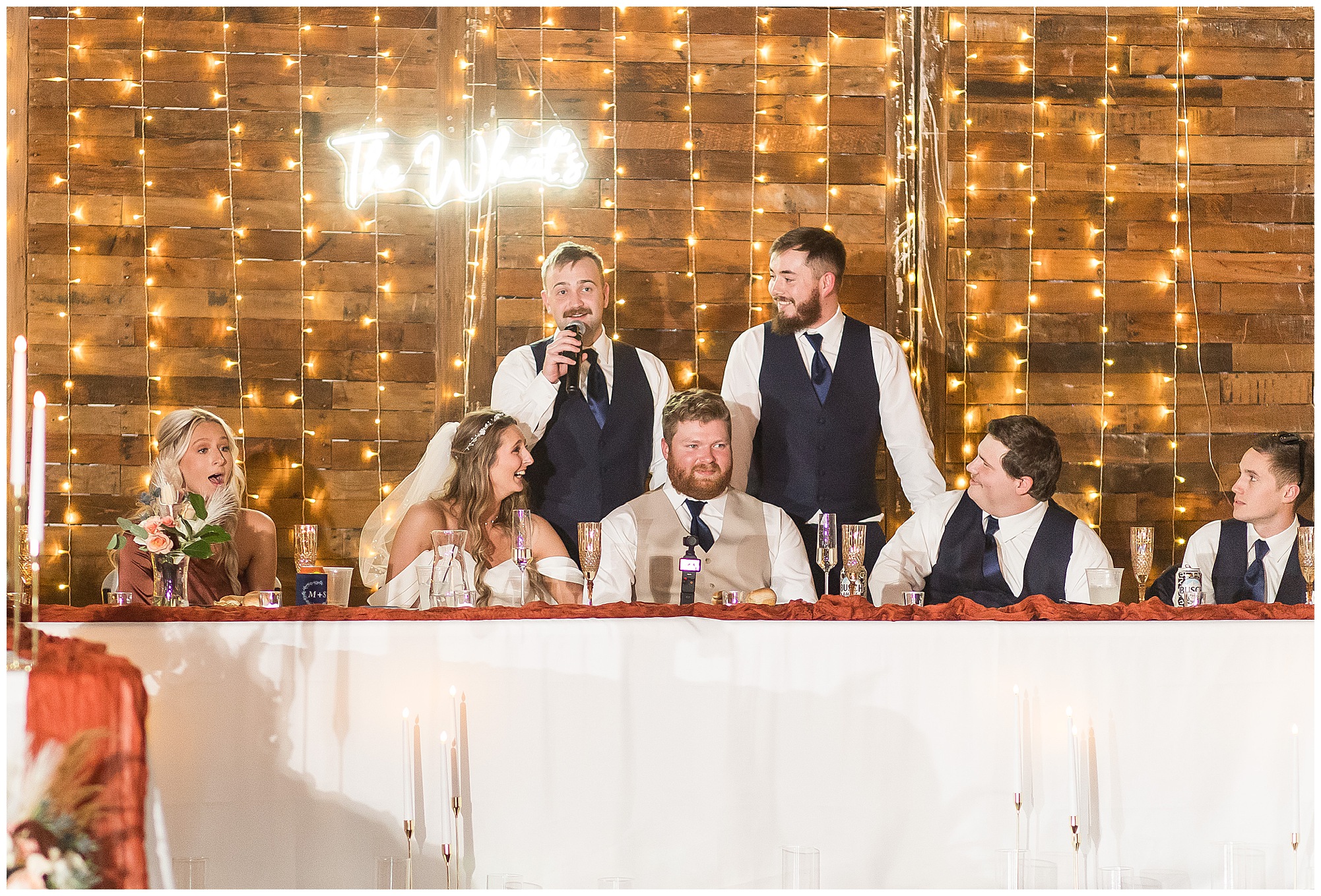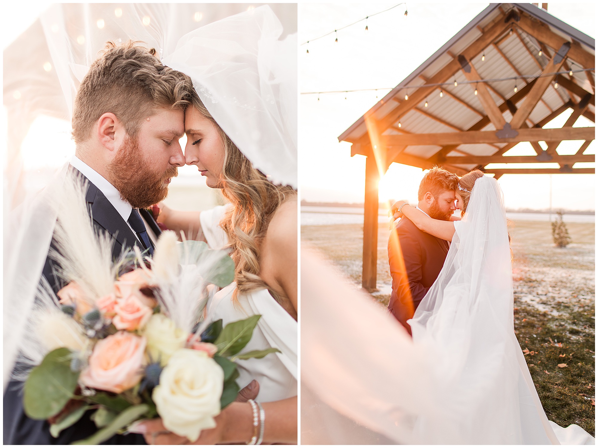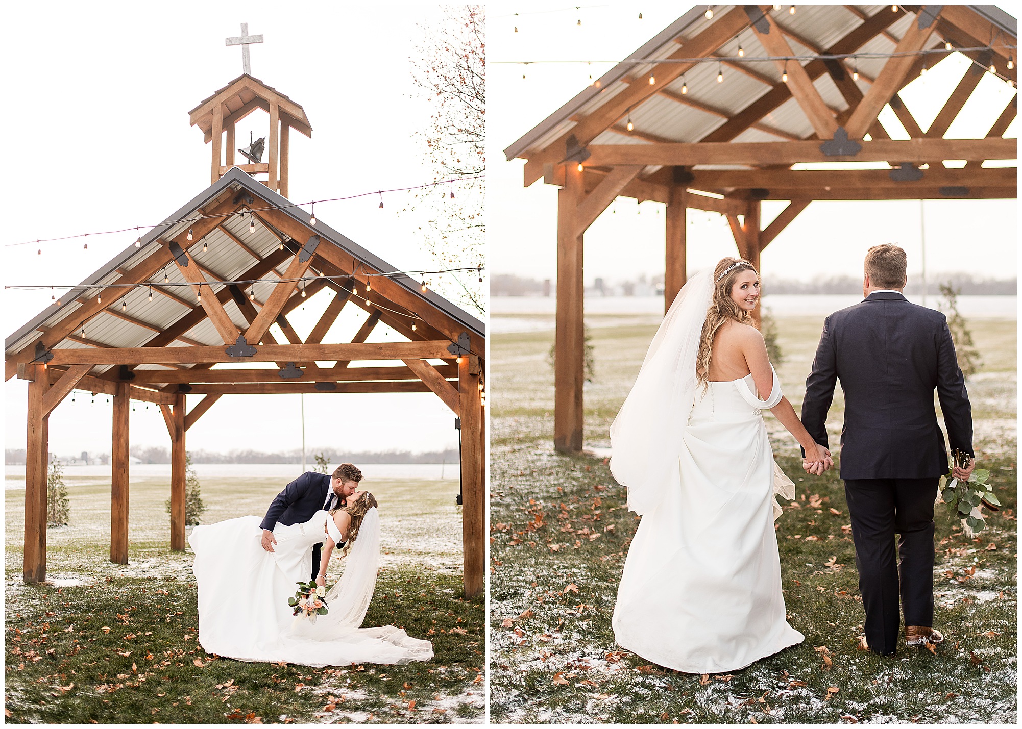 By the time we were making the 40 minute drive back to The Rustic Venues, the cold autumn afternoon had given way to skies allowing for some falling snow. Of course no one loved the idea of driving in the snow. Luckily, everyone made it back safely and Mikaela and Scott had the beautiful barn at the venues for us to keep us warm while we had portrait time. This bridal crew was a blast, keeping our time together light-hearted and fun. I loved the look of the girl’s rust orange dresses next to the guy’s navy suits in the rustic barn. We took some time with the newlyweds inside to give them a few moments together. Then I caught a glimpse of some golden glow happening outside and I convinced everyone to head out to see. The wind had died down, there was the perfect dusting of fluffy white snow on the ground, and the sun had peeked out from behind the clouds! We grabbed a few bridal party photos, including the groomsmen throwing Scott (which he fully gave the “OK” for and was their idea…Not mine)! Before it was just Mr. & Mrs. Wheat for some of my most FAVORITE photos of all time! Mikaela and Scott were just enjoying the moment and the sun and snow were paid actors for their wedding day photos! I’m thrilled we got these two outside for a few photos considering this pair LOVES the outdoors in their every day lives.