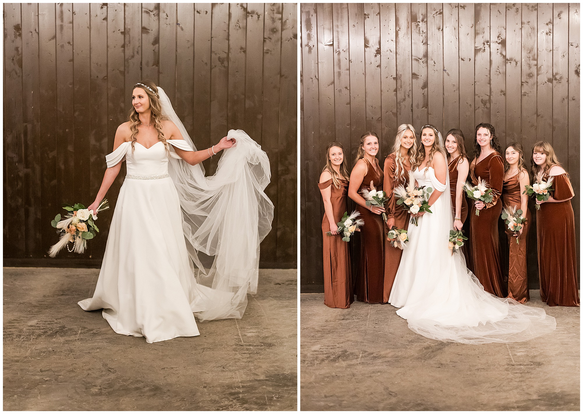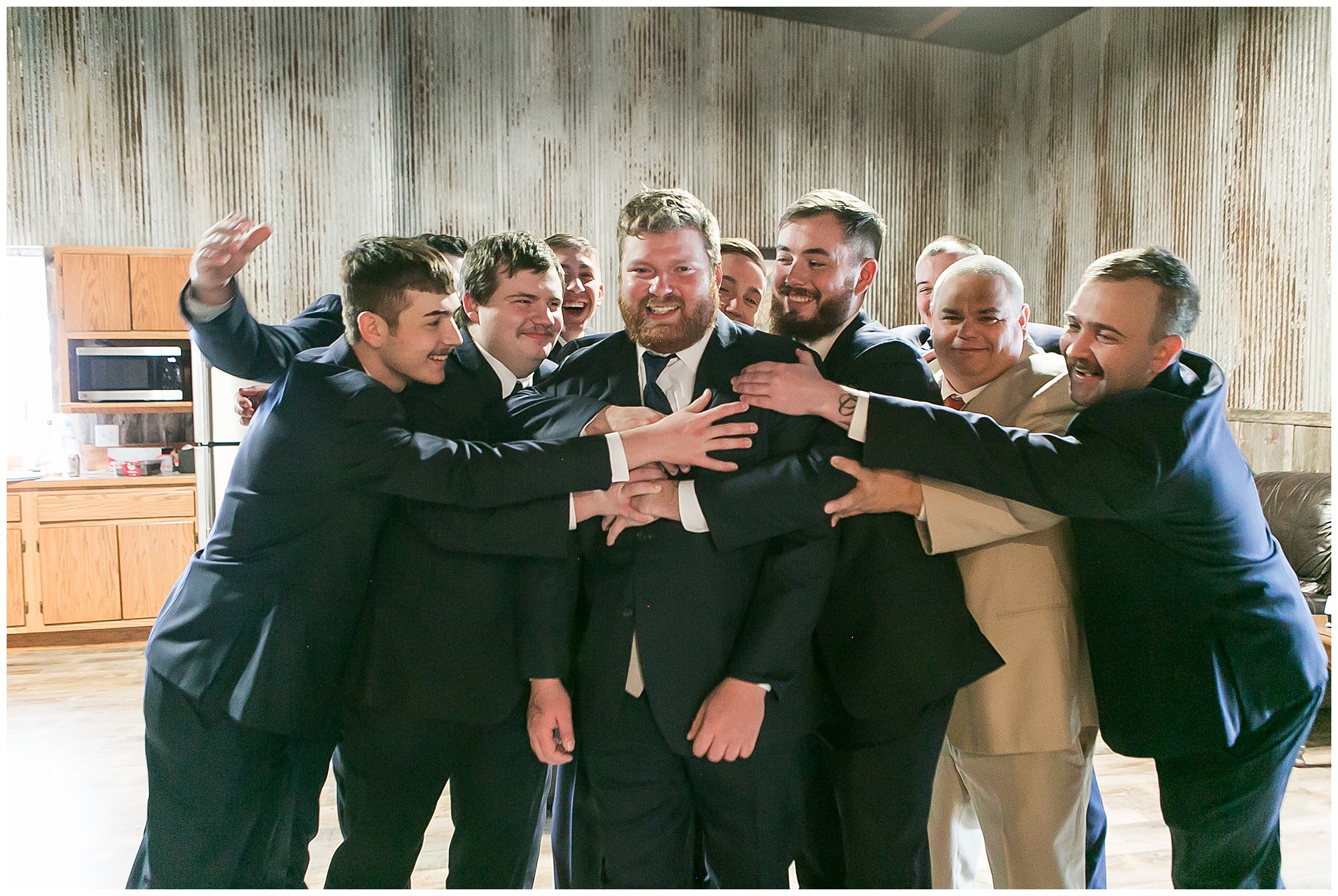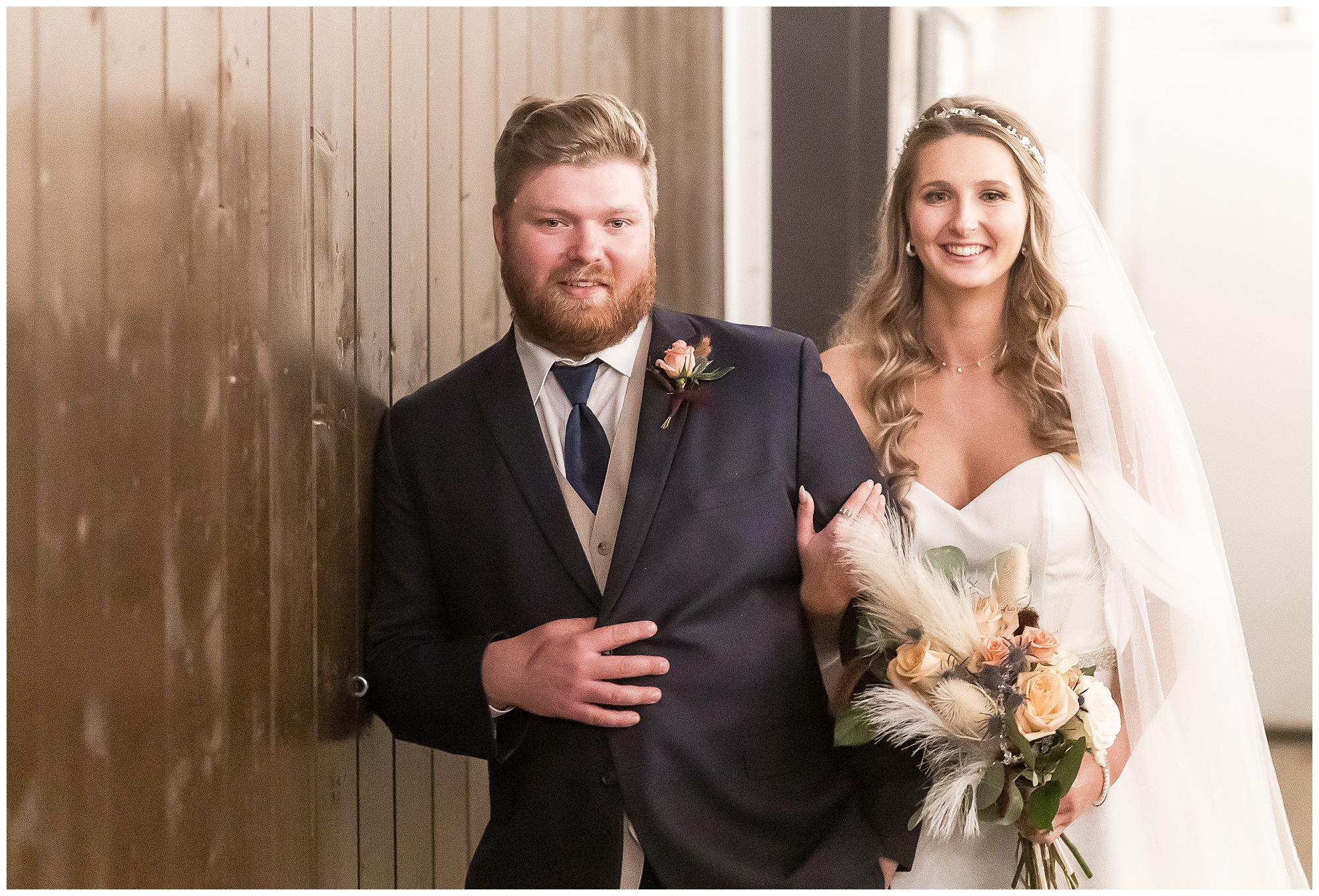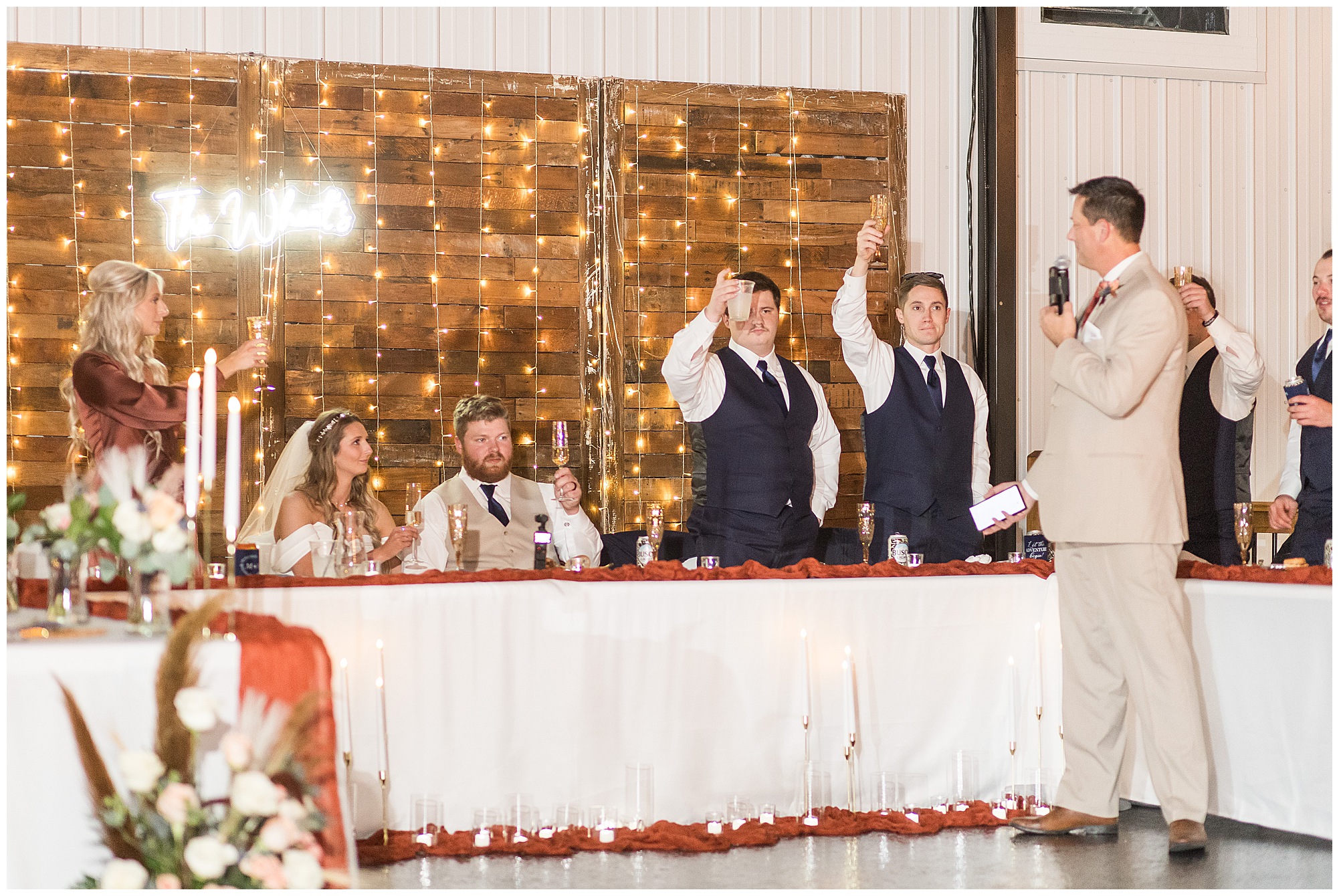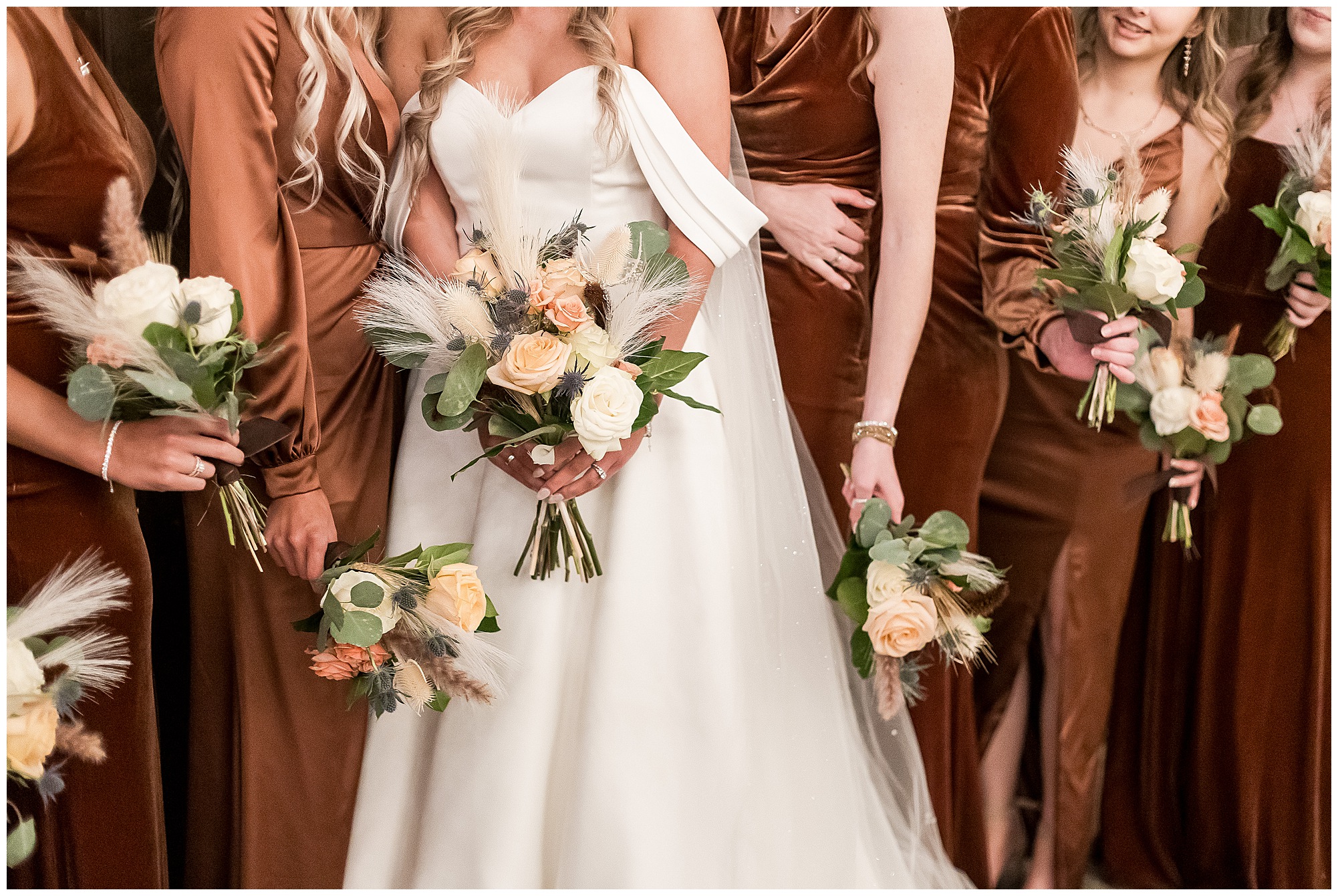 By the time we were making the 40 minute drive back to The Rustic Venues, the cold autumn afternoon had given way to skies allowing for some falling snow. Of course no one loved the idea of driving in the snow. Luckily, everyone made it back safely and Mikaela and Scott had the beautiful barn at the venues for us to keep us warm while we had portrait time. This bridal crew was a blast, keeping our time together light-hearted and fun. I loved the look of the girl’s rust orange dresses next to the guy’s navy suits in the rustic barn. We took some time with the newlyweds inside to give them a few moments together. Then I caught a glimpse of some golden glow happening outside and I convinced everyone to head out to see. The wind had died down, there was the perfect dusting of fluffy white snow on the ground, and the sun had peeked out from behind the clouds! We grabbed a few bridal party photos, including the groomsmen throwing Scott (which he fully gave the “OK” for and was their idea…Not mine)! Before it was just Mr. & Mrs. Wheat for some of my most FAVORITE photos of all time! Mikaela and Scott were just enjoying the moment and the sun and snow were paid actors for their wedding day photos! I’m thrilled we got these two outside for a few photos considering this pair LOVES the outdoors in their every day lives.