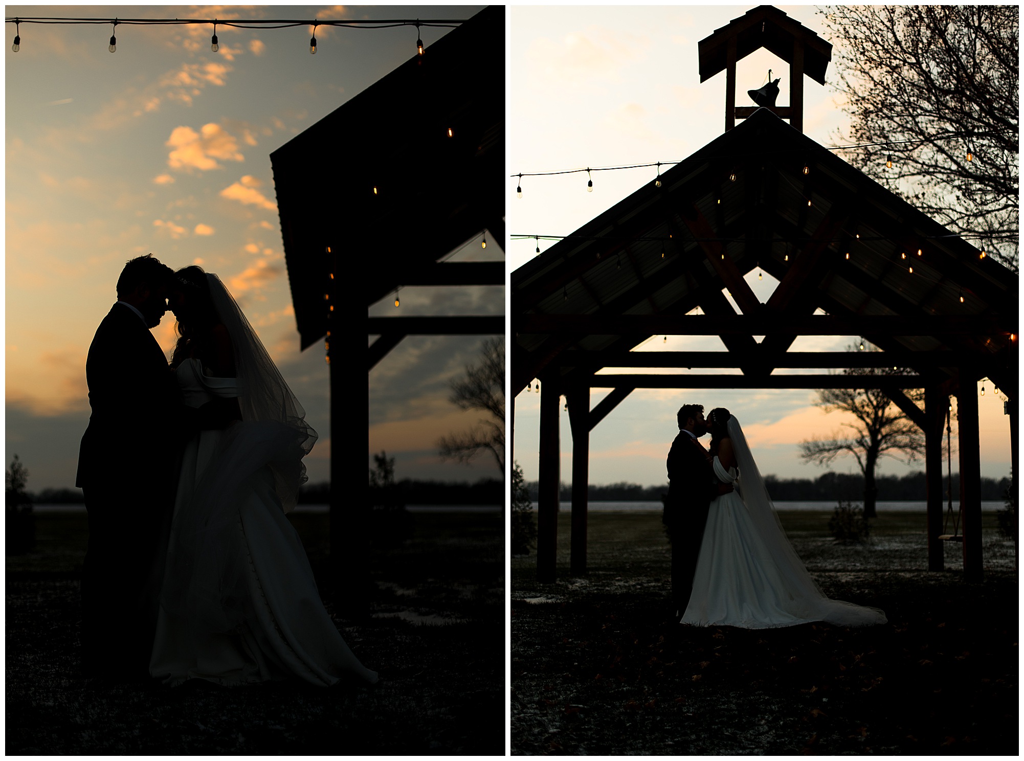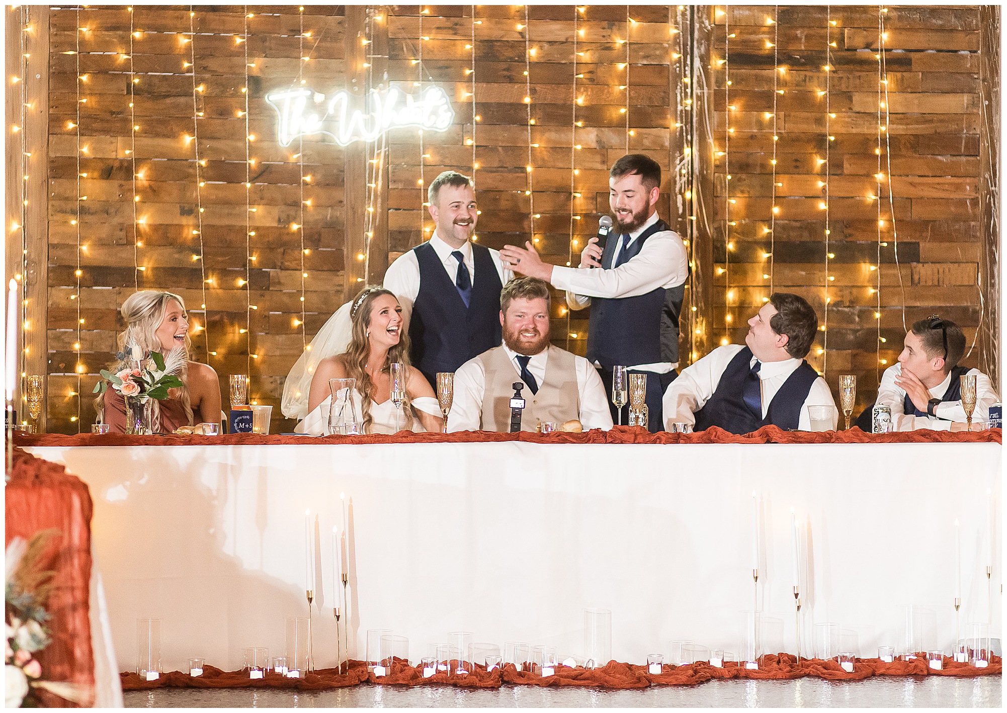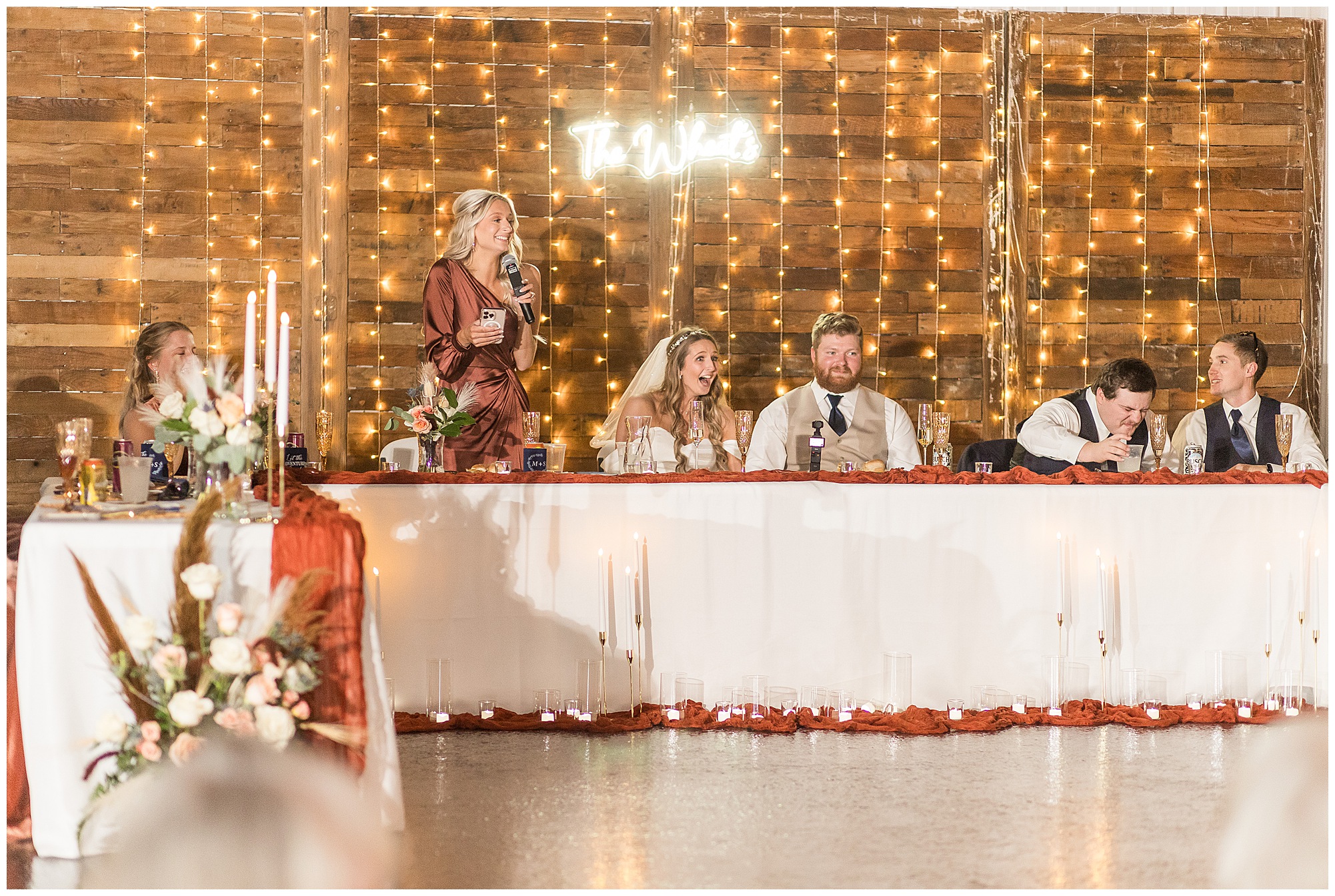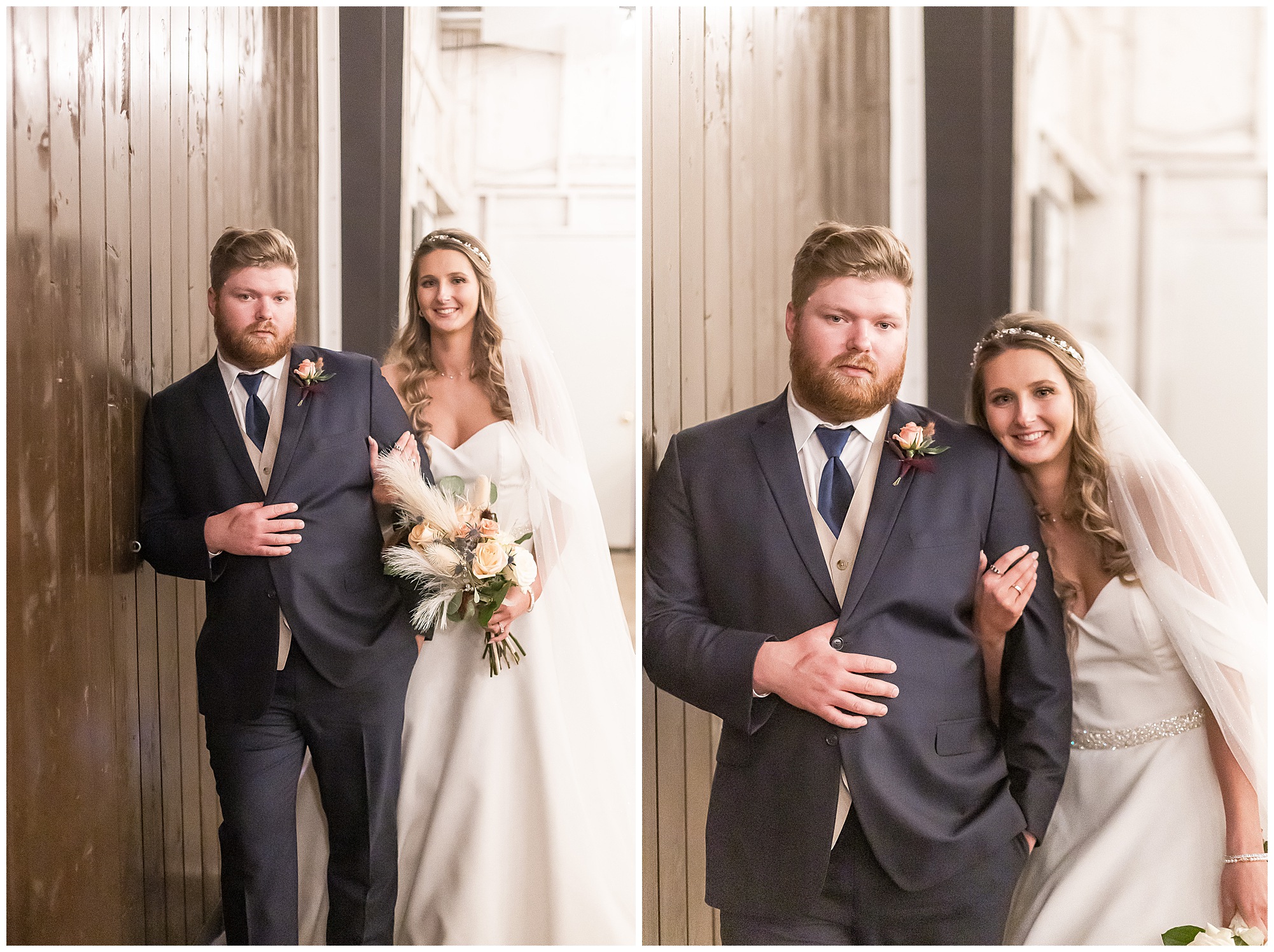 By the time we were making the 40 minute drive back to The Rustic Venues, the cold autumn afternoon had given way to skies allowing for some falling snow. Of course no one loved the idea of driving in the snow. Luckily, everyone made it back safely and Mikaela and Scott had the beautiful barn at the venues for us to keep us warm while we had portrait time. This bridal crew was a blast, keeping our time together light-hearted and fun. I loved the look of the girl’s rust orange dresses next to the guy’s navy suits in the rustic barn. We took some time with the newlyweds inside to give them a few moments together. Then I caught a glimpse of some golden glow happening outside and I convinced everyone to head out to see. The wind had died down, there was the perfect dusting of fluffy white snow on the ground, and the sun had peeked out from behind the clouds! We grabbed a few bridal party photos, including the groomsmen throwing Scott (which he fully gave the “OK” for and was their idea…Not mine)! Before it was just Mr. & Mrs. Wheat for some of my most FAVORITE photos of all time! Mikaela and Scott were just enjoying the moment and the sun and snow were paid actors for their wedding day photos! I’m thrilled we got these two outside for a few photos considering this pair LOVES the outdoors in their every day lives.