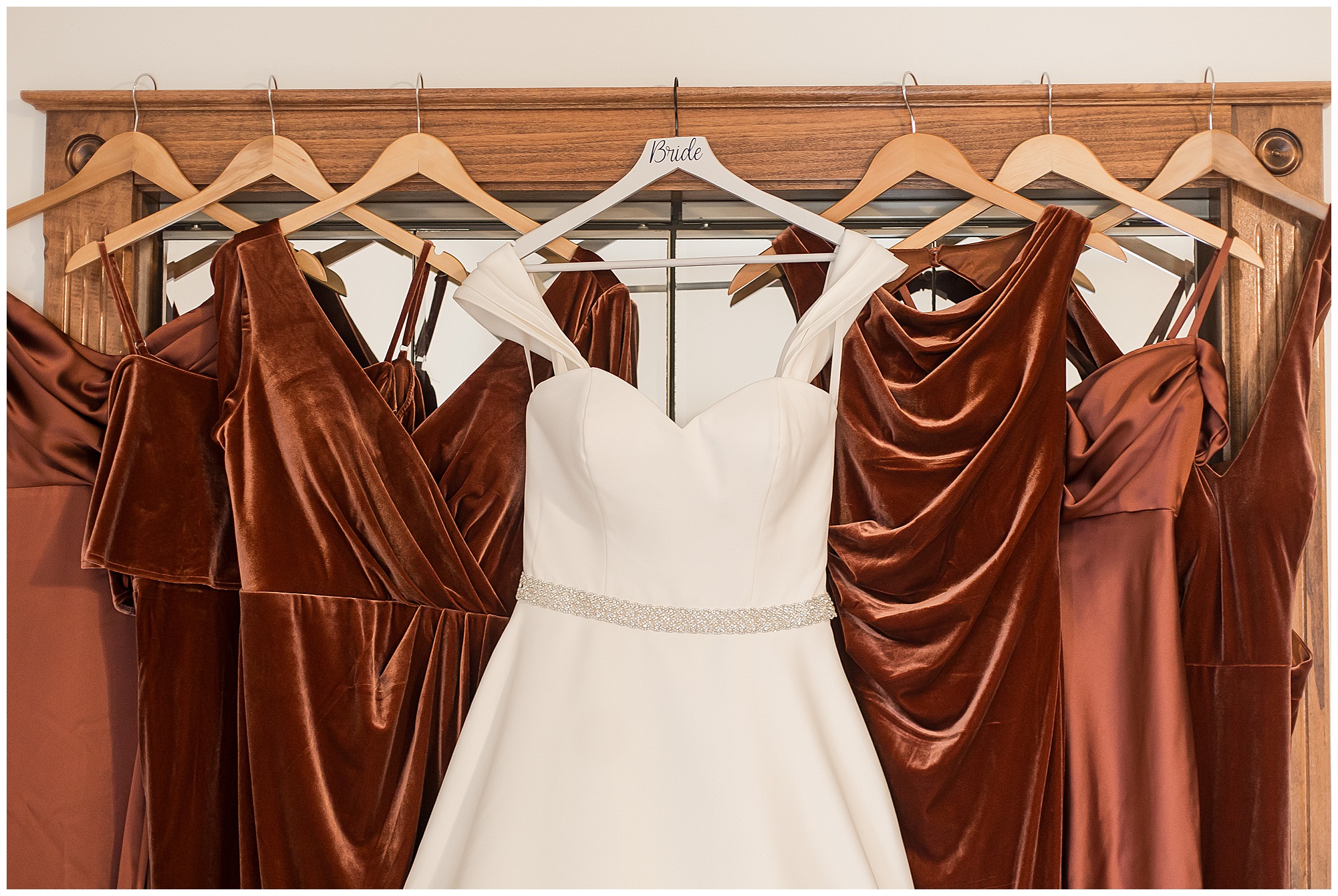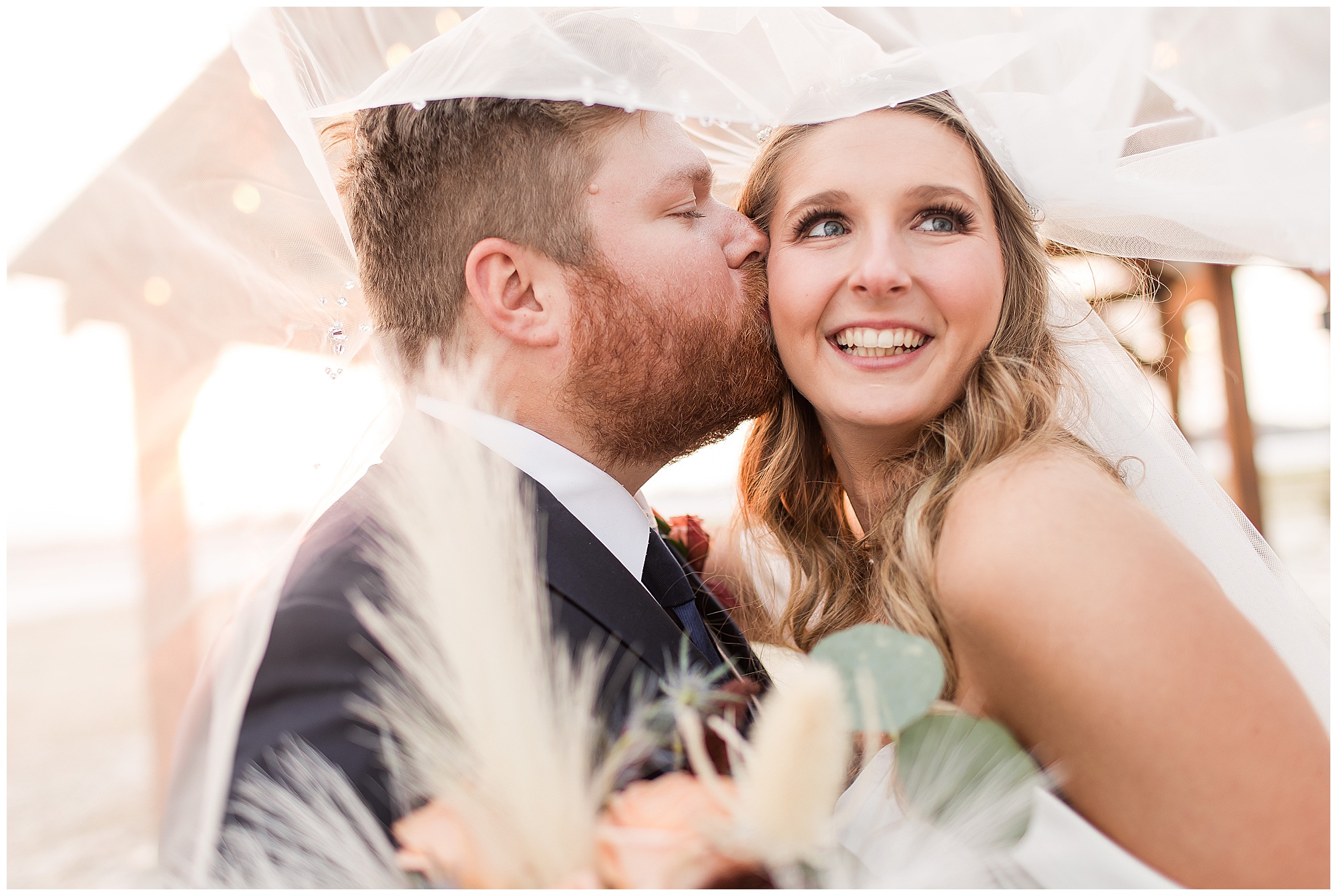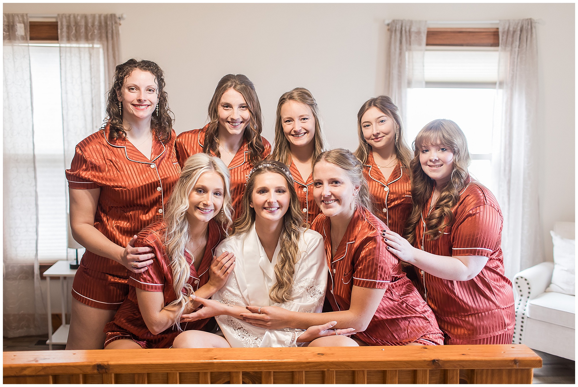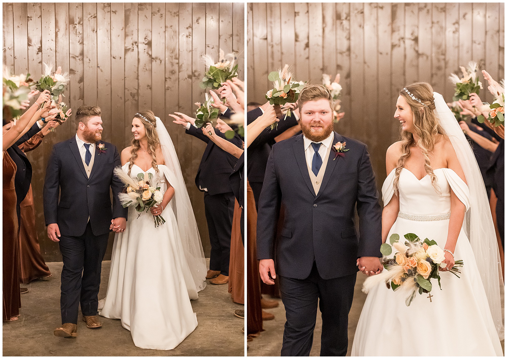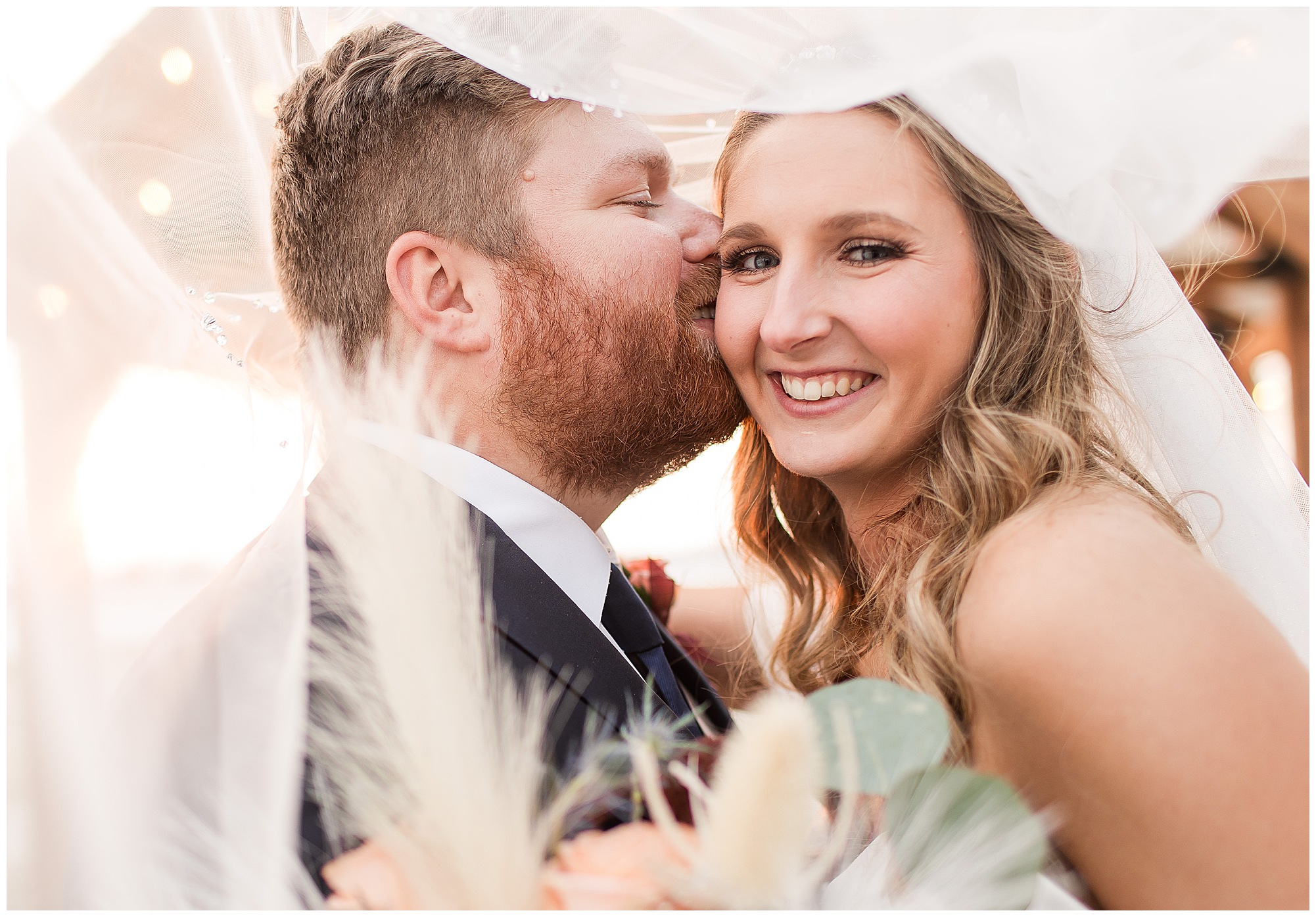 By the time we were making the 40 minute drive back to The Rustic Venues, the cold autumn afternoon had given way to skies allowing for some falling snow. Of course no one loved the idea of driving in the snow. Luckily, everyone made it back safely and Mikaela and Scott had the beautiful barn at the venues for us to keep us warm while we had portrait time. This bridal crew was a blast, keeping our time together light-hearted and fun. I loved the look of the girl’s rust orange dresses next to the guy’s navy suits in the rustic barn. We took some time with the newlyweds inside to give them a few moments together. Then I caught a glimpse of some golden glow happening outside and I convinced everyone to head out to see. The wind had died down, there was the perfect dusting of fluffy white snow on the ground, and the sun had peeked out from behind the clouds! We grabbed a few bridal party photos, including the groomsmen throwing Scott (which he fully gave the “OK” for and was their idea…Not mine)! Before it was just Mr. & Mrs. Wheat for some of my most FAVORITE photos of all time! Mikaela and Scott were just enjoying the moment and the sun and snow were paid actors for their wedding day photos! I’m thrilled we got these two outside for a few photos considering this pair LOVES the outdoors in their every day lives.