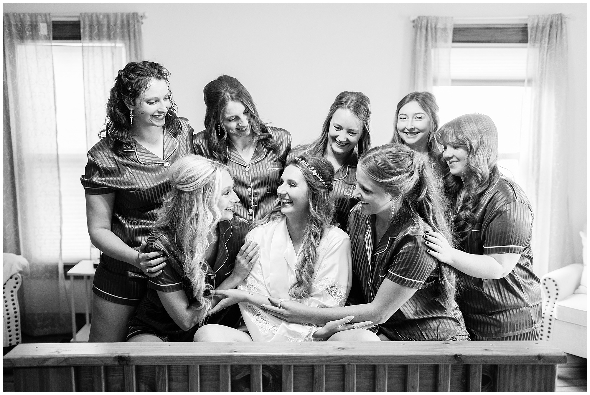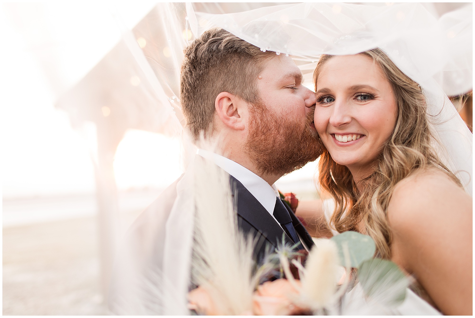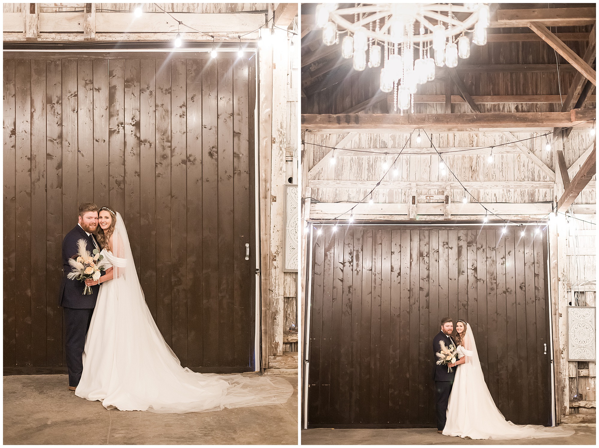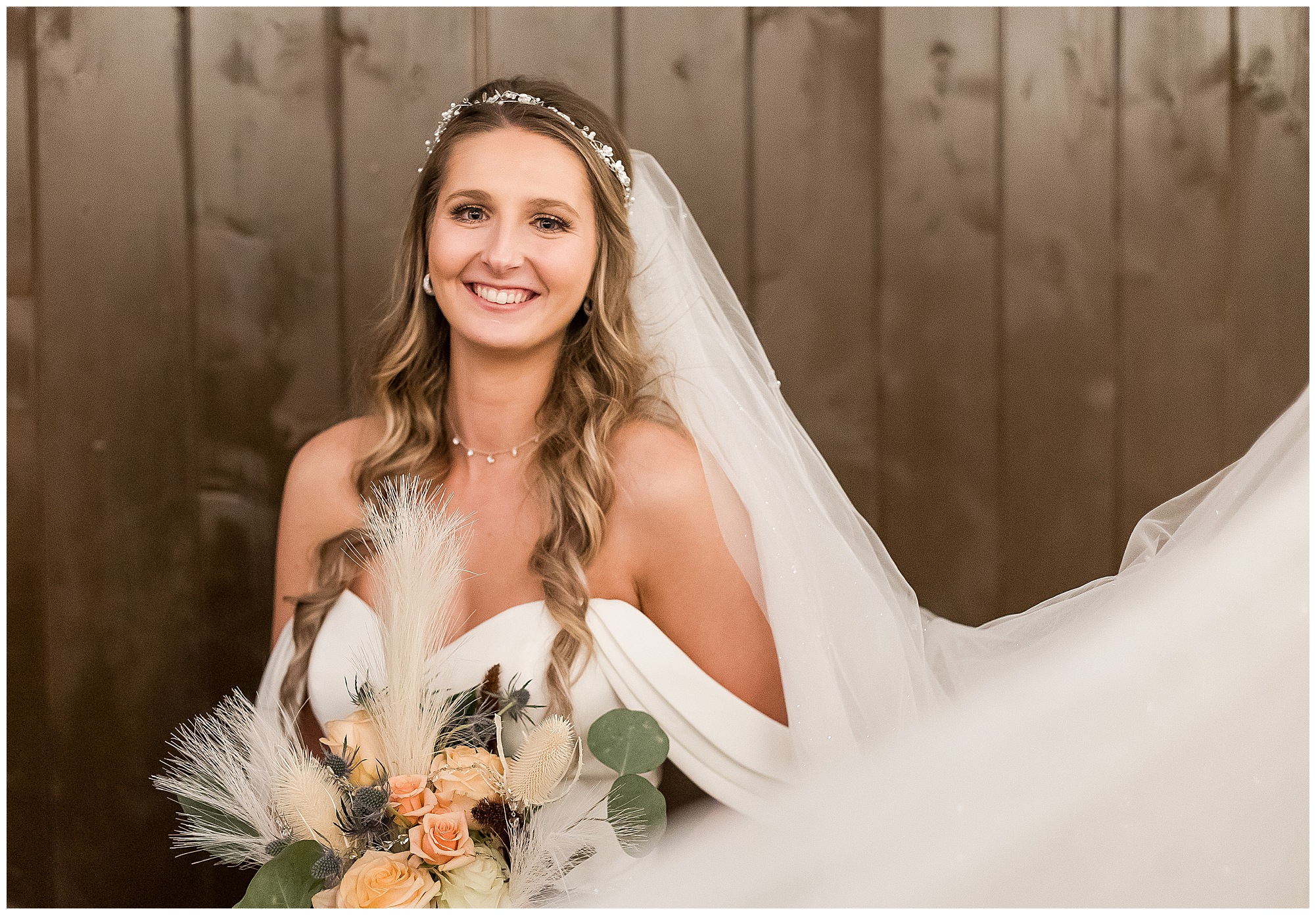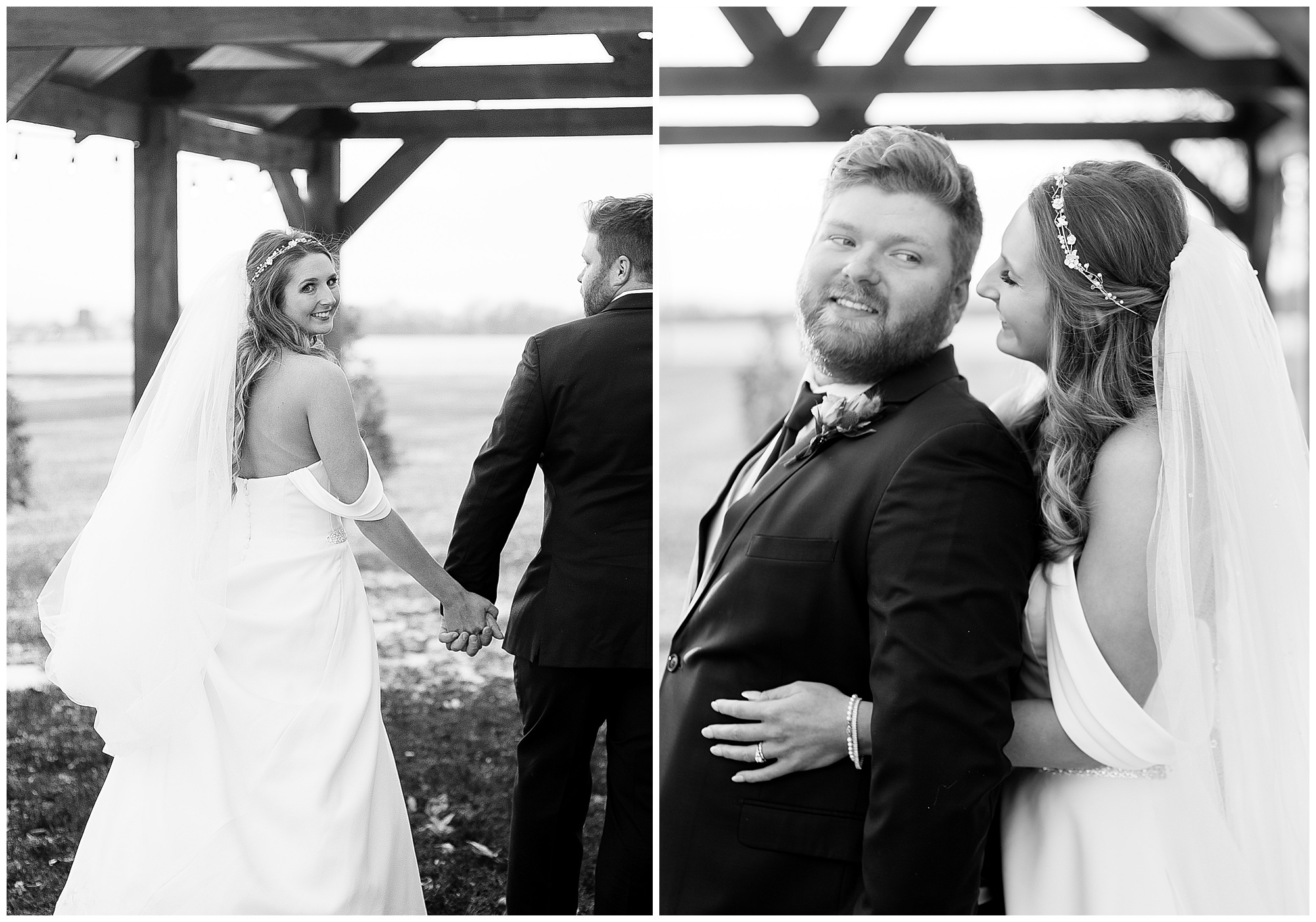 By the time we were making the 40 minute drive back to The Rustic Venues, the cold autumn afternoon had given way to skies allowing for some falling snow. Of course no one loved the idea of driving in the snow. Luckily, everyone made it back safely and Mikaela and Scott had the beautiful barn at the venues for us to keep us warm while we had portrait time. This bridal crew was a blast, keeping our time together light-hearted and fun. I loved the look of the girl’s rust orange dresses next to the guy’s navy suits in the rustic barn. We took some time with the newlyweds inside to give them a few moments together. Then I caught a glimpse of some golden glow happening outside and I convinced everyone to head out to see. The wind had died down, there was the perfect dusting of fluffy white snow on the ground, and the sun had peeked out from behind the clouds! We grabbed a few bridal party photos, including the groomsmen throwing Scott (which he fully gave the “OK” for and was their idea…Not mine)! Before it was just Mr. & Mrs. Wheat for some of my most FAVORITE photos of all time! Mikaela and Scott were just enjoying the moment and the sun and snow were paid actors for their wedding day photos! I’m thrilled we got these two outside for a few photos considering this pair LOVES the outdoors in their every day lives.