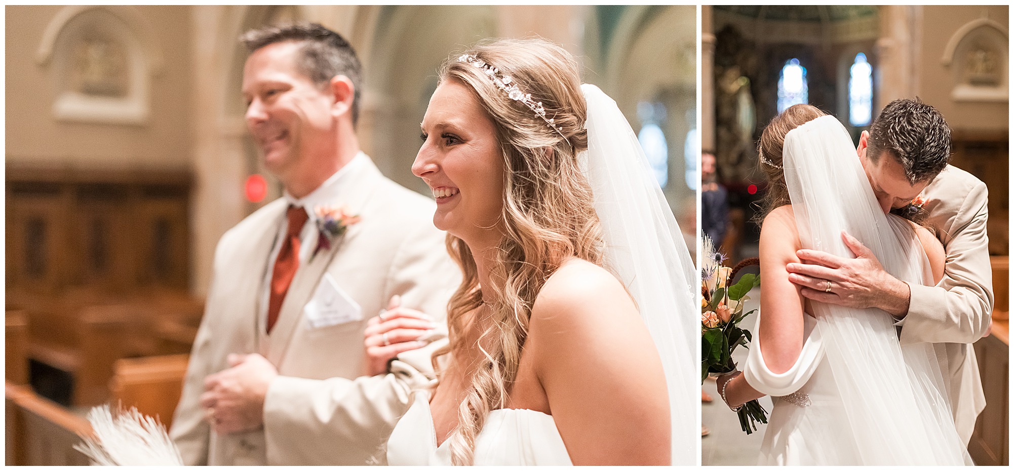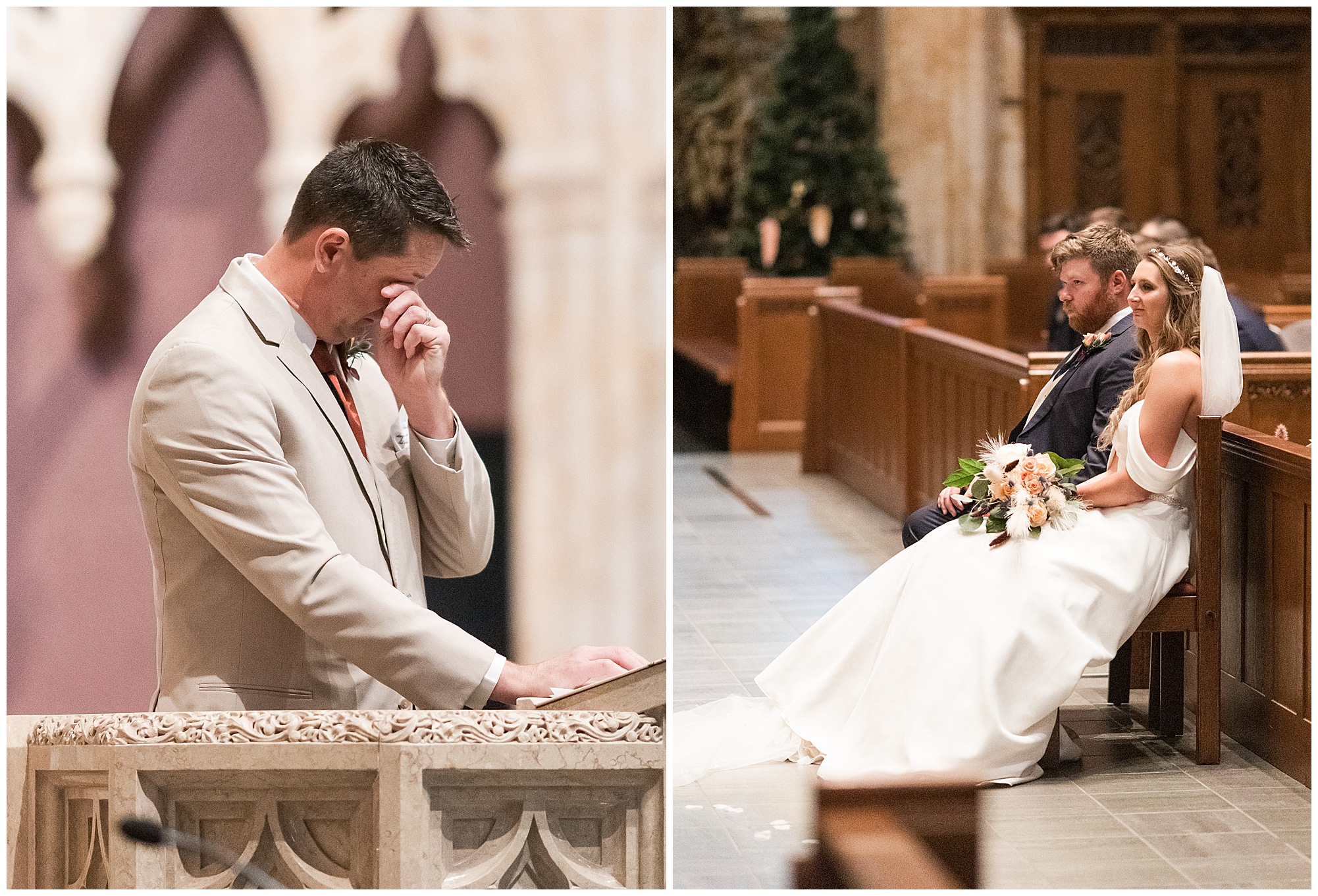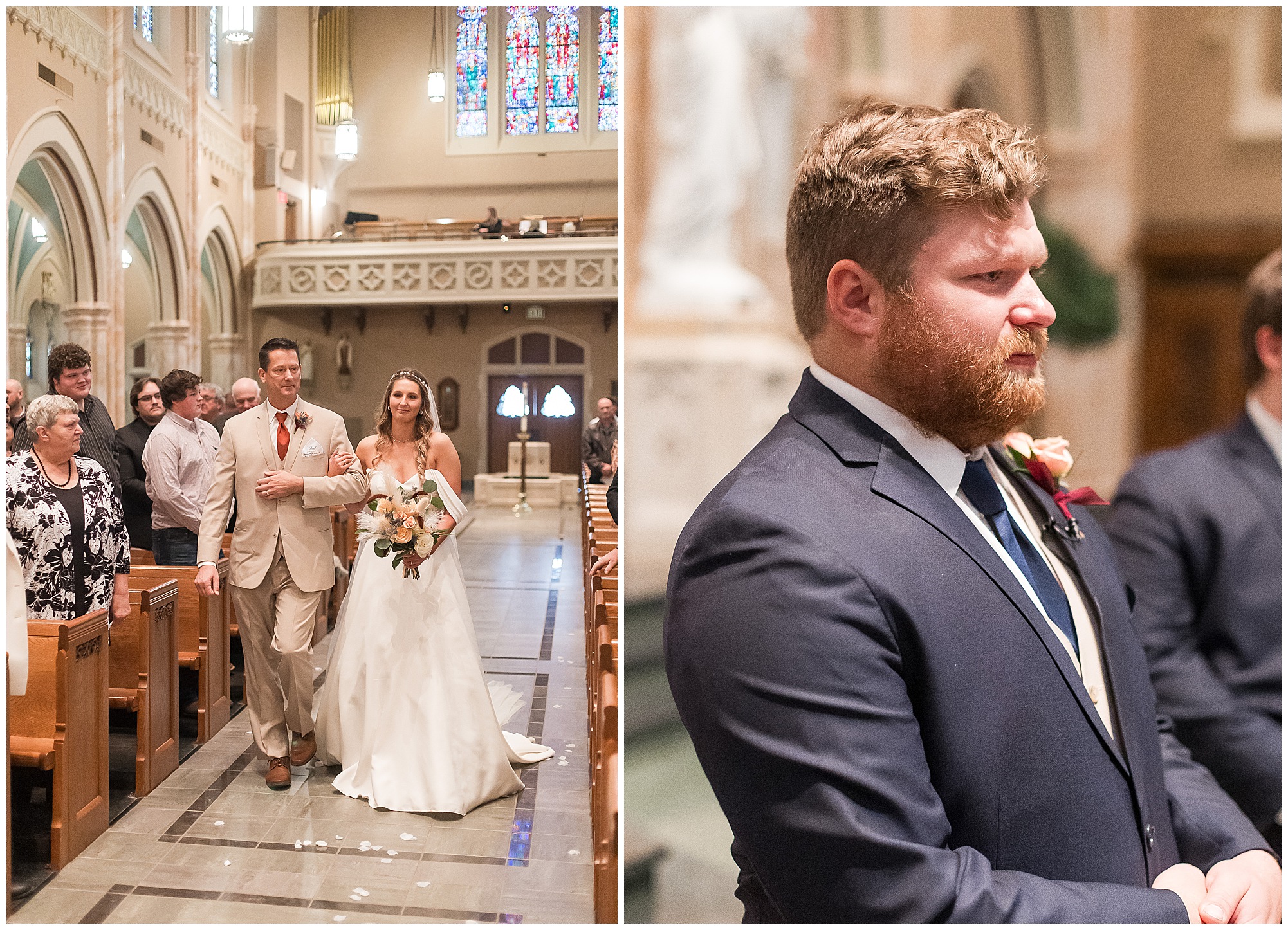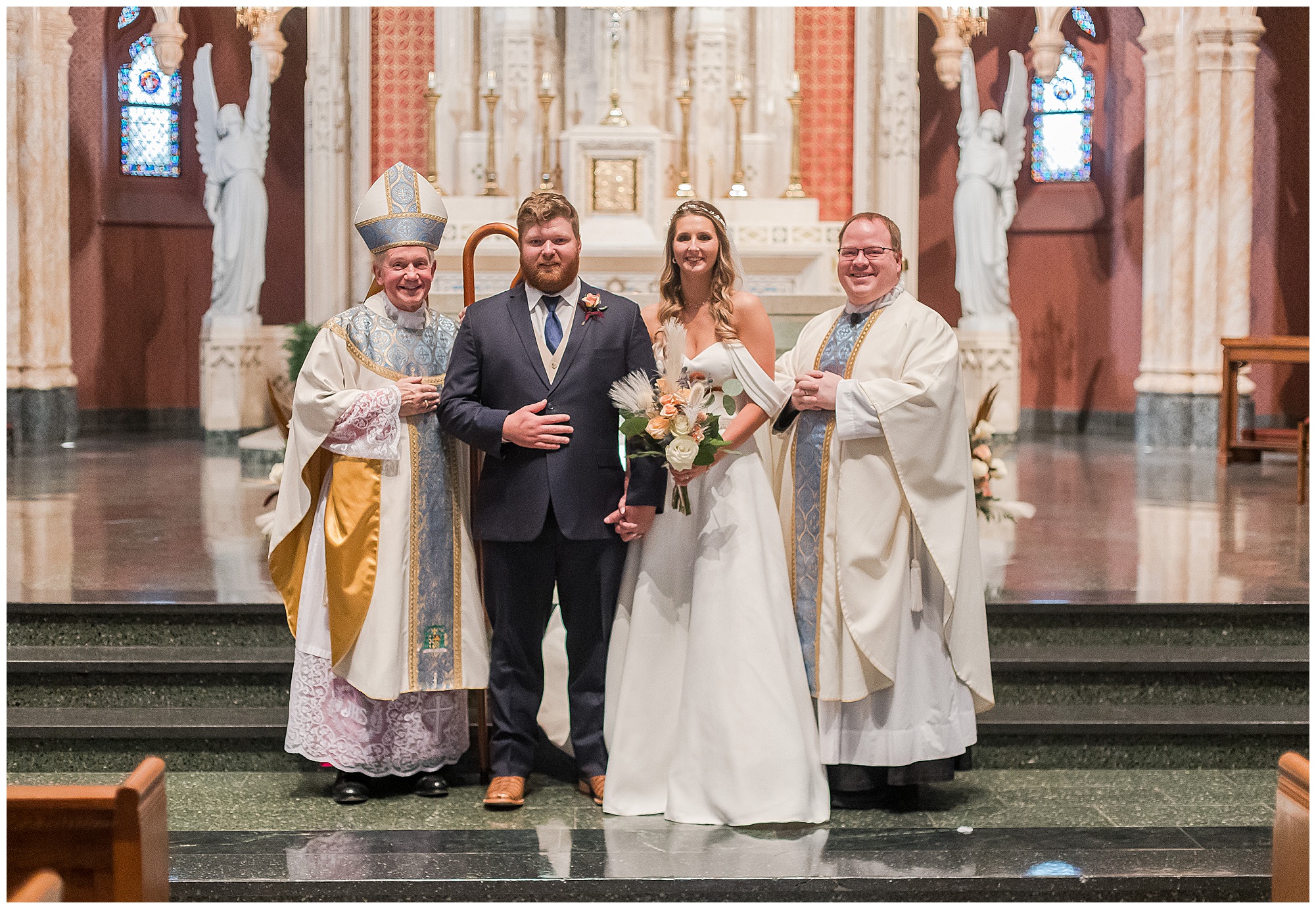 The nuptials themselves were actually being held off of The Rustic Venues property in Springfield at Blessed Sacrament Catholic Church. See, Scott and Mikalea were being married by Bishop Paprocki, who coached Scott in hockey as well as coached next to him once Scott graduated. Scott told me the Bishop remarked, “Since I had become Bishop, many people don’t ask me to celebrate the sacrament of marriage because they think I’m too busy. I mean I am busy, but I am still happy to be asked”. Blessed Sacrament is an impressive cathedral with amazing stained glass windows and a long dramatic aisle. Scott waited for Mikaela at the end of that aisle to make her way with her dad and fought back the tears as she neared. The couple listened to many lovely scripture readings, the Bishop sharing more about their relationship, they exchanged rings, and they promised forever with a kiss. They were officially pronounced Mr. & Mrs. Wheat!