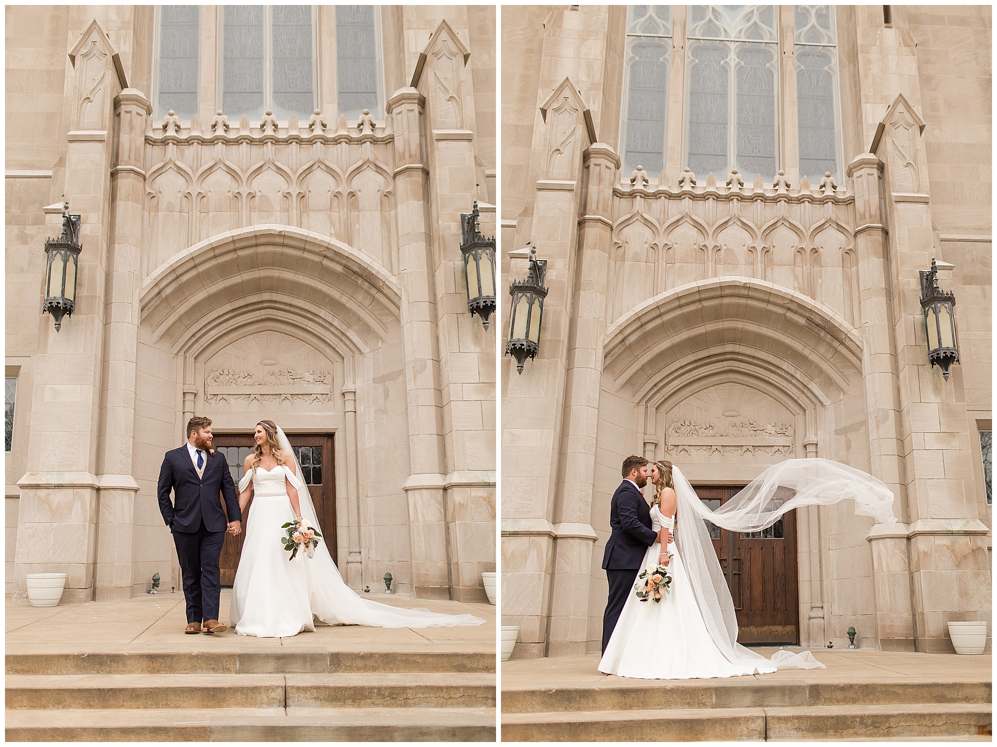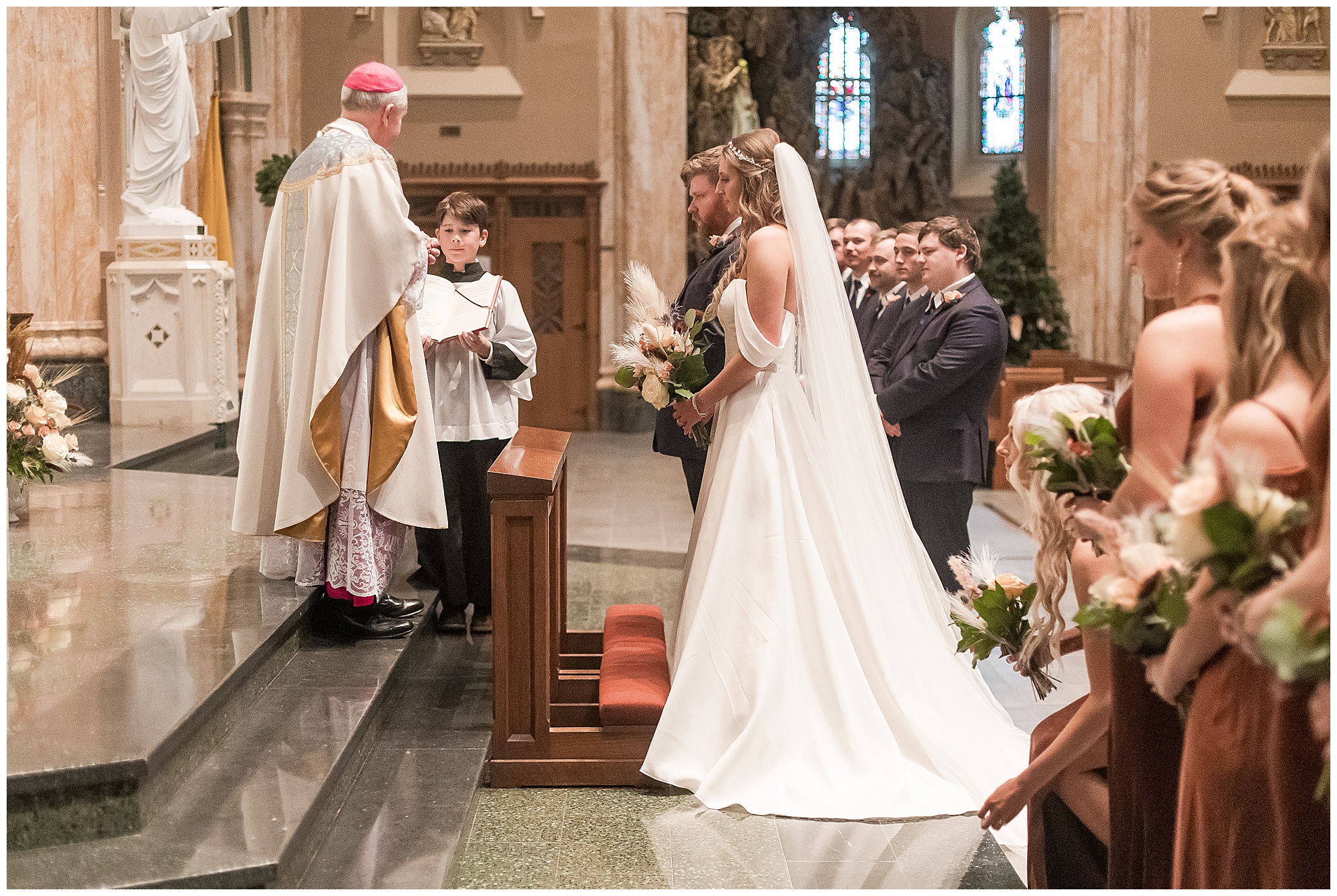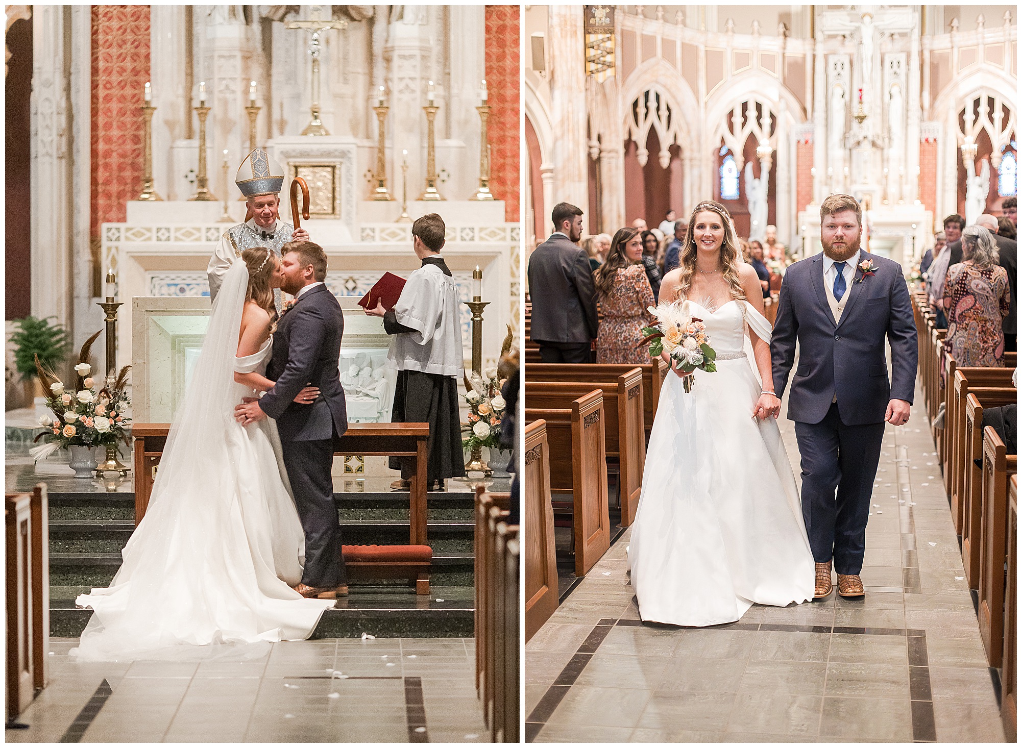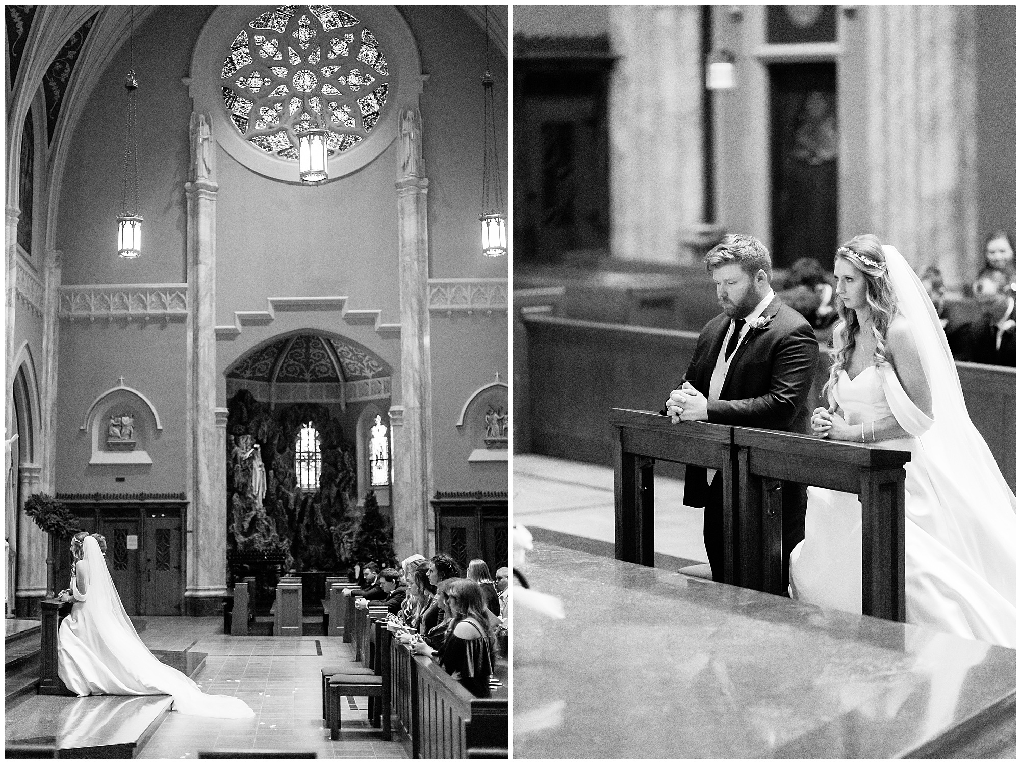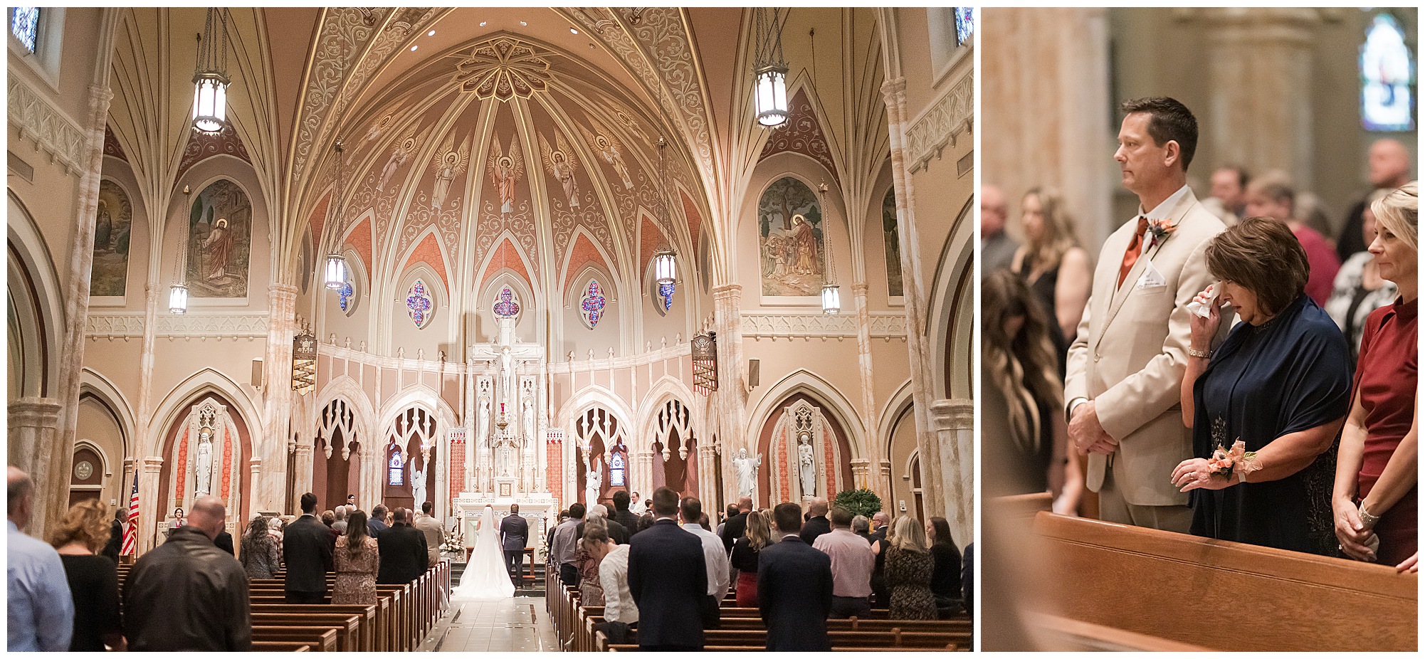 The nuptials themselves were actually being held off of The Rustic Venues property in Springfield at Blessed Sacrament Catholic Church. See, Scott and Mikalea were being married by Bishop Paprocki, who coached Scott in hockey as well as coached next to him once Scott graduated. Scott told me the Bishop remarked, “Since I had become Bishop, many people don’t ask me to celebrate the sacrament of marriage because they think I’m too busy. I mean I am busy, but I am still happy to be asked”. Blessed Sacrament is an impressive cathedral with amazing stained glass windows and a long dramatic aisle. Scott waited for Mikaela at the end of that aisle to make her way with her dad and fought back the tears as she neared. The couple listened to many lovely scripture readings, the Bishop sharing more about their relationship, they exchanged rings, and they promised forever with a kiss. They were officially pronounced Mr. & Mrs. Wheat!