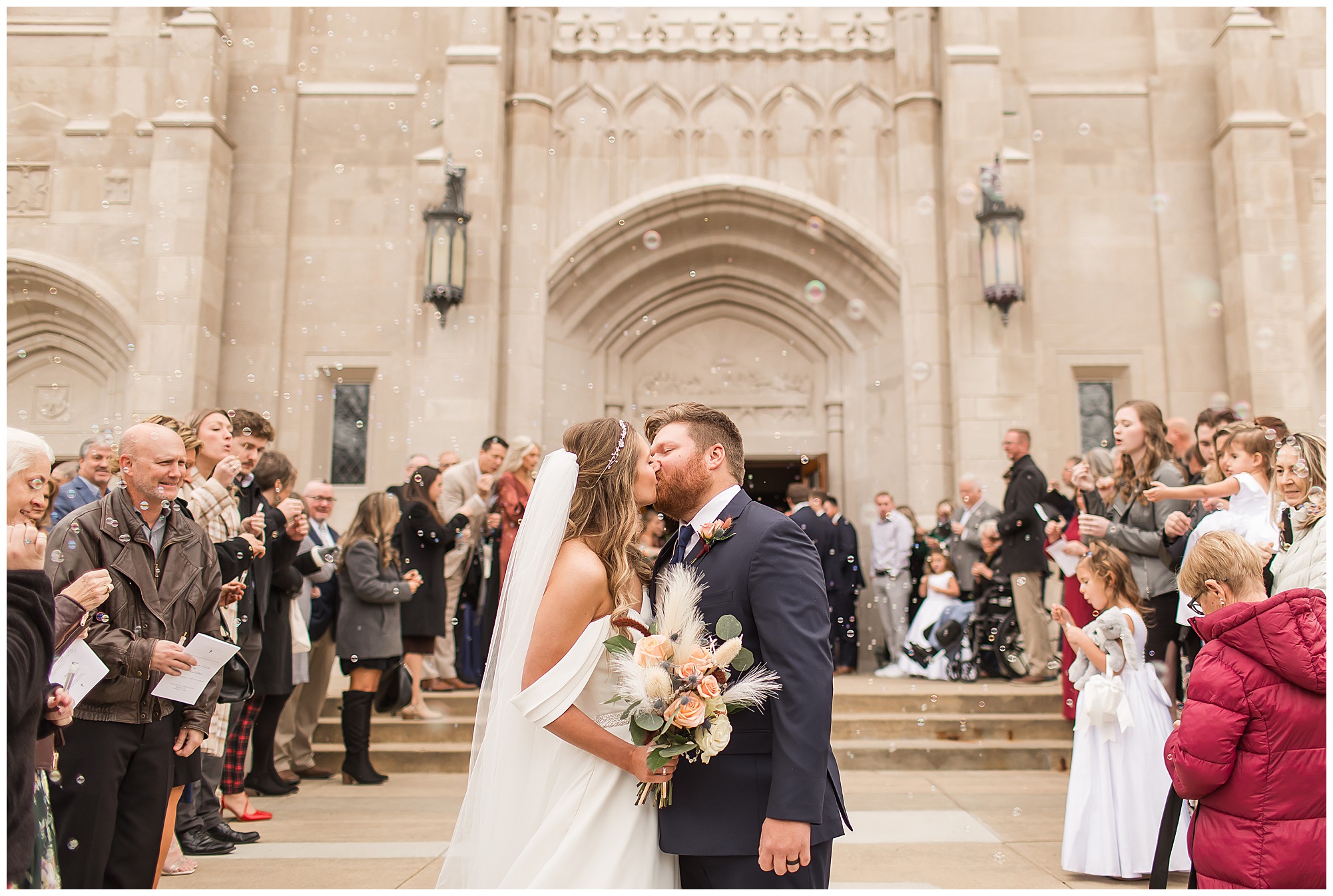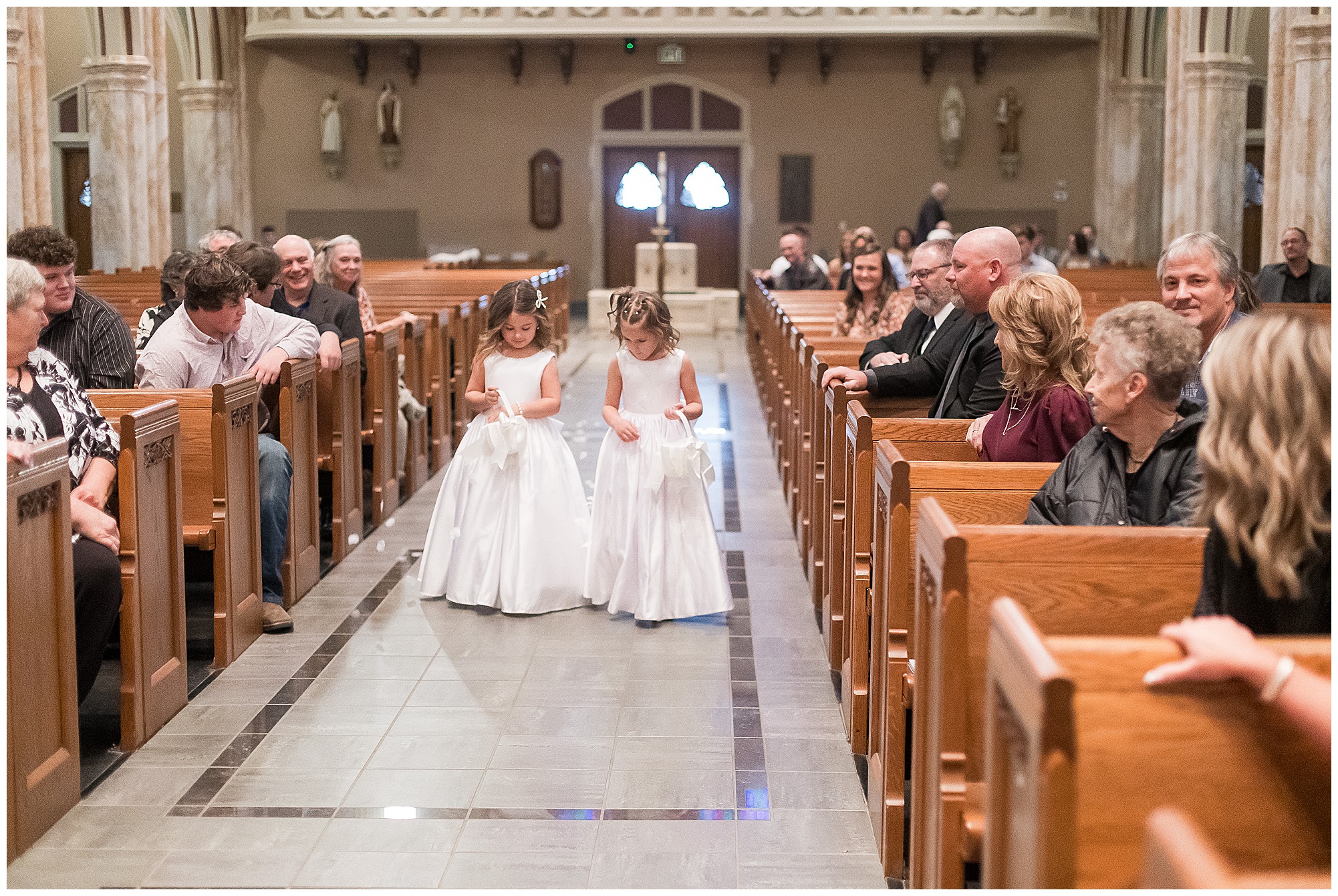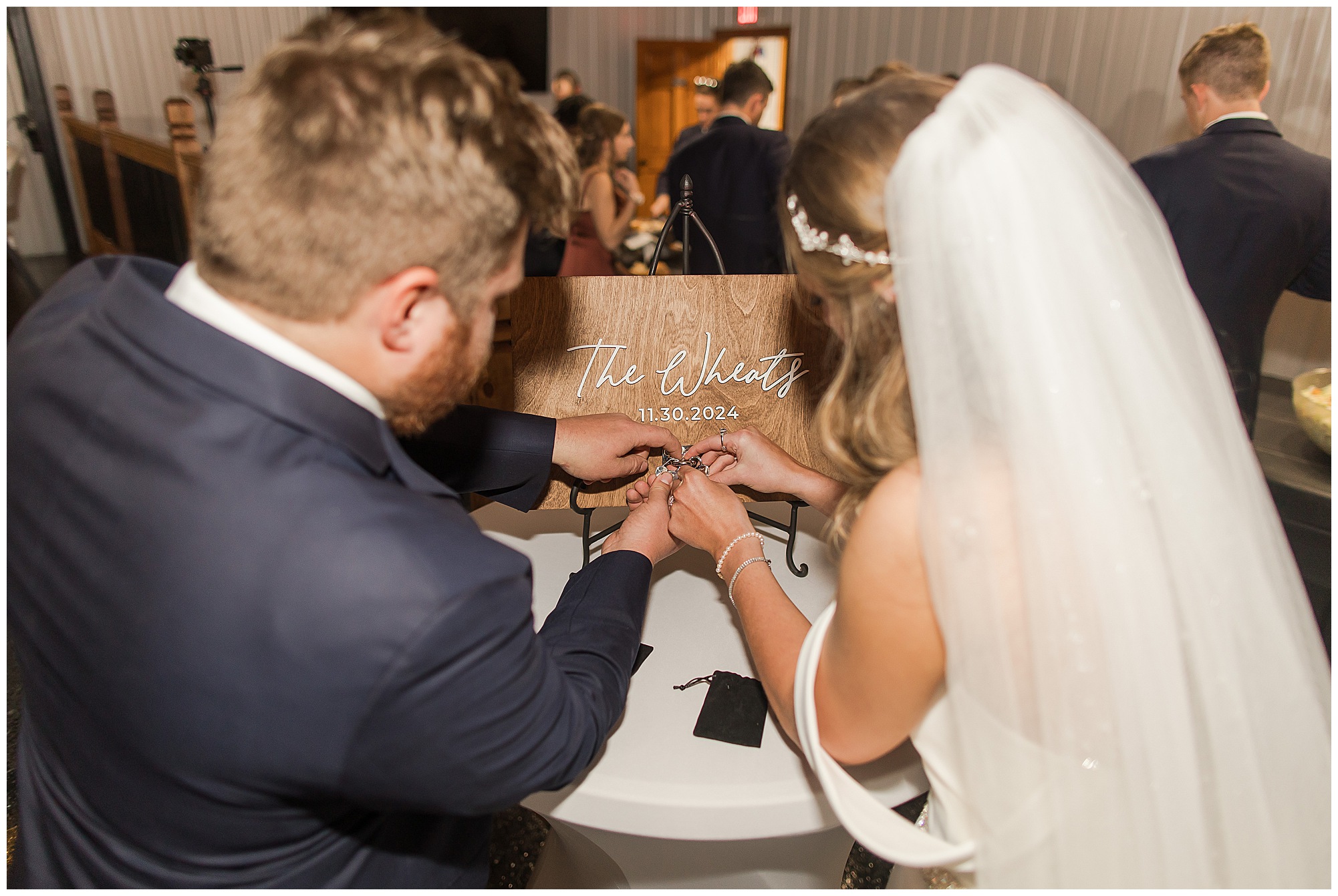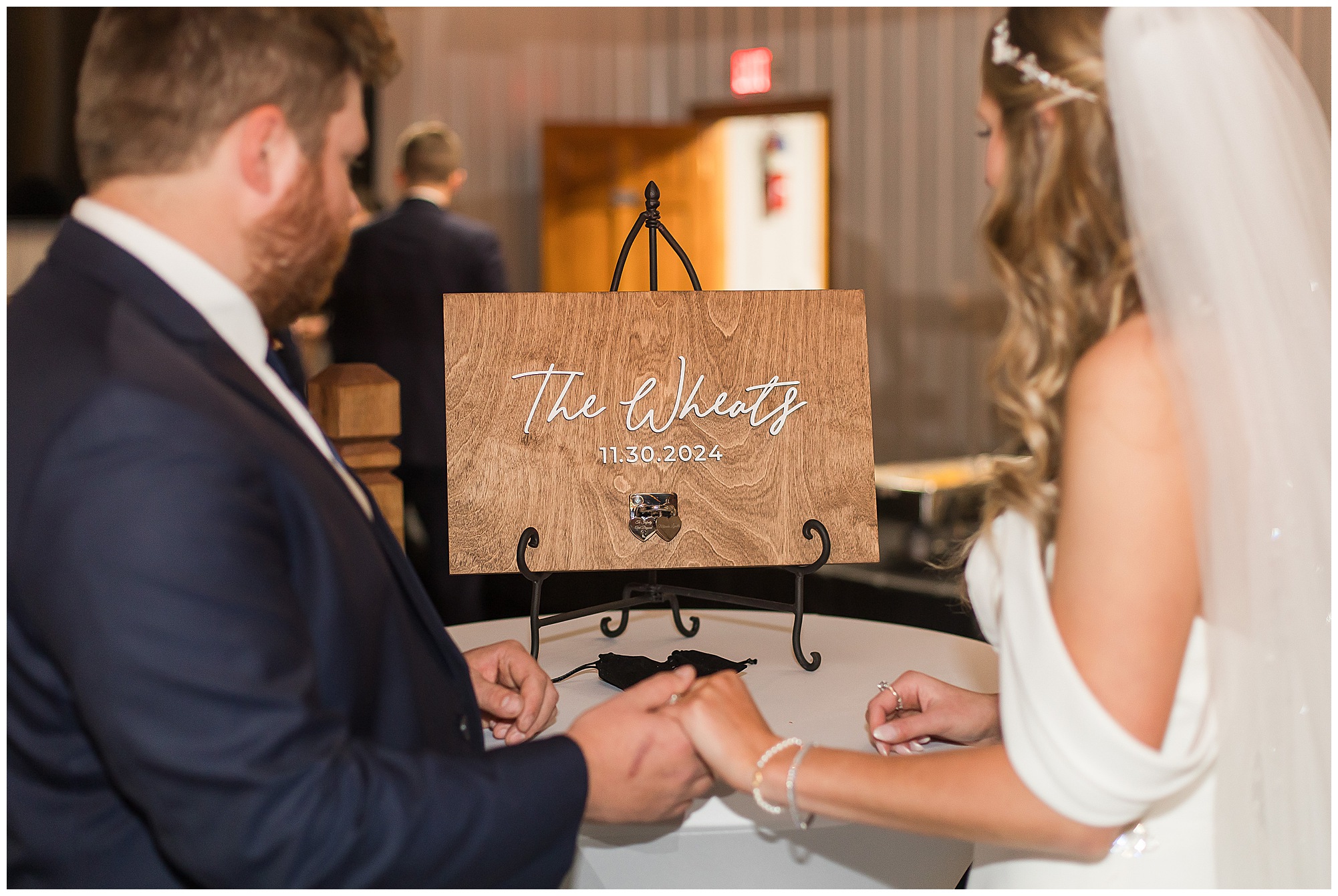 The nuptials themselves were actually being held off of The Rustic Venues property in Springfield at Blessed Sacrament Catholic Church. See, Scott and Mikalea were being married by Bishop Paprocki, who coached Scott in hockey as well as coached next to him once Scott graduated. Scott told me the Bishop remarked, “Since I had become Bishop, many people don’t ask me to celebrate the sacrament of marriage because they think I’m too busy. I mean I am busy, but I am still happy to be asked”. Blessed Sacrament is an impressive cathedral with amazing stained glass windows and a long dramatic aisle. Scott waited for Mikaela at the end of that aisle to make her way with her dad and fought back the tears as she neared. The couple listened to many lovely scripture readings, the Bishop sharing more about their relationship, they exchanged rings, and they promised forever with a kiss. They were officially pronounced Mr. & Mrs. Wheat!
