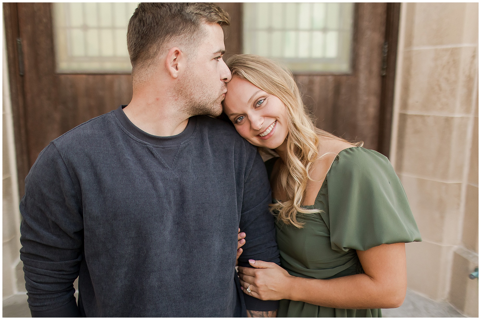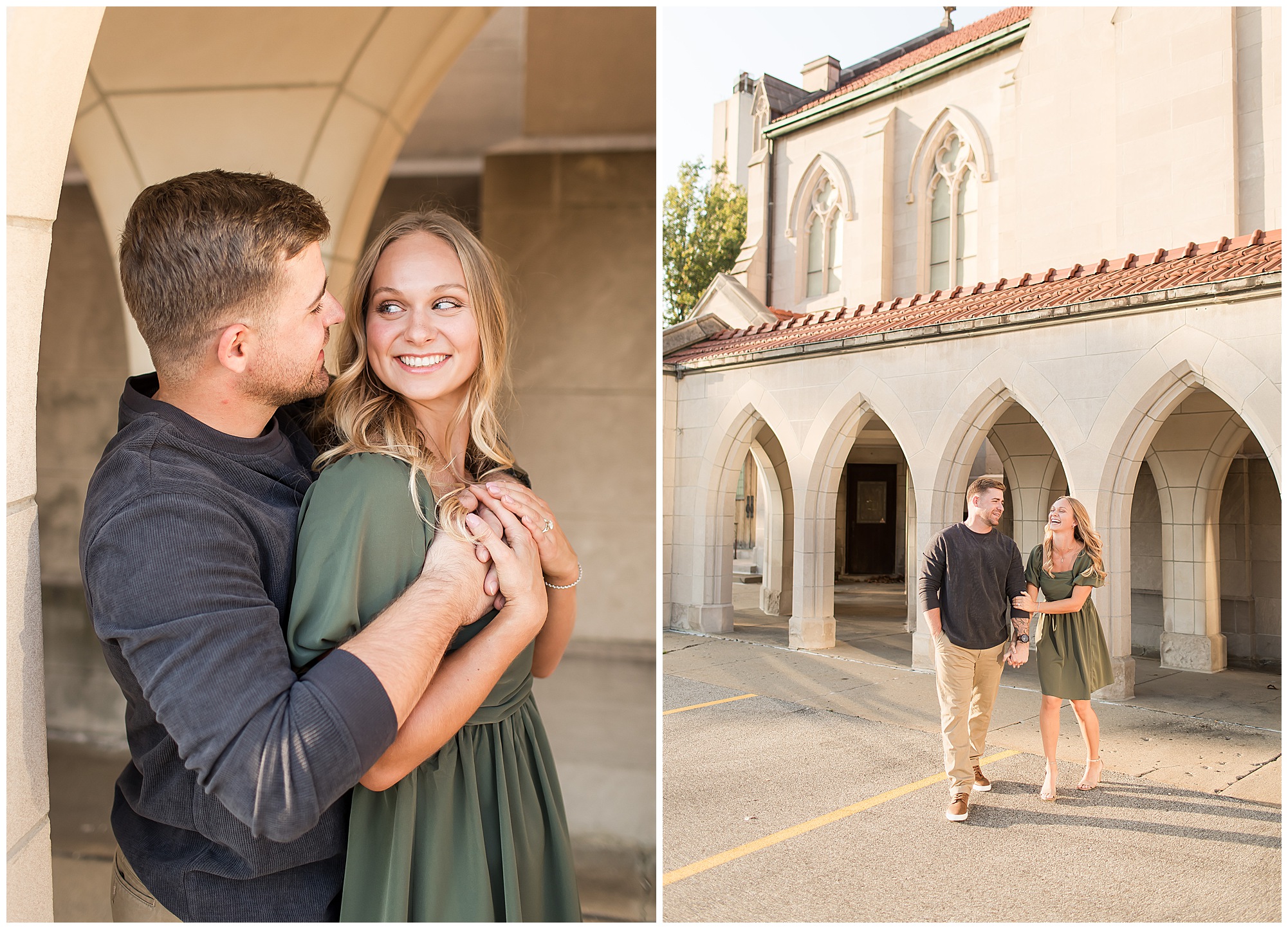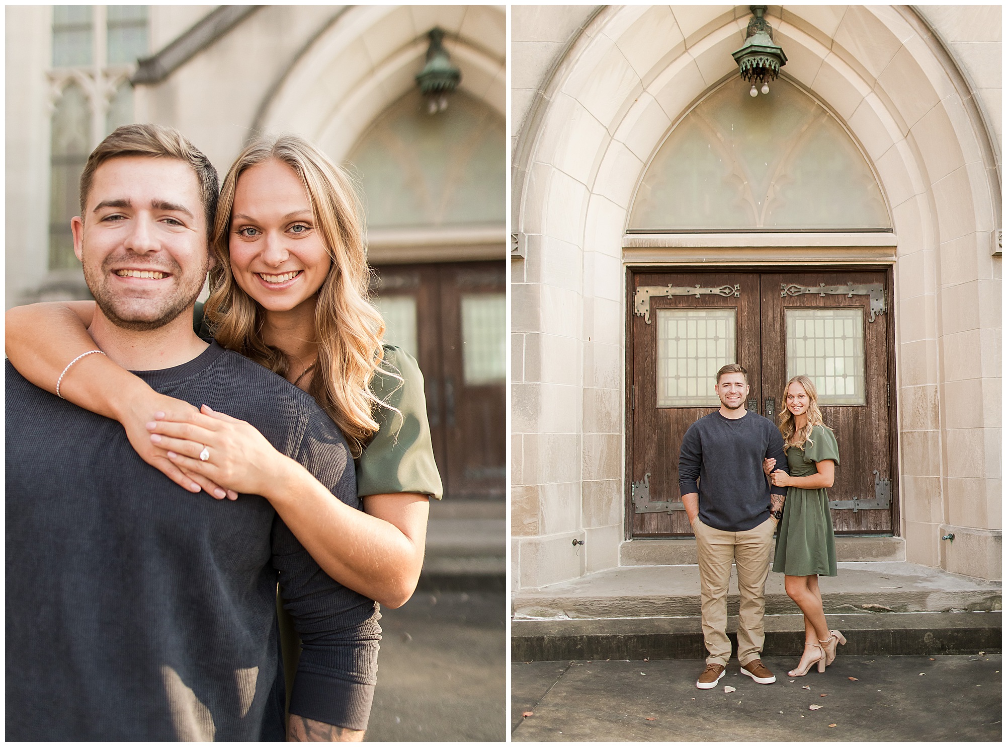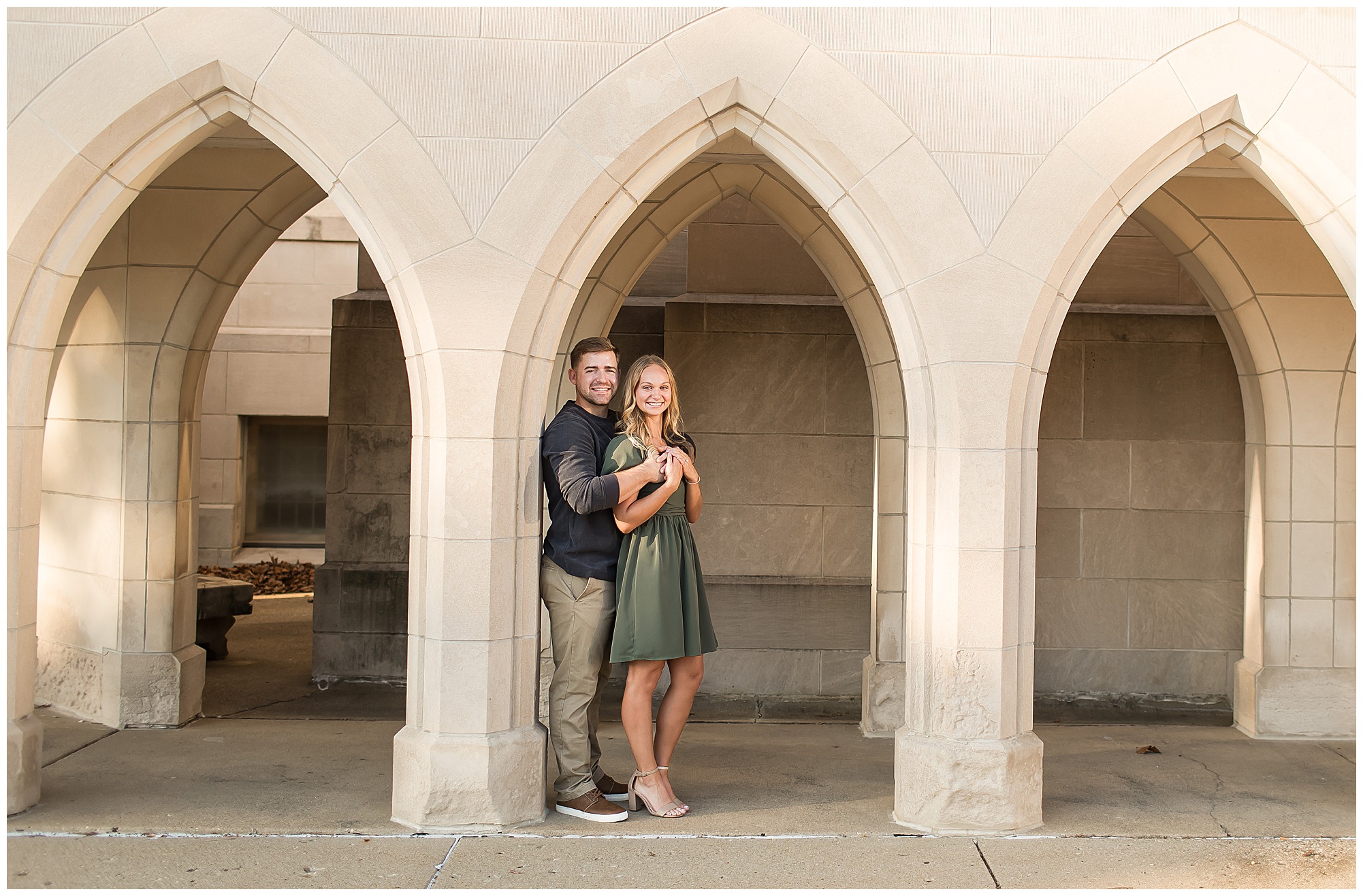 The amount of laughter and fun that came out of Kamryn and Brock’s engagement session last fall was the one thing I’m definitely going to remember from our beautiful evening spent together. These two are from the St. Louis, Missouri area, where their wedding will be held this summer, but they decided to travel up to me in Springfield, Illinois for a change of scenery for their engagement session. We met up downtown outside of a local church, which has some amazing architectural features to begin their photos. Kamryn had said they were a little nervous, but I assured her I was there to give all the directions to make them feel comfortable in front of my camera. Within a few minutes, these two were giggling and laughing their way through their e-session with ease. Brock has a way of simply giving Kamryn a goofy smirk and she bursts into laughter creating some of my favorite photos from our time together!