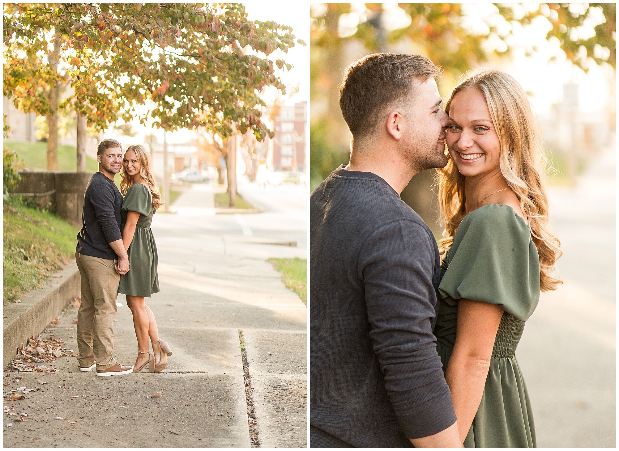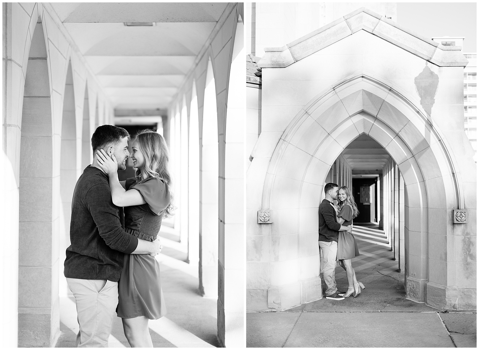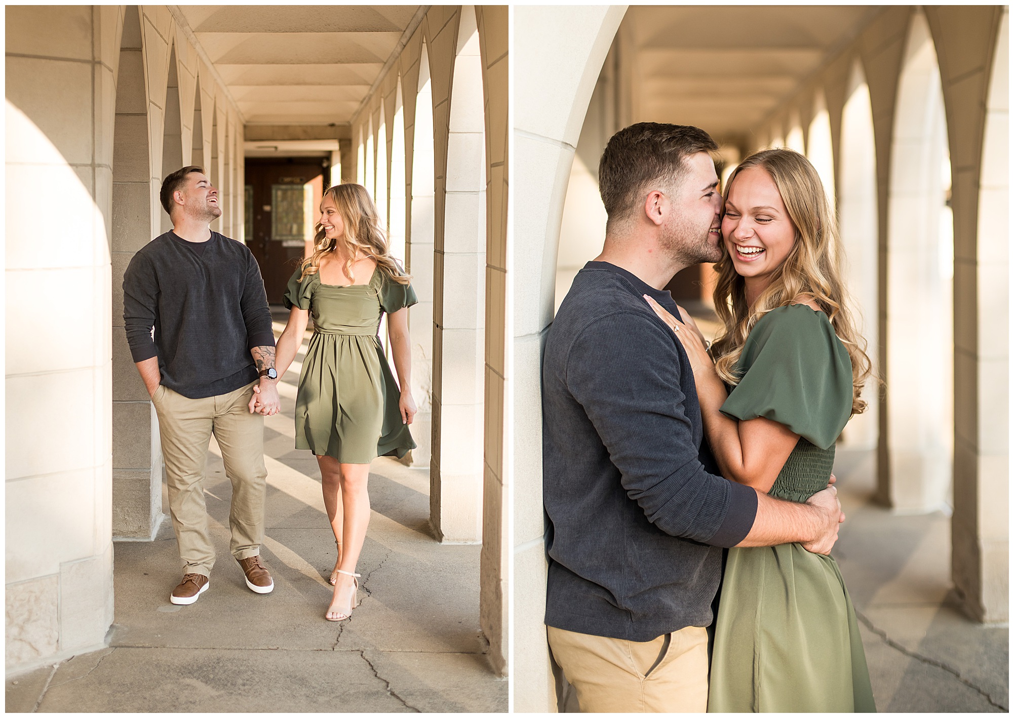 The amount of laughter and fun that came out of Kamryn and Brock’s engagement session last fall was the one thing I’m definitely going to remember from our beautiful evening spent together. These two are from the St. Louis, Missouri area, where their wedding will be held this summer, but they decided to travel up to me in Springfield, Illinois for a change of scenery for their engagement session. We met up downtown outside of a local church, which has some amazing architectural features to begin their photos. Kamryn had said they were a little nervous, but I assured her I was there to give all the directions to make them feel comfortable in front of my camera. Within a few minutes, these two were giggling and laughing their way through their e-session with ease. Brock has a way of simply giving Kamryn a goofy smirk and she bursts into laughter creating some of my favorite photos from our time together!