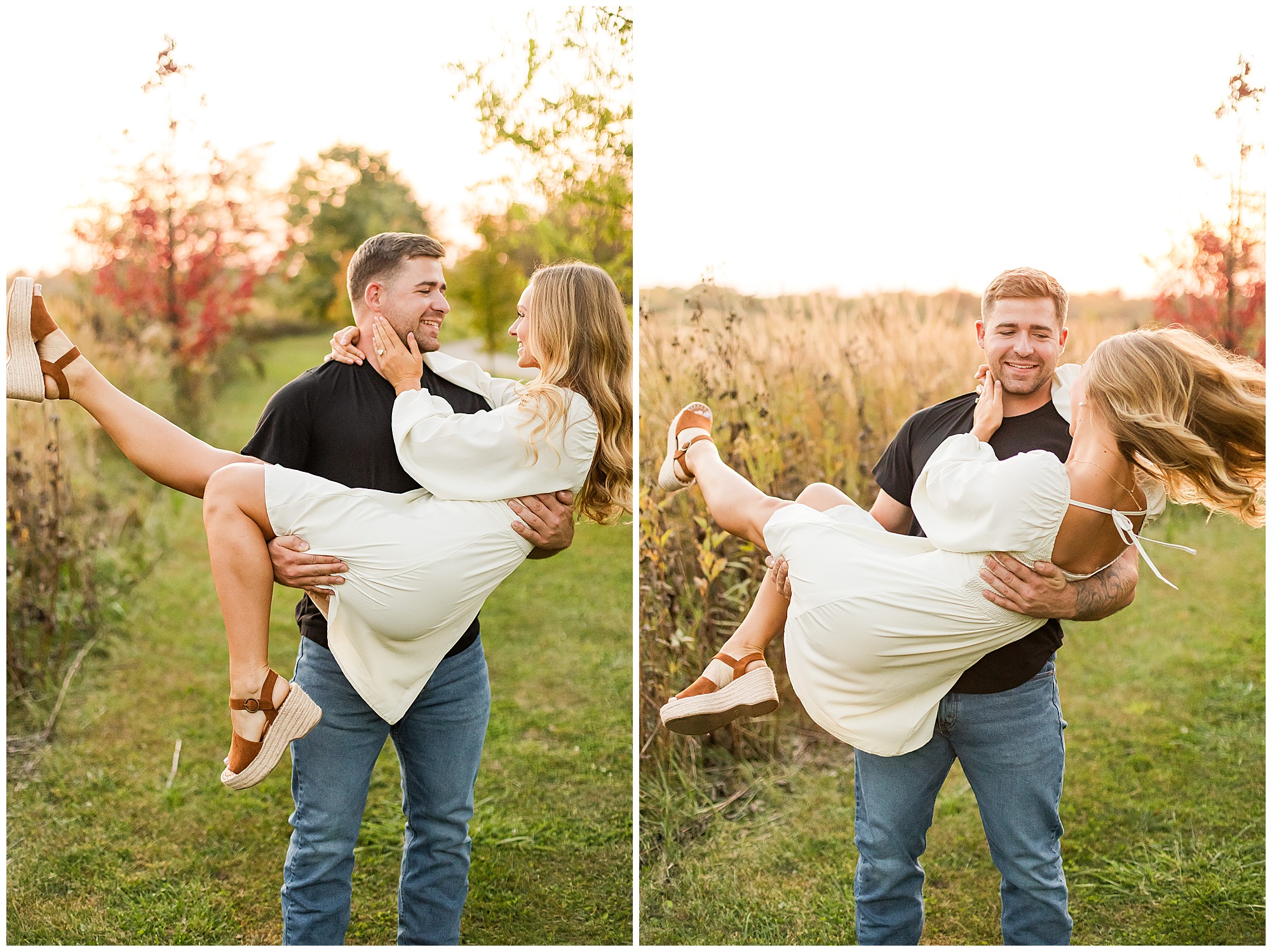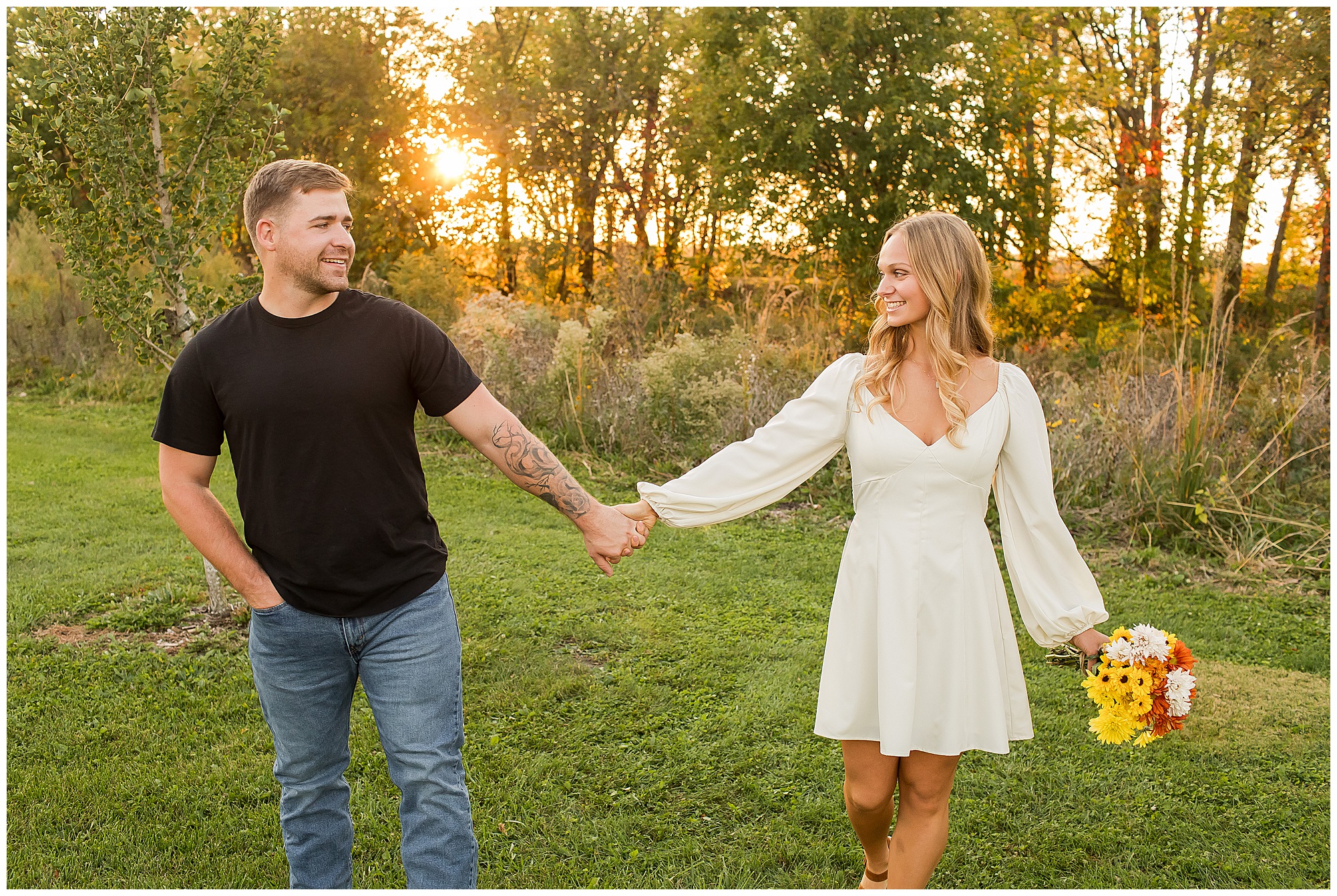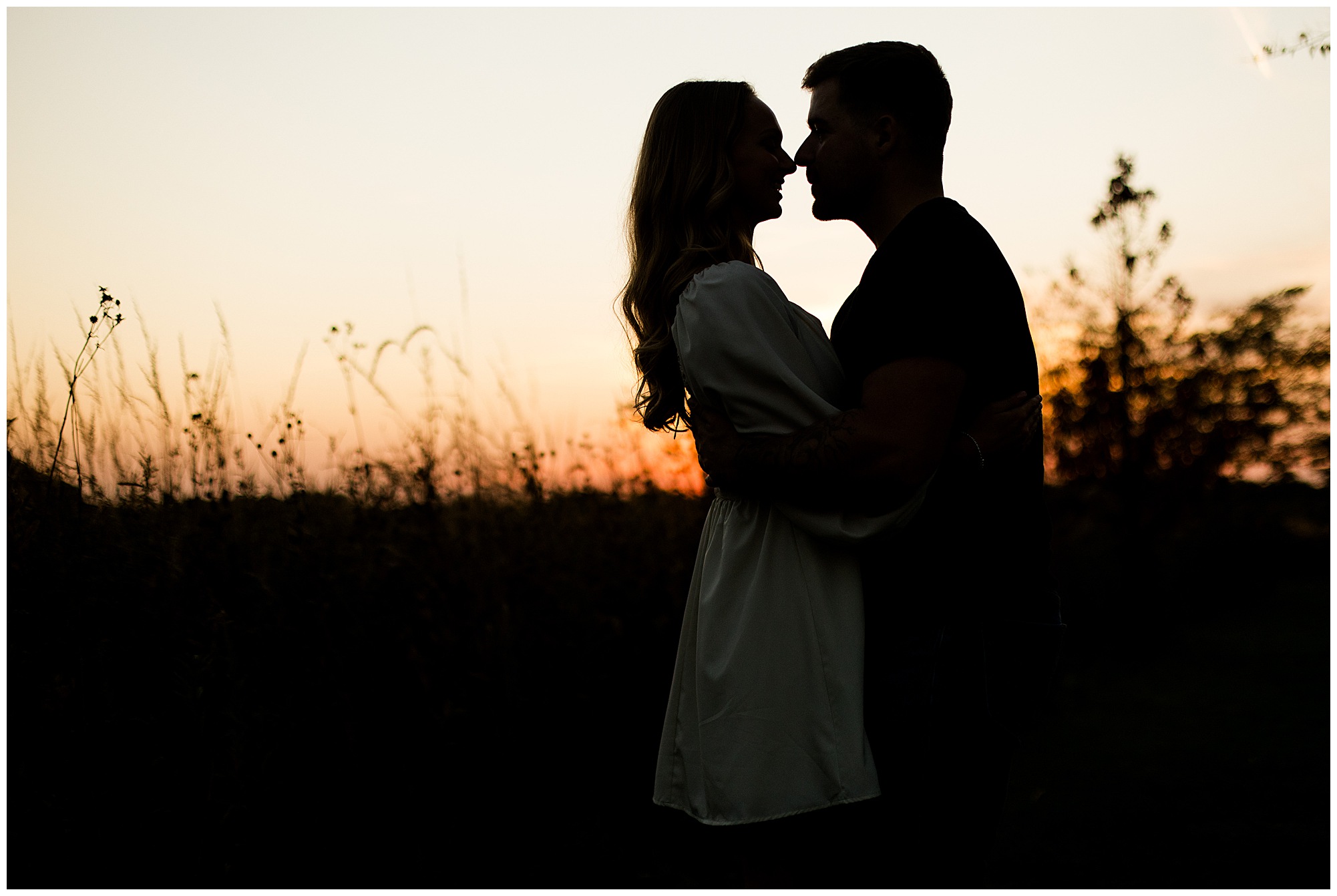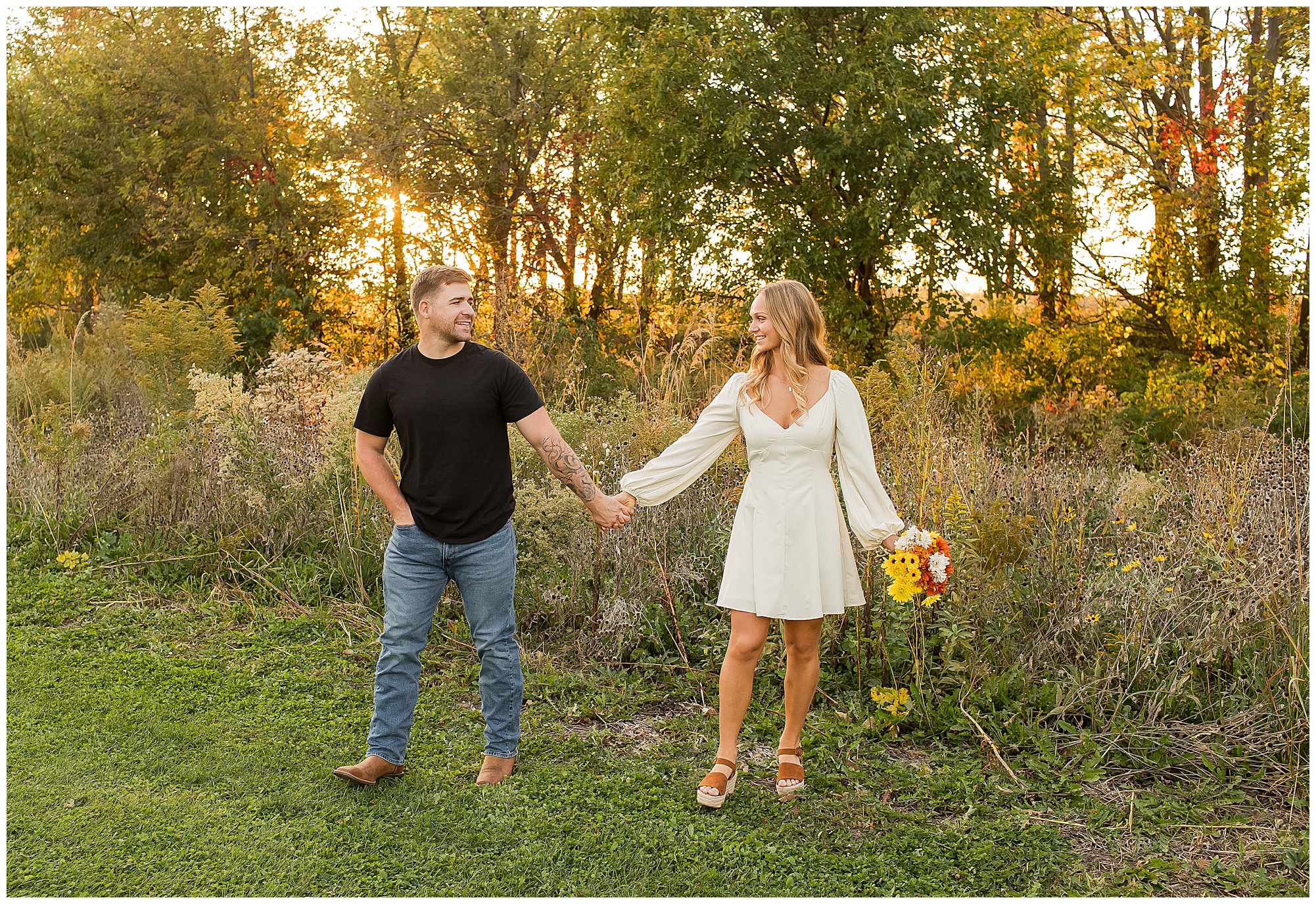 After being downtown, we opted to head to a gorgeous spot where the fall sunset could highlight this duo perfectly. Kamryn brought an added prop with a bouquet of colorful autumn flowers, which gave an extra layer of “Pop” to their photos. I totally adore fresh flowers at a session! The joy and ease these two have in one another’s arms is obvious and I took advantage of their playfulness with lots of movement and even a few prompted “Sneak attacks” by Brock caused adorable moments captured of these two. Kamryn and Brock shared they have been practicing their dip, so of course I had to get them to show that off for me! I cannot wait to be a part of their amazing wedding day this year in the St. Louis area! If it’s anything like their engagement session, I know it will be a blast!