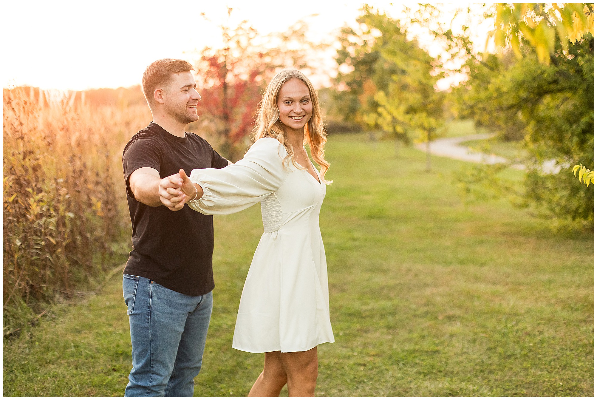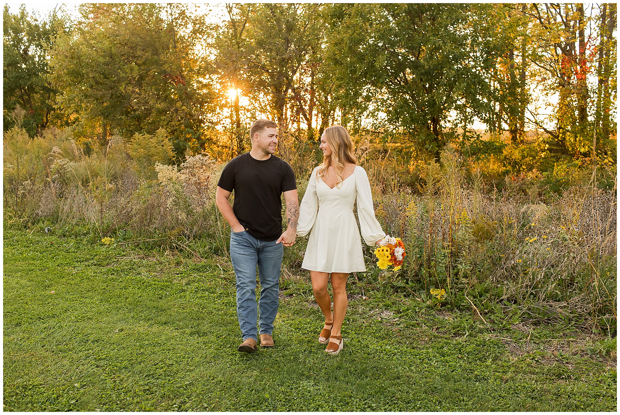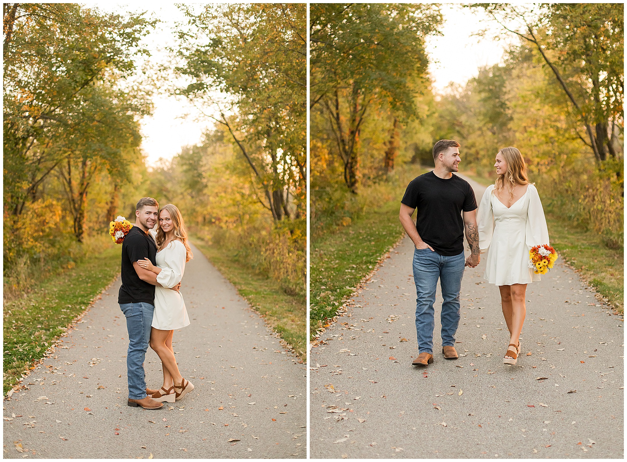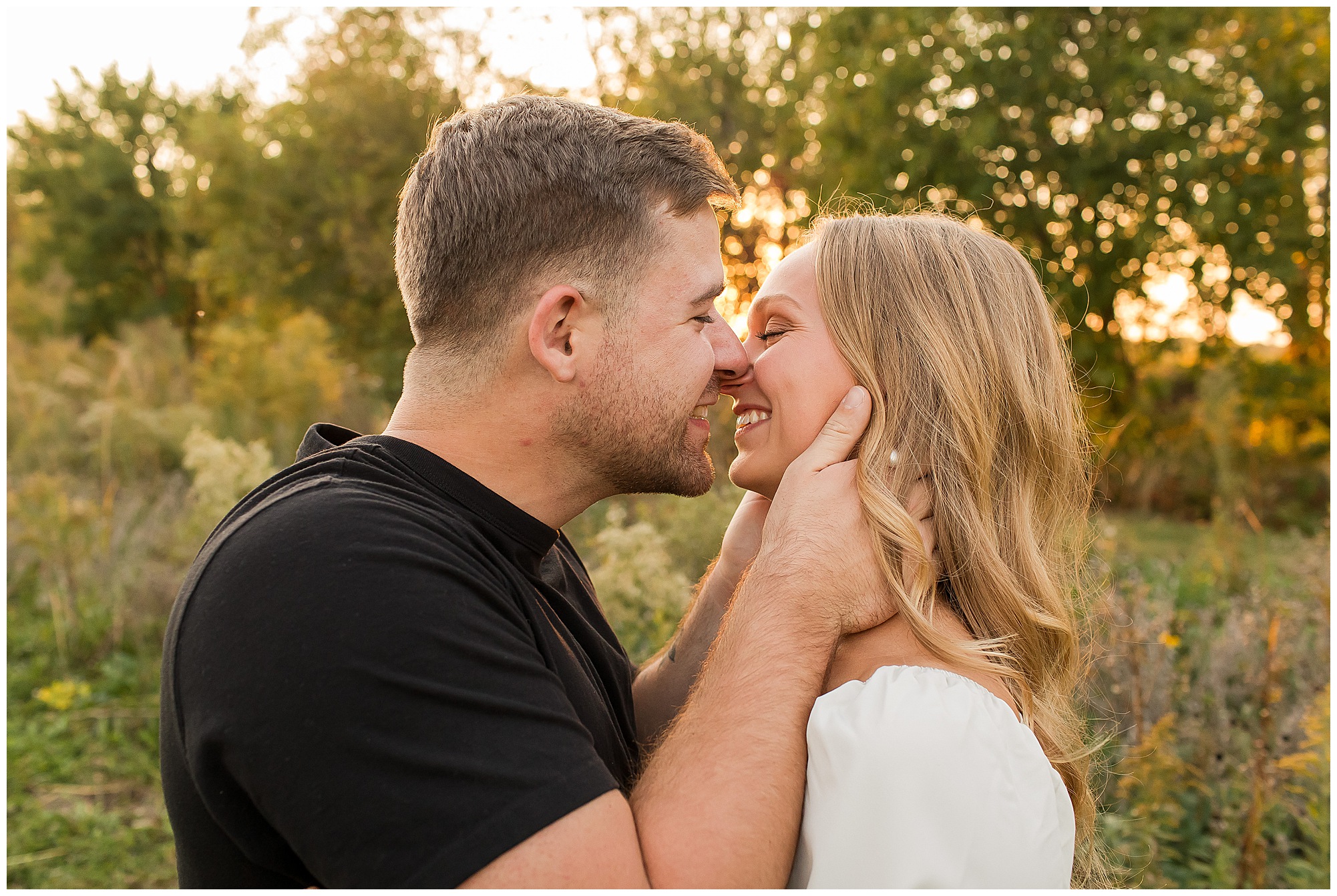 After being downtown, we opted to head to a gorgeous spot where the fall sunset could highlight this duo perfectly. Kamryn brought an added prop with a bouquet of colorful autumn flowers, which gave an extra layer of “Pop” to their photos. I totally adore fresh flowers at a session! The joy and ease these two have in one another’s arms is obvious and I took advantage of their playfulness with lots of movement and even a few prompted “Sneak attacks” by Brock caused adorable moments captured of these two. Kamryn and Brock shared they have been practicing their dip, so of course I had to get them to show that off for me! I cannot wait to be a part of their amazing wedding day this year in the St. Louis area! If it’s anything like their engagement session, I know it will be a blast!