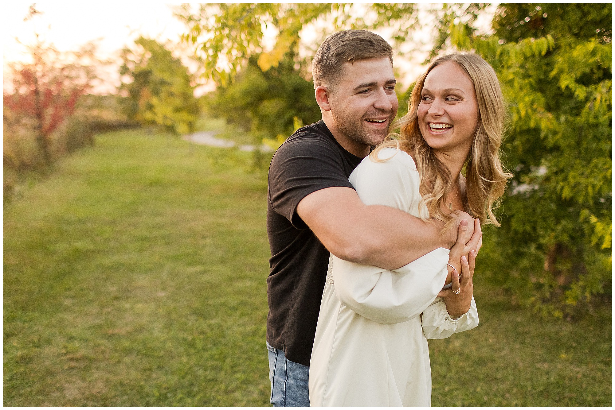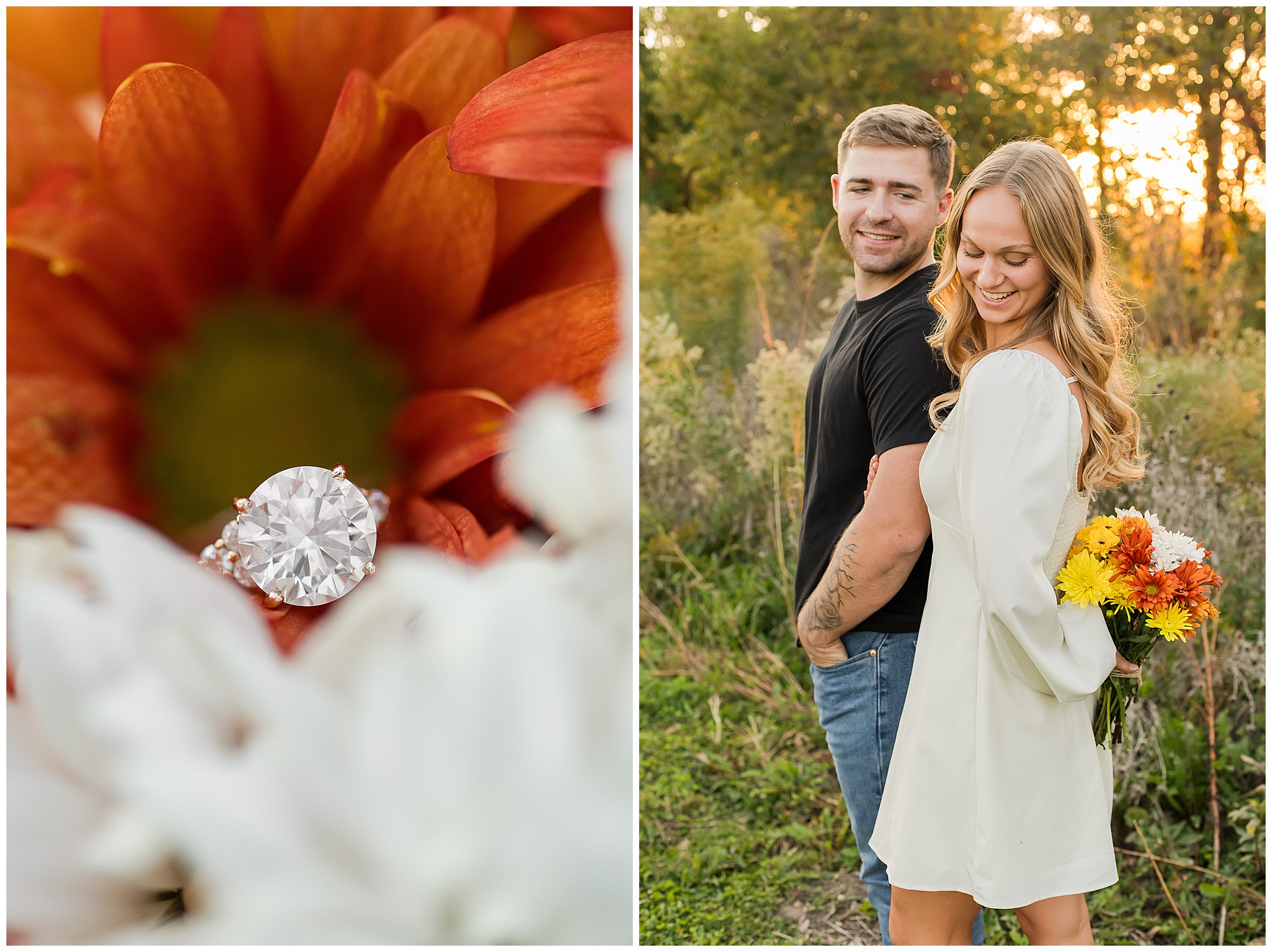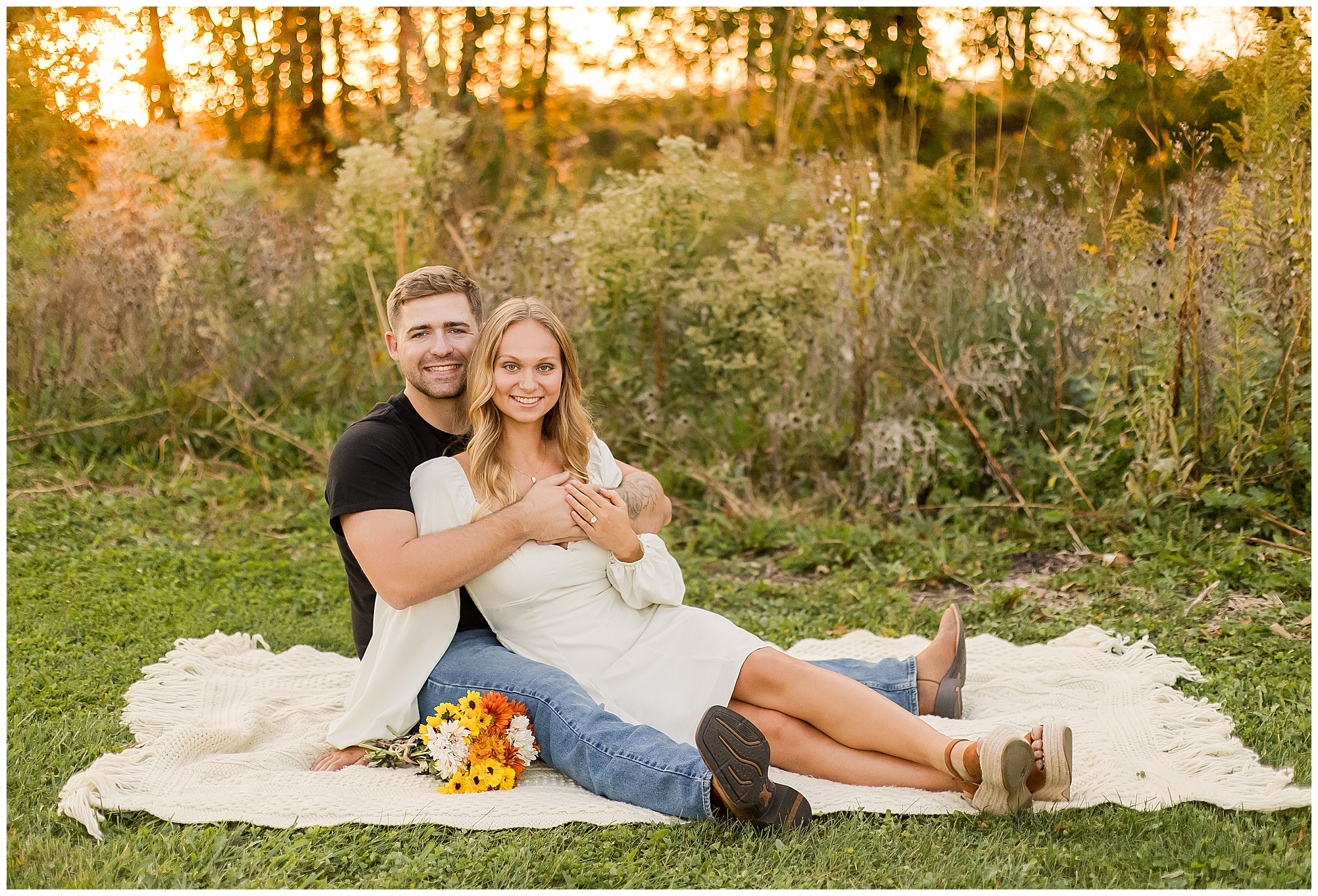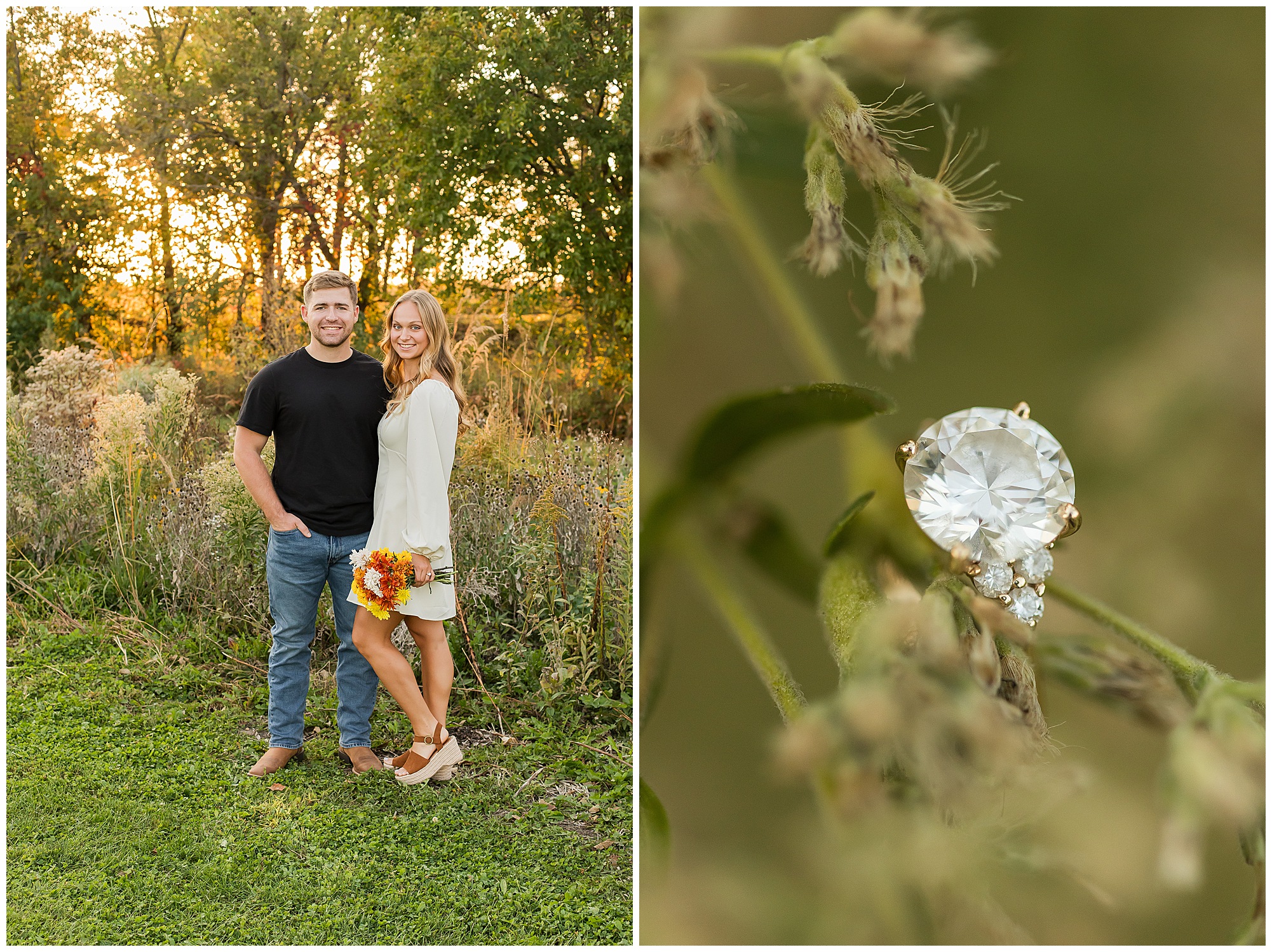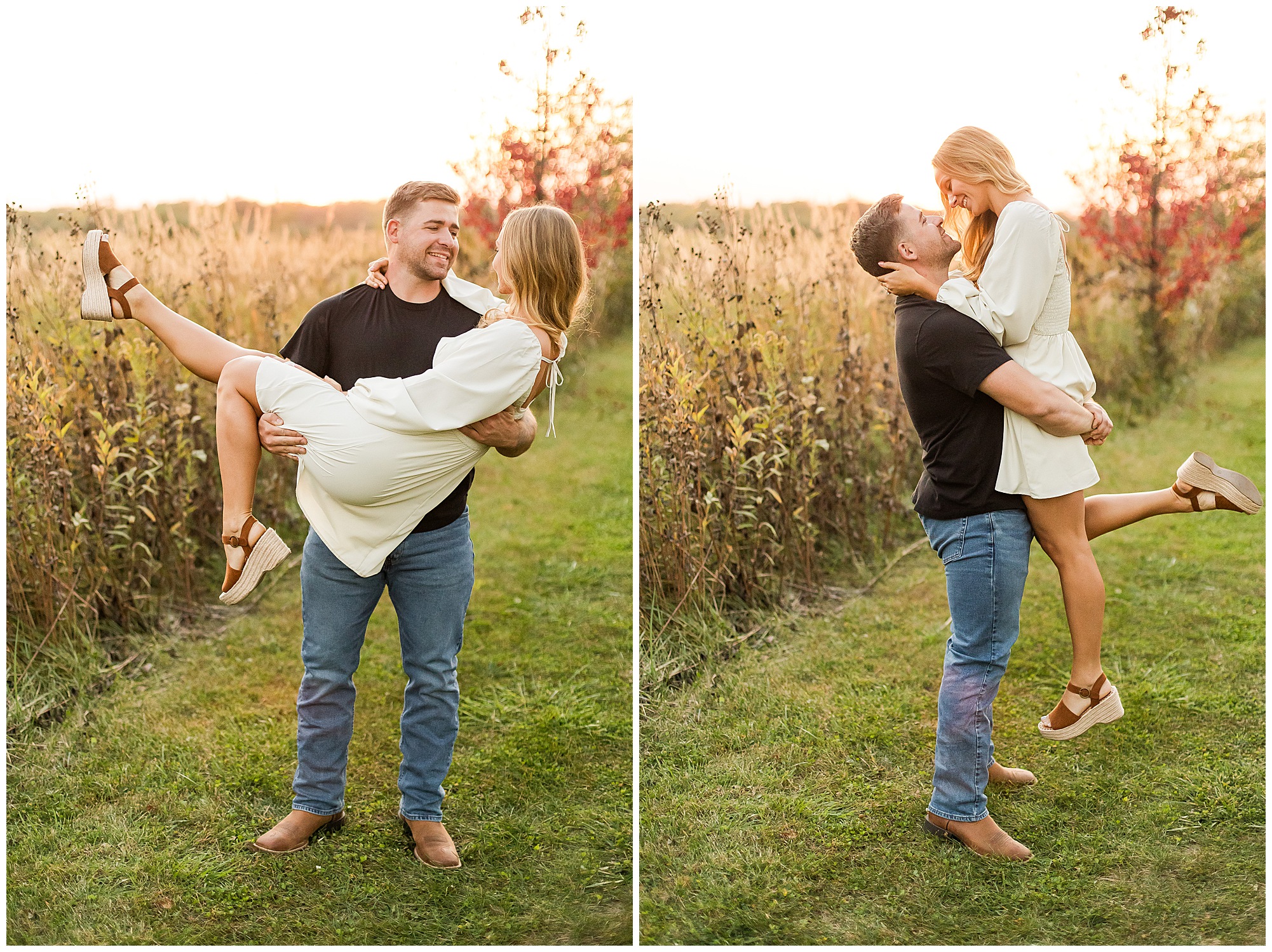 After being downtown, we opted to head to a gorgeous spot where the fall sunset could highlight this duo perfectly. Kamryn brought an added prop with a bouquet of colorful autumn flowers, which gave an extra layer of “Pop” to their photos. I totally adore fresh flowers at a session! The joy and ease these two have in one another’s arms is obvious and I took advantage of their playfulness with lots of movement and even a few prompted “Sneak attacks” by Brock caused adorable moments captured of these two. Kamryn and Brock shared they have been practicing their dip, so of course I had to get them to show that off for me! I cannot wait to be a part of their amazing wedding day this year in the St. Louis area! If it’s anything like their engagement session, I know it will be a blast!