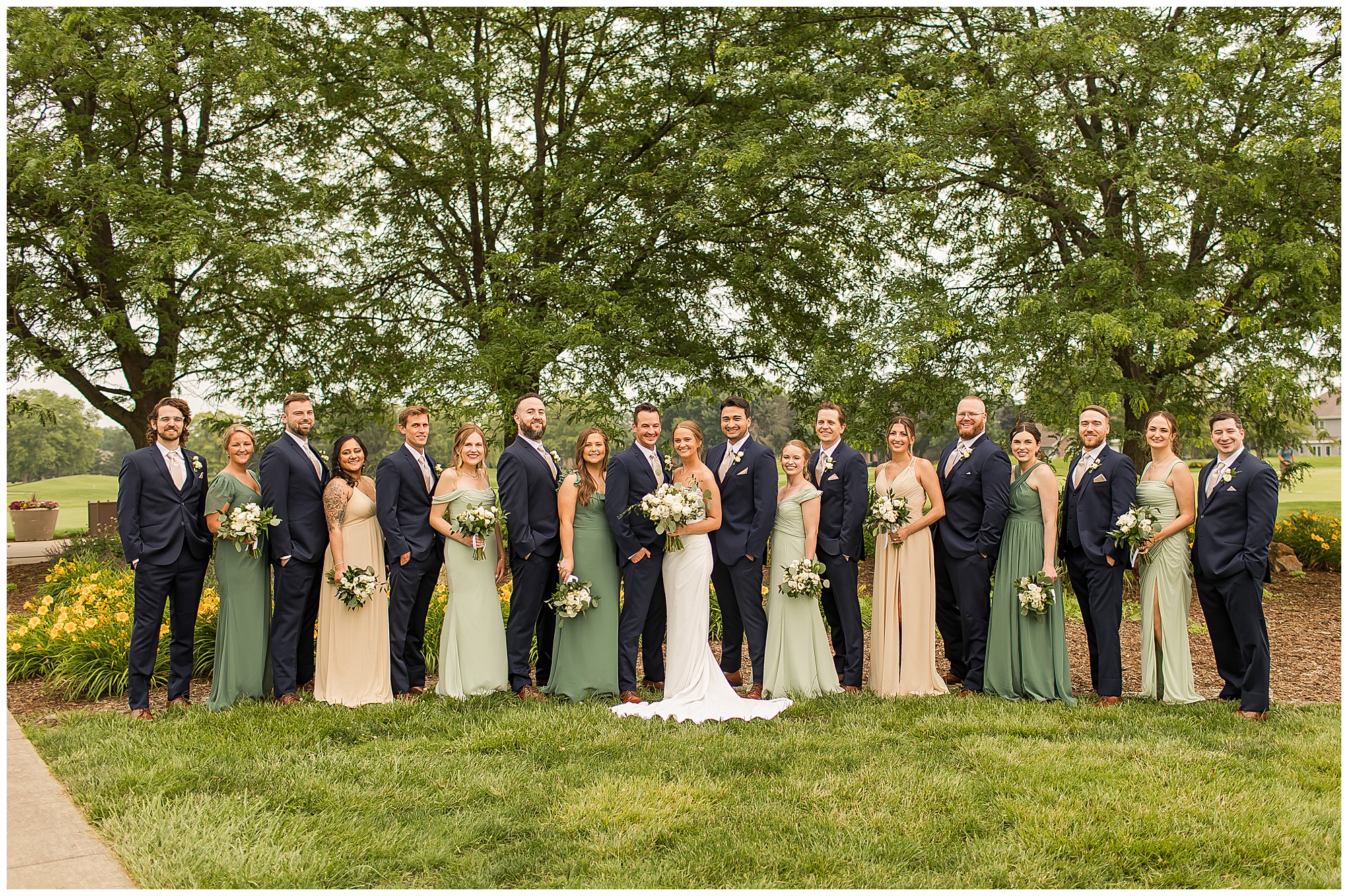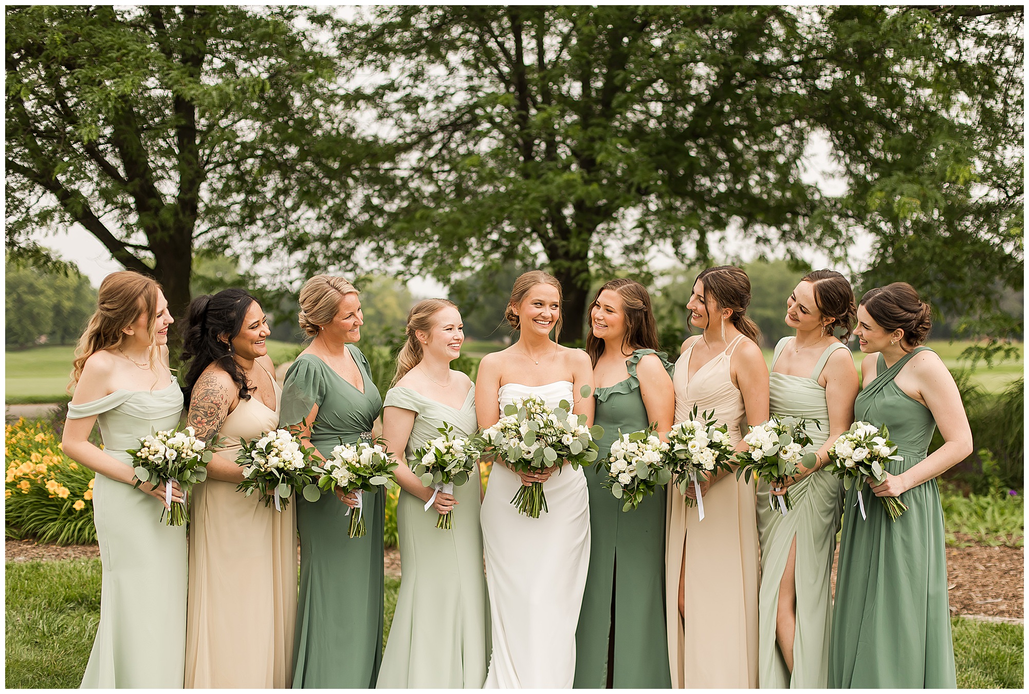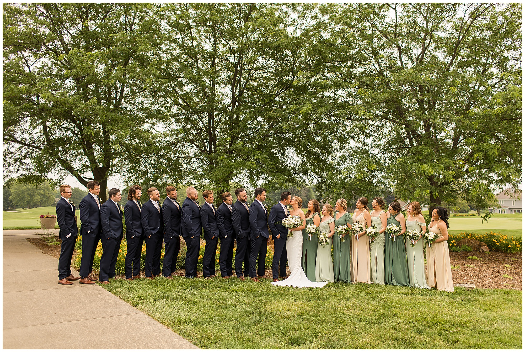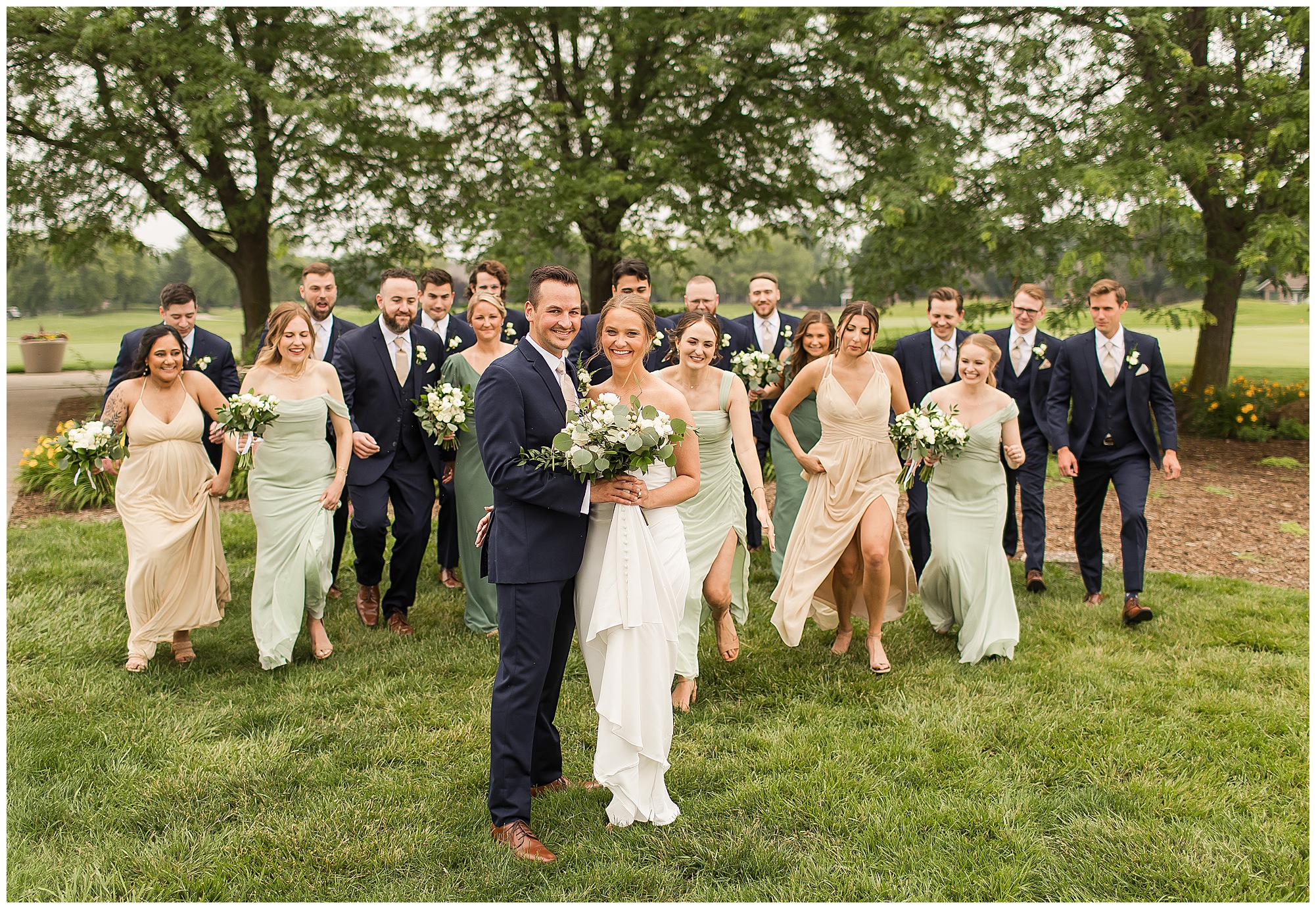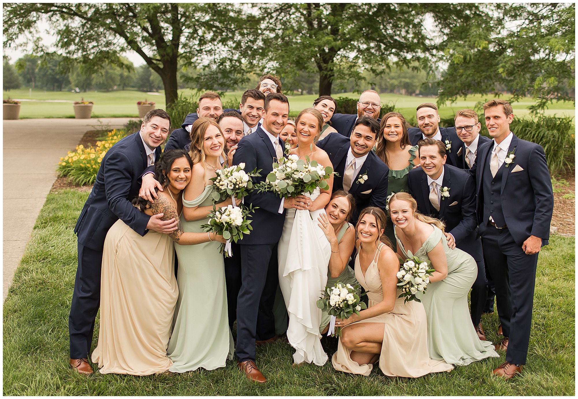 Katie looked incredible as she stood in the tall windows of the salon with her mom being buttoned into her gown. Katie’s classic and timeless style included a fitted, strapless dress with ruching in the bodice and buttons all the way down the back. She was an absolute vision! Her ladies seemed to think so as well, since when they saw her for the first time, tears began in a few of their eyes. Katie’s bridesmaids wore various designs of dresses (which I’m OBSESSED with) and even mixed up the shades of the colors between eucalyptus, dusty sage, and champagne. So beautiful! We then headed over to Panther Creek to meet up with Scott and his guy where they had been getting ready for the day. They were looking very dapper in navy blue suits and champagne ties. Scott was relaxed, but anxious to see his bride! We had scoped out a spot on hole 10 on the lovely golf course next to the lone willow tree on the course for Katie and Scott’s first look. Scott got set up first and you should have seen his eyes get bigger when he heard Katie coming on the golf cart. He was so excited to see her! Katie moved in behind her groom and gave him a little tap on the shoulder allowing Scott a chance to turn and she his bride. It was truly a special moment in the day! A long embrace, a few tears, and pure joy at seeing one another on their wedding day! I genuinely have the best job ever! Who else gets to share this memory with so many couples?!? Then we captured a few photos of Katie and Scott before the craziness of bridal party photos began. We then headed back by the clubhouse where we were meeting their large and amazing bridal squad, who were awaiting for their close-ups. Katie and Scott, along with their crew were incredibly flexible all day as we had some rain in the forecast and from the get-go everyone was in agreement that if we could push up photos to beat the rain we would do it. With a big bridal party you never know if you will get behind, but Katie and Scott’s gang was attentive, helpful, beautiful, and an absolute blast!