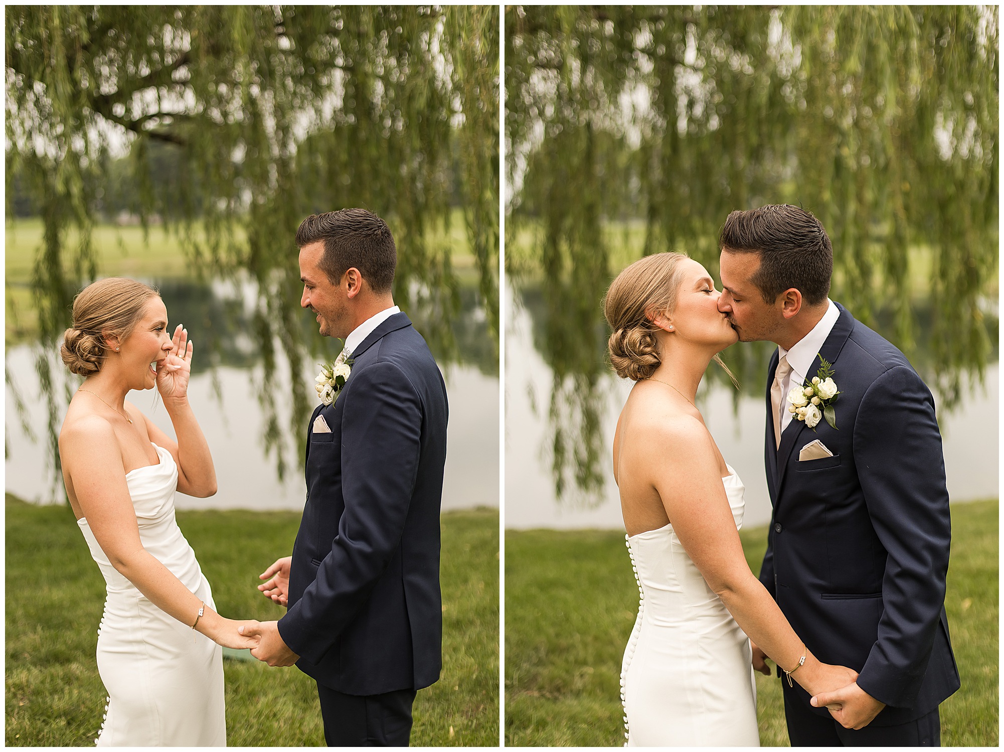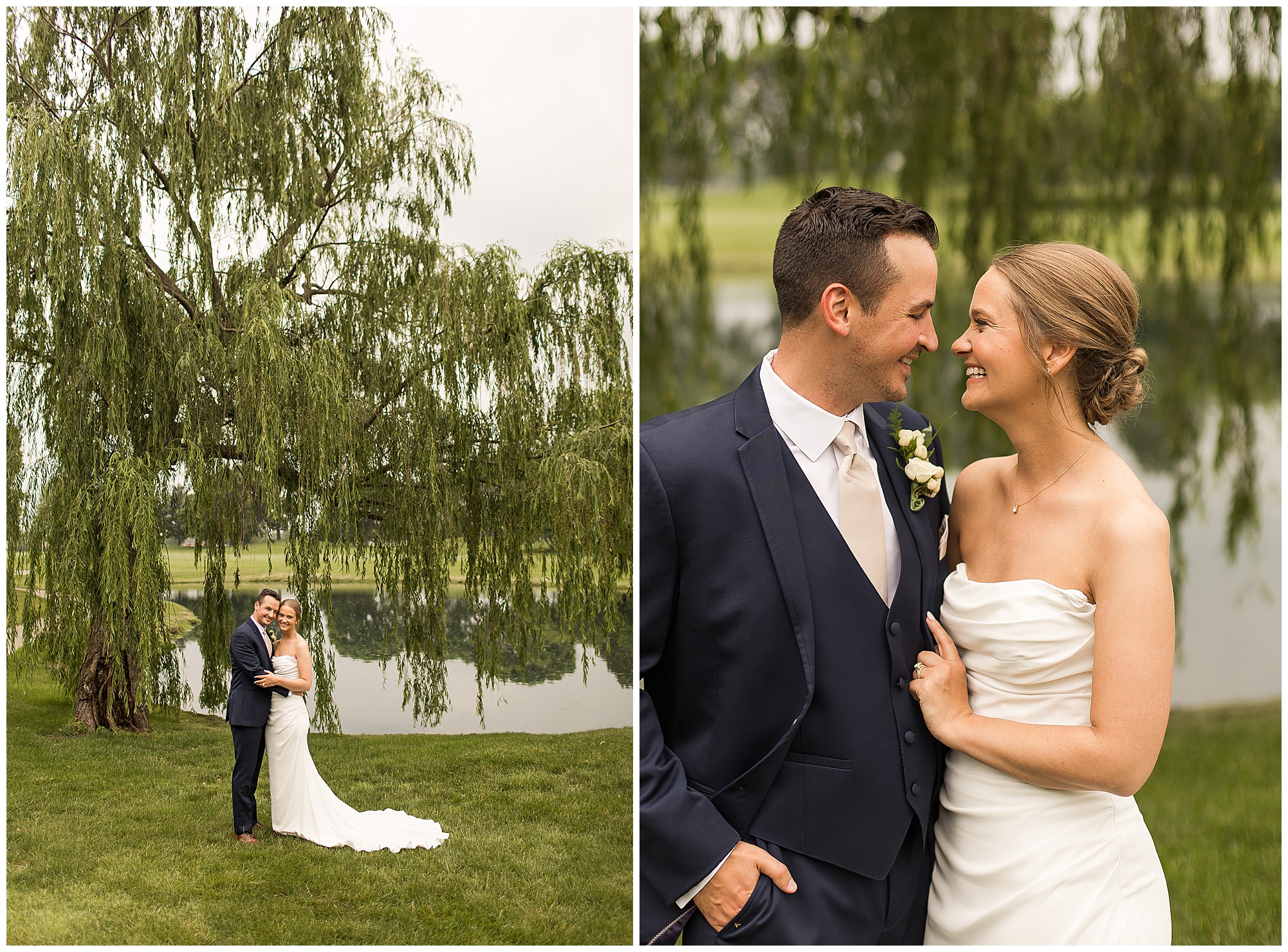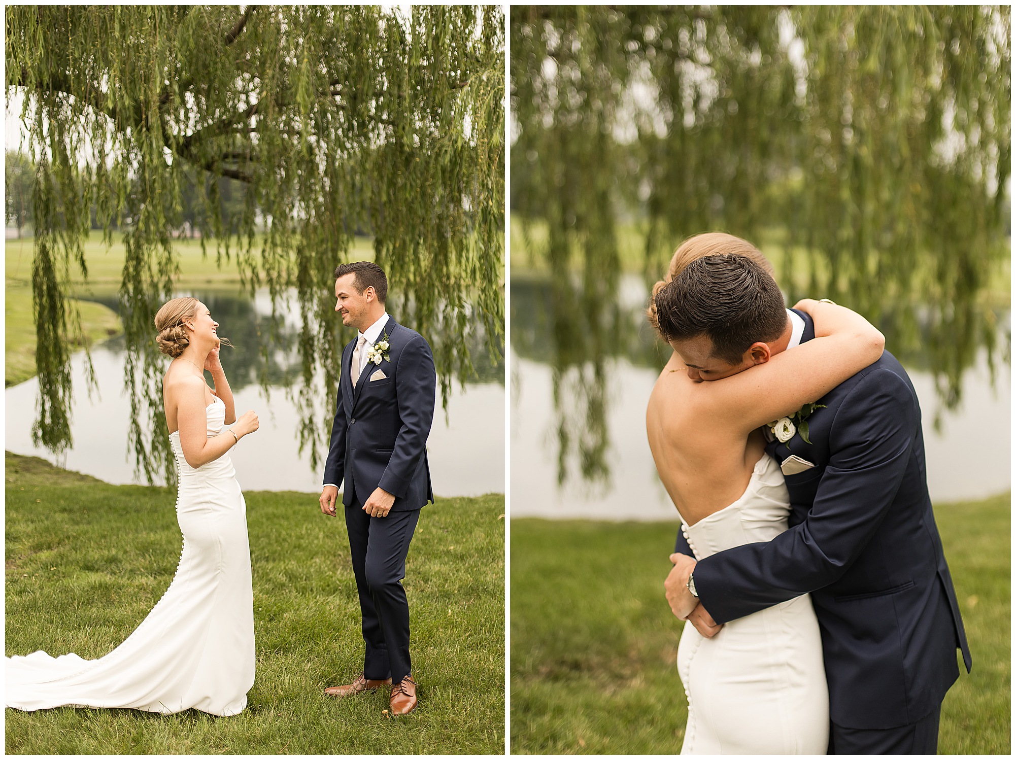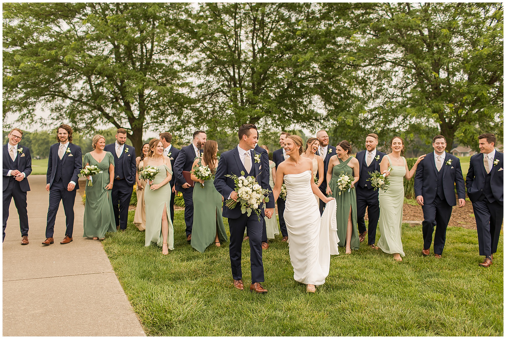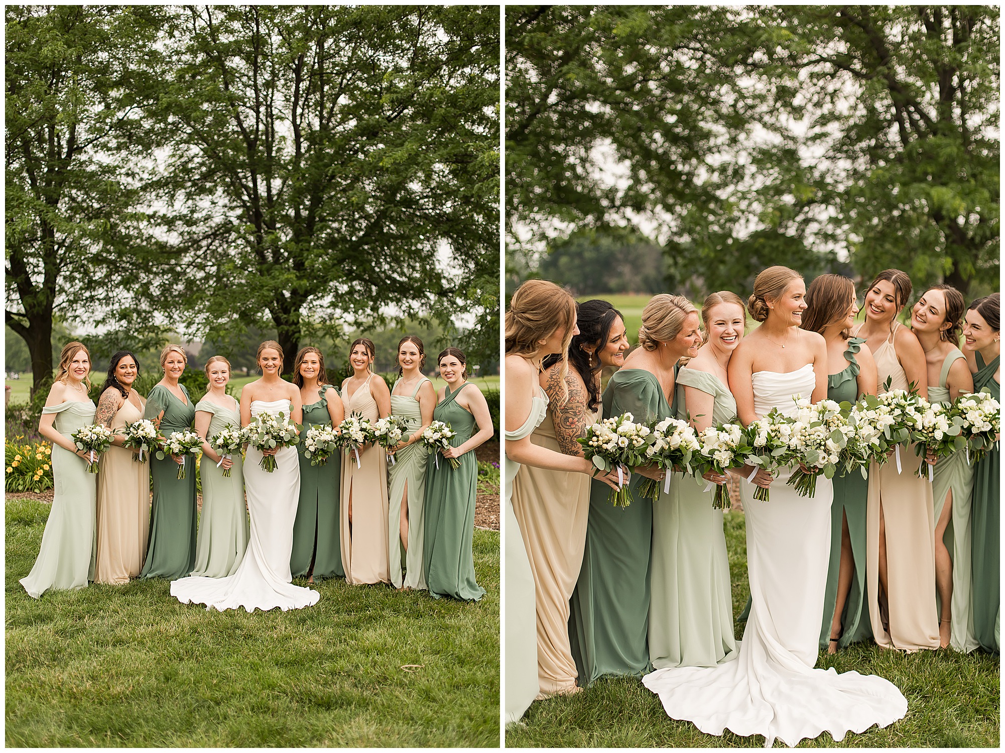 Katie looked incredible as she stood in the tall windows of the salon with her mom being buttoned into her gown. Katie’s classic and timeless style included a fitted, strapless dress with ruching in the bodice and buttons all the way down the back. She was an absolute vision! Her ladies seemed to think so as well, since when they saw her for the first time, tears began in a few of their eyes. Katie’s bridesmaids wore various designs of dresses (which I’m OBSESSED with) and even mixed up the shades of the colors between eucalyptus, dusty sage, and champagne. So beautiful! We then headed over to Panther Creek to meet up with Scott and his guy where they had been getting ready for the day. They were looking very dapper in navy blue suits and champagne ties. Scott was relaxed, but anxious to see his bride! We had scoped out a spot on hole 10 on the lovely golf course next to the lone willow tree on the course for Katie and Scott’s first look. Scott got set up first and you should have seen his eyes get bigger when he heard Katie coming on the golf cart. He was so excited to see her! Katie moved in behind her groom and gave him a little tap on the shoulder allowing Scott a chance to turn and she his bride. It was truly a special moment in the day! A long embrace, a few tears, and pure joy at seeing one another on their wedding day! I genuinely have the best job ever! Who else gets to share this memory with so many couples?!? Then we captured a few photos of Katie and Scott before the craziness of bridal party photos began. We then headed back by the clubhouse where we were meeting their large and amazing bridal squad, who were awaiting for their close-ups. Katie and Scott, along with their crew were incredibly flexible all day as we had some rain in the forecast and from the get-go everyone was in agreement that if we could push up photos to beat the rain we would do it. With a big bridal party you never know if you will get behind, but Katie and Scott’s gang was attentive, helpful, beautiful, and an absolute blast!