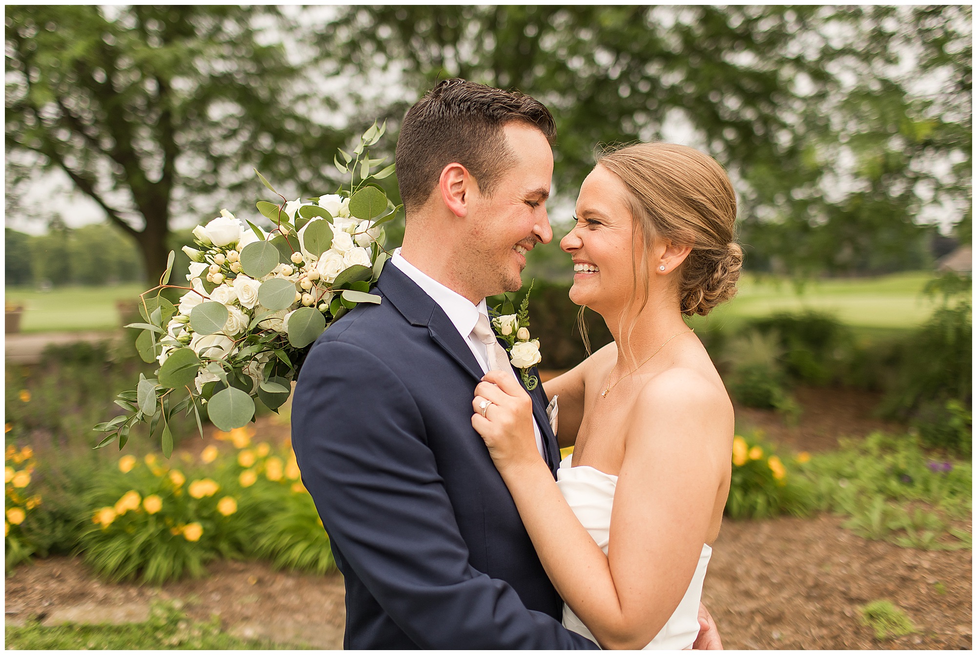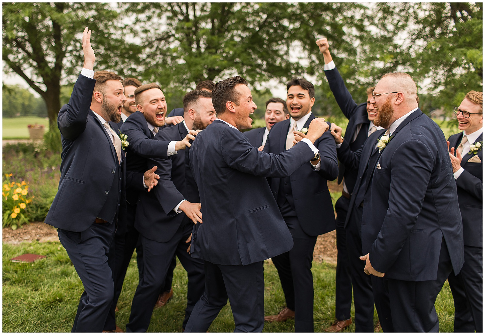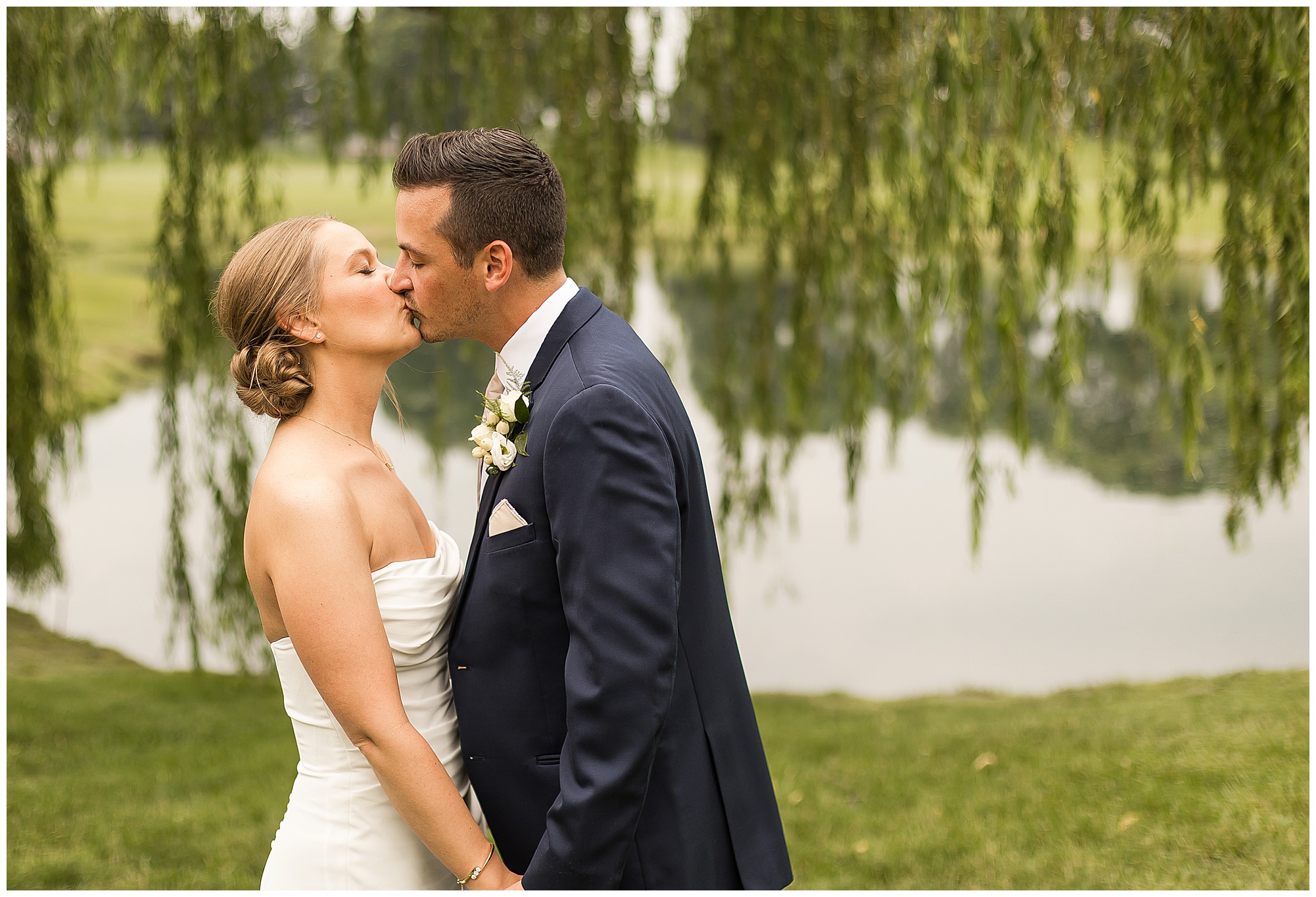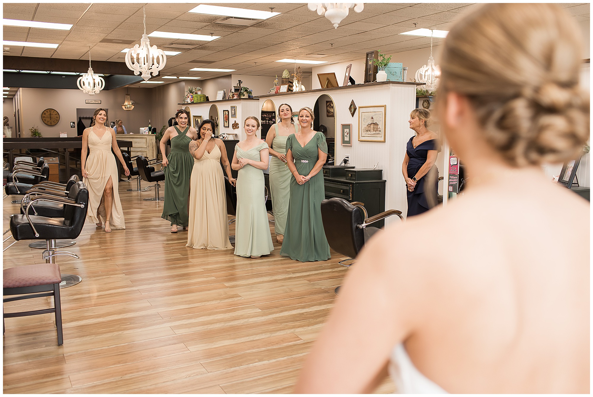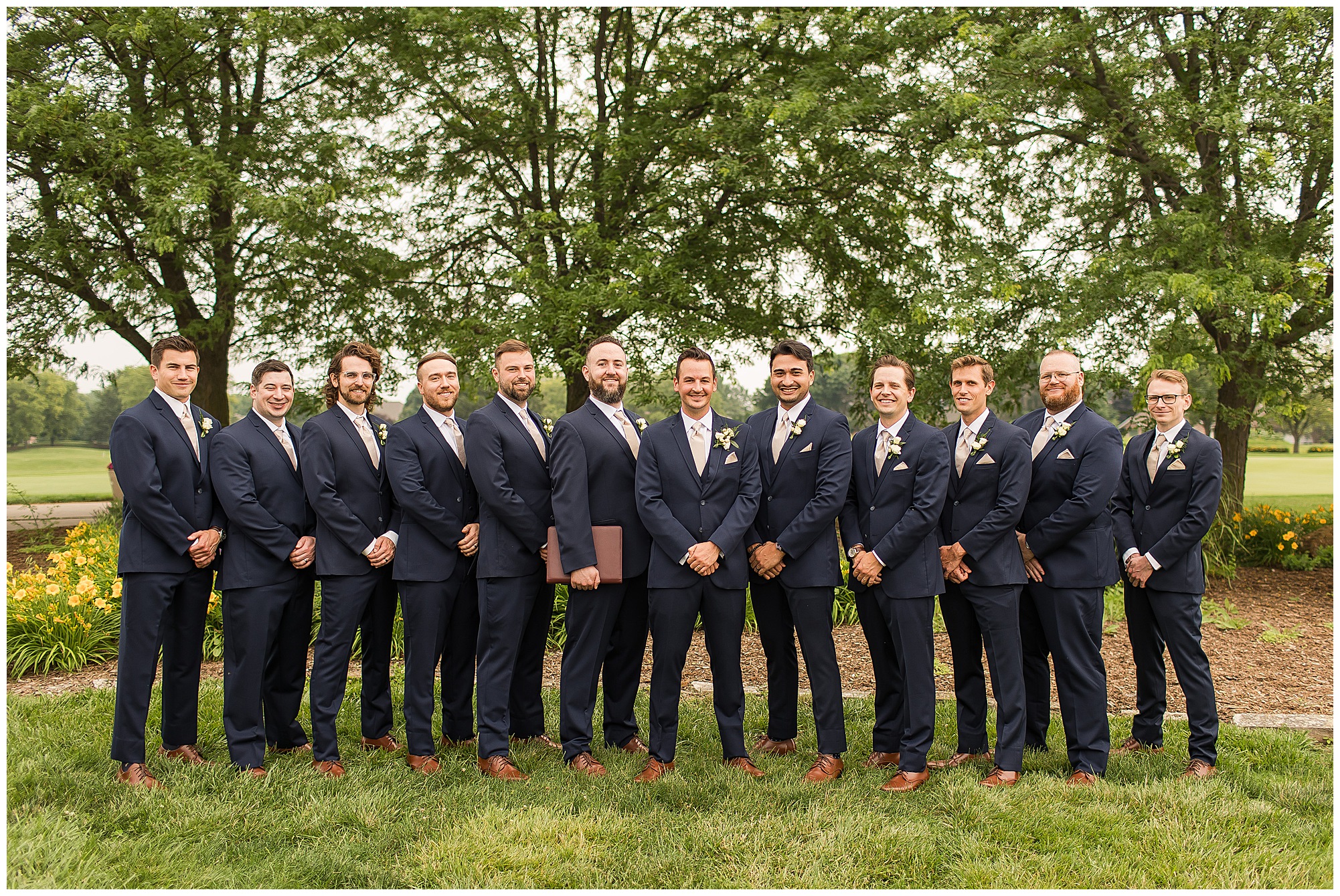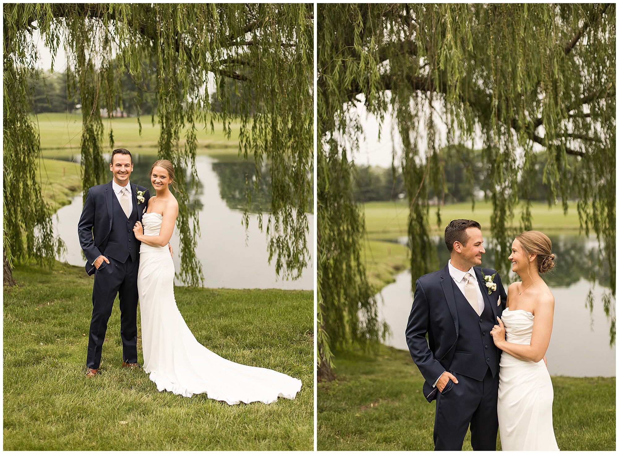Katie looked incredible as she stood in the tall windows of the salon with her mom being buttoned into her gown. Katie’s classic and timeless style included a fitted, strapless dress with ruching in the bodice and buttons all the way down the back. She was an absolute vision! Her ladies seemed to think so as well, since when they saw her for the first time, tears began in a few of their eyes. Katie’s bridesmaids wore various designs of dresses (which I’m OBSESSED with) and even mixed up the shades of the colors between eucalyptus, dusty sage, and champagne. So beautiful! We then headed over to Panther Creek to meet up with Scott and his guy where they had been getting ready for the day. They were looking very dapper in navy blue suits and champagne ties. Scott was relaxed, but anxious to see his bride! We had scoped out a spot on hole 10 on the lovely golf course next to the lone willow tree on the course for Katie and Scott’s first look. Scott got set up first and you should have seen his eyes get bigger when he heard Katie coming on the golf cart. He was so excited to see her! Katie moved in behind her groom and gave him a little tap on the shoulder allowing Scott a chance to turn and she his bride. It was truly a special moment in the day! A long embrace, a few tears, and pure joy at seeing one another on their wedding day! I genuinely have the best job ever! Who else gets to share this memory with so many couples?!? Then we captured a few photos of Katie and Scott before the craziness of bridal party photos began. We then headed back by the clubhouse where we were meeting their large and amazing bridal squad, who were awaiting for their close-ups. Katie and Scott, along with their crew were incredibly flexible all day as we had some rain in the forecast and from the get-go everyone was in agreement that if we could push up photos to beat the rain we would do it. With a big bridal party you never know if you will get behind, but Katie and Scott’s gang was attentive, helpful, beautiful, and an absolute blast!