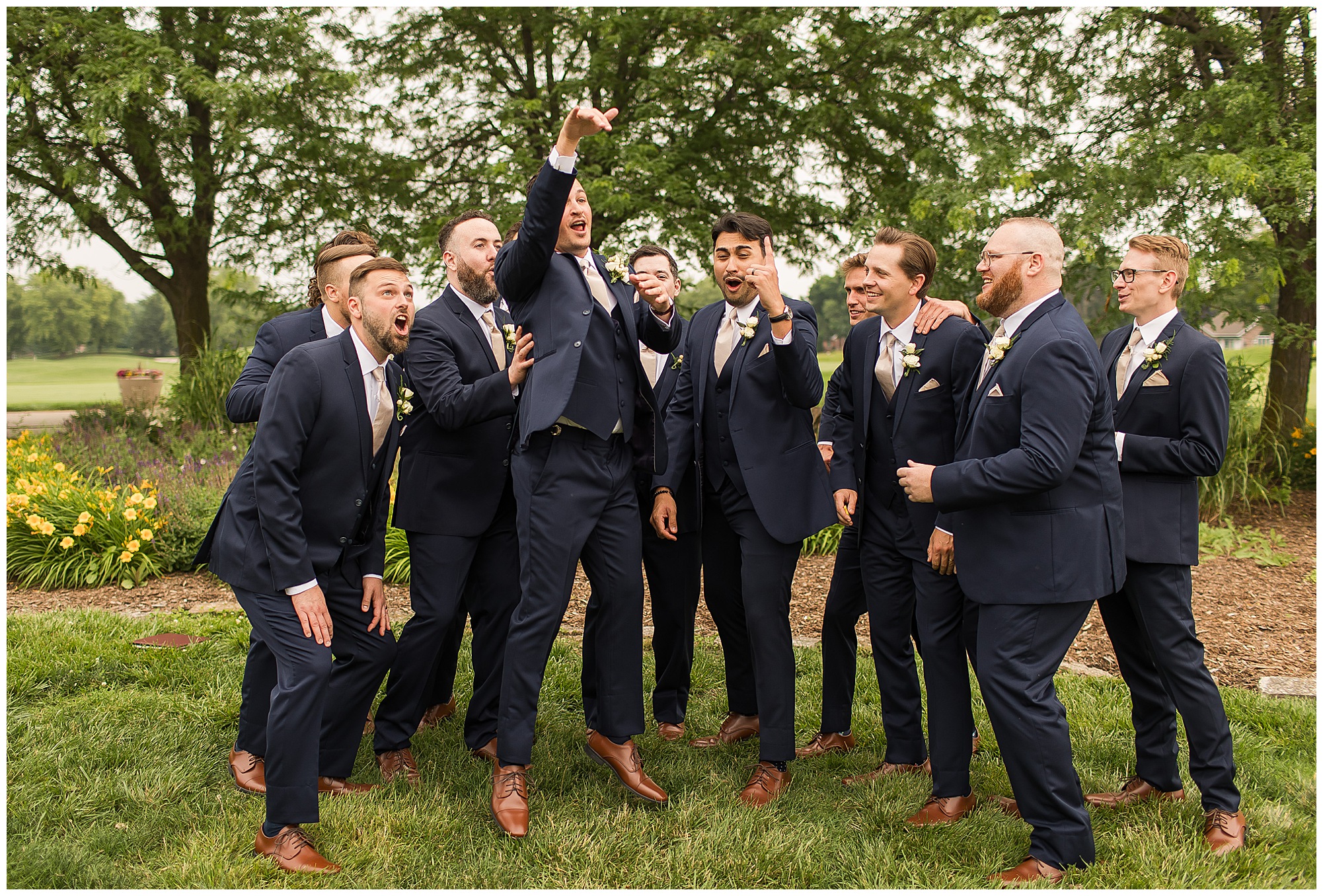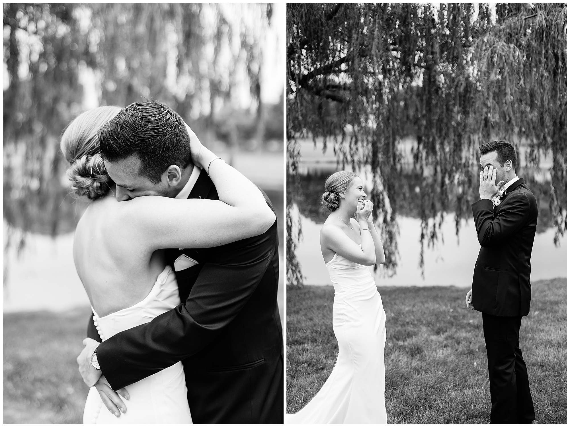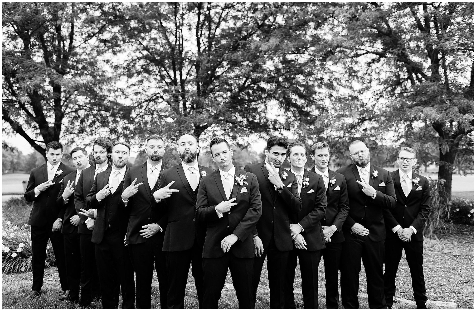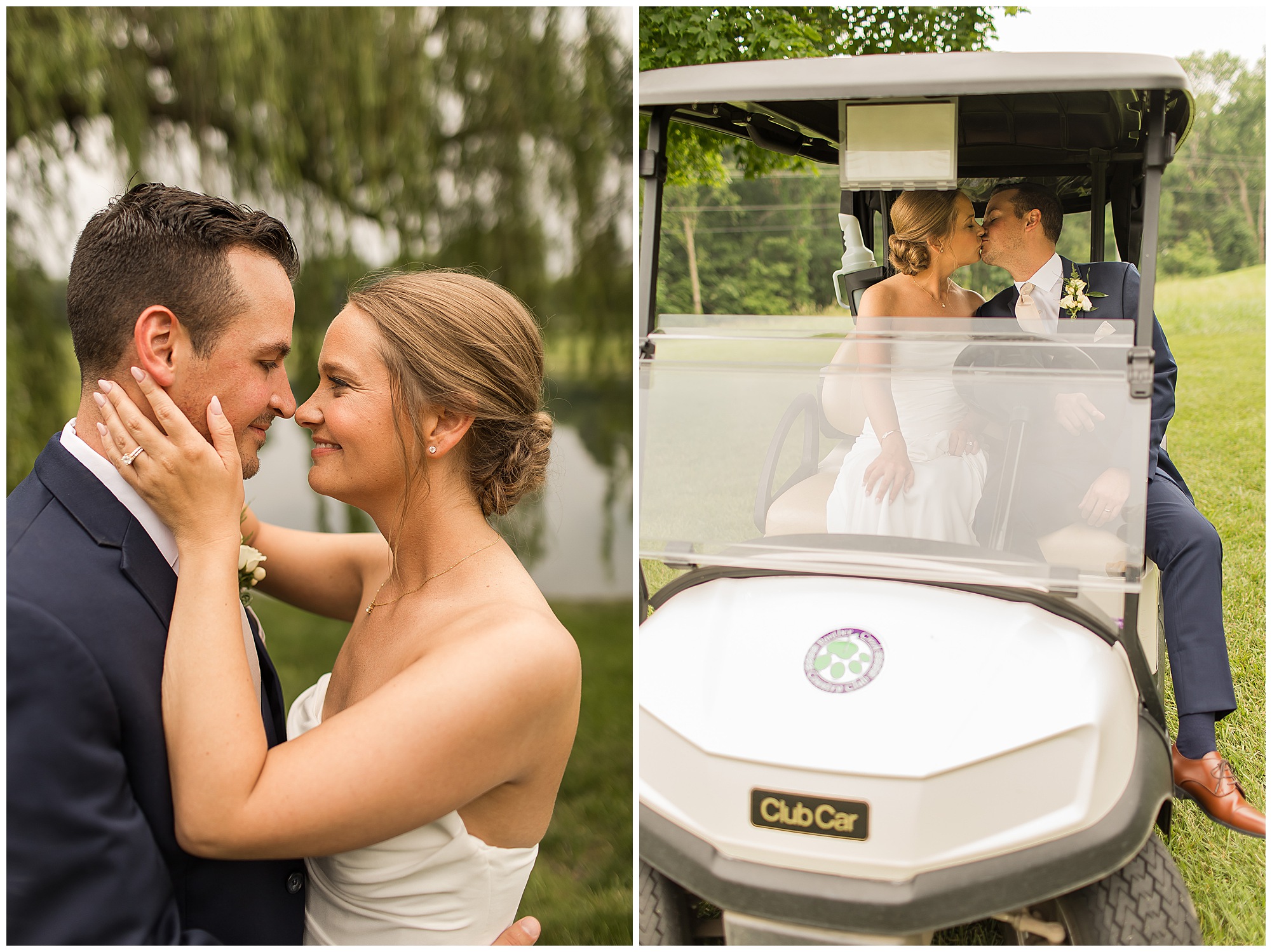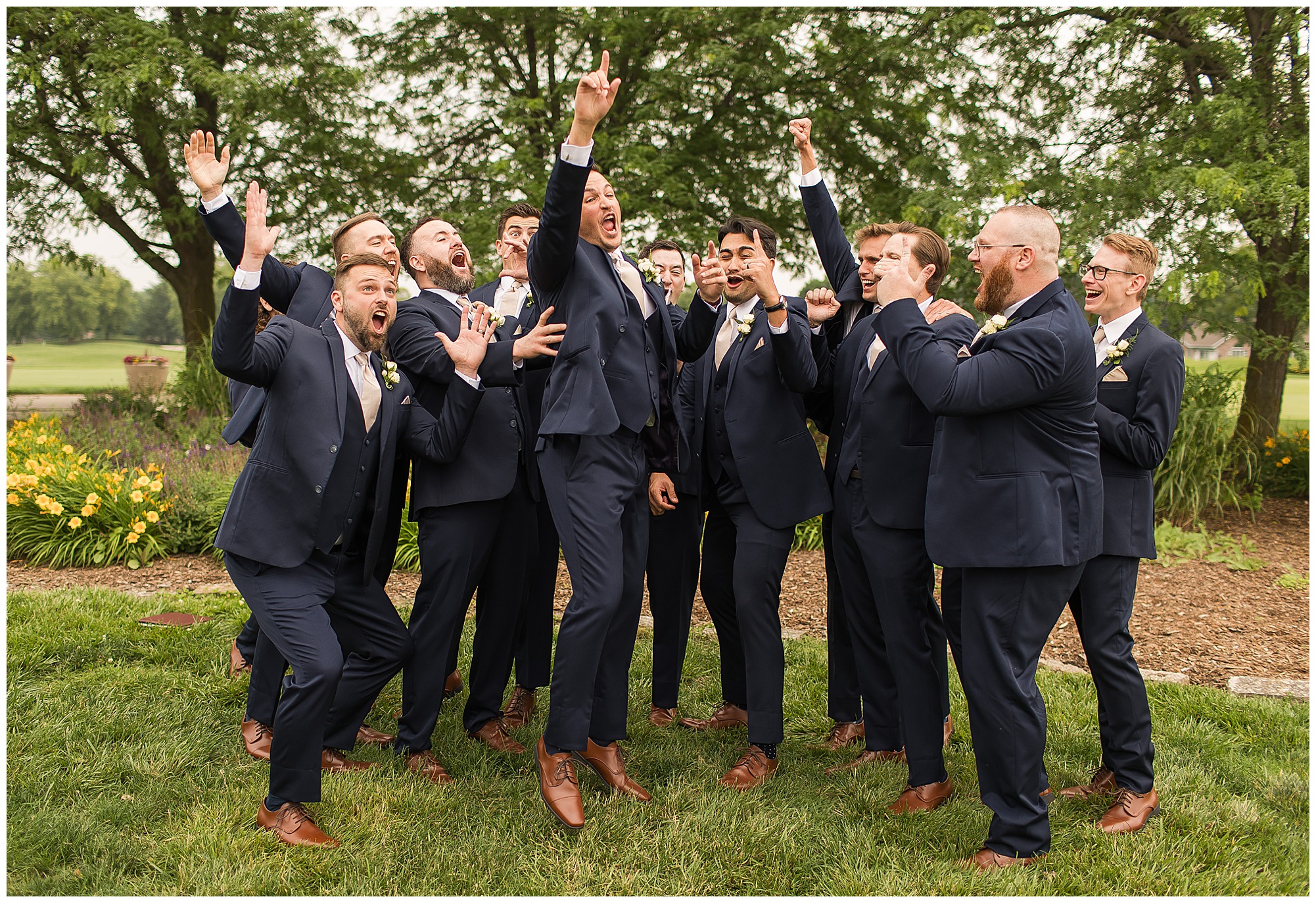 Katie looked incredible as she stood in the tall windows of the salon with her mom being buttoned into her gown. Katie’s classic and timeless style included a fitted, strapless dress with ruching in the bodice and buttons all the way down the back. She was an absolute vision! Her ladies seemed to think so as well, since when they saw her for the first time, tears began in a few of their eyes. Katie’s bridesmaids wore various designs of dresses (which I’m OBSESSED with) and even mixed up the shades of the colors between eucalyptus, dusty sage, and champagne. So beautiful! We then headed over to Panther Creek to meet up with Scott and his guy where they had been getting ready for the day. They were looking very dapper in navy blue suits and champagne ties. Scott was relaxed, but anxious to see his bride! We had scoped out a spot on hole 10 on the lovely golf course next to the lone willow tree on the course for Katie and Scott’s first look. Scott got set up first and you should have seen his eyes get bigger when he heard Katie coming on the golf cart. He was so excited to see her! Katie moved in behind her groom and gave him a little tap on the shoulder allowing Scott a chance to turn and she his bride. It was truly a special moment in the day! A long embrace, a few tears, and pure joy at seeing one another on their wedding day! I genuinely have the best job ever! Who else gets to share this memory with so many couples?!? Then we captured a few photos of Katie and Scott before the craziness of bridal party photos began. We then headed back by the clubhouse where we were meeting their large and amazing bridal squad, who were awaiting for their close-ups. Katie and Scott, along with their crew were incredibly flexible all day as we had some rain in the forecast and from the get-go everyone was in agreement that if we could push up photos to beat the rain we would do it. With a big bridal party you never know if you will get behind, but Katie and Scott’s gang was attentive, helpful, beautiful, and an absolute blast!