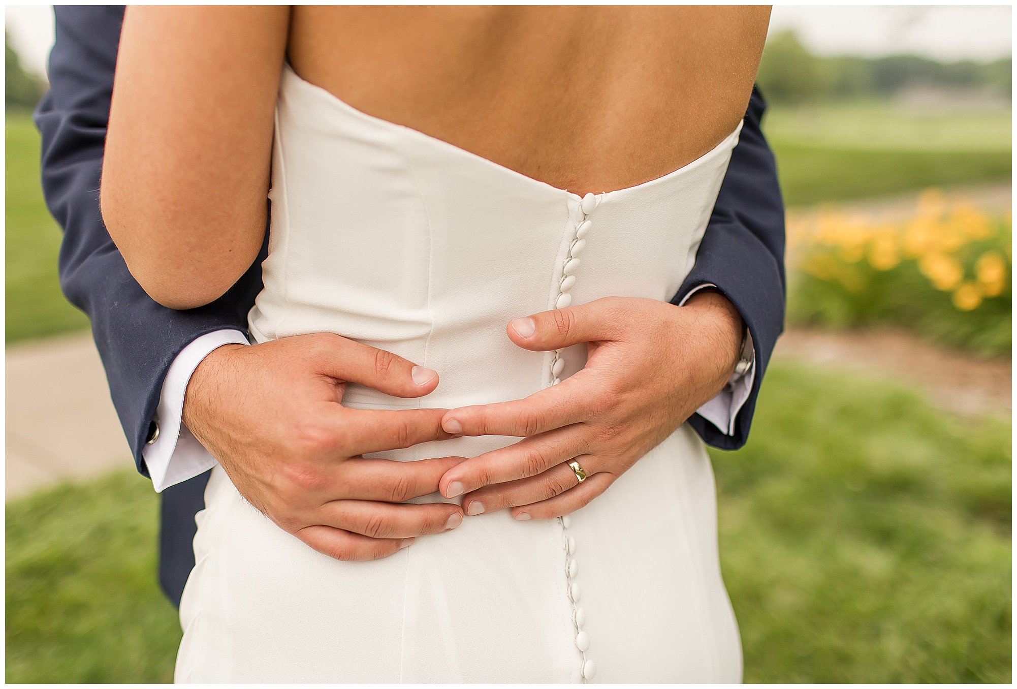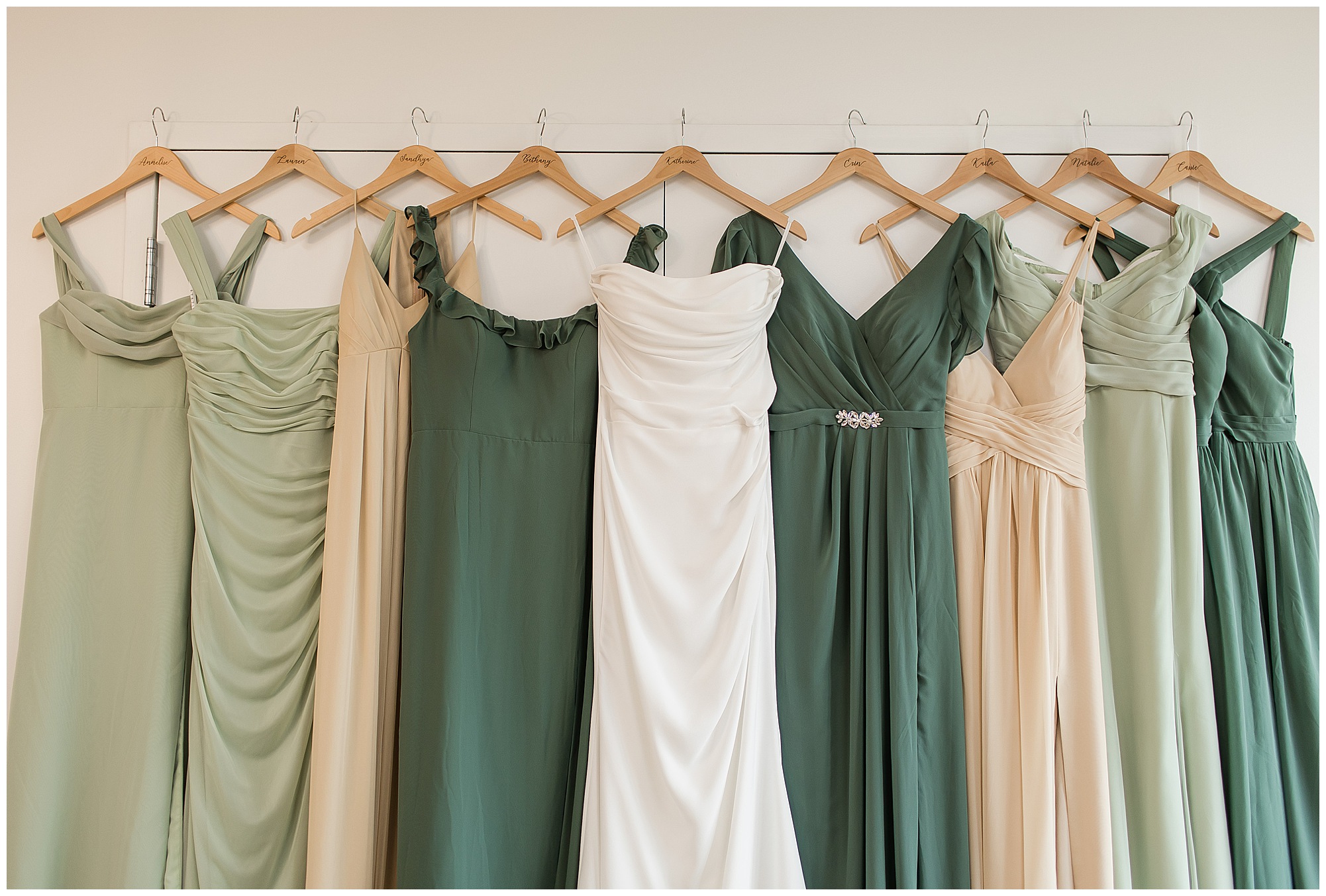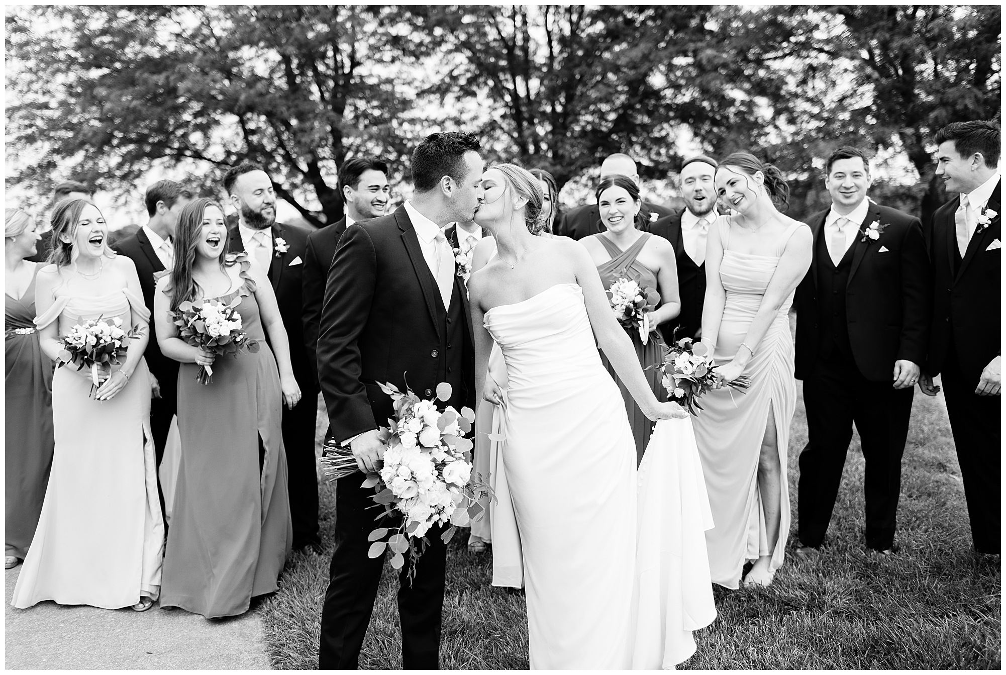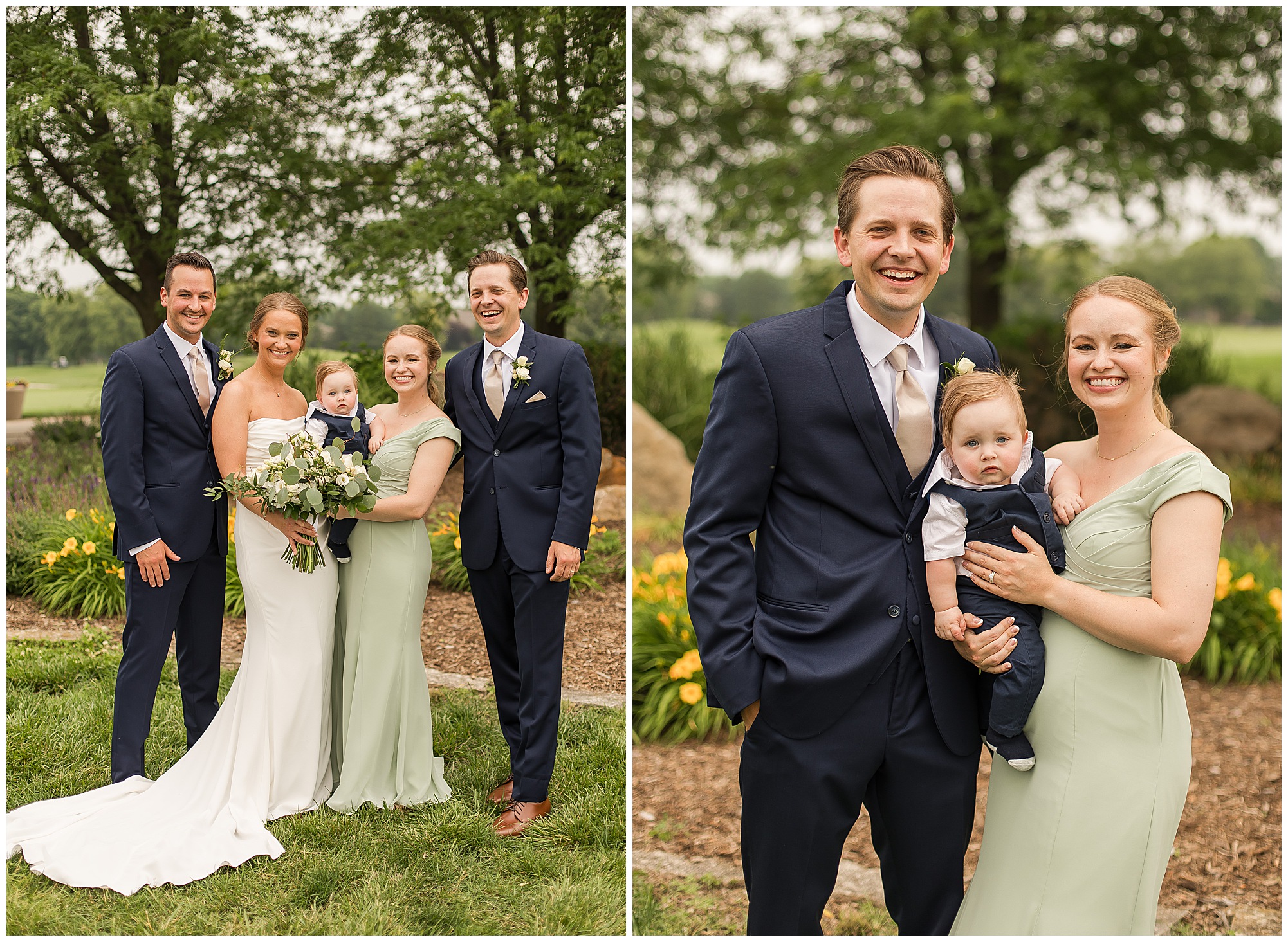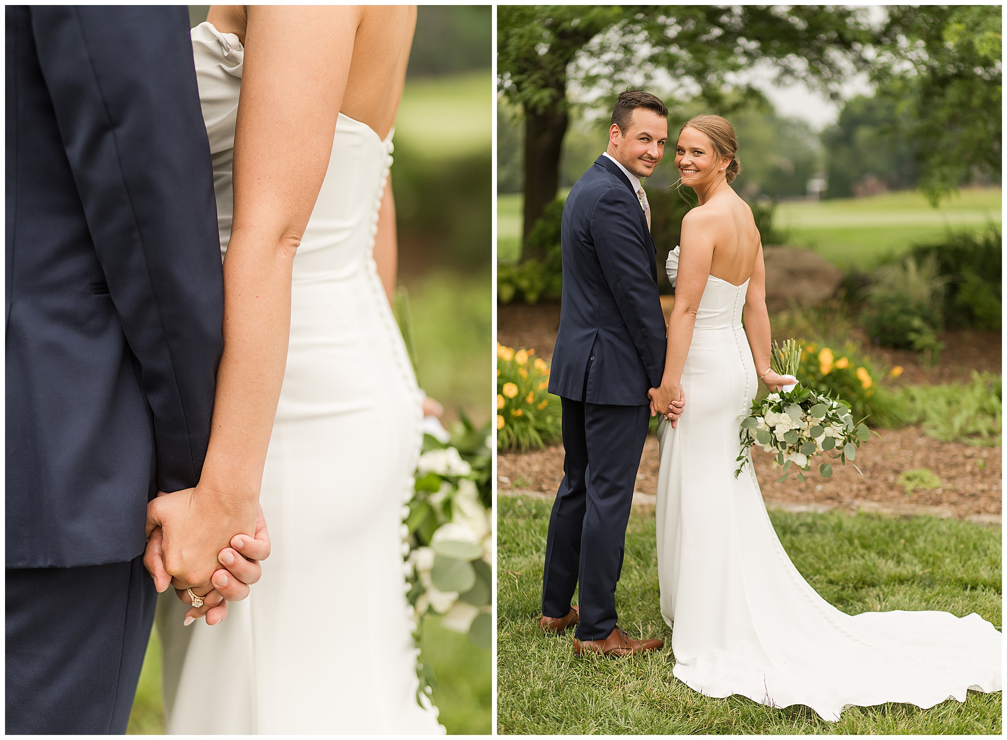 Katie looked incredible as she stood in the tall windows of the salon with her mom being buttoned into her gown. Katie’s classic and timeless style included a fitted, strapless dress with ruching in the bodice and buttons all the way down the back. She was an absolute vision! Her ladies seemed to think so as well, since when they saw her for the first time, tears began in a few of their eyes. Katie’s bridesmaids wore various designs of dresses (which I’m OBSESSED with) and even mixed up the shades of the colors between eucalyptus, dusty sage, and champagne. So beautiful! We then headed over to Panther Creek to meet up with Scott and his guy where they had been getting ready for the day. They were looking very dapper in navy blue suits and champagne ties. Scott was relaxed, but anxious to see his bride! We had scoped out a spot on hole 10 on the lovely golf course next to the lone willow tree on the course for Katie and Scott’s first look. Scott got set up first and you should have seen his eyes get bigger when he heard Katie coming on the golf cart. He was so excited to see her! Katie moved in behind her groom and gave him a little tap on the shoulder allowing Scott a chance to turn and she his bride. It was truly a special moment in the day! A long embrace, a few tears, and pure joy at seeing one another on their wedding day! I genuinely have the best job ever! Who else gets to share this memory with so many couples?!? Then we captured a few photos of Katie and Scott before the craziness of bridal party photos began. We then headed back by the clubhouse where we were meeting their large and amazing bridal squad, who were awaiting for their close-ups. Katie and Scott, along with their crew were incredibly flexible all day as we had some rain in the forecast and from the get-go everyone was in agreement that if we could push up photos to beat the rain we would do it. With a big bridal party you never know if you will get behind, but Katie and Scott’s gang was attentive, helpful, beautiful, and an absolute blast!