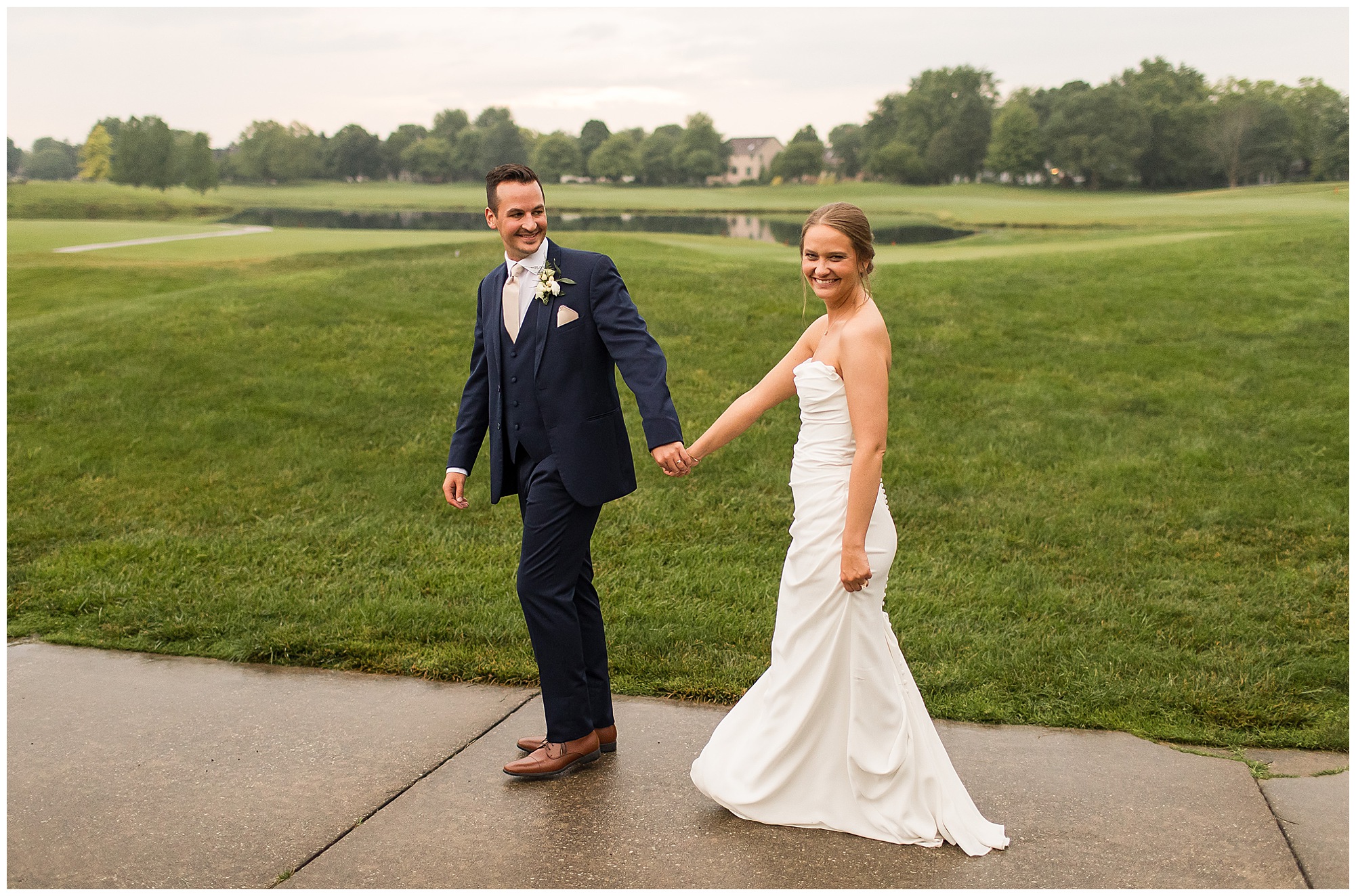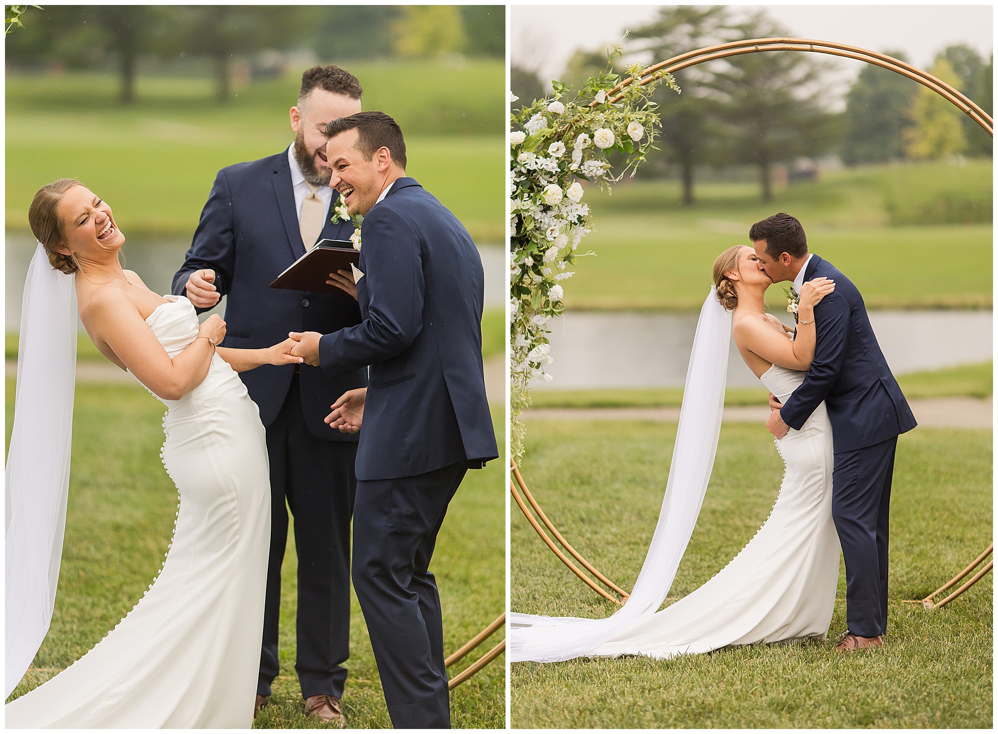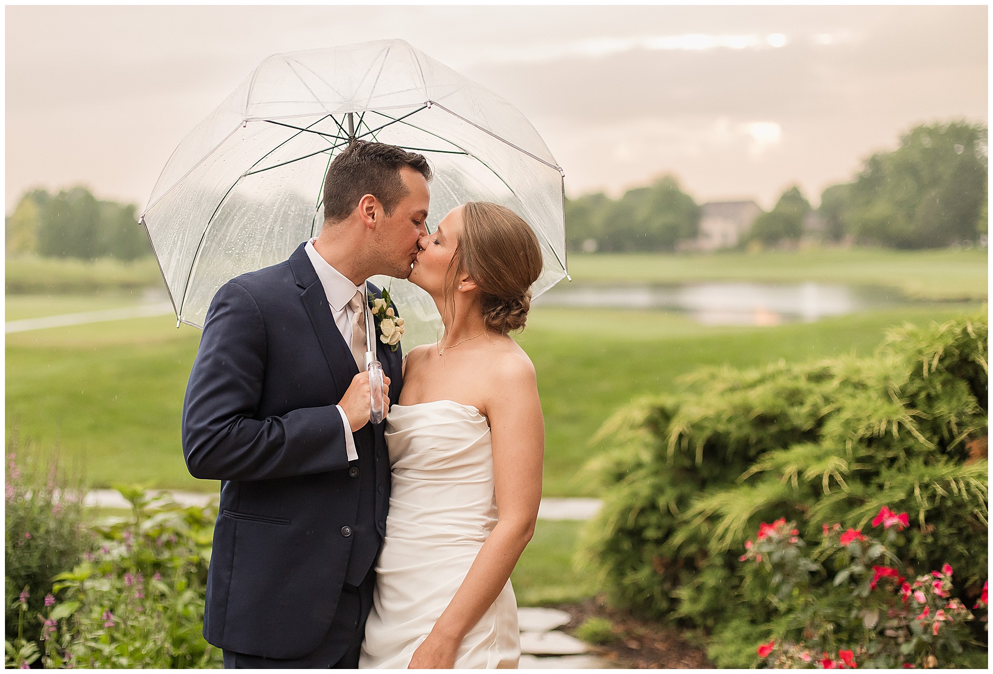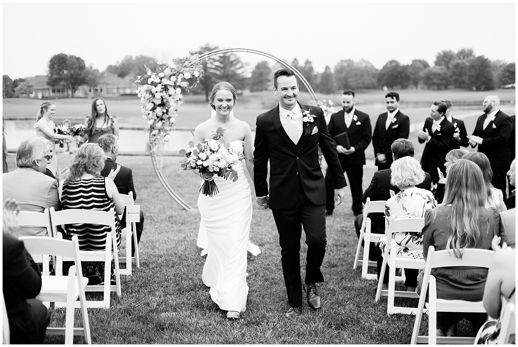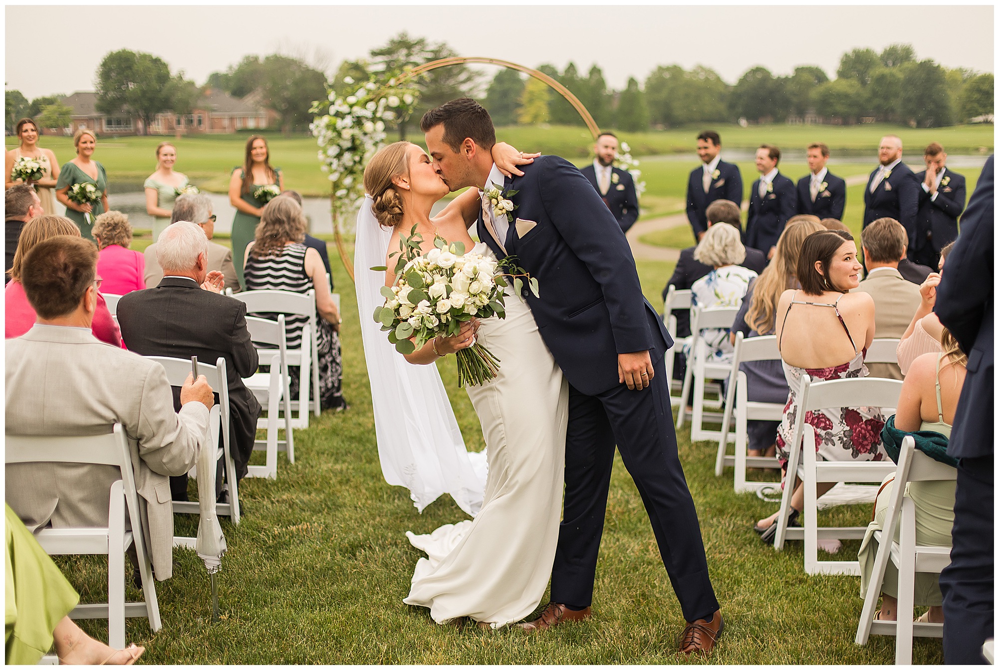Leading up to the ceremony time, everyone’s eyes were on the radar. The ceremony was originally planned to be outside overlooking the golf course. However, with a few sprinkles and the radar showing that right around Katie and Scott’s “I Do’s” there could be rain, this couple had a hard decision to make. Yet, Katie’s brother, David asked them, “Which decision felt better…Getting married outside like you planned the entire time? Or inside in the basement? And how would you feel if after all this worry about rain…It didn’t rain at all?” After posing those questions to them in that light…It seemed like an easier decision to the duo and they decided to go for it and have their ceremony outside. Just as it was time for Katie to walk down the aisle, the few sprinkles that were falling…let up. The setting was elegant and exactly right for Katie and Scott as they shared their vows, exchanged rings, and sealed it with a kiss. Introducing Mr. & Mrs. Egolf! Then within seconds of the newlyweds walking back up the aisle together as husband and wife…The sky opened up and the rain began to pour! So it held off just for them!