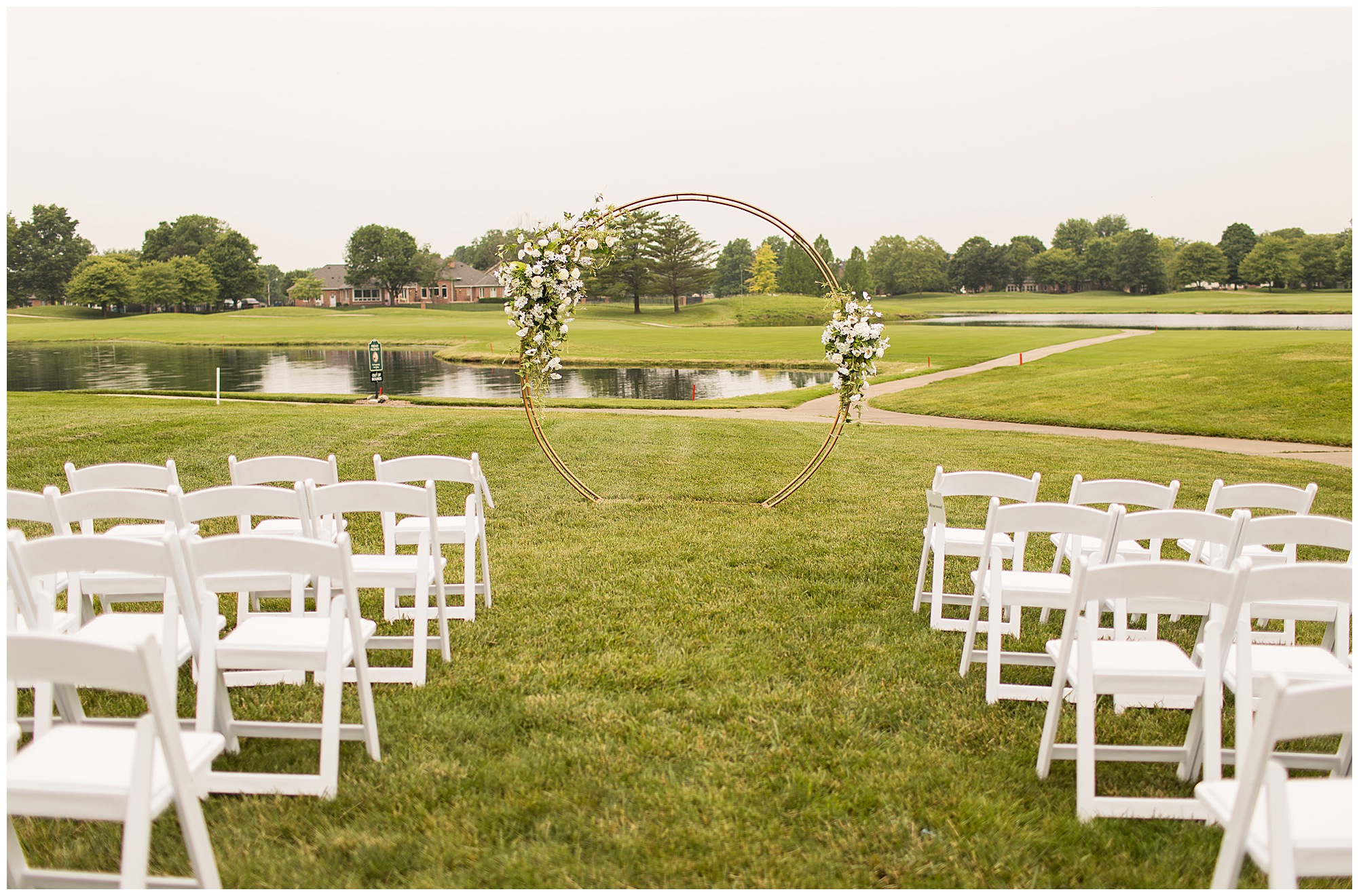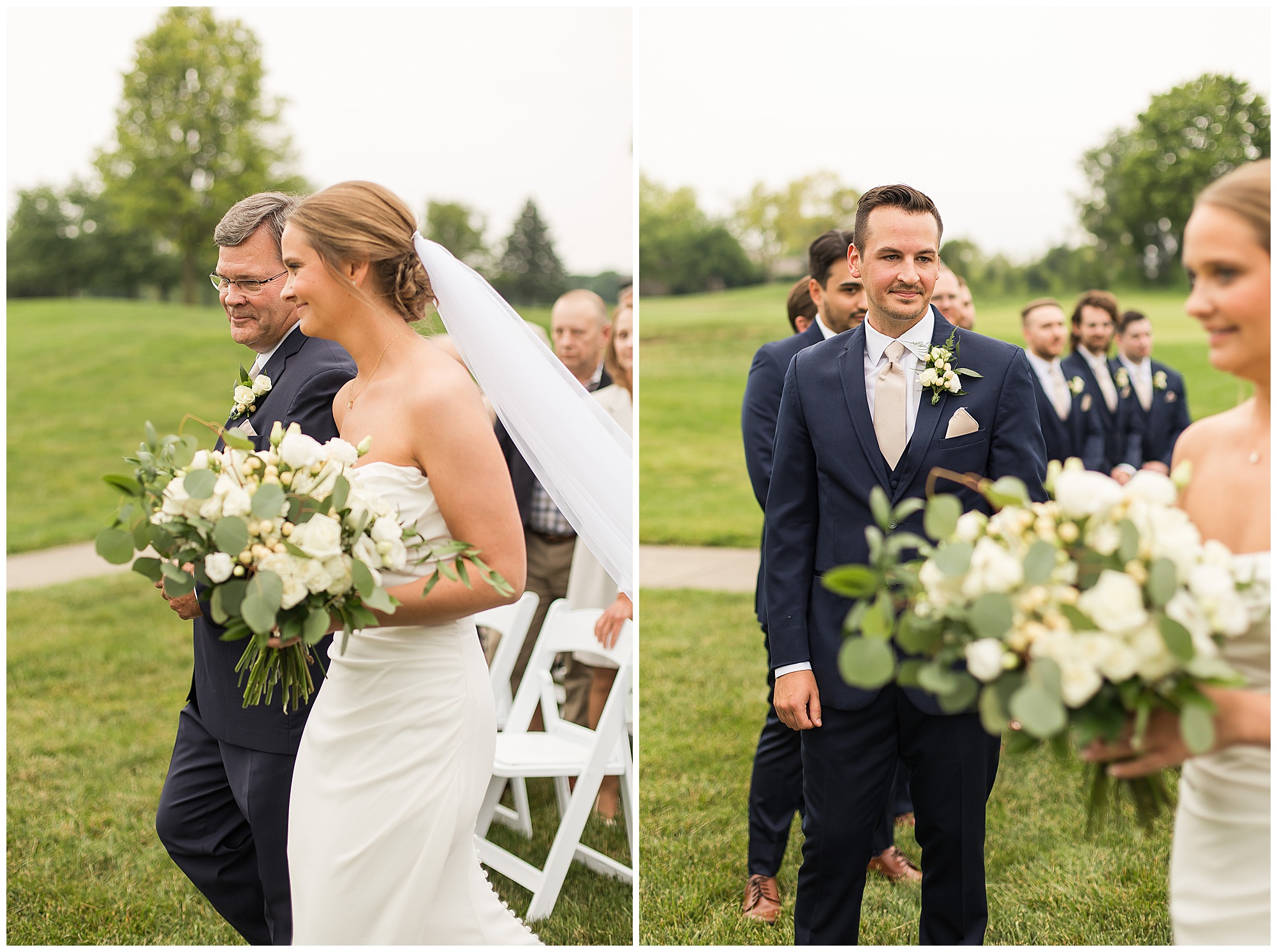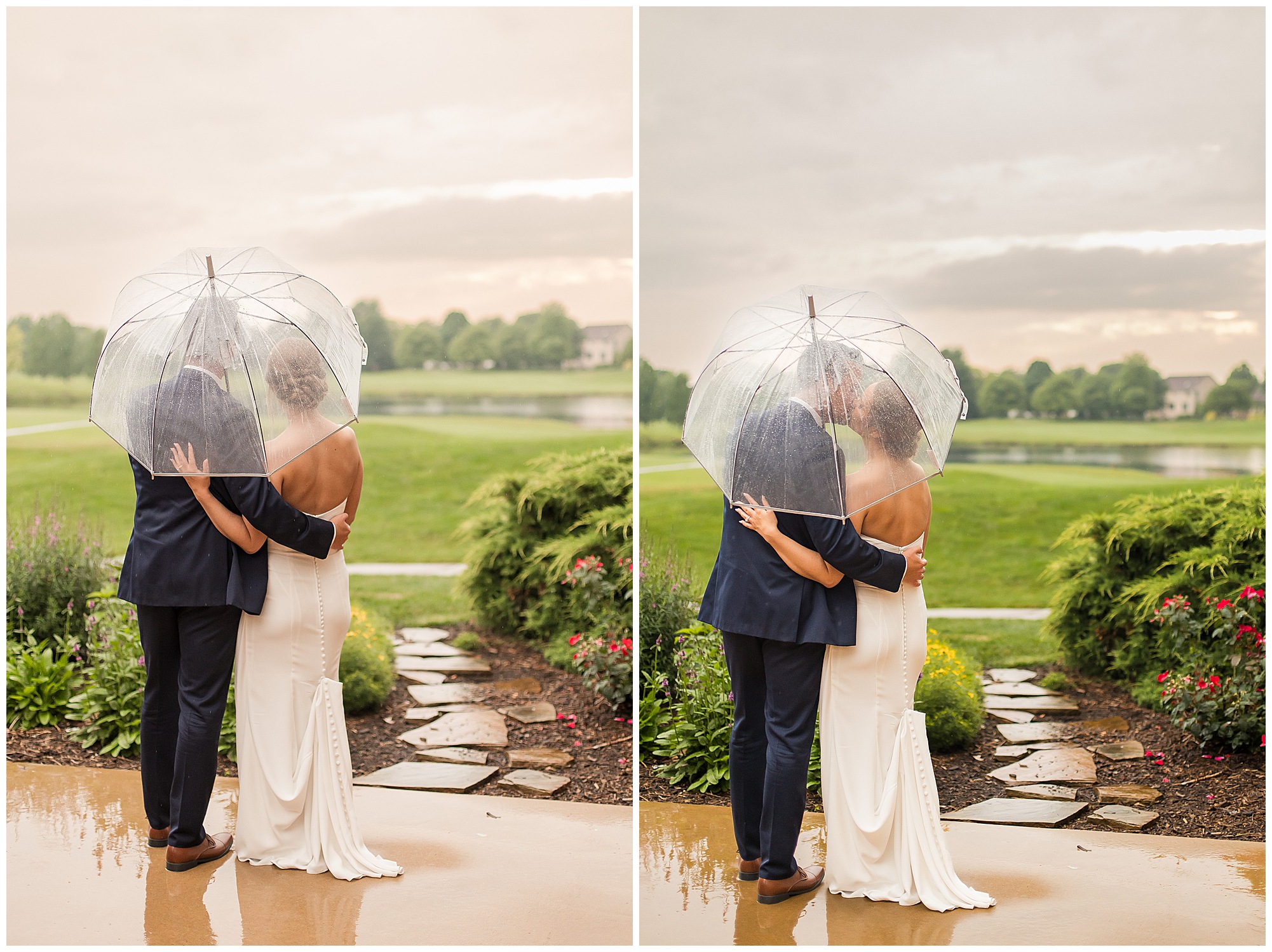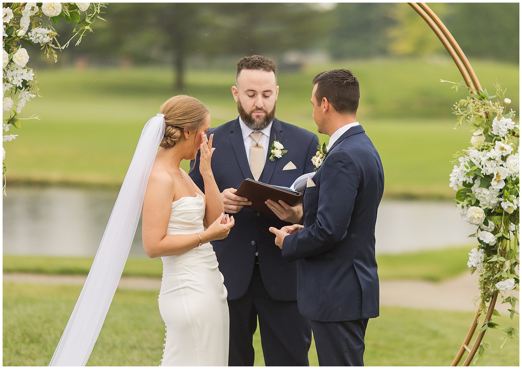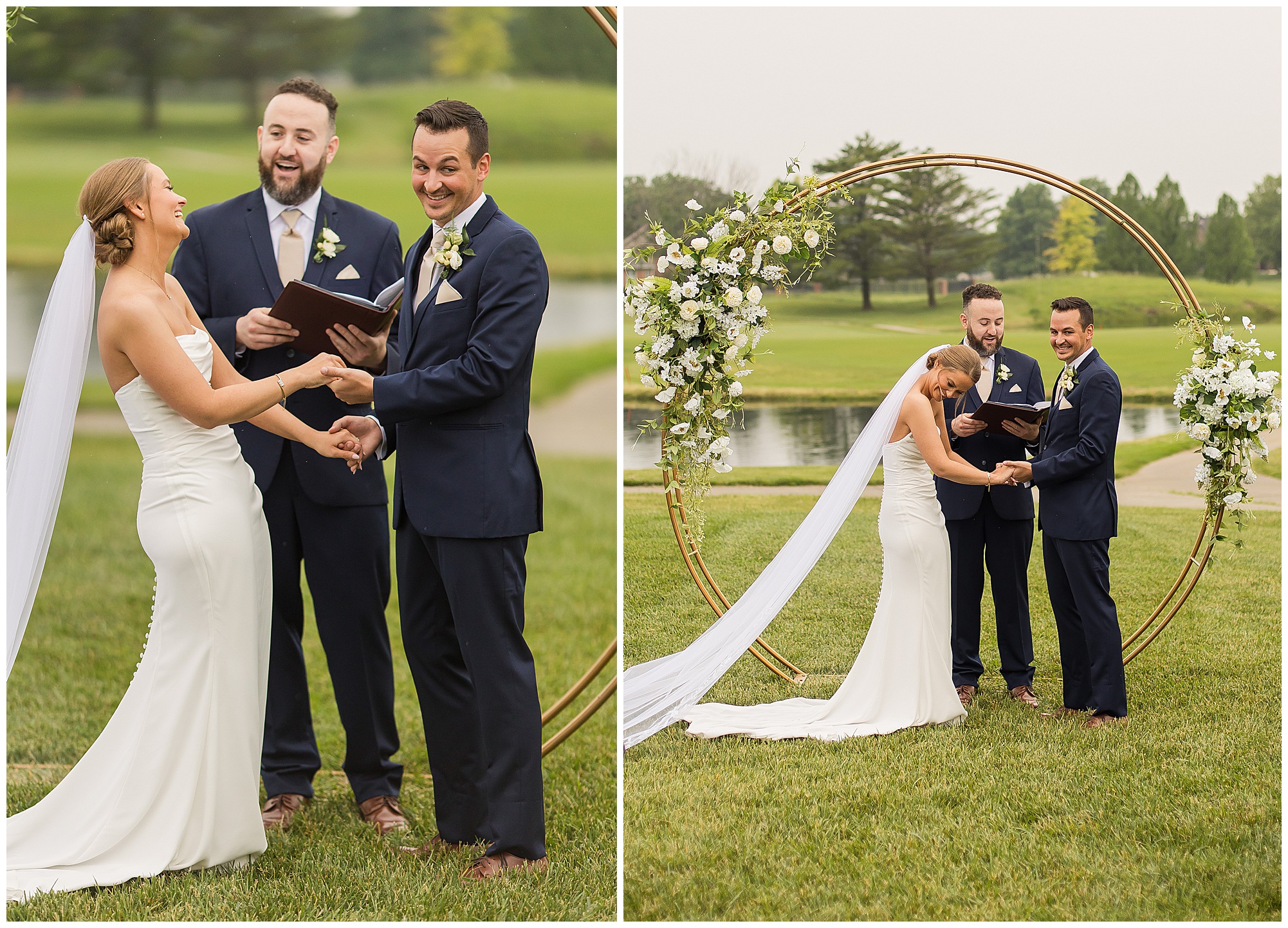 Leading up to the ceremony time, everyone’s eyes were on the radar. The ceremony was originally planned to be outside overlooking the golf course. However, with a few sprinkles and the radar showing that right around Katie and Scott’s “I Do’s” there could be rain, this couple had a hard decision to make. Yet, Katie’s brother, David asked them, “Which decision felt better…Getting married outside like you planned the entire time? Or inside in the basement? And how would you feel if after all this worry about rain…It didn’t rain at all?” After posing those questions to them in that light…It seemed like an easier decision to the duo and they decided to go for it and have their ceremony outside. Just as it was time for Katie to walk down the aisle, the few sprinkles that were falling…let up. The setting was elegant and exactly right for Katie and Scott as they shared their vows, exchanged rings, and sealed it with a kiss. Introducing Mr. & Mrs. Egolf! Then within seconds of the newlyweds walking back up the aisle together as husband and wife…The sky opened up and the rain began to pour! So it held off just for them!