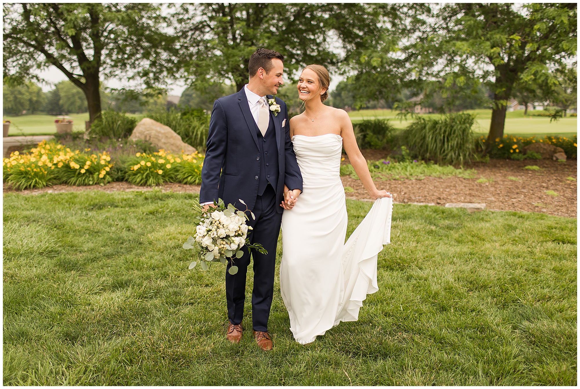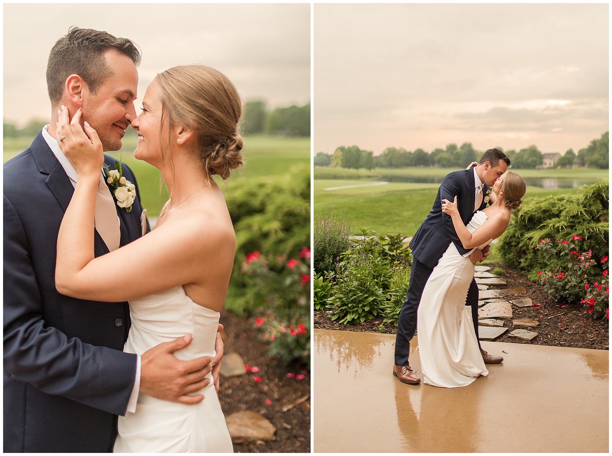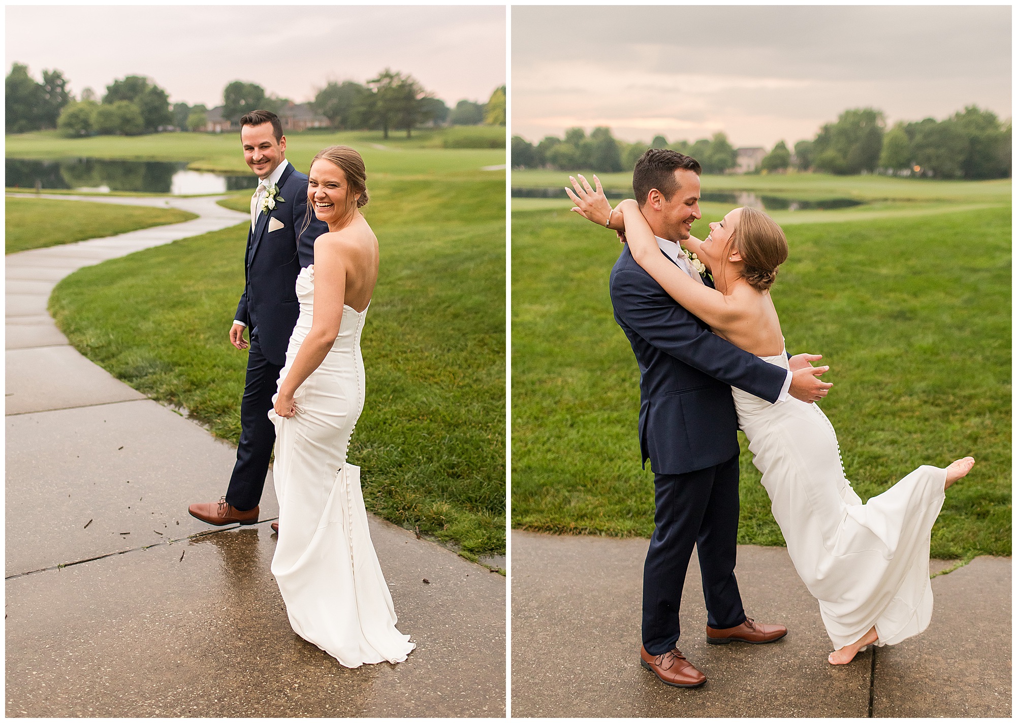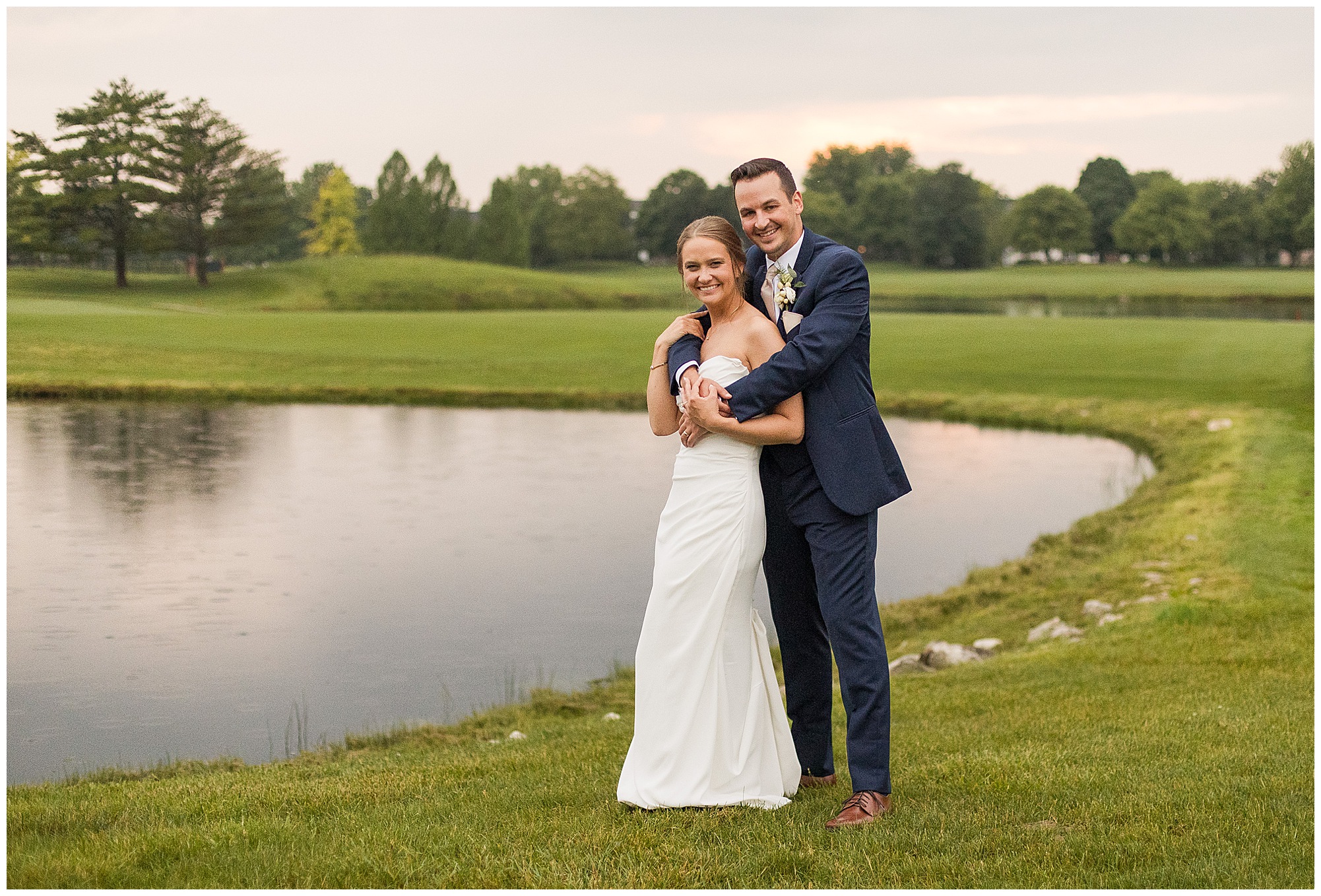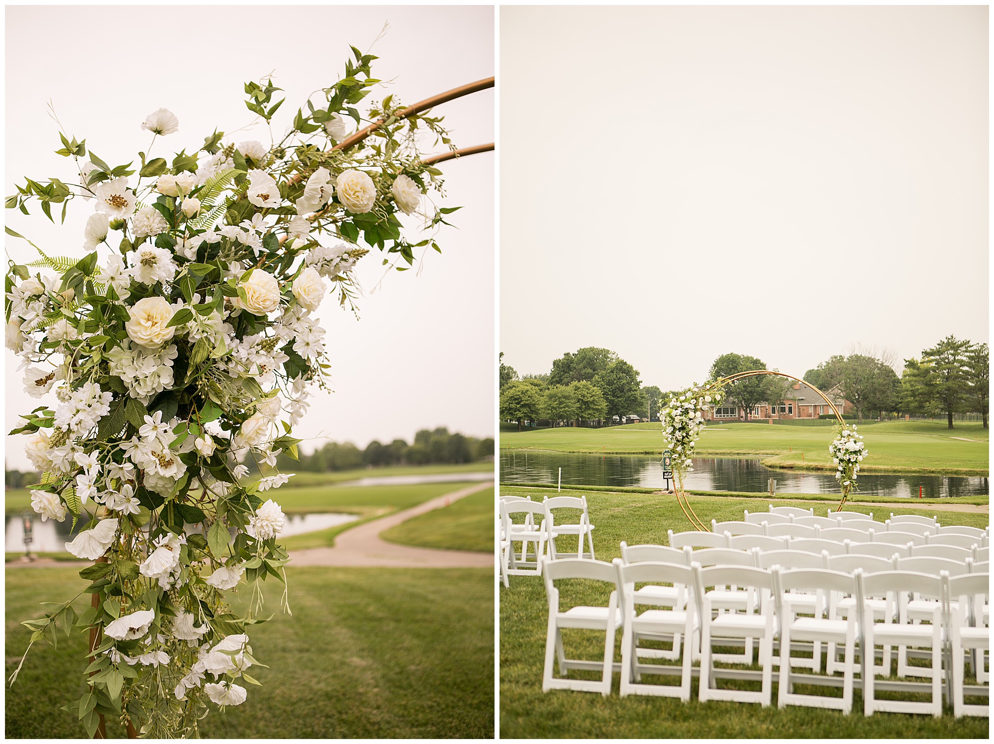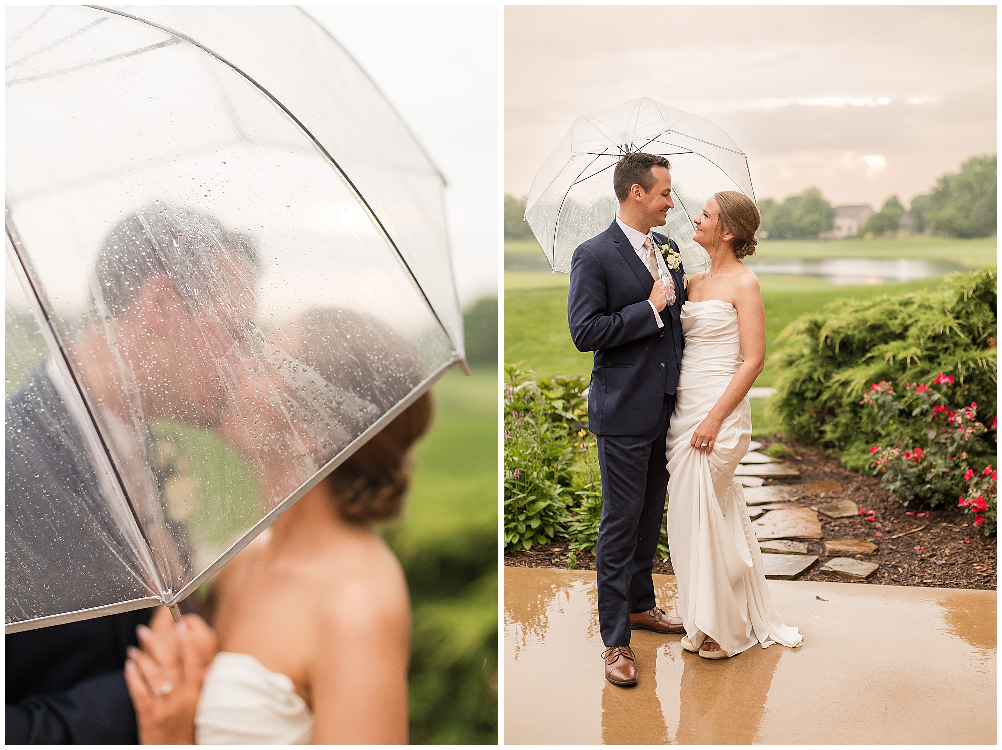 Leading up to the ceremony time, everyone’s eyes were on the radar. The ceremony was originally planned to be outside overlooking the golf course. However, with a few sprinkles and the radar showing that right around Katie and Scott’s “I Do’s” there could be rain, this couple had a hard decision to make. Yet, Katie’s brother, David asked them, “Which decision felt better…Getting married outside like you planned the entire time? Or inside in the basement? And how would you feel if after all this worry about rain…It didn’t rain at all?” After posing those questions to them in that light…It seemed like an easier decision to the duo and they decided to go for it and have their ceremony outside. Just as it was time for Katie to walk down the aisle, the few sprinkles that were falling…let up. The setting was elegant and exactly right for Katie and Scott as they shared their vows, exchanged rings, and sealed it with a kiss. Introducing Mr. & Mrs. Egolf! Then within seconds of the newlyweds walking back up the aisle together as husband and wife…The sky opened up and the rain began to pour! So it held off just for them!