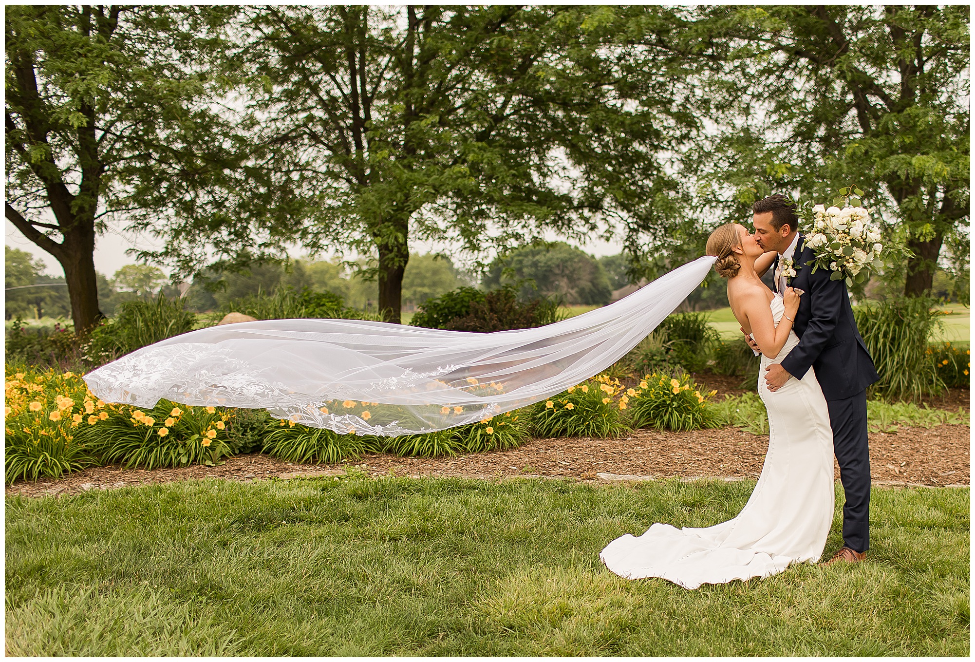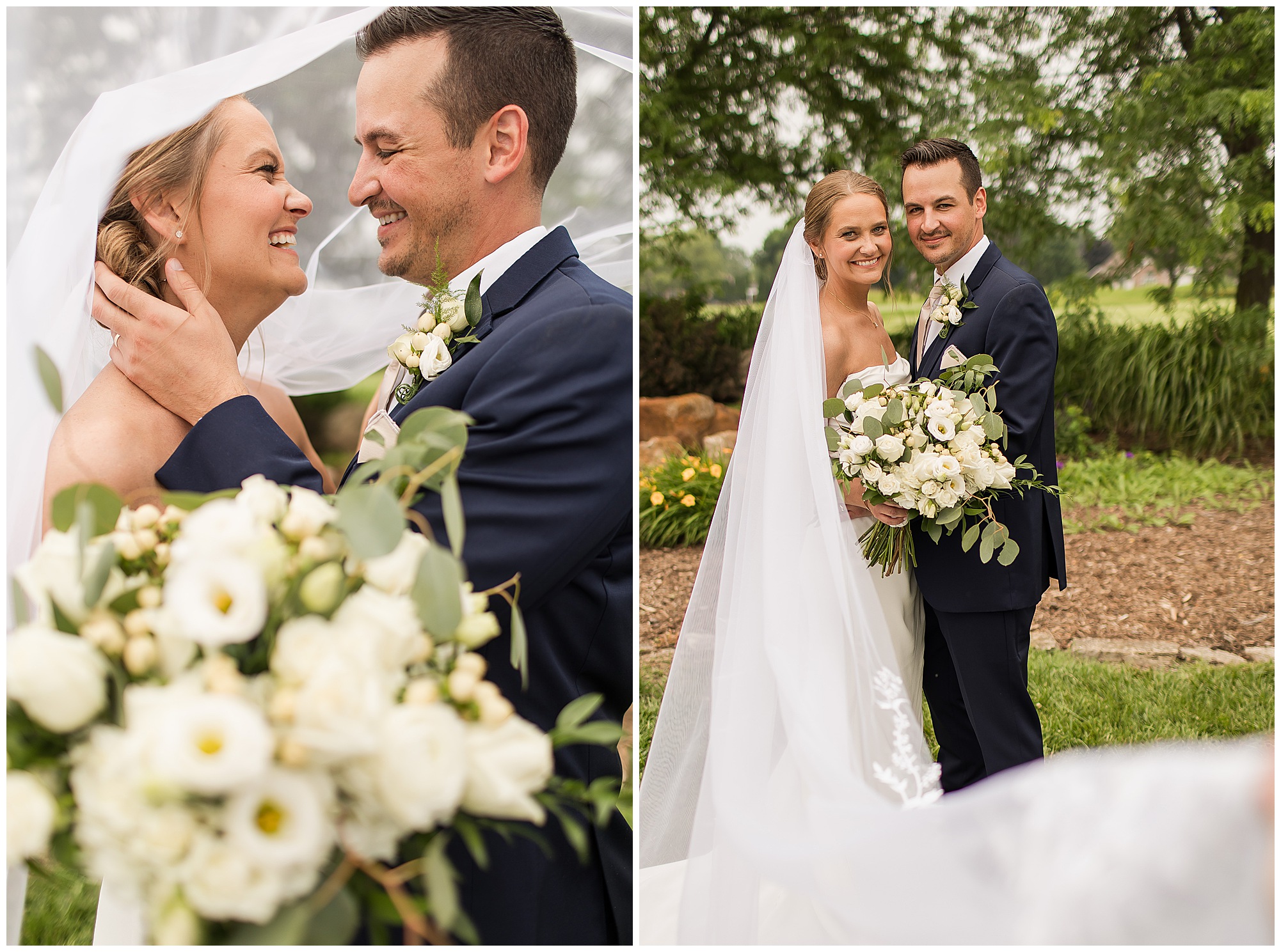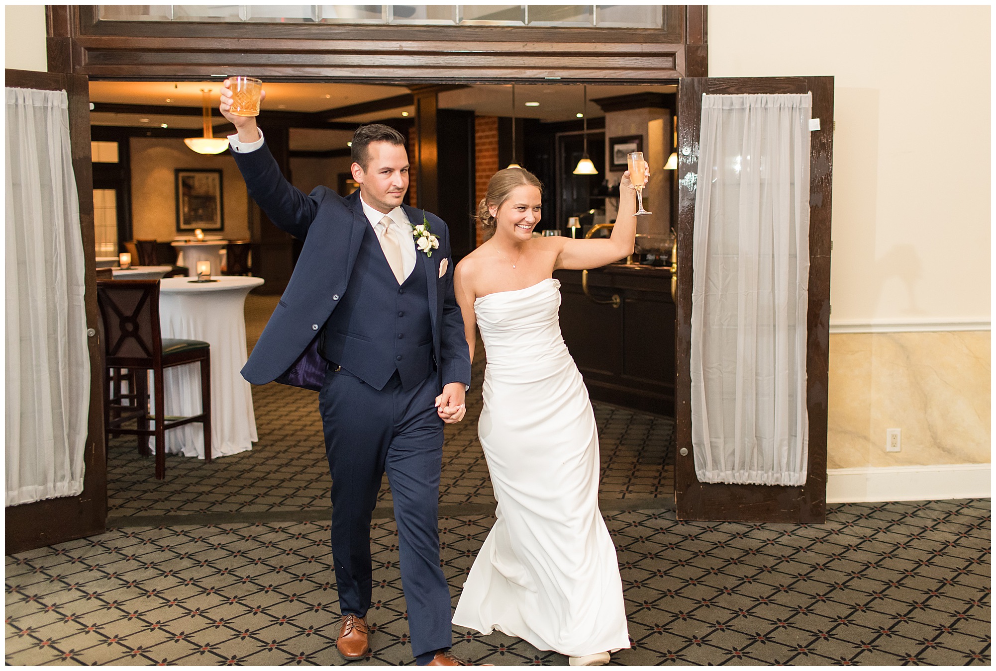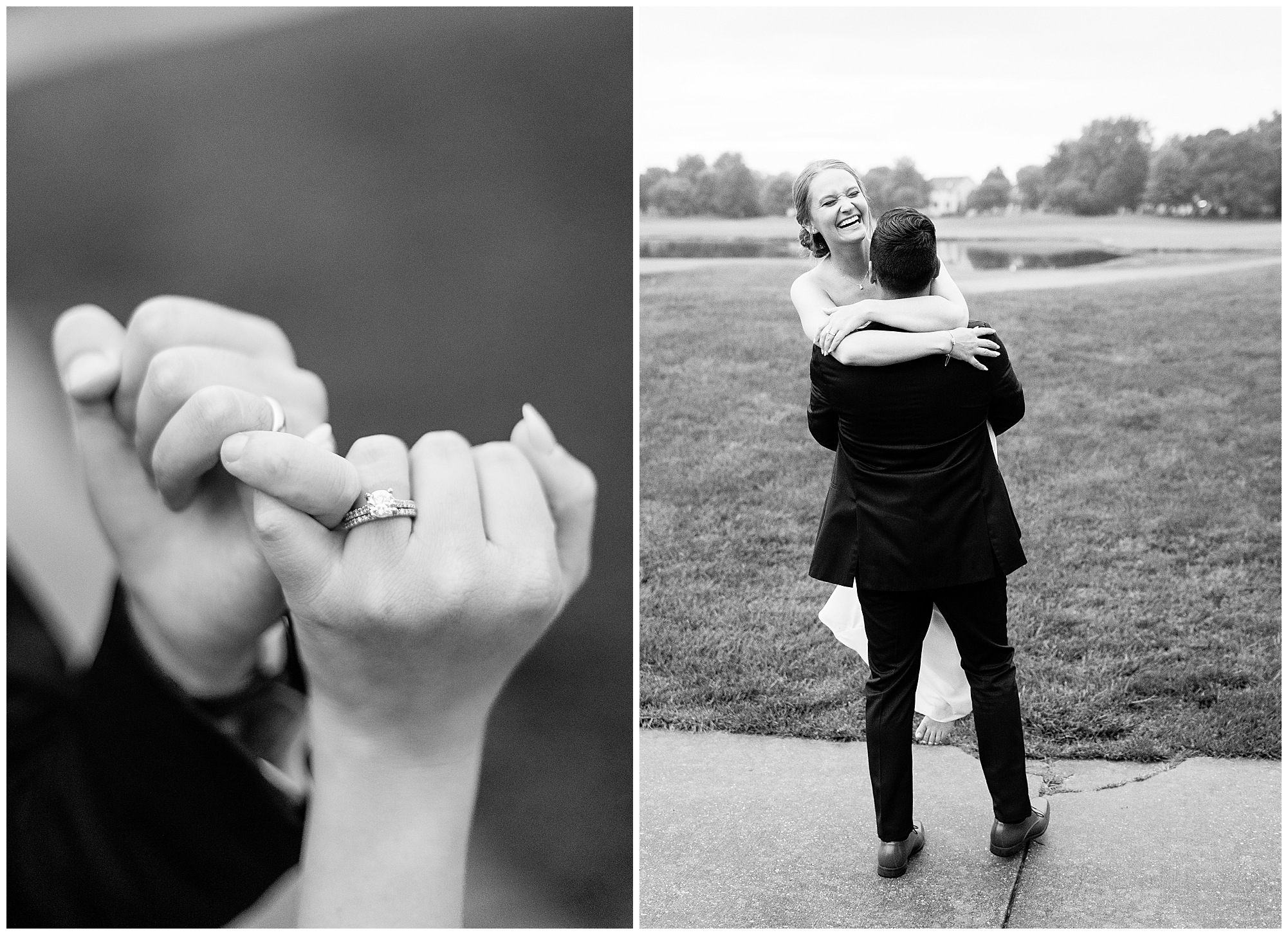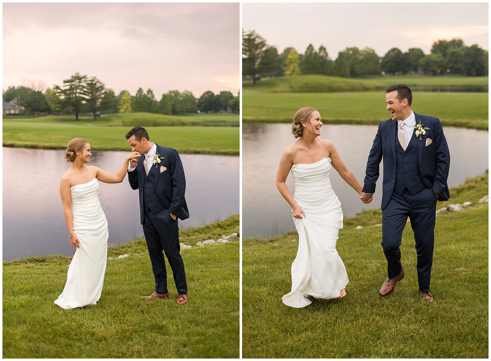 Leading up to the ceremony time, everyone’s eyes were on the radar. The ceremony was originally planned to be outside overlooking the golf course. However, with a few sprinkles and the radar showing that right around Katie and Scott’s “I Do’s” there could be rain, this couple had a hard decision to make. Yet, Katie’s brother, David asked them, “Which decision felt better…Getting married outside like you planned the entire time? Or inside in the basement? And how would you feel if after all this worry about rain…It didn’t rain at all?” After posing those questions to them in that light…It seemed like an easier decision to the duo and they decided to go for it and have their ceremony outside. Just as it was time for Katie to walk down the aisle, the few sprinkles that were falling…let up. The setting was elegant and exactly right for Katie and Scott as they shared their vows, exchanged rings, and sealed it with a kiss. Introducing Mr. & Mrs. Egolf! Then within seconds of the newlyweds walking back up the aisle together as husband and wife…The sky opened up and the rain began to pour! So it held off just for them!