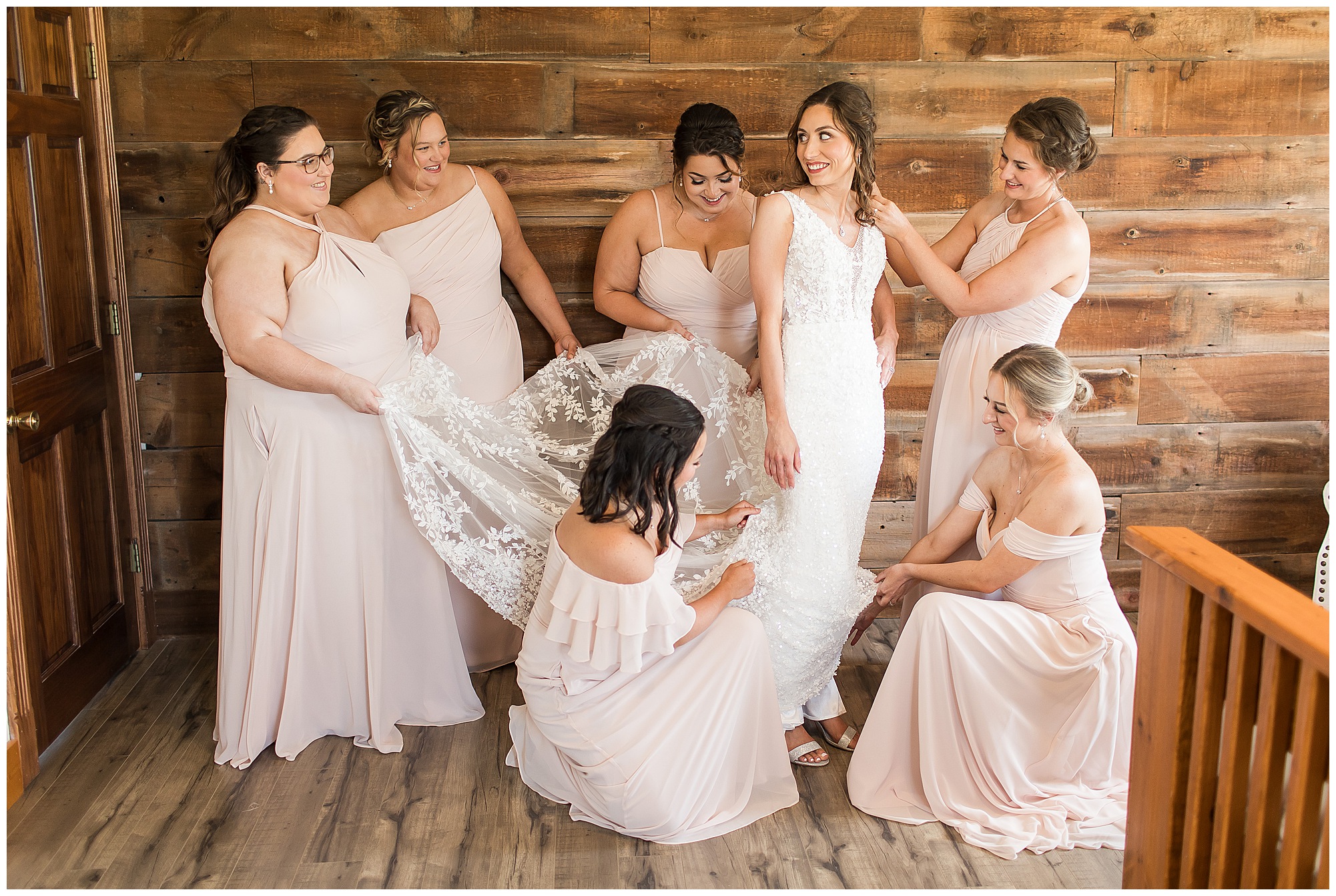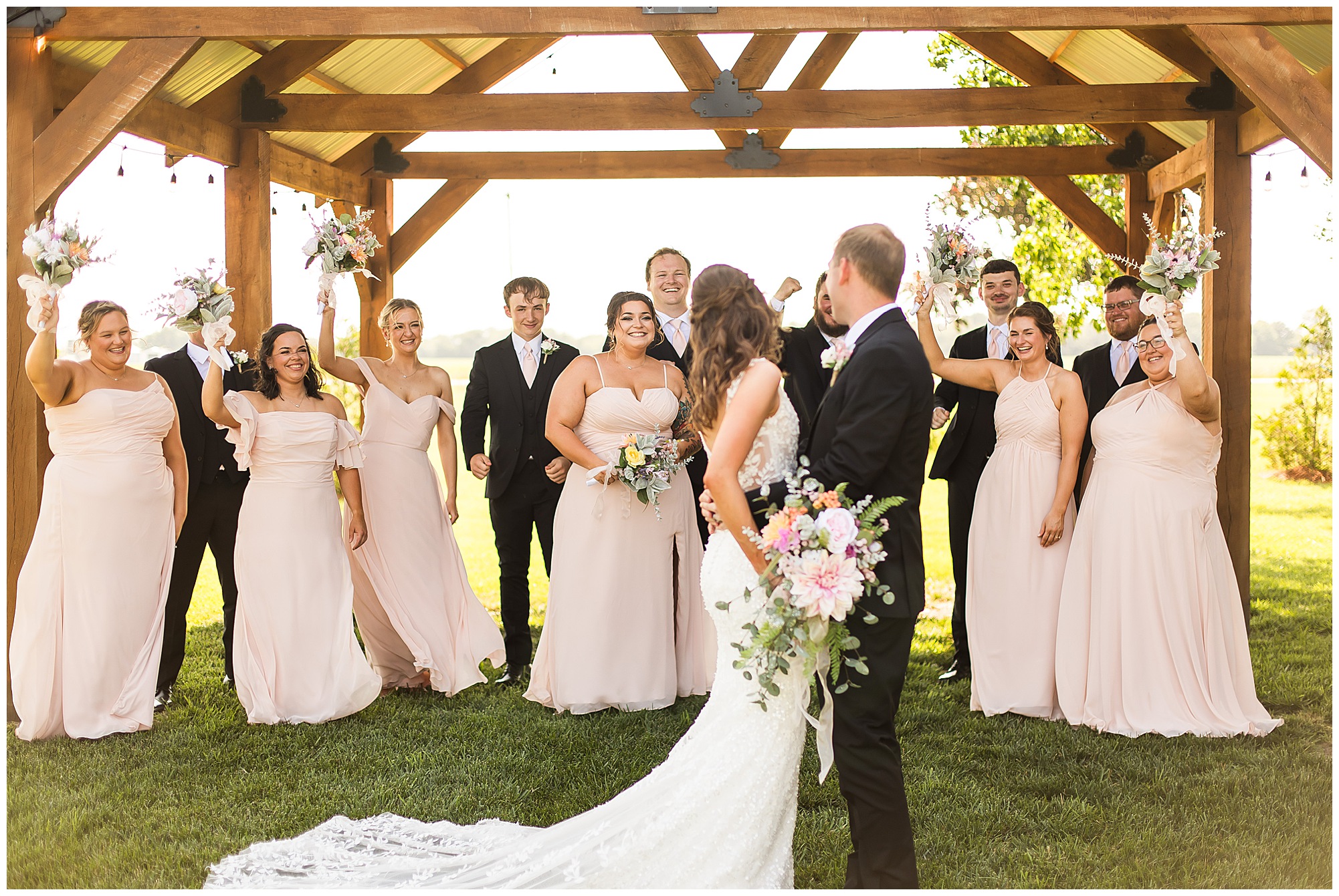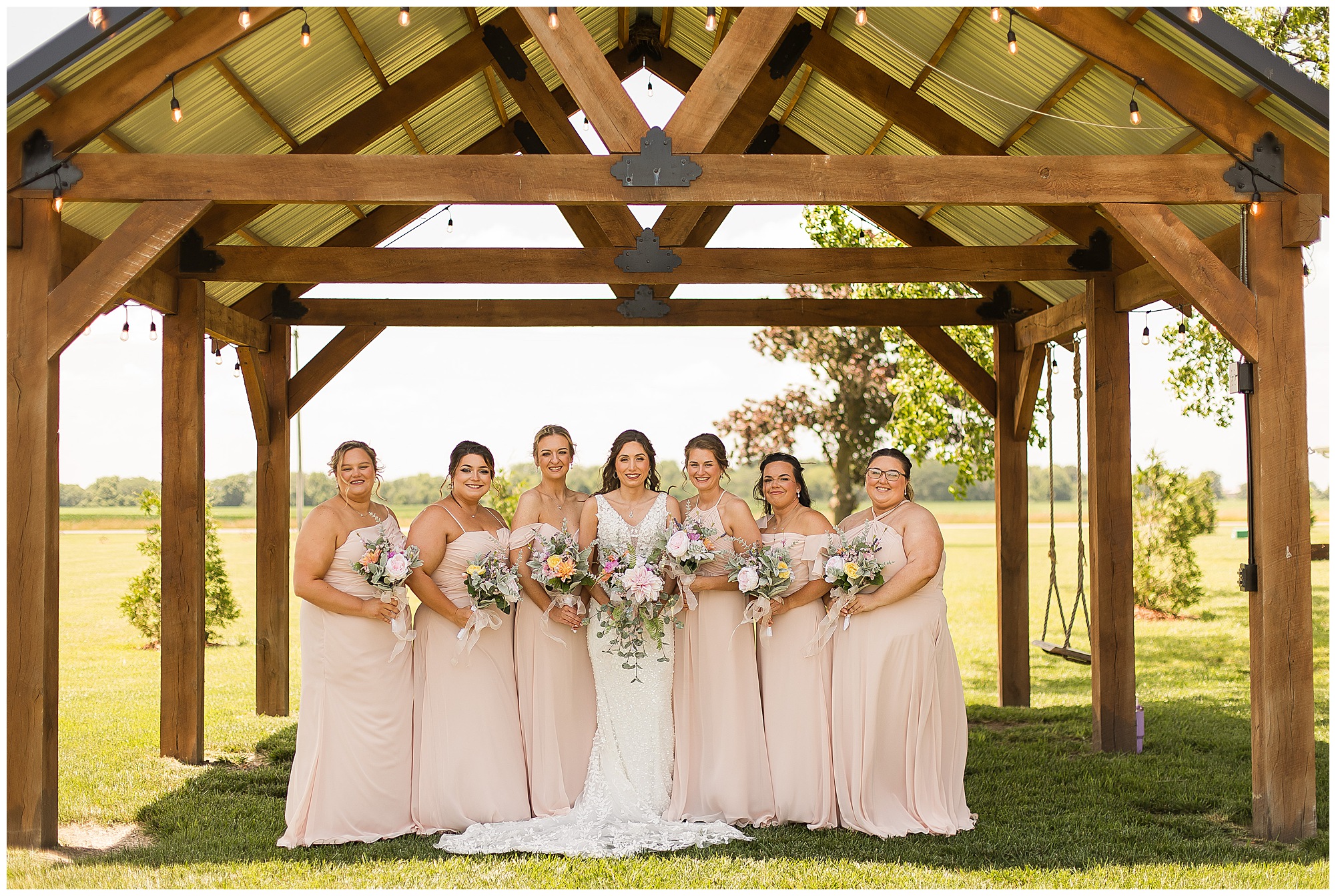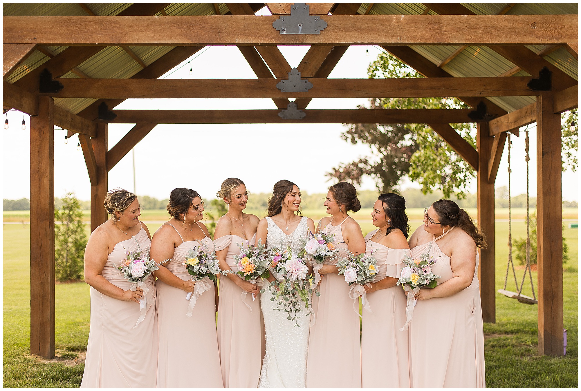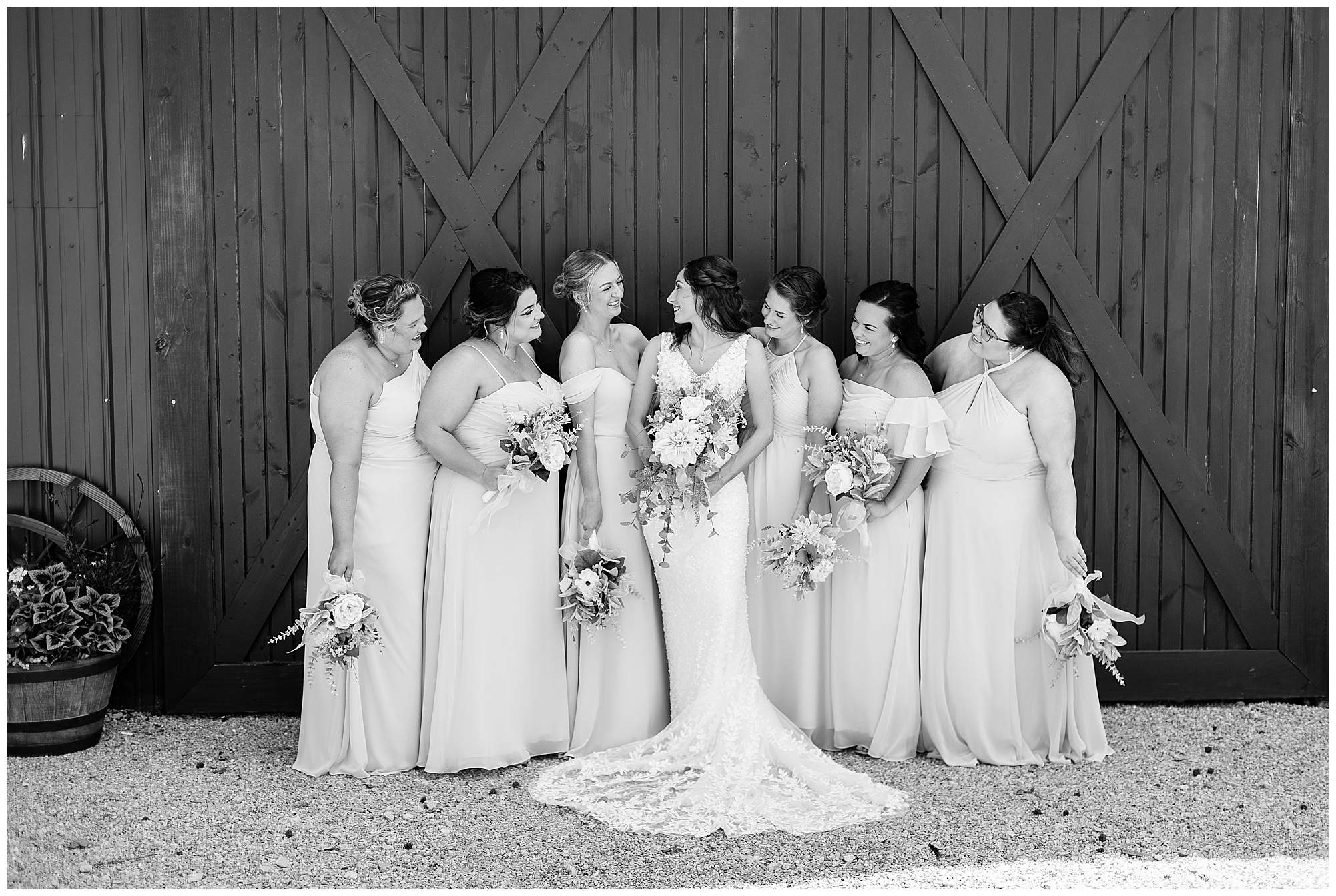 The ceremony took place inside the barn, which was such a sweet and cozy setting. When Kevin saw Nicole for the first time, it was one of those moments that gives you goosebumps—the look on his face said everything. Nicole looked absolutely stunning, and the barn’s white wood tones, old church pews for guests to be seated, and soft twinkle lights added to the magic of it all. After the ceremony, we jumped into bridal party photos, and let me tell you—we had a blast! The venue has added so many fun little spots lately, which gave us tons to play with. Whether it was a tree swings, the vintage wagon, or just a pretty corner with great light, we found photo ops everywhere. And Nicole and Kevin’s bridal party came to have fun!