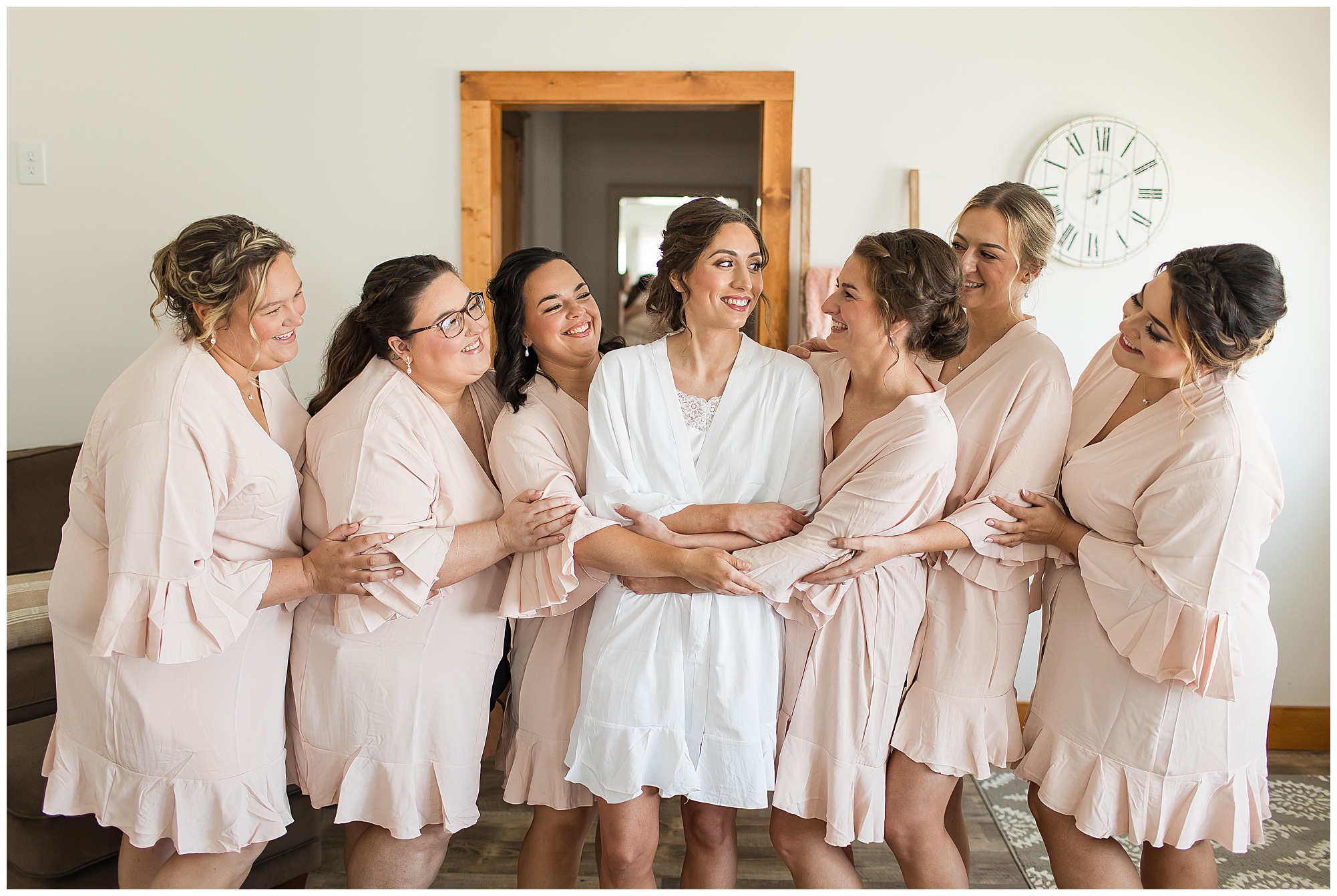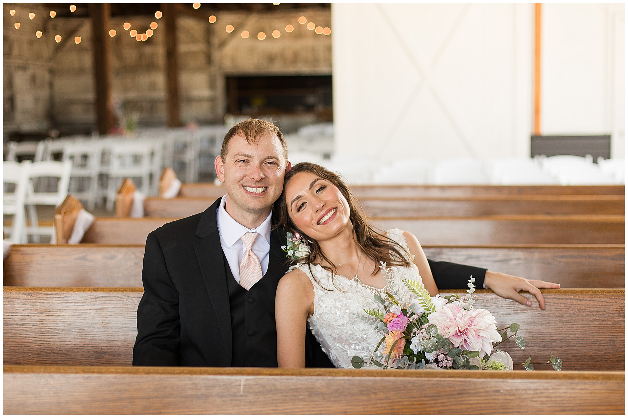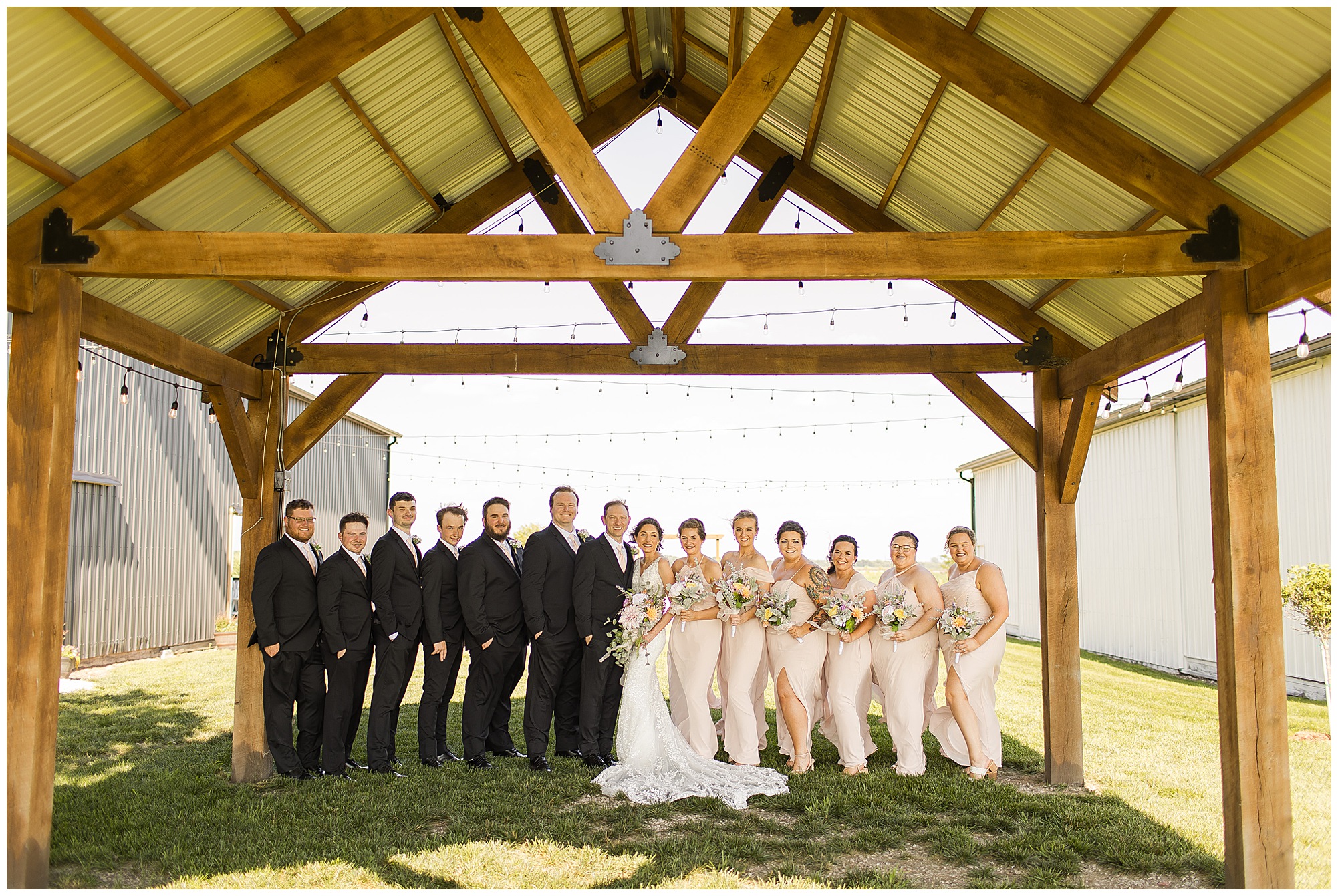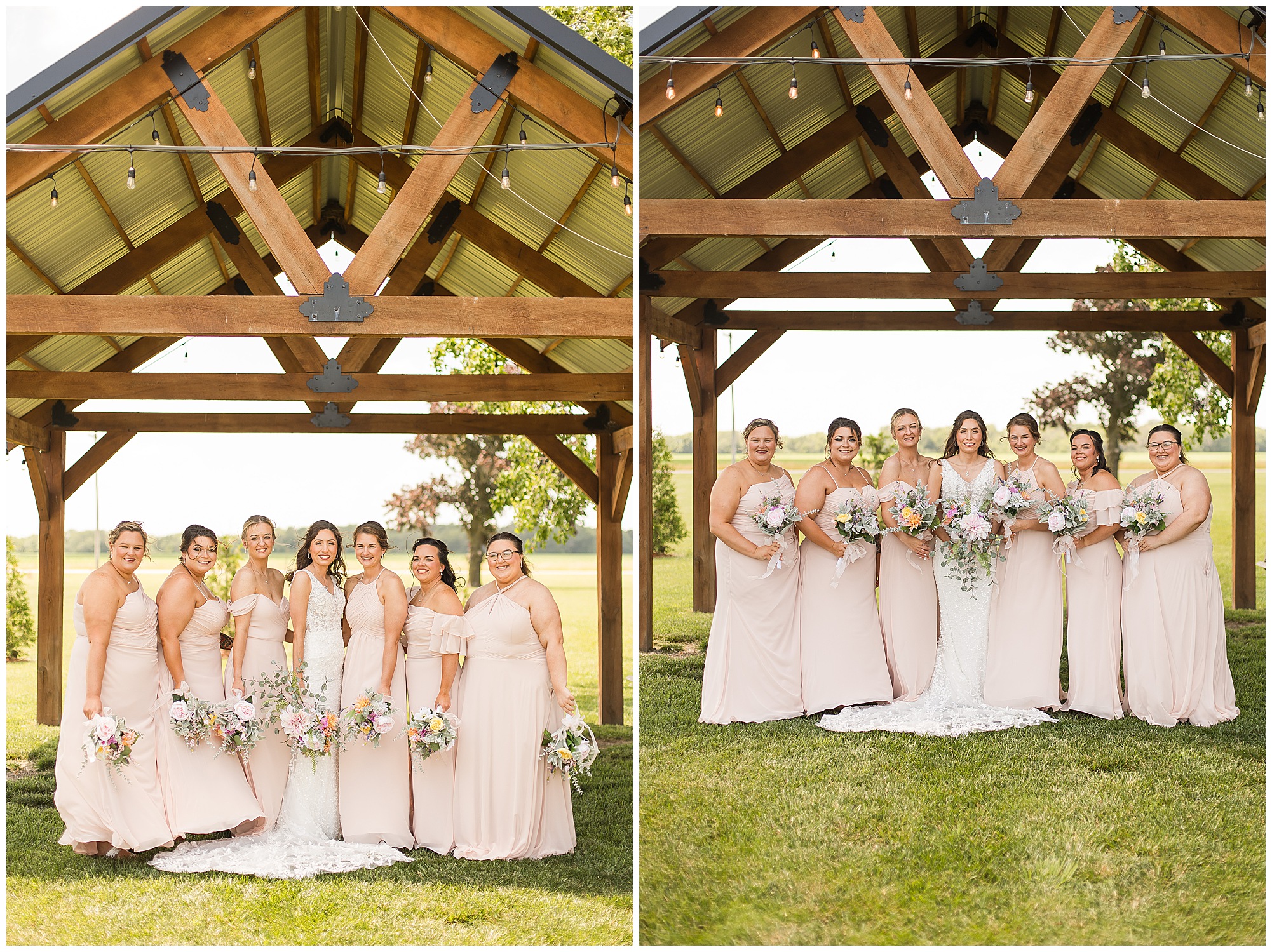 The ceremony took place inside the barn, which was such a sweet and cozy setting. When Kevin saw Nicole for the first time, it was one of those moments that gives you goosebumps—the look on his face said everything. Nicole looked absolutely stunning, and the barn’s white wood tones, old church pews for guests to be seated, and soft twinkle lights added to the magic of it all. After the ceremony, we jumped into bridal party photos, and let me tell you—we had a blast! The venue has added so many fun little spots lately, which gave us tons to play with. Whether it was a tree swings, the vintage wagon, or just a pretty corner with great light, we found photo ops everywhere. And Nicole and Kevin’s bridal party came to have fun!