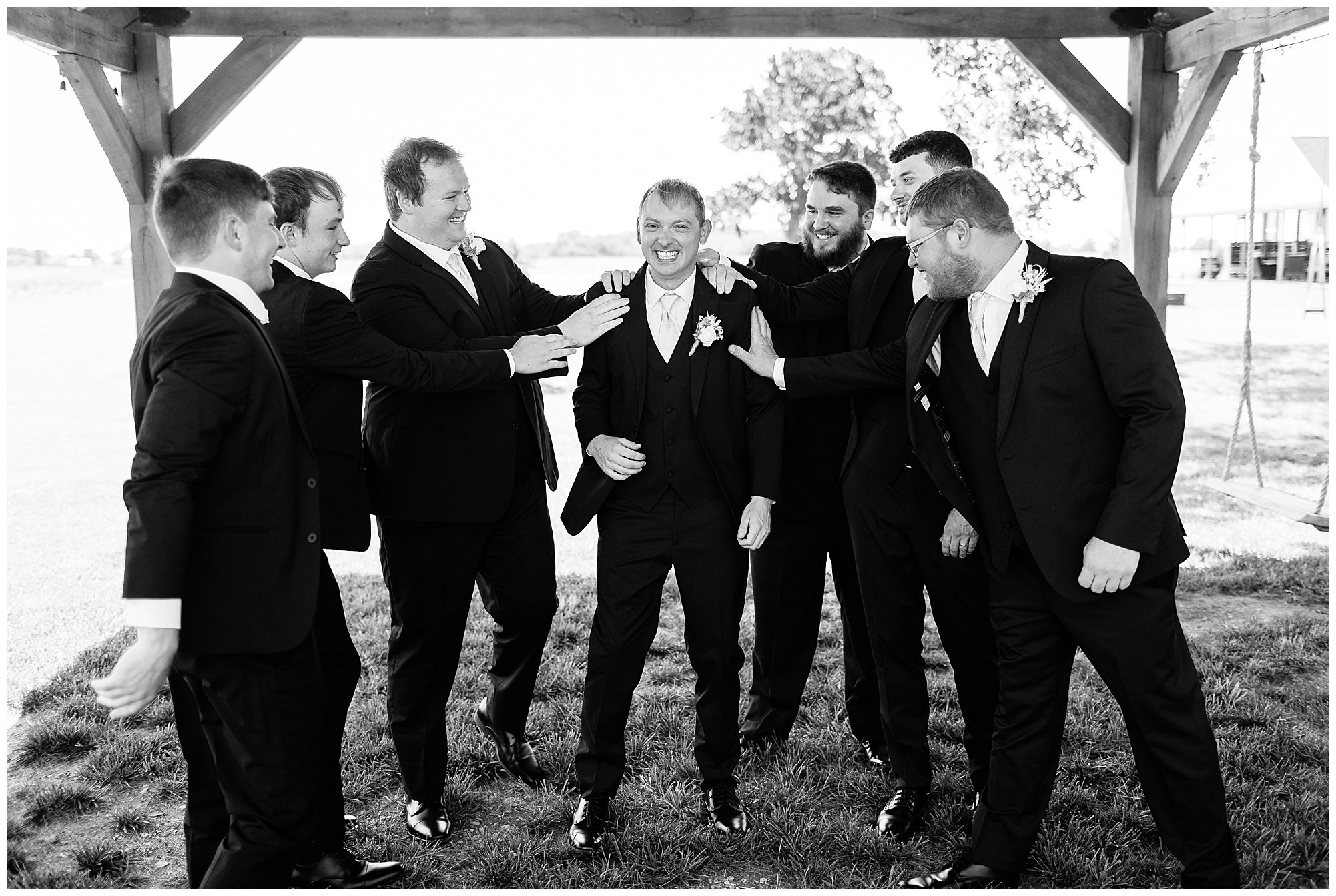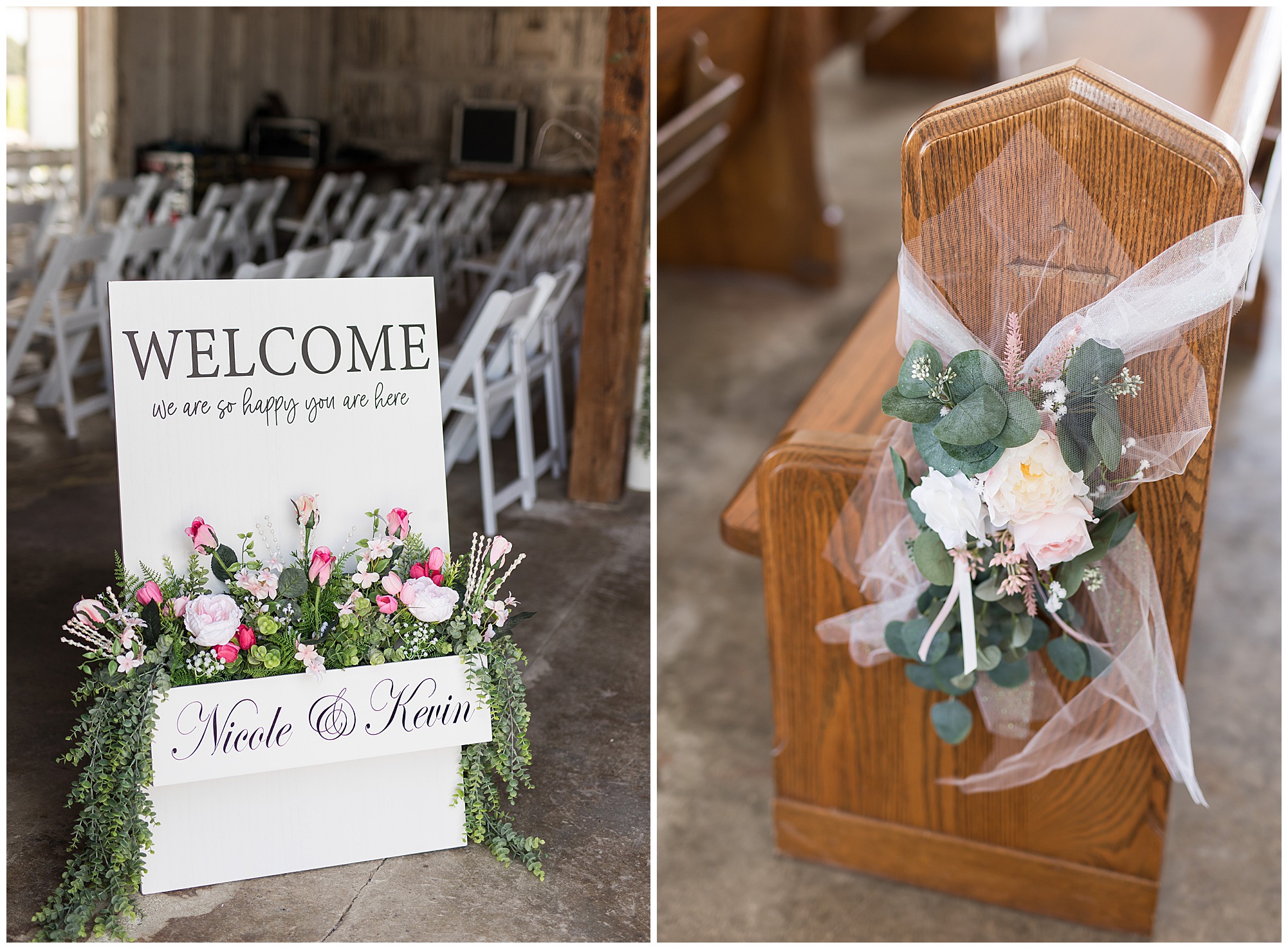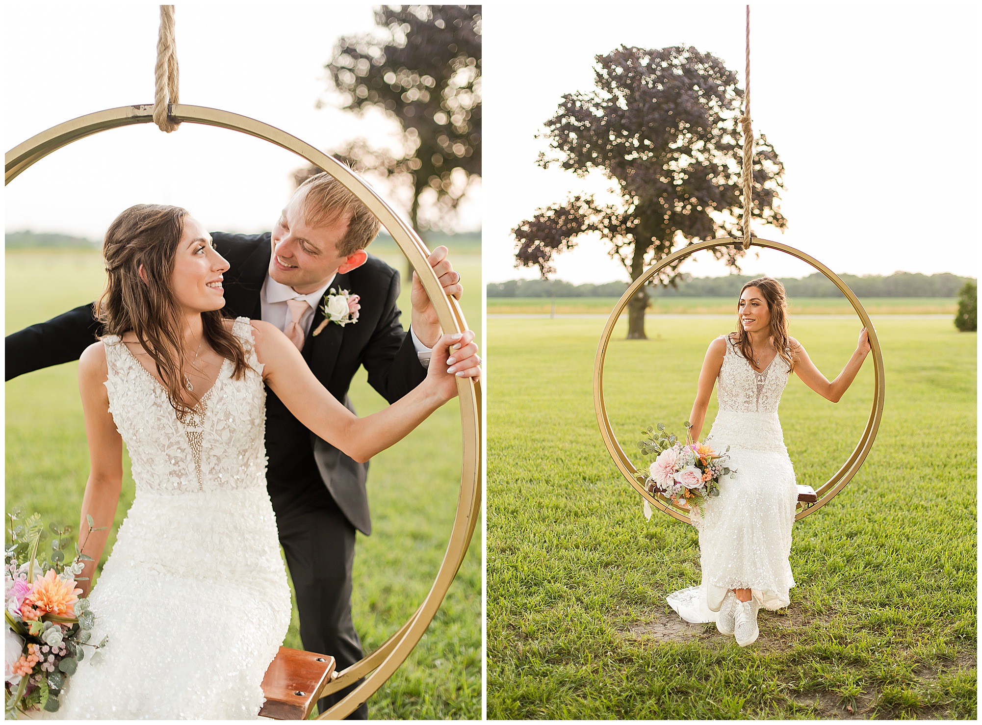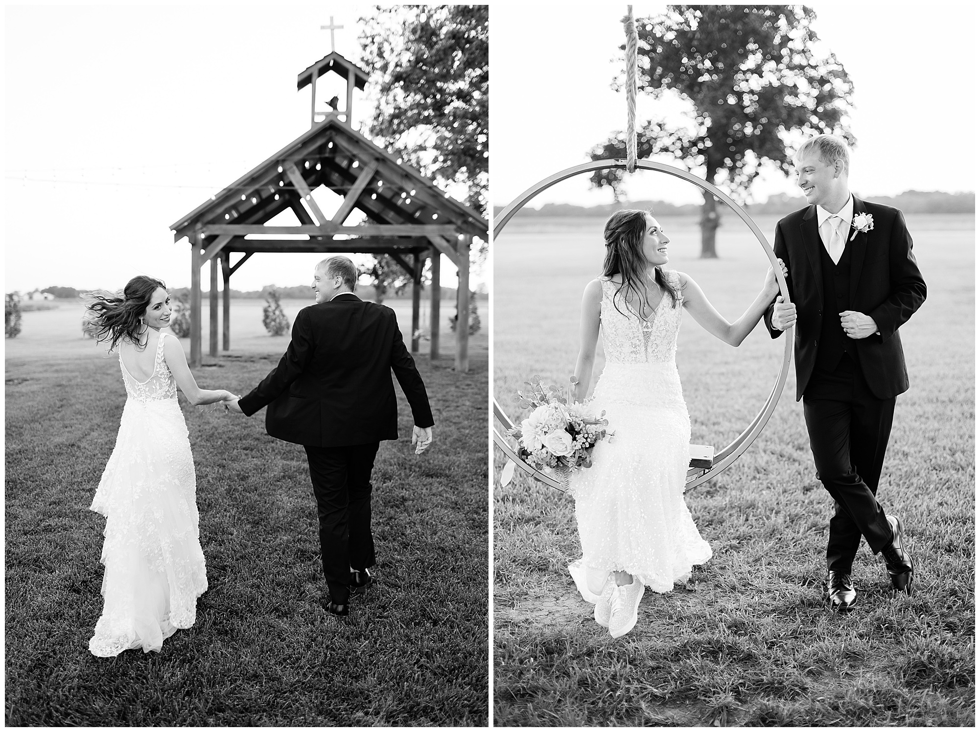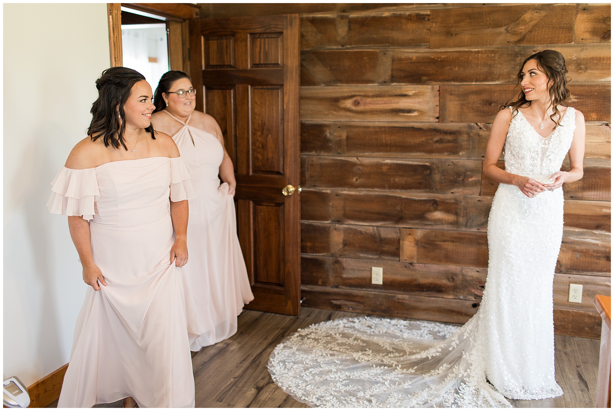 The ceremony took place inside the barn, which was such a sweet and cozy setting. When Kevin saw Nicole for the first time, it was one of those moments that gives you goosebumps—the look on his face said everything. Nicole looked absolutely stunning, and the barn’s white wood tones, old church pews for guests to be seated, and soft twinkle lights added to the magic of it all. After the ceremony, we jumped into bridal party photos, and let me tell you—we had a blast! The venue has added so many fun little spots lately, which gave us tons to play with. Whether it was a tree swings, the vintage wagon, or just a pretty corner with great light, we found photo ops everywhere. And Nicole and Kevin’s bridal party came to have fun!