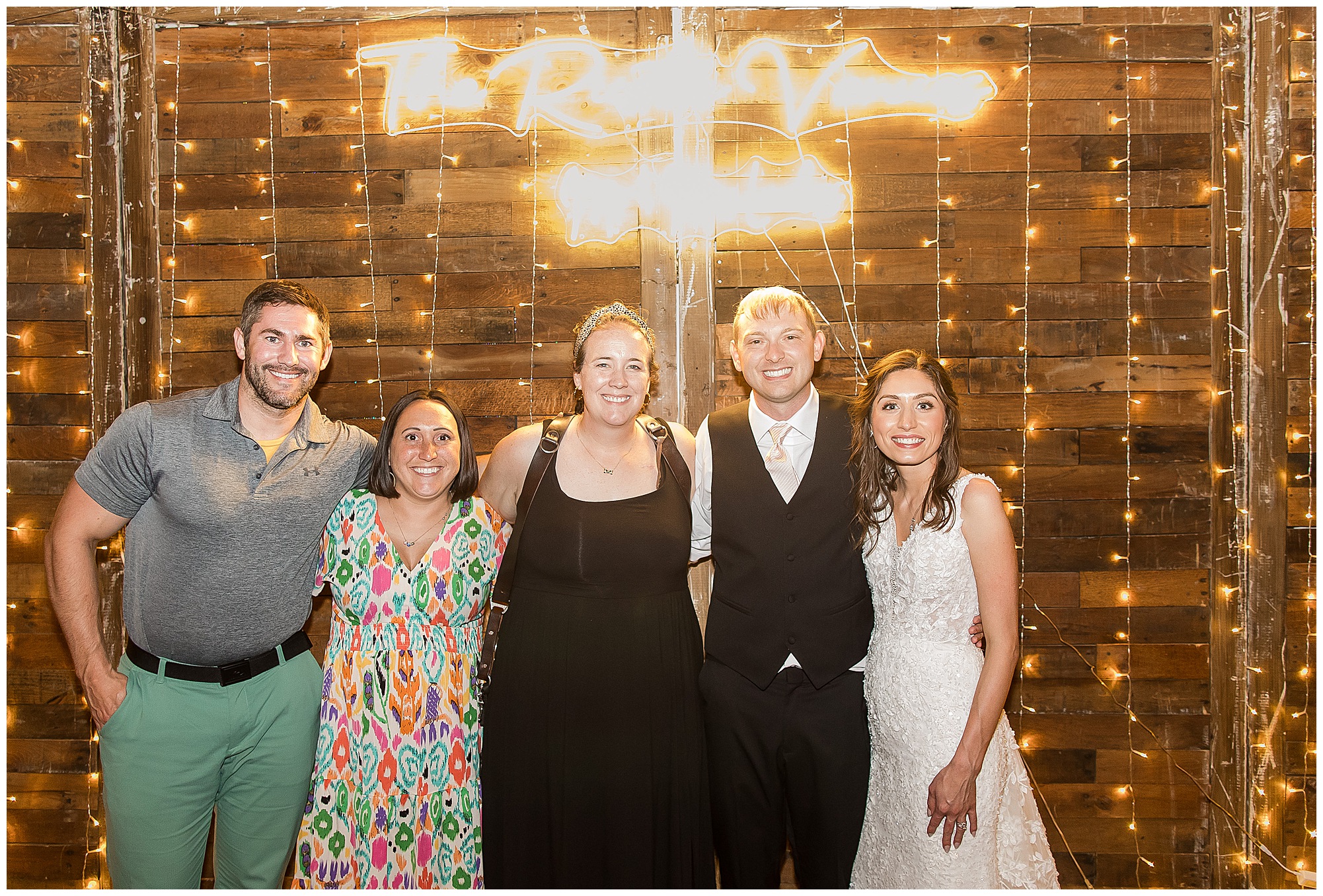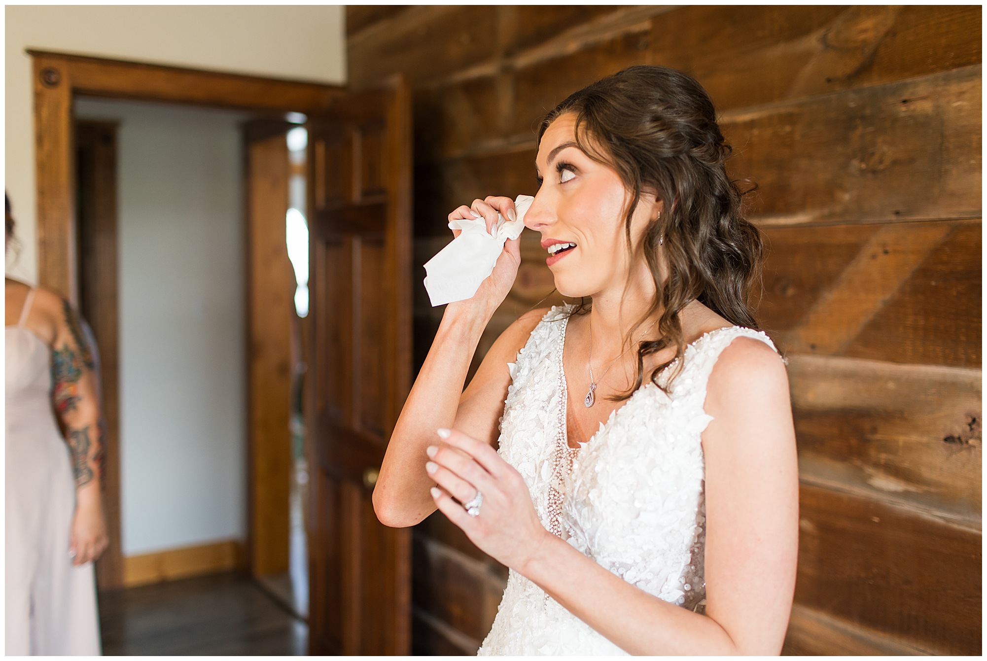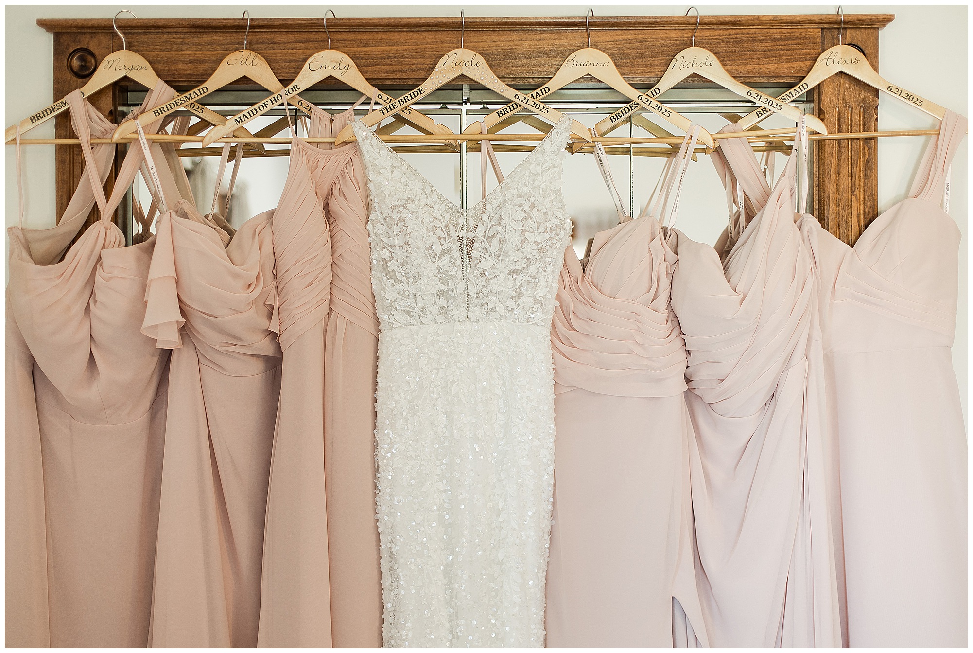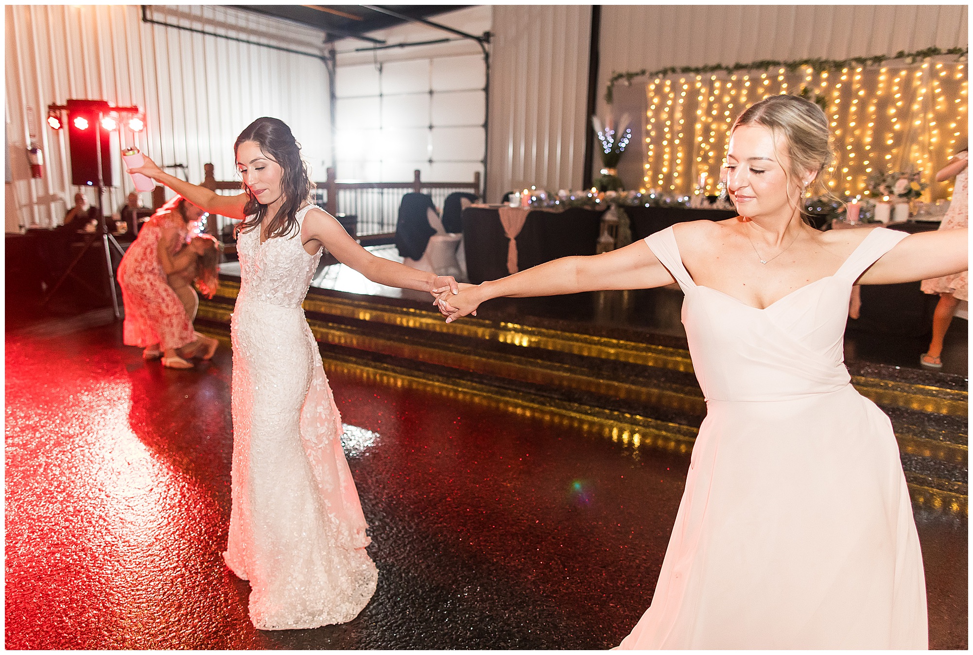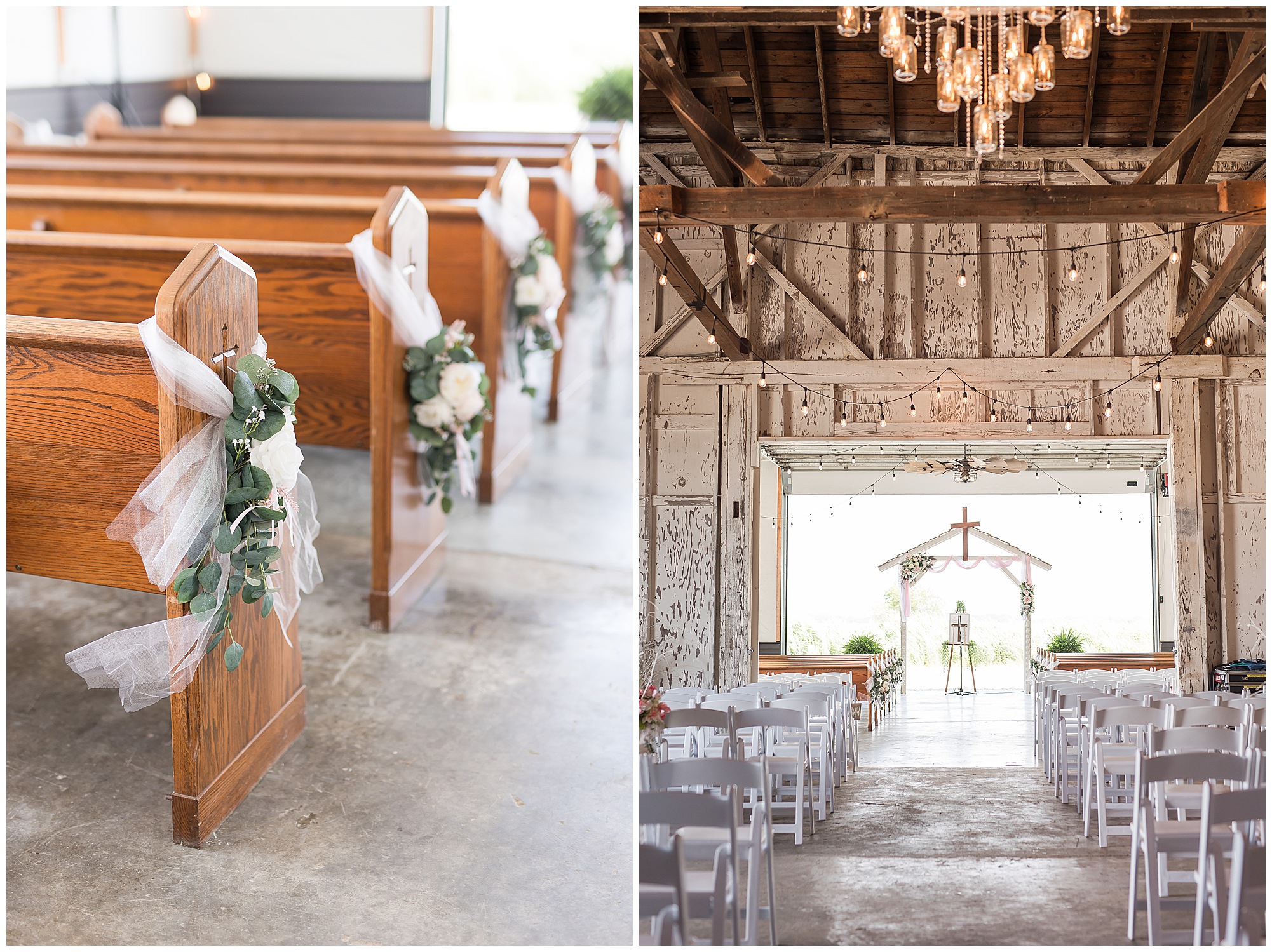 The ceremony took place inside the barn, which was such a sweet and cozy setting. When Kevin saw Nicole for the first time, it was one of those moments that gives you goosebumps—the look on his face said everything. Nicole looked absolutely stunning, and the barn’s white wood tones, old church pews for guests to be seated, and soft twinkle lights added to the magic of it all. After the ceremony, we jumped into bridal party photos, and let me tell you—we had a blast! The venue has added so many fun little spots lately, which gave us tons to play with. Whether it was a tree swings, the vintage wagon, or just a pretty corner with great light, we found photo ops everywhere. And Nicole and Kevin’s bridal party came to have fun!