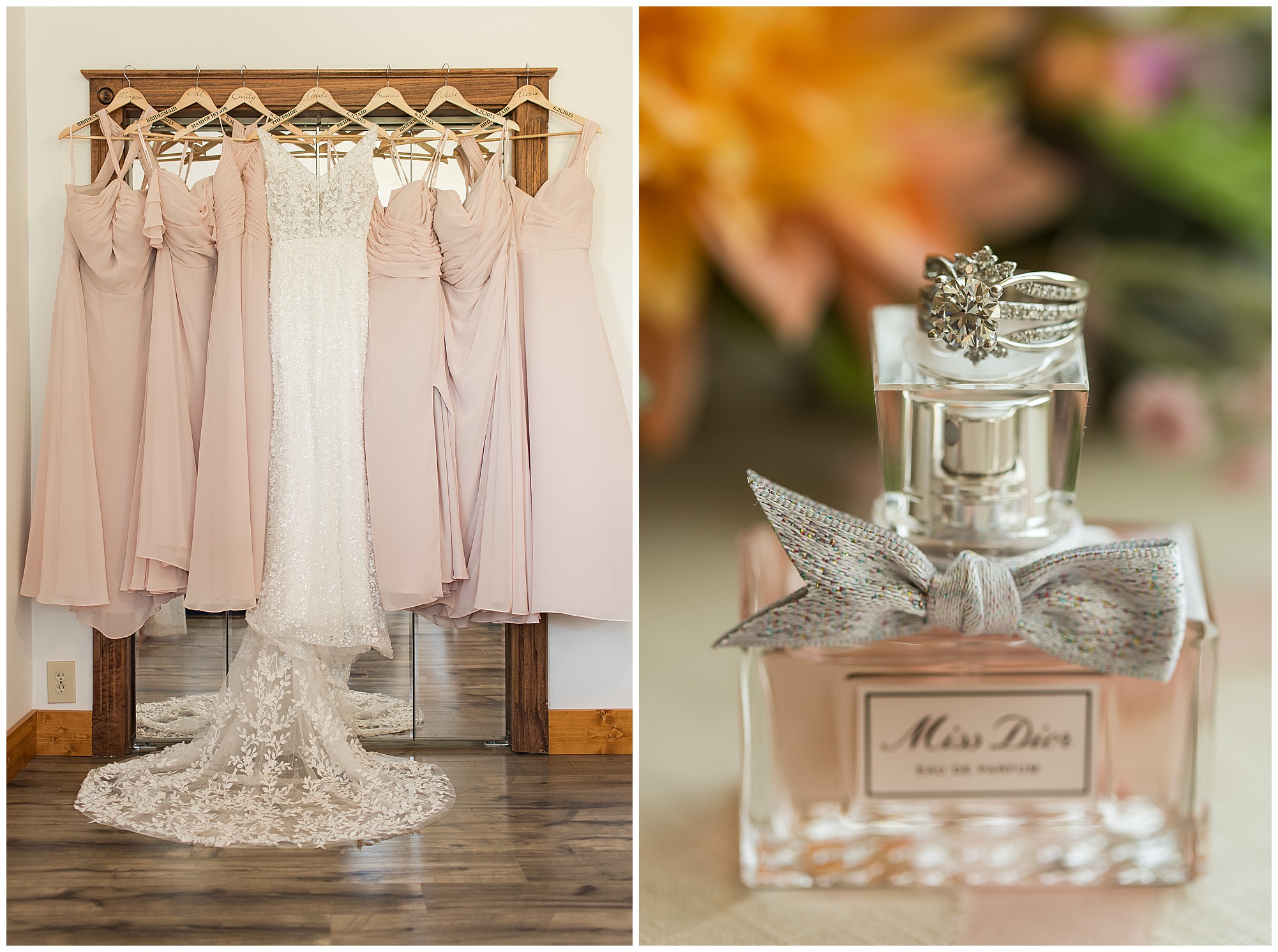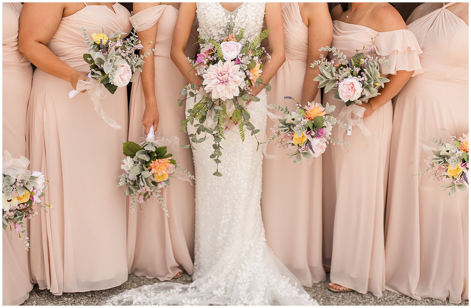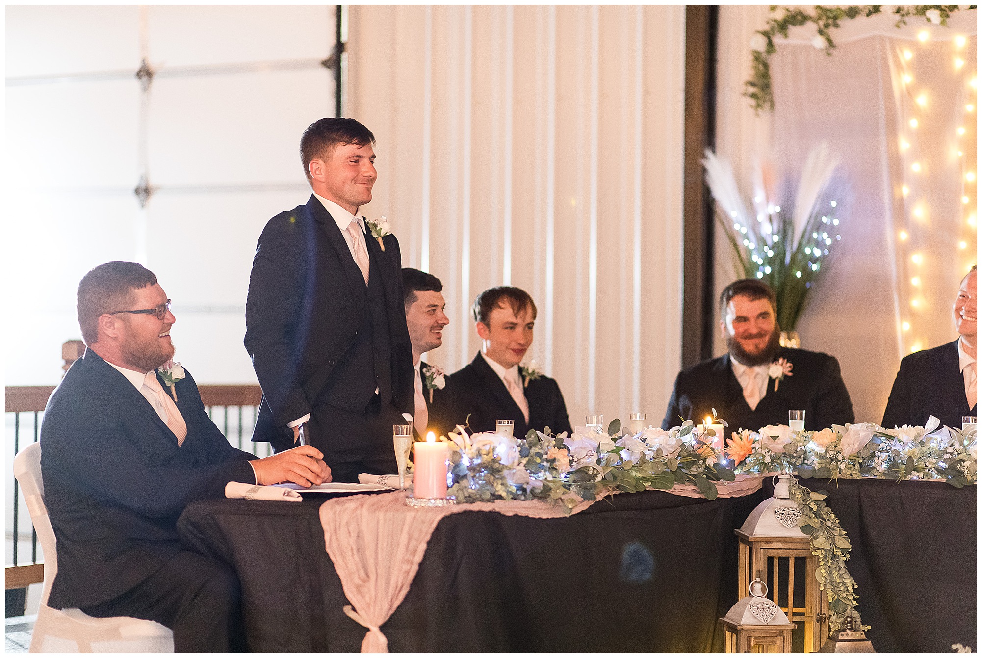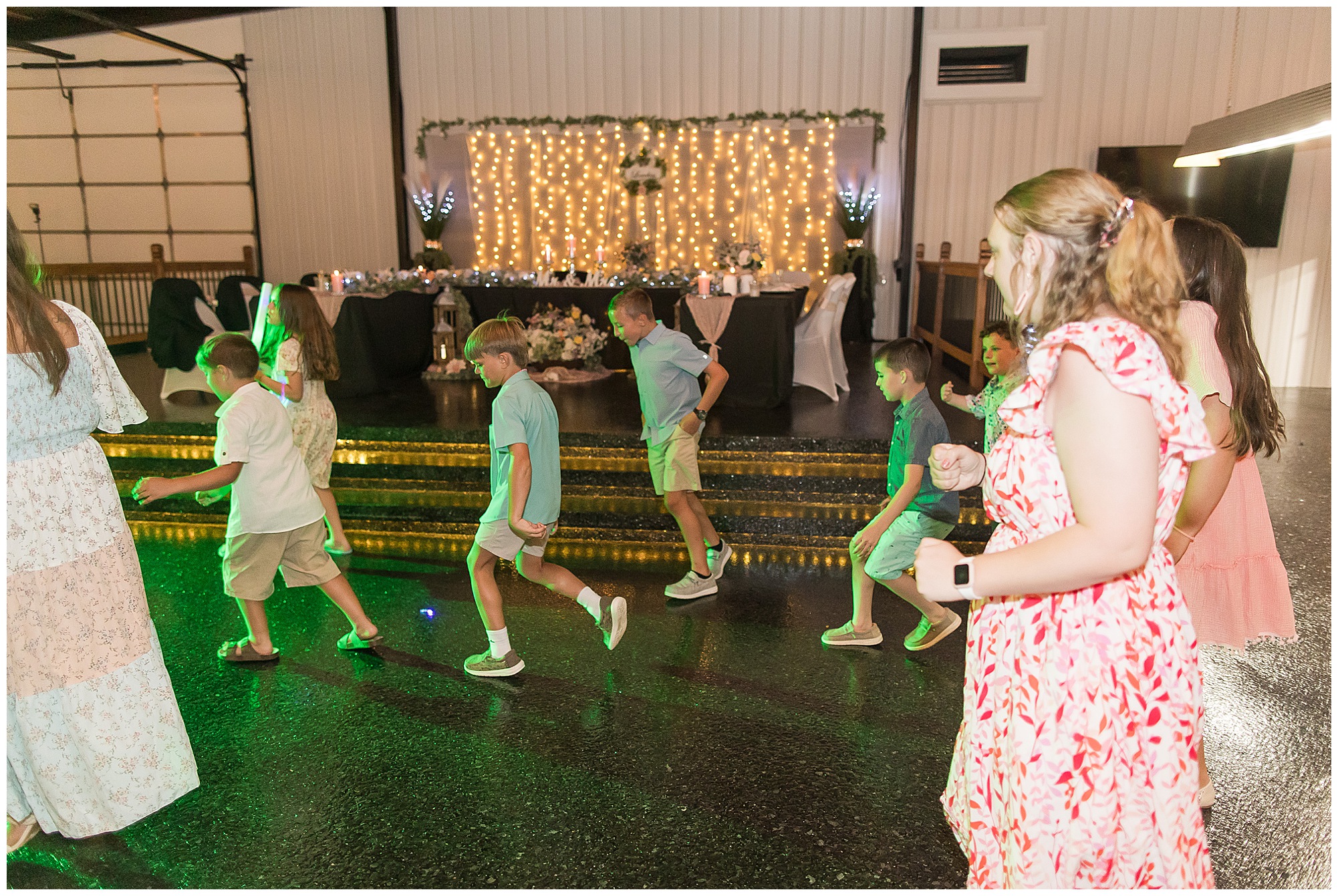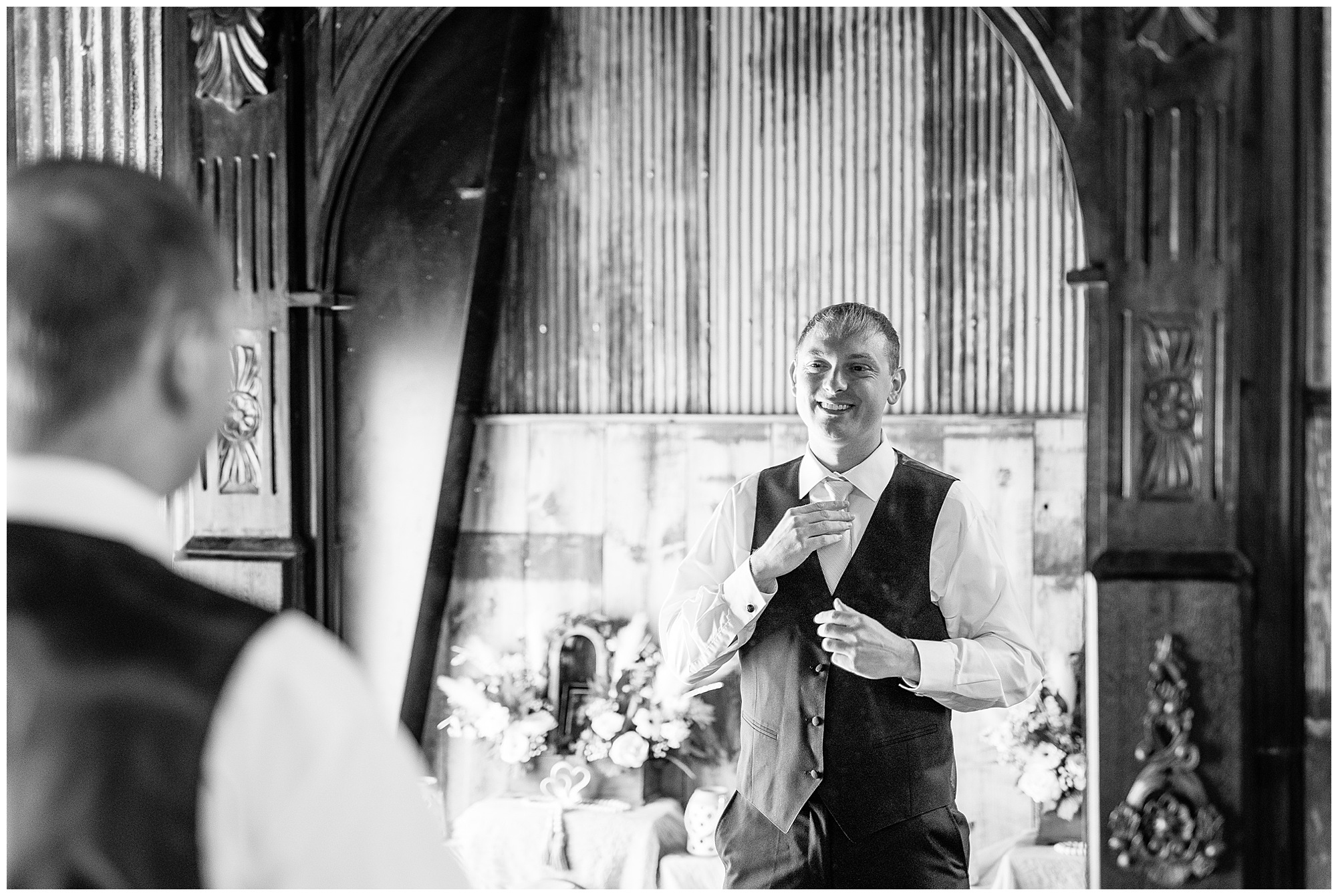The ceremony took place inside the barn, which was such a sweet and cozy setting. When Kevin saw Nicole for the first time, it was one of those moments that gives you goosebumps—the look on his face said everything. Nicole looked absolutely stunning, and the barn’s white wood tones, old church pews for guests to be seated, and soft twinkle lights added to the magic of it all. After the ceremony, we jumped into bridal party photos, and let me tell you—we had a blast! The venue has added so many fun little spots lately, which gave us tons to play with. Whether it was a tree swings, the vintage wagon, or just a pretty corner with great light, we found photo ops everywhere. And Nicole and Kevin’s bridal party came to have fun!