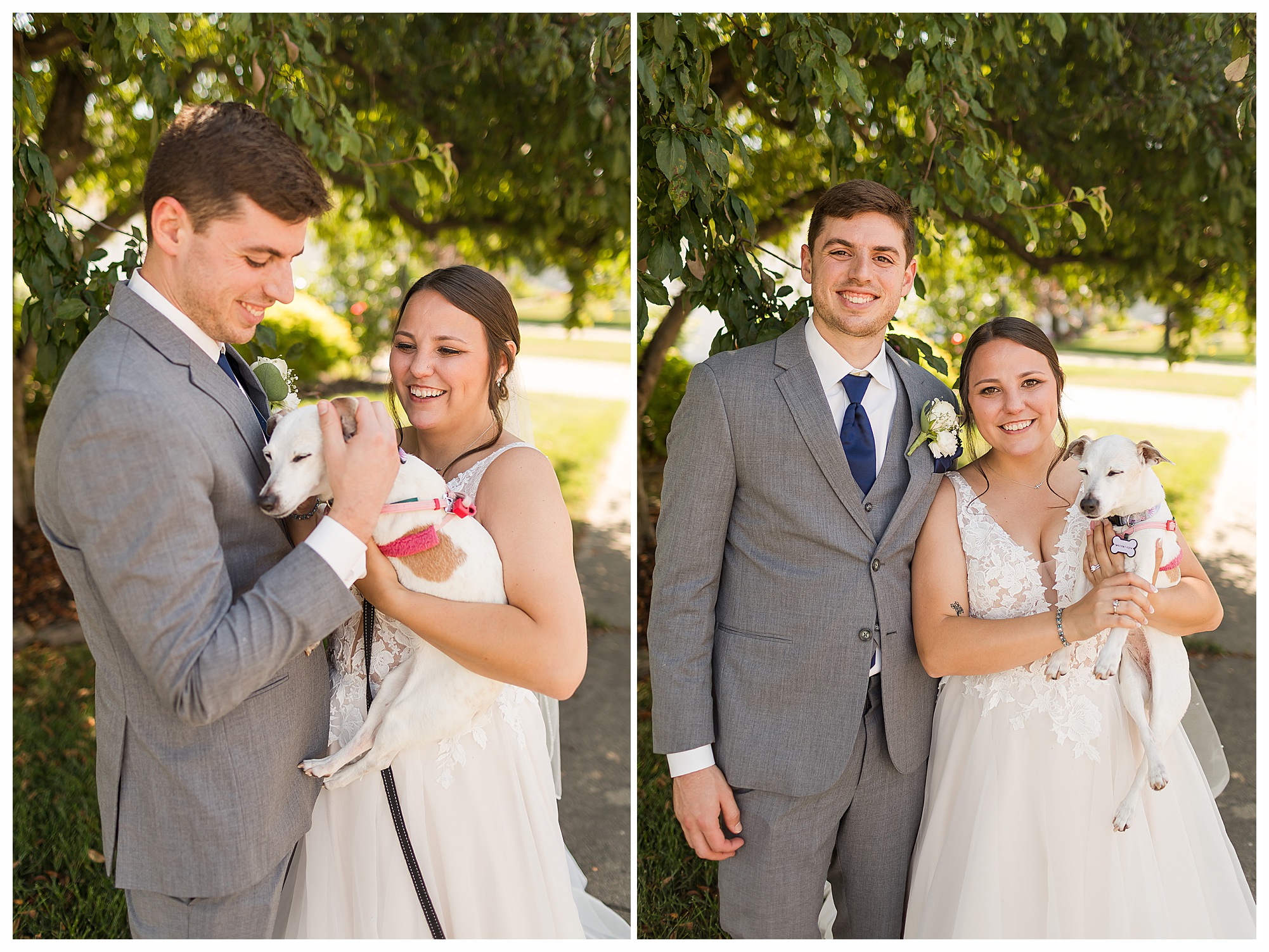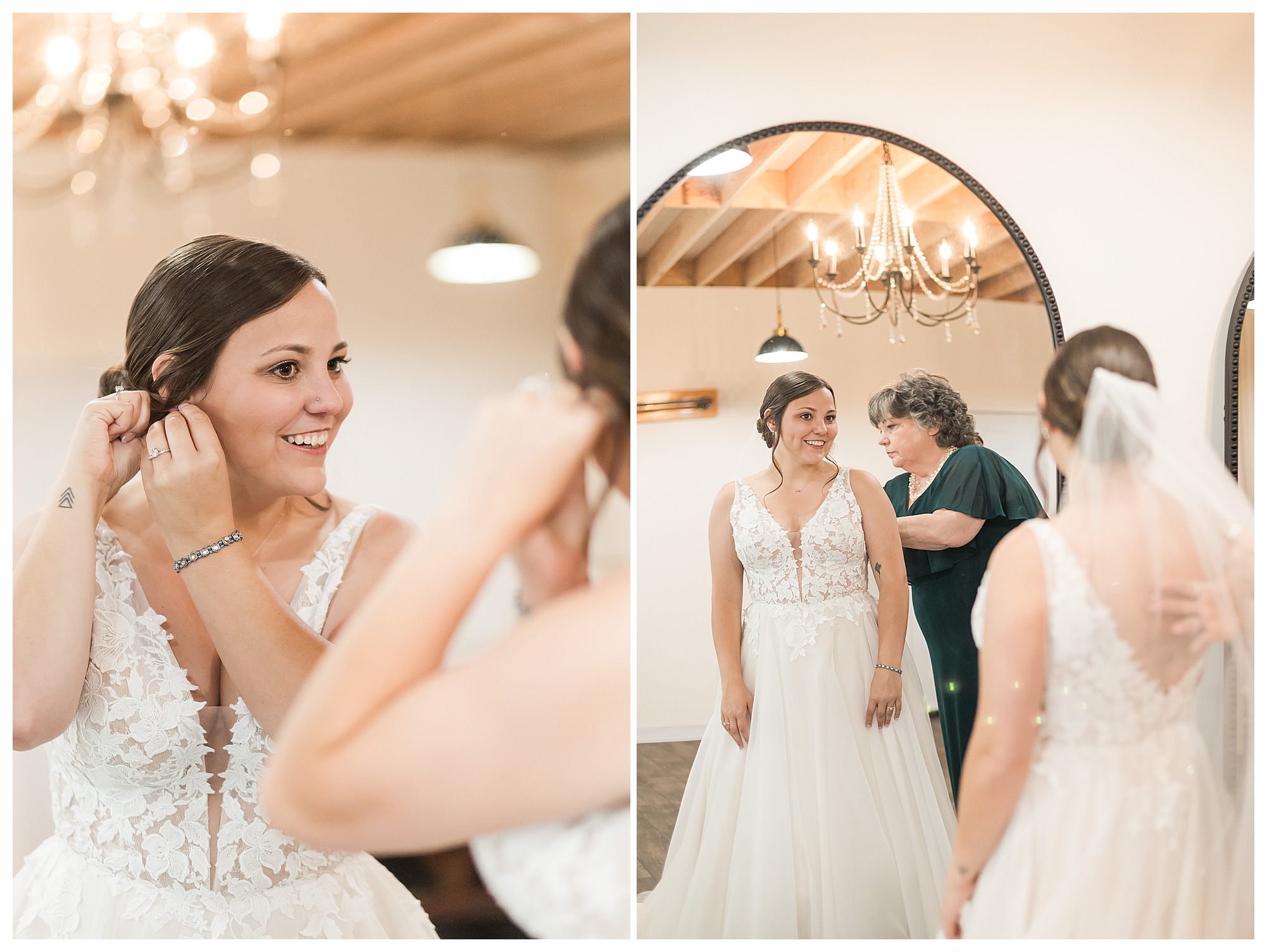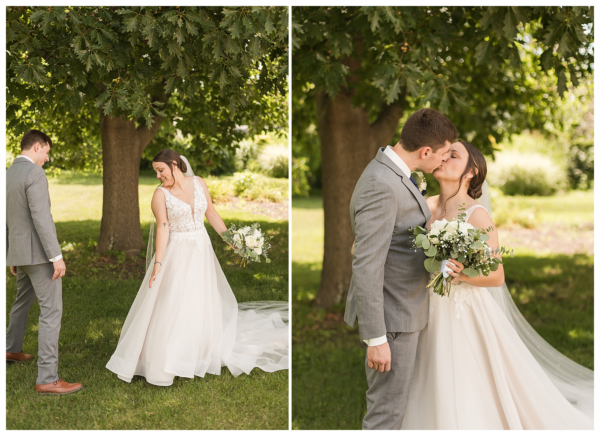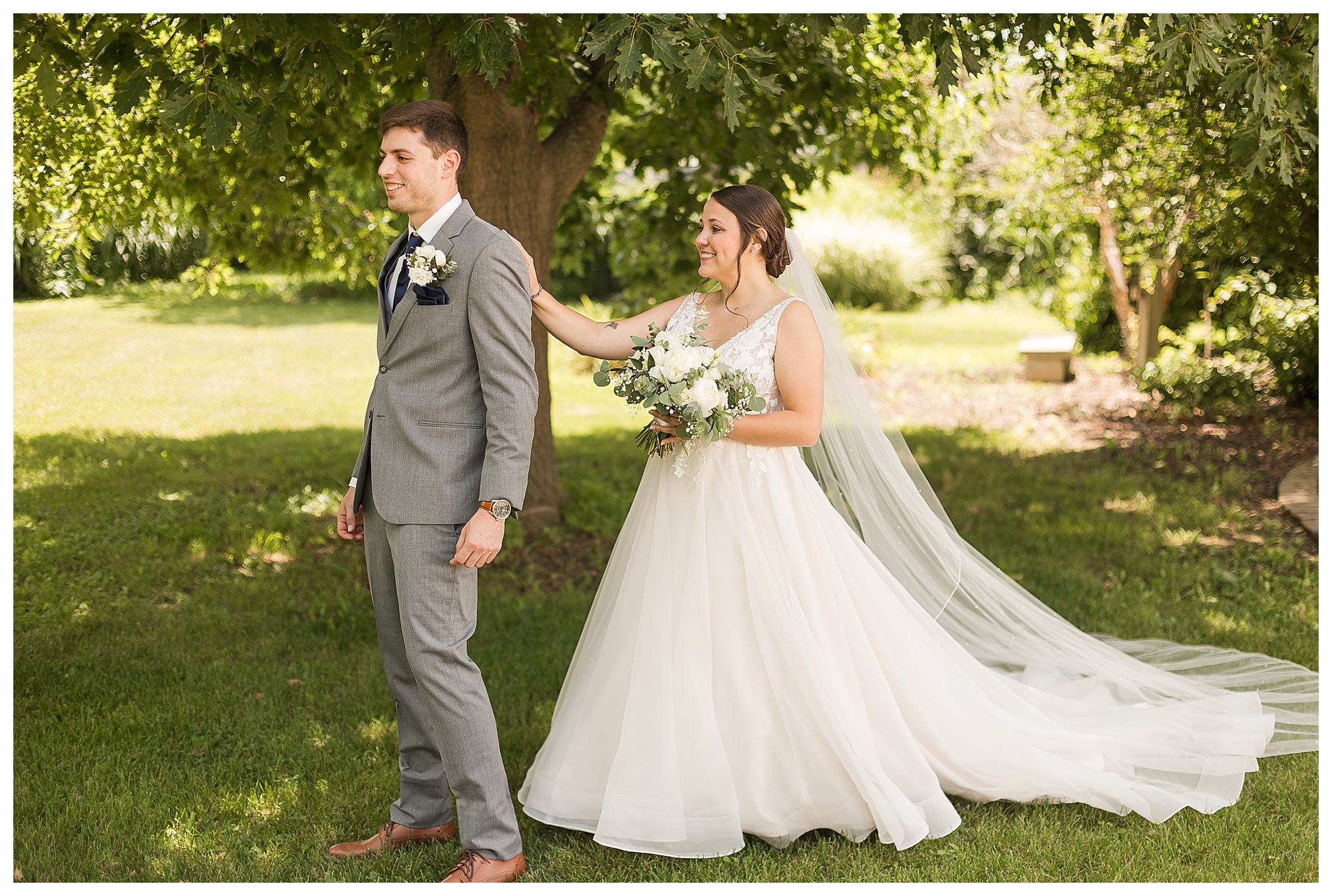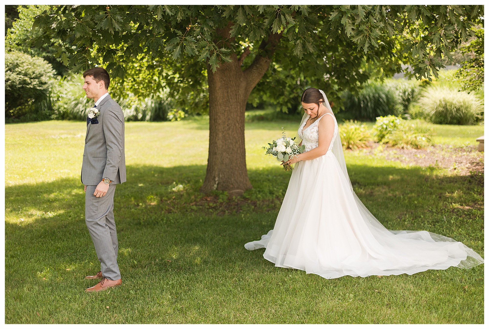 Jocelyn and Mark’s wedding day kicked off on one of those classic Midwest summer days—bright, hot, and full of anticipation. The kind where the air feels electric and everything just feels exciting. Their first look took place right on the gorgeous property of Olive & Oak in Edwards, Illinois, and it was such a sweet, relaxed moment between the two of them. The space has a charming mix of rustic and modern vibes, and it felt like the perfect backdrop for this easygoing, joy-filled couple. Jocelyn and Mark were smiling nonstop (as were their people!) and were just so happy to be together. It honestly set the tone for the whole day.