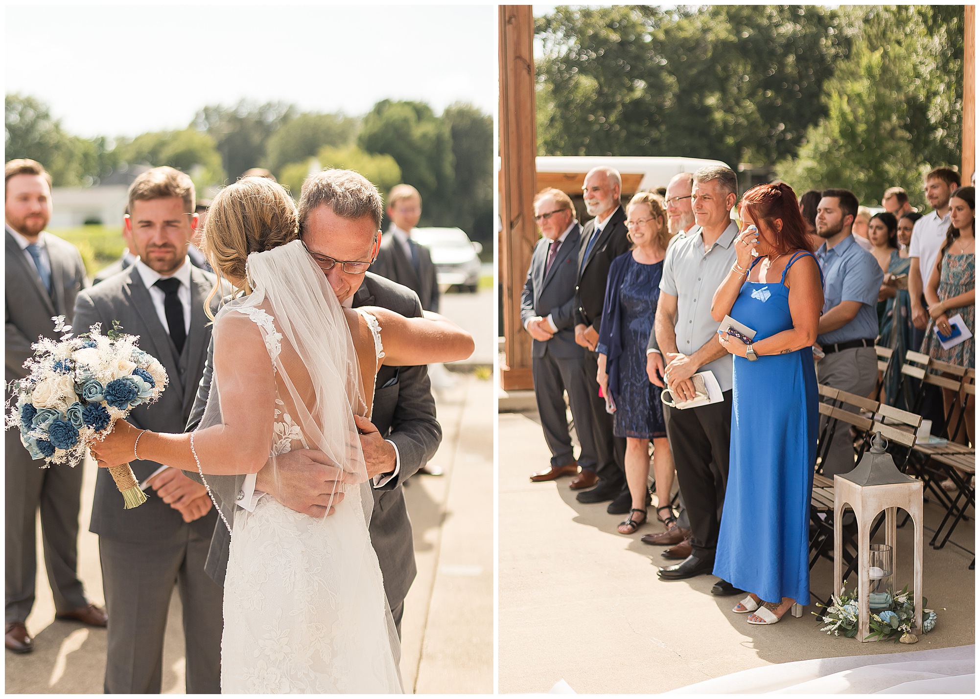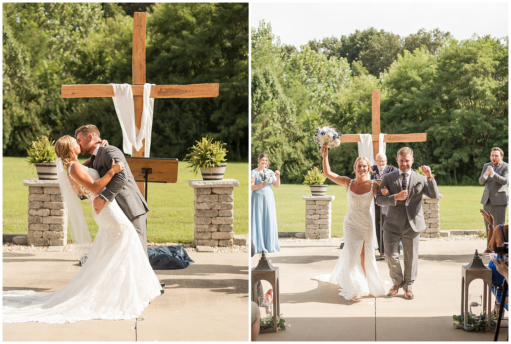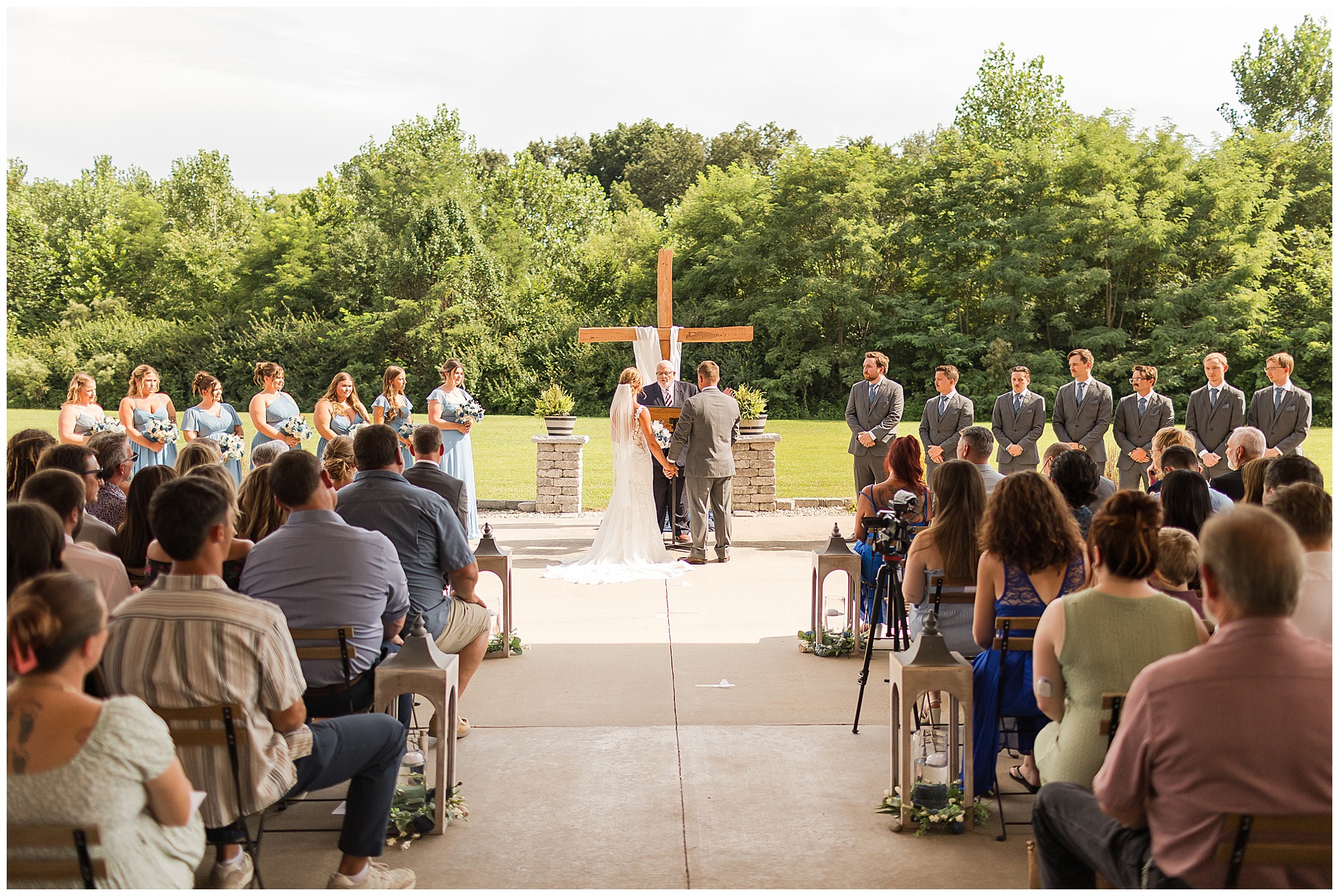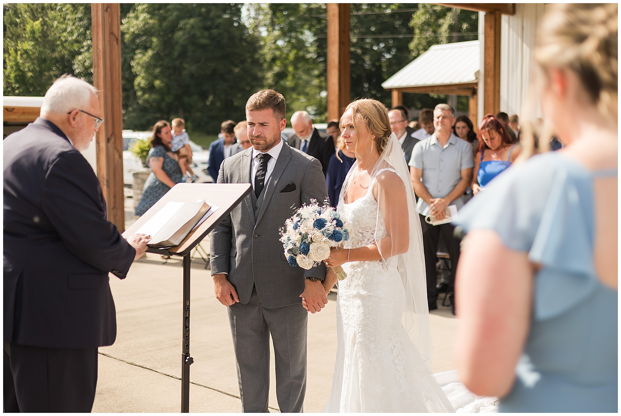 Their ceremony took place outdoors on the patio, surrounded by all their favorite people. The atmosphere was heartfelt and full of love—so many smiles, happy tears, and cheering as they said “I do” under the summer sun.
