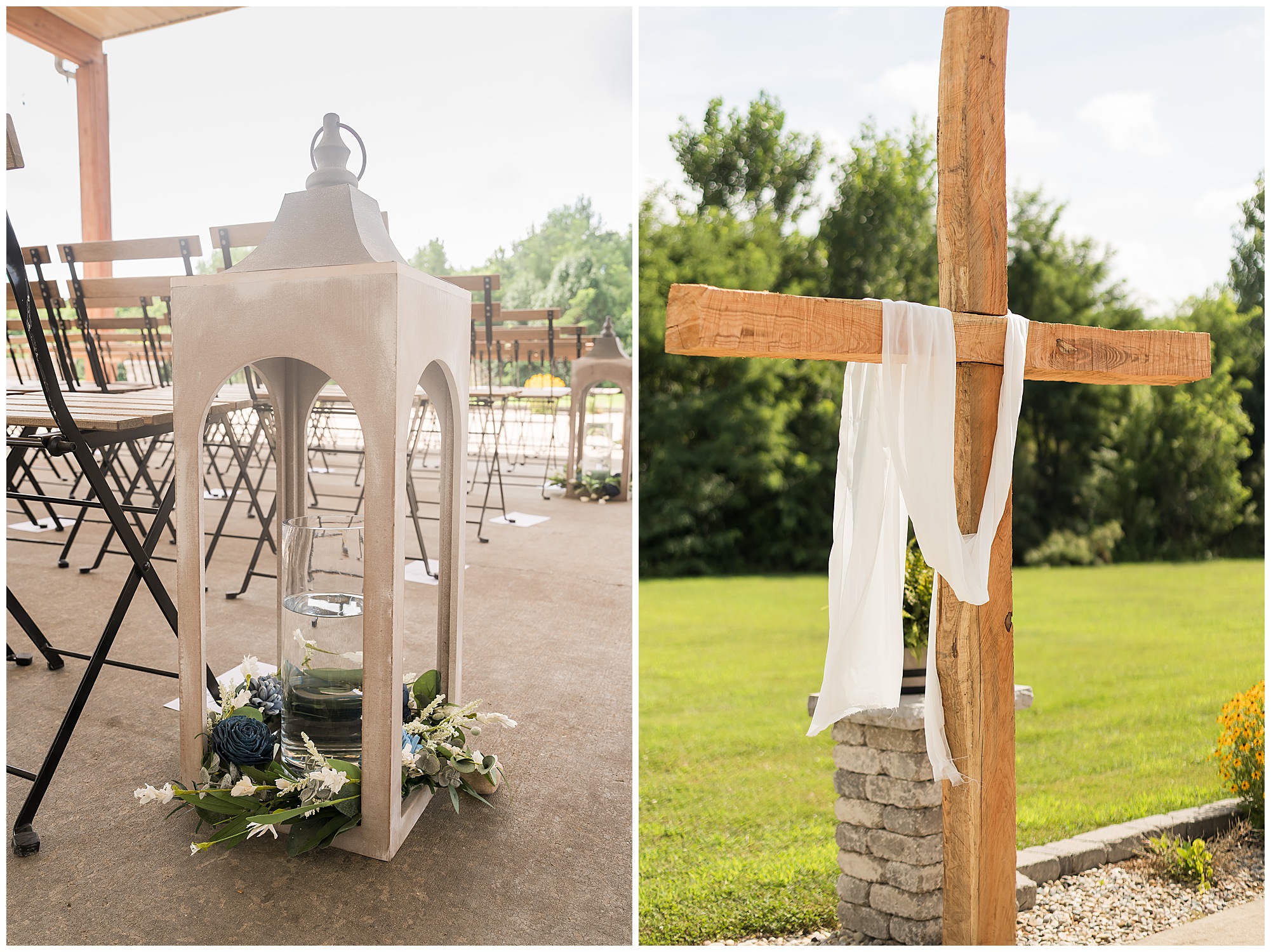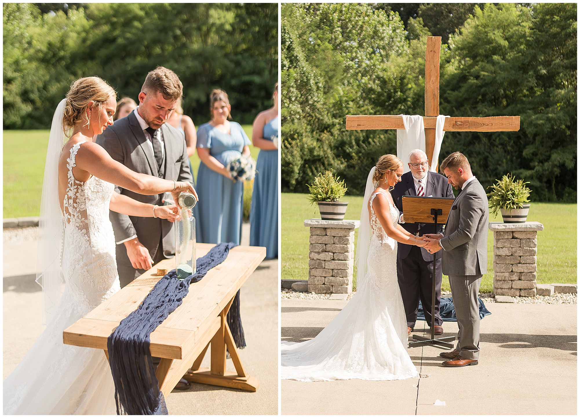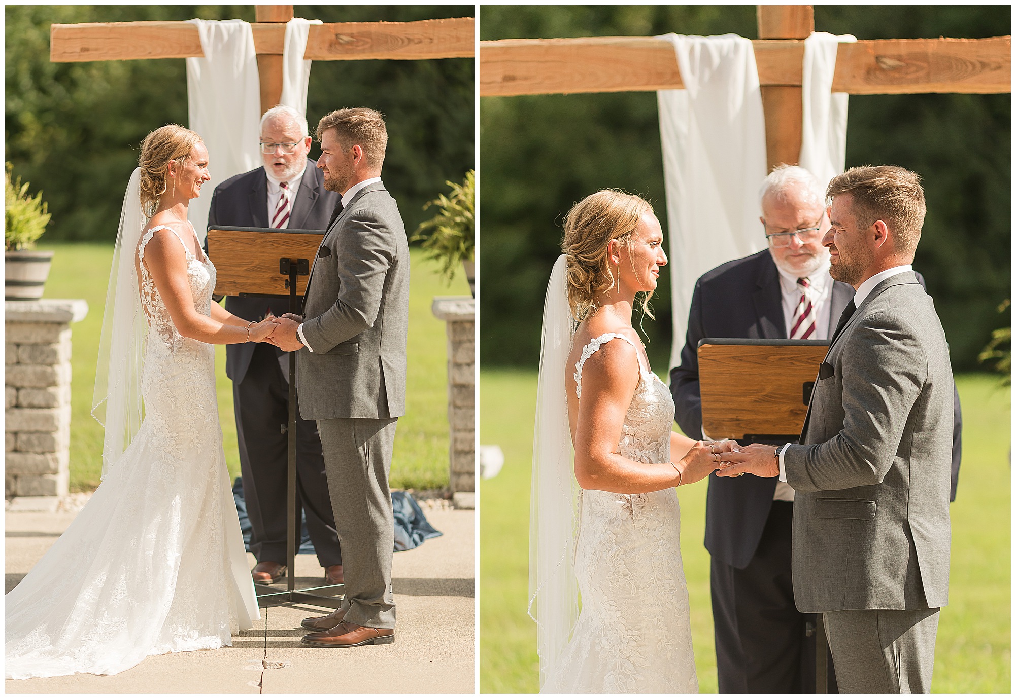 Their ceremony took place outdoors on the patio, surrounded by all their favorite people. The atmosphere was heartfelt and full of love—so many smiles, happy tears, and cheering as they said “I do” under the summer sun.