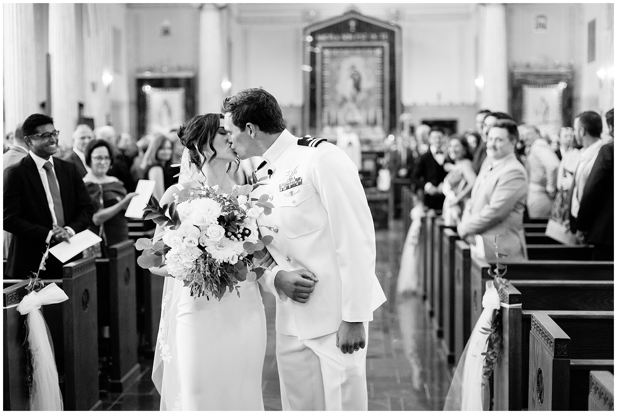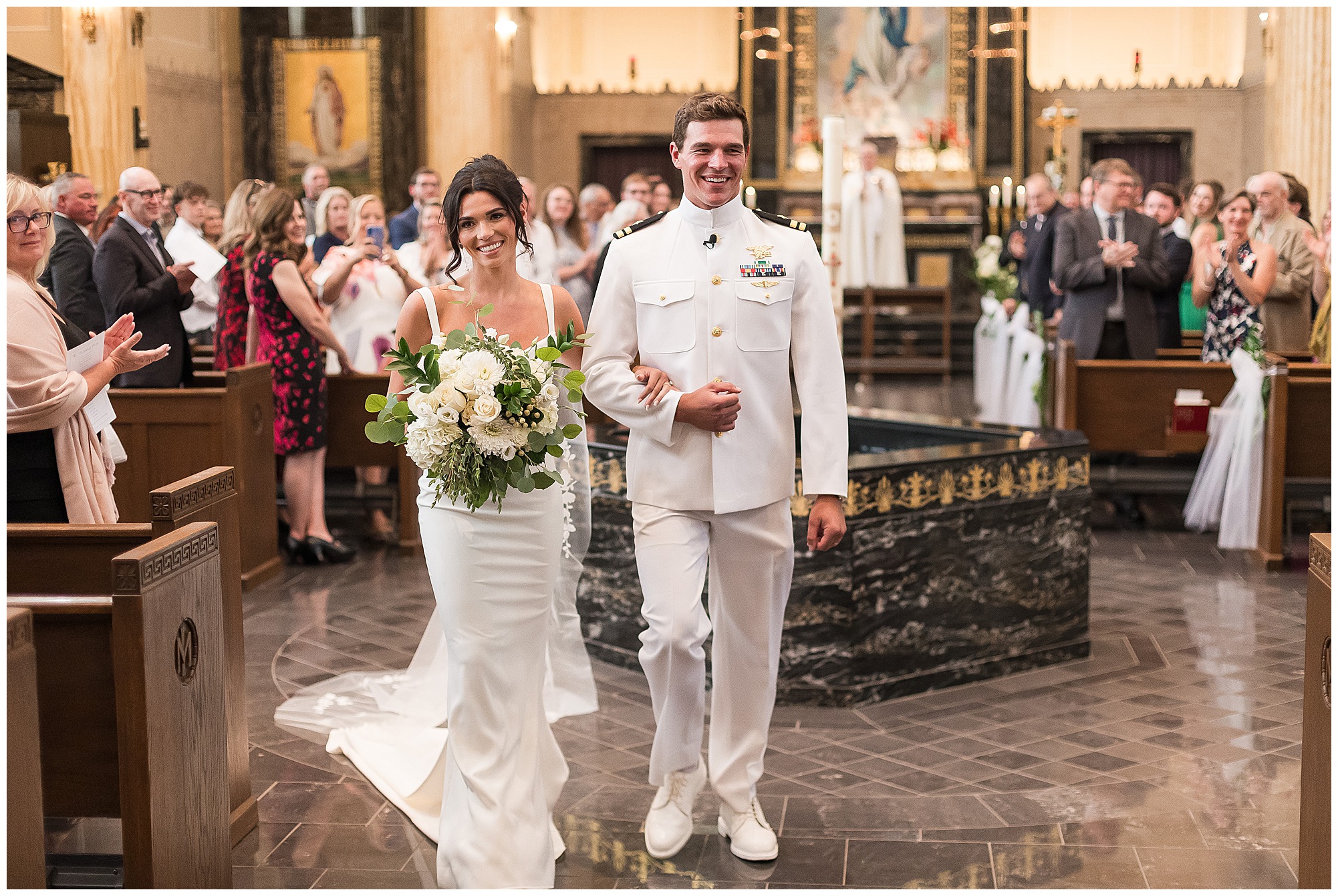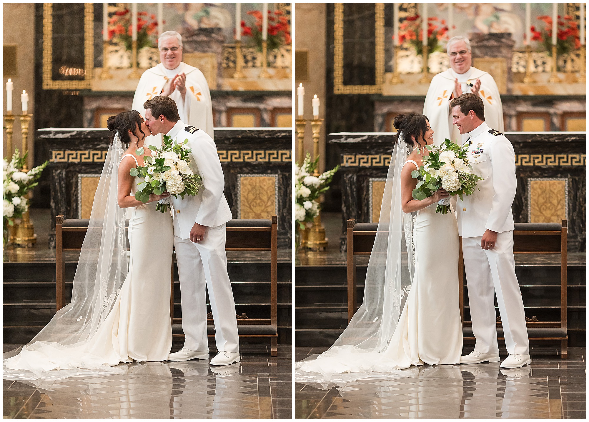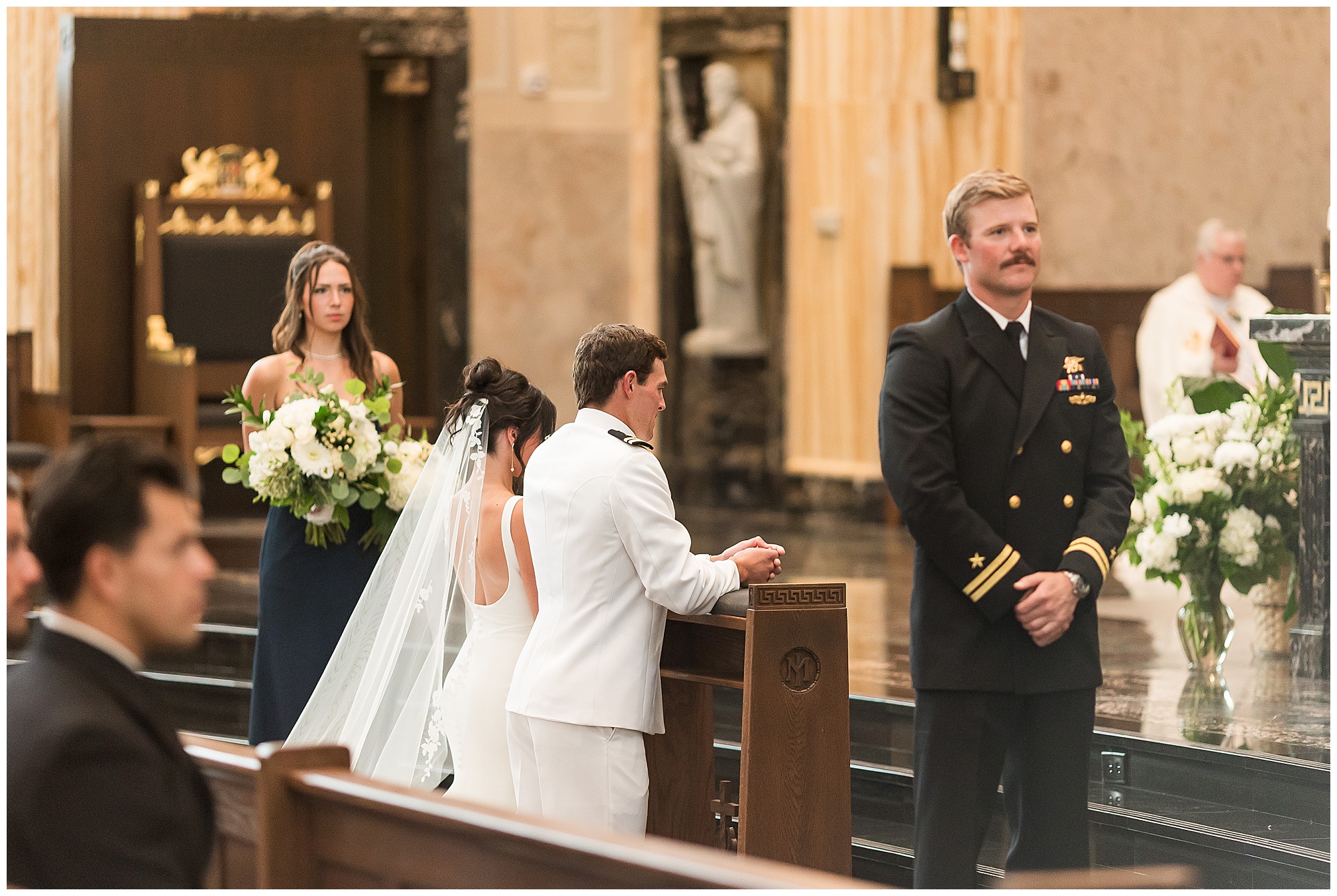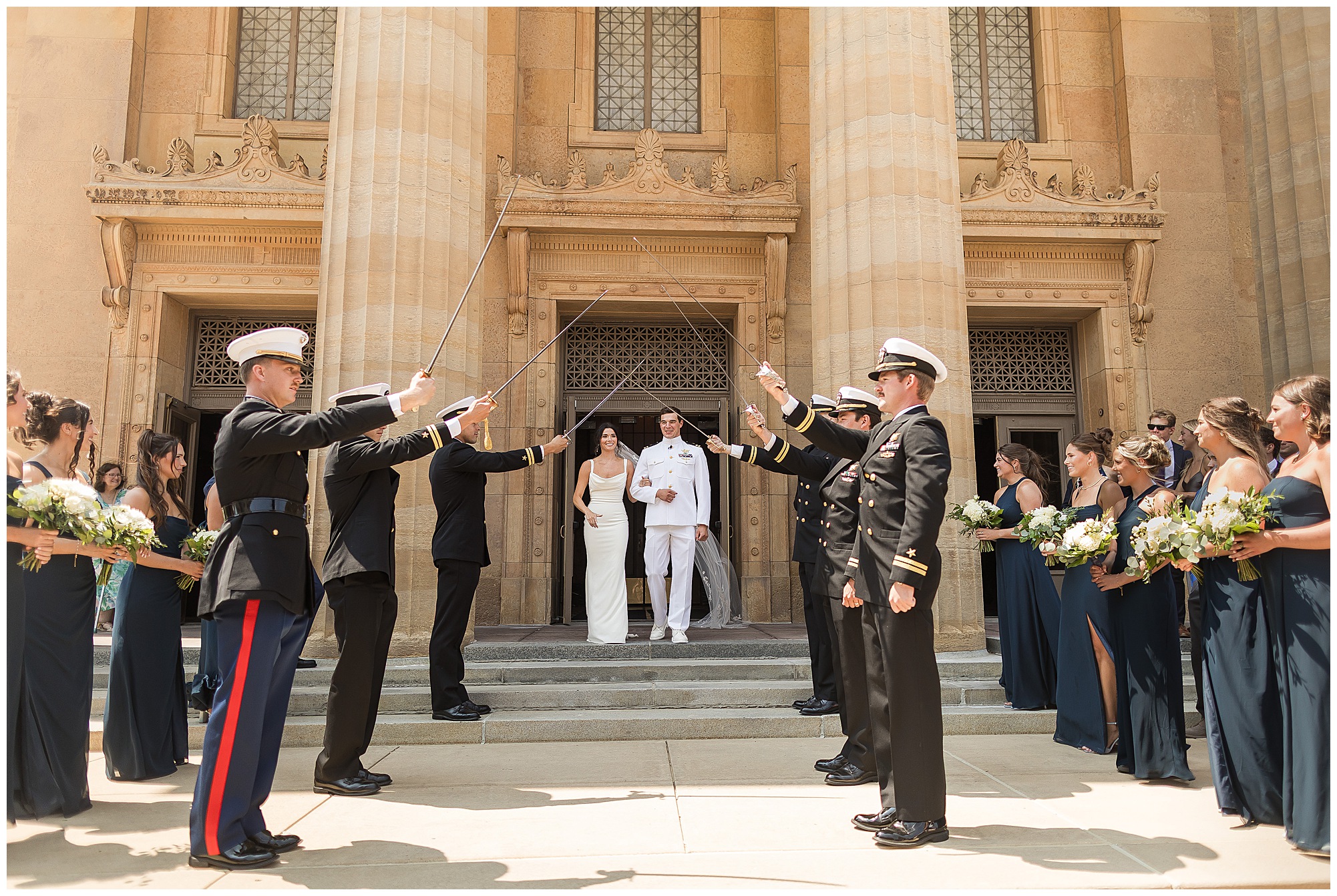 Before the party kicked off, we made our way to the Cathedral of the Immaculate Conception in Springfield for their ceremony, and wow… if you’ve ever seen that space, you know it’s incredible. But the moment that truly made the day memorable for me was Nate seeing Kelly for their emotional first look. Nate was in his full Navy dress whites, looking sharp and completely ready to see his bride. His emotions immediate got the best of him when seeing Kelly, which made the whole moment even more meaningful. Their ceremony included so many highlights of their faith, love, and honor for one another. After their full Catholic mass, the traditional Navy Arch of Swords took place right on the cathedral steps with Nate’s groomsmen in their matching Navy uniforms, —and yes, it was as amazing as it sounds!