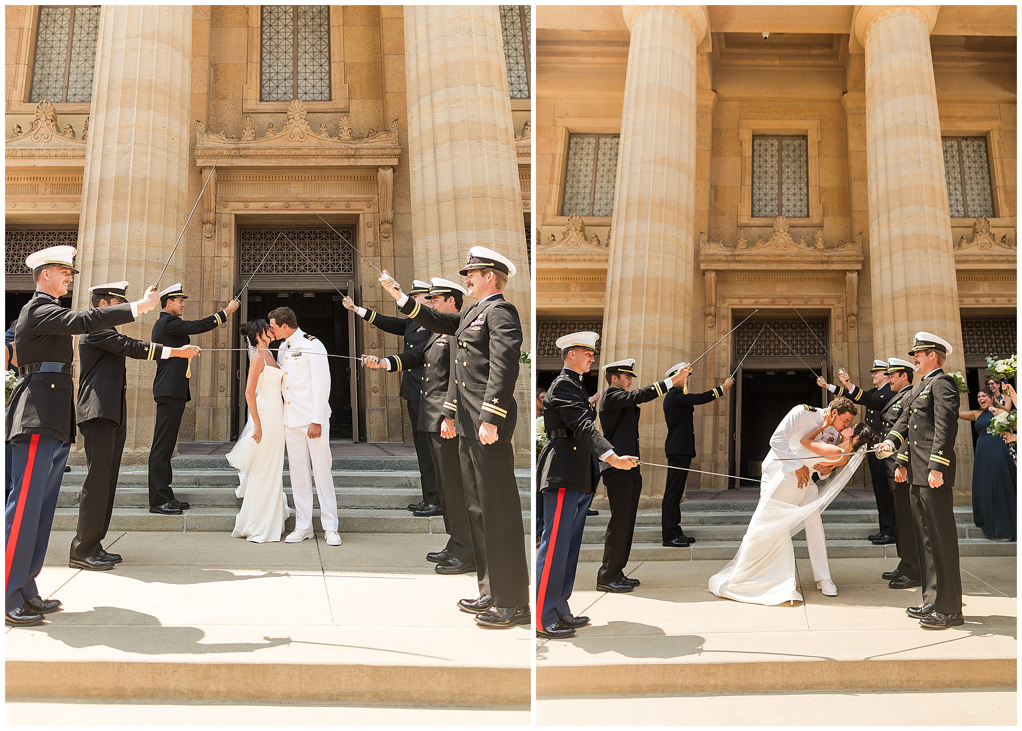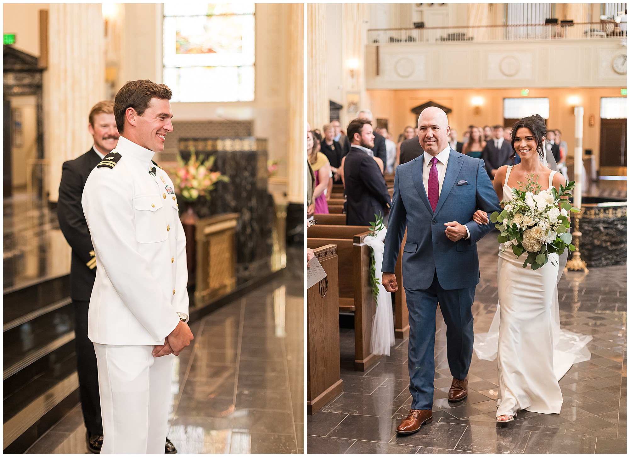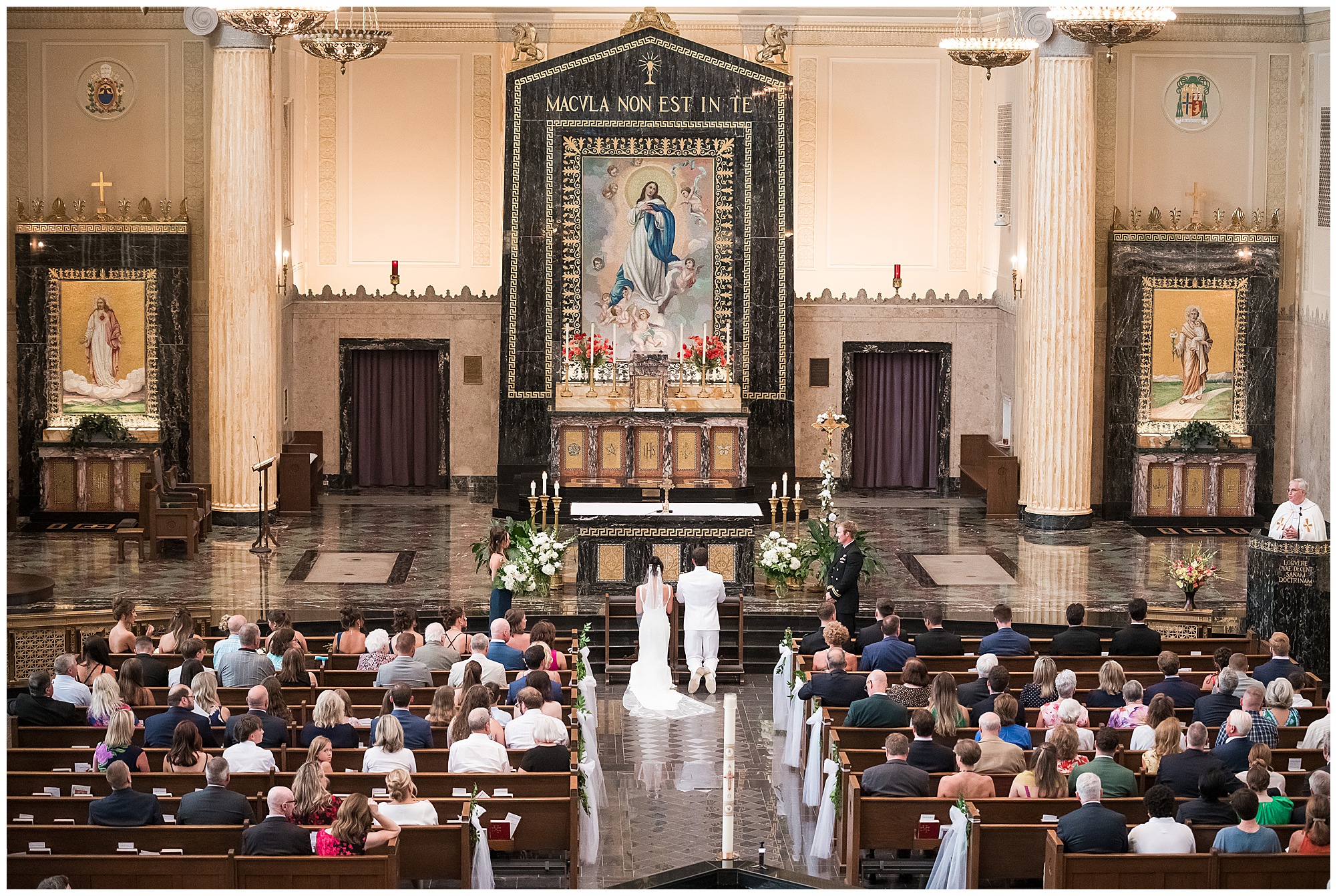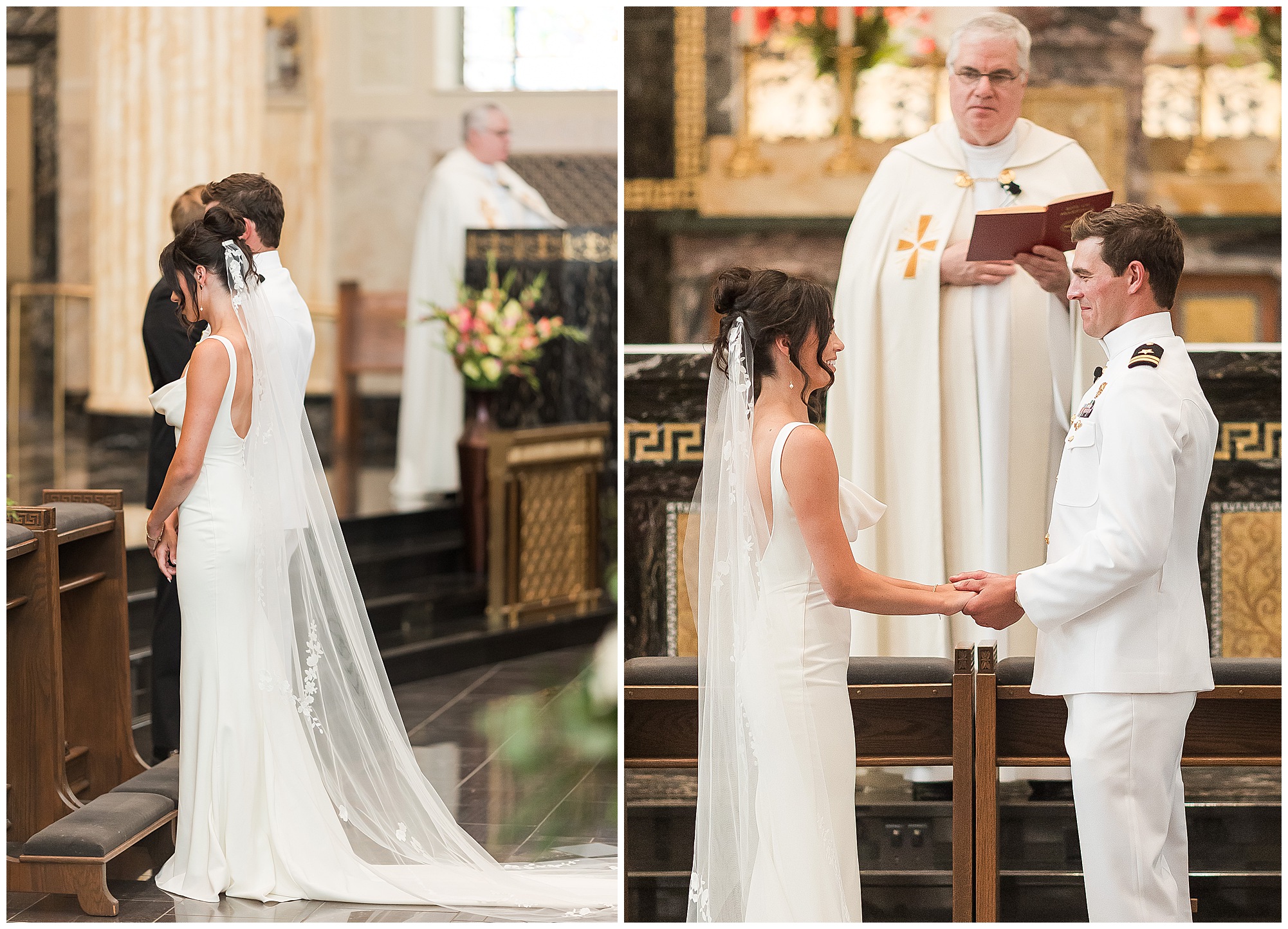 Before the party kicked off, we made our way to the Cathedral of the Immaculate Conception in Springfield for their ceremony, and wow… if you’ve ever seen that space, you know it’s incredible. But the moment that truly made the day memorable for me was Nate seeing Kelly for their emotional first look. Nate was in his full Navy dress whites, looking sharp and completely ready to see his bride. His emotions immediate got the best of him when seeing Kelly, which made the whole moment even more meaningful. Their ceremony included so many highlights of their faith, love, and honor for one another. After their full Catholic mass, the traditional Navy Arch of Swords took place right on the cathedral steps with Nate’s groomsmen in their matching Navy uniforms, —and yes, it was as amazing as it sounds!