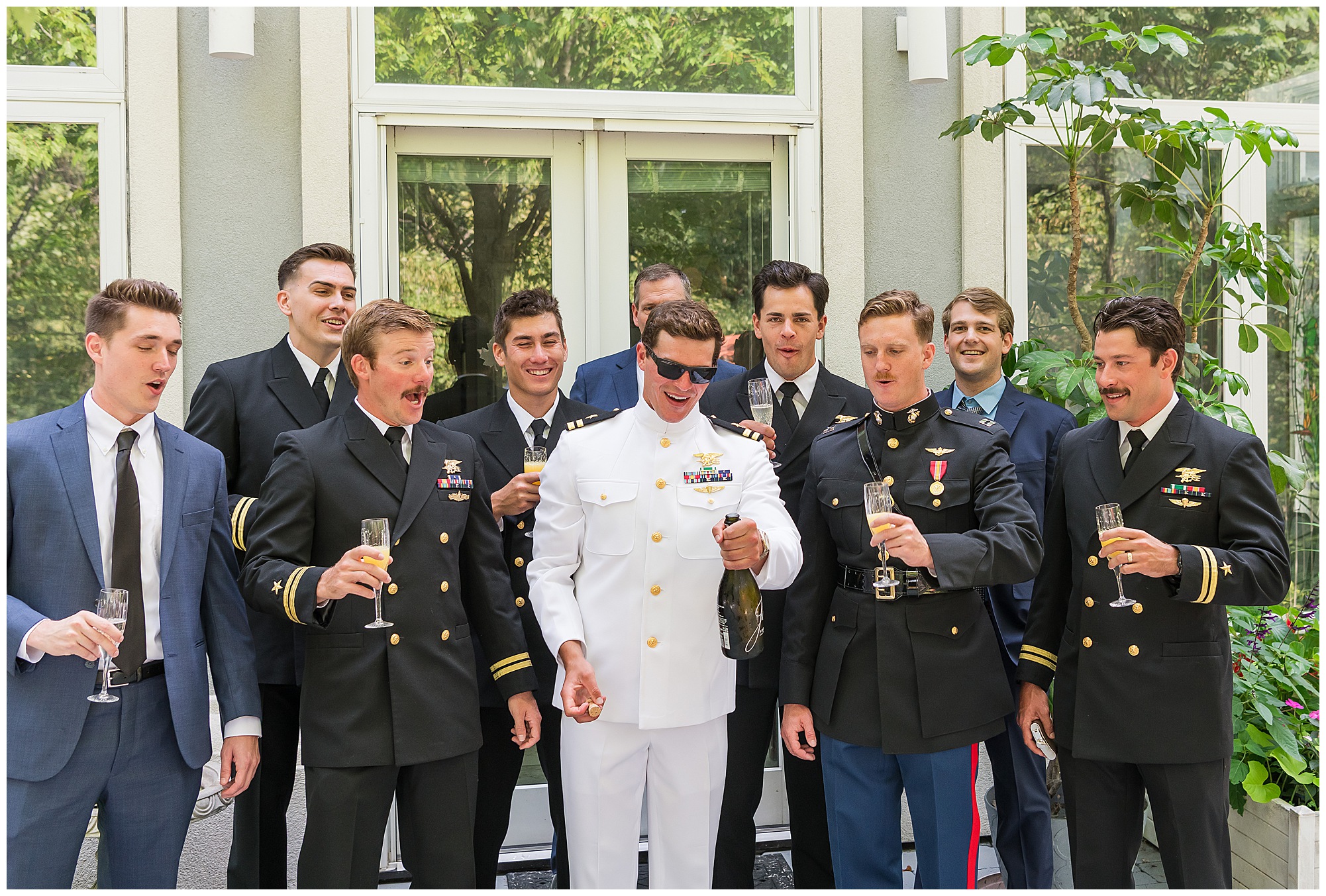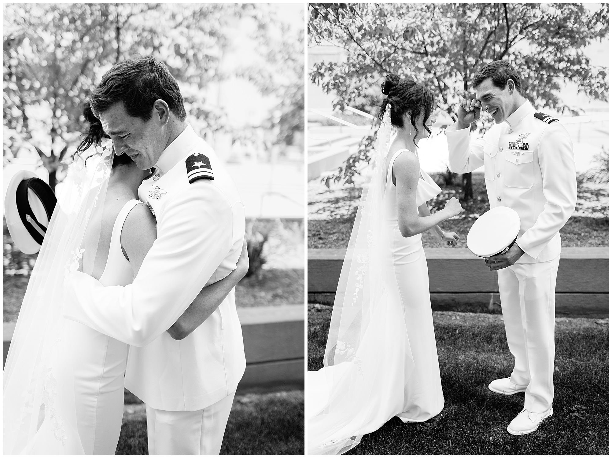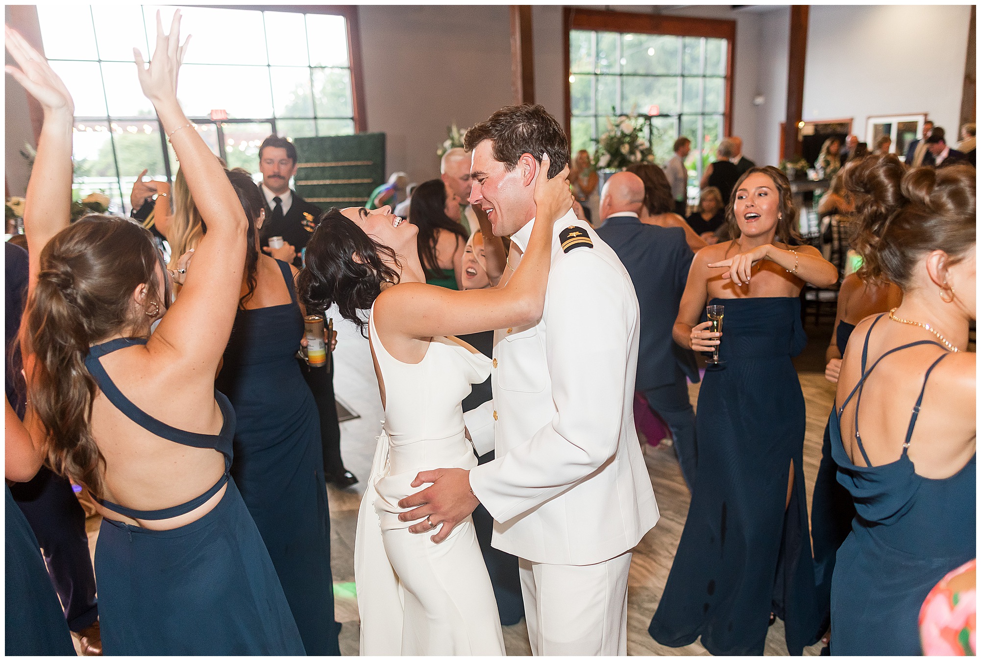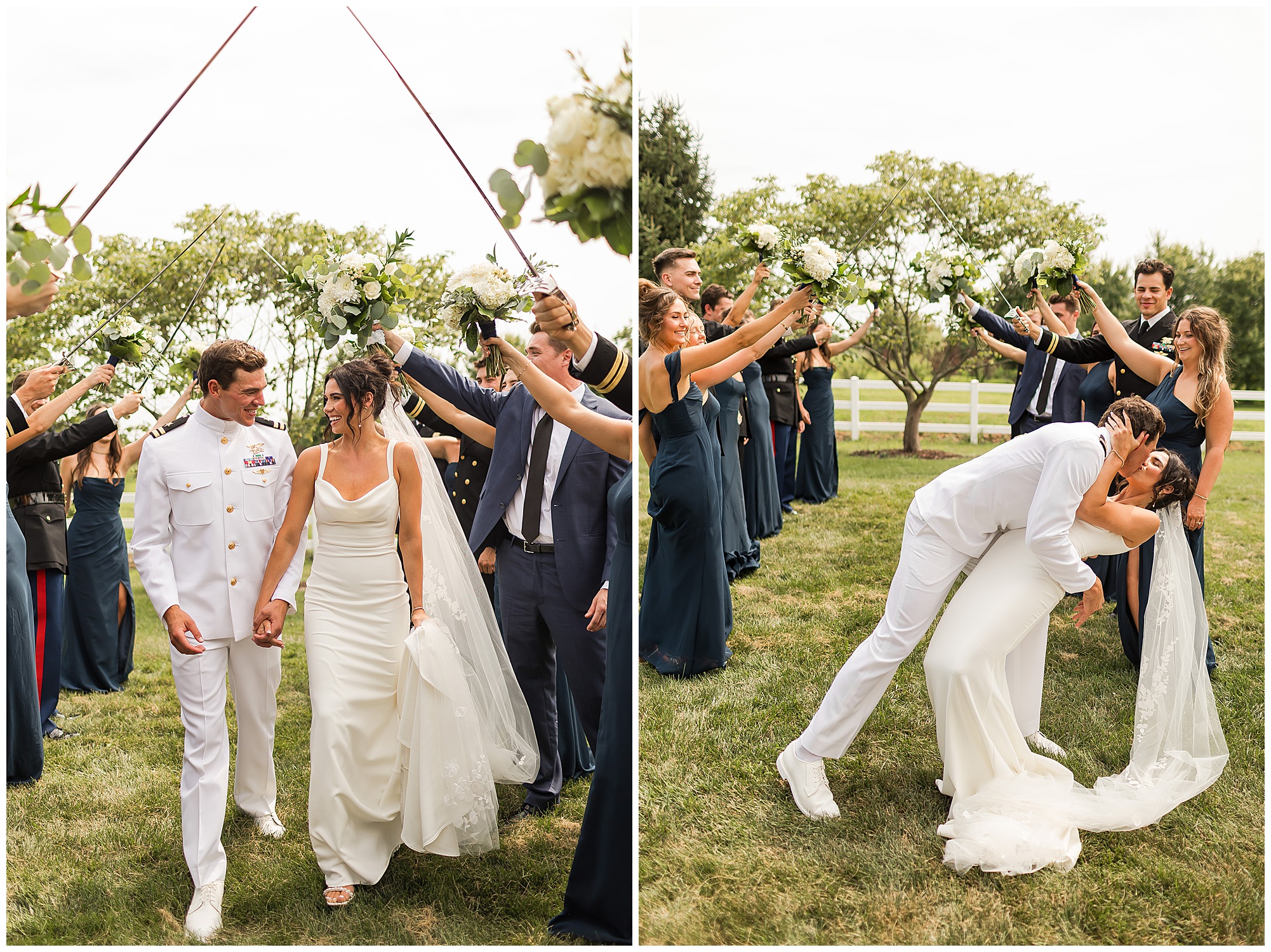 Before the party kicked off, we made our way to the Cathedral of the Immaculate Conception in Springfield for their ceremony, and wow… if you’ve ever seen that space, you know it’s incredible. But the moment that truly made the day memorable for me was Nate seeing Kelly for their emotional first look. Nate was in his full Navy dress whites, looking sharp and completely ready to see his bride. His emotions immediate got the best of him when seeing Kelly, which made the whole moment even more meaningful. Their ceremony included so many highlights of their faith, love, and honor for one another. After their full Catholic mass, the traditional Navy Arch of Swords took place right on the cathedral steps with Nate’s groomsmen in their matching Navy uniforms, —and yes, it was as amazing as it sounds!