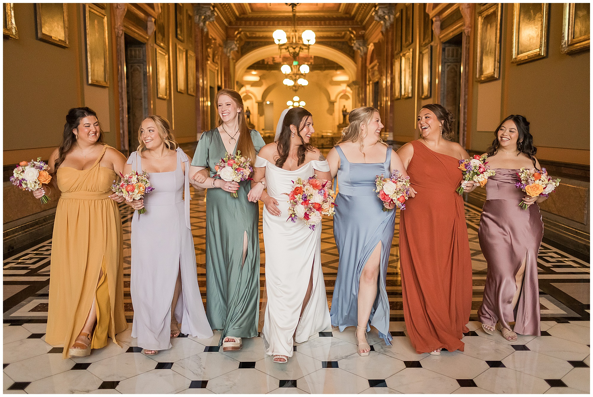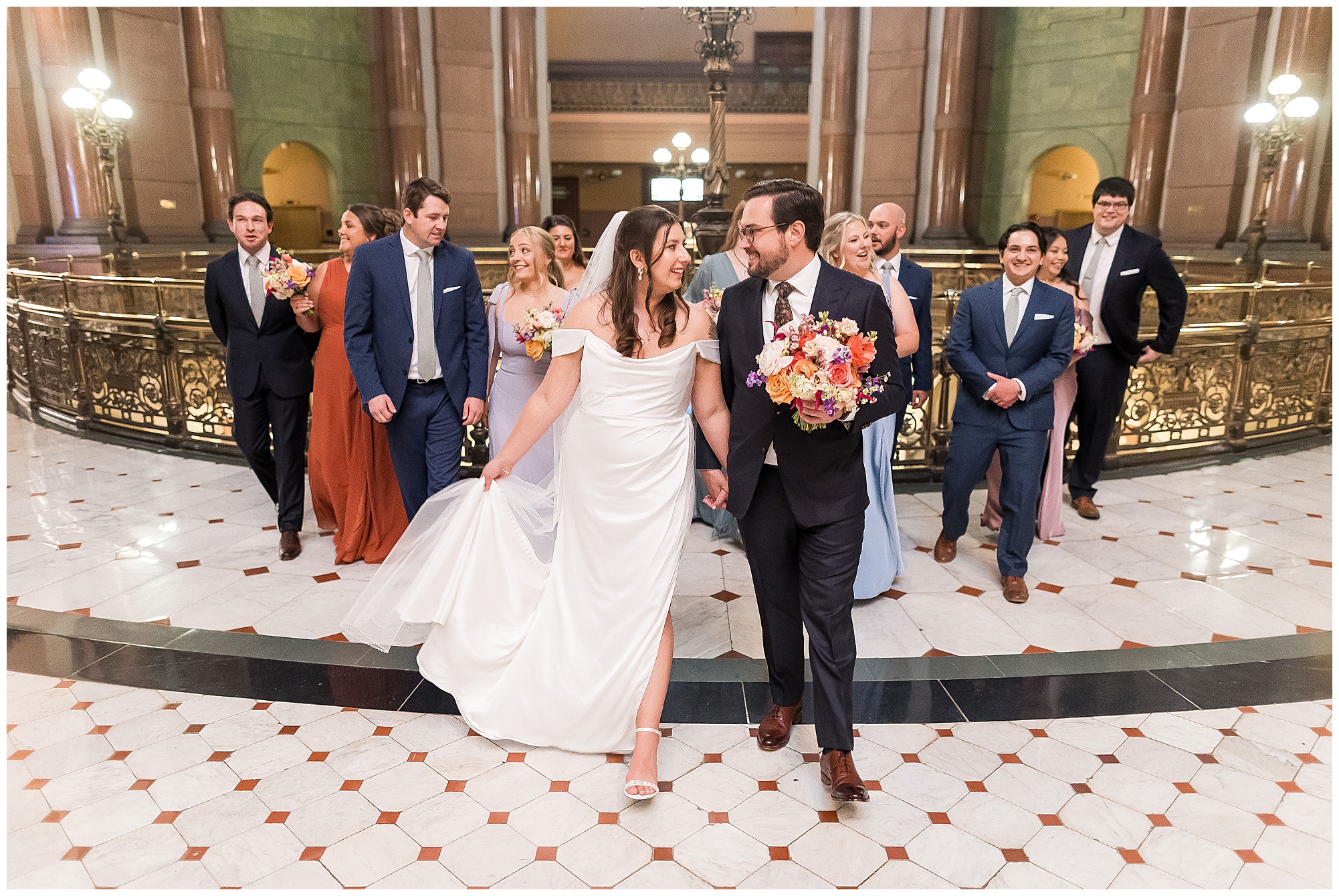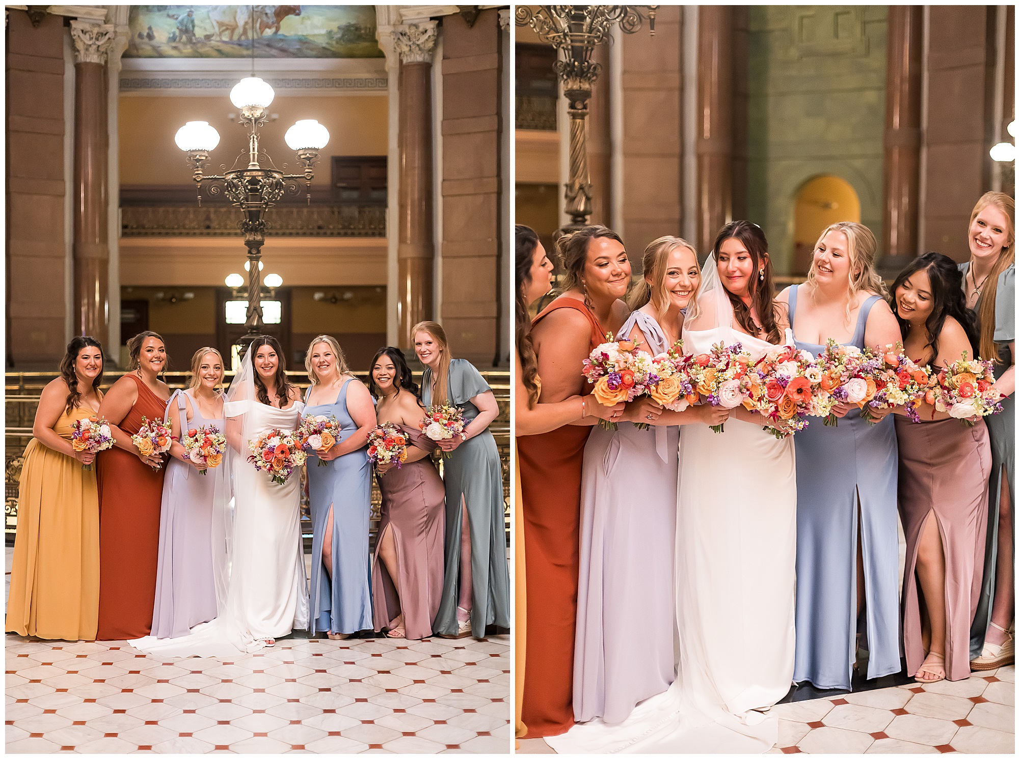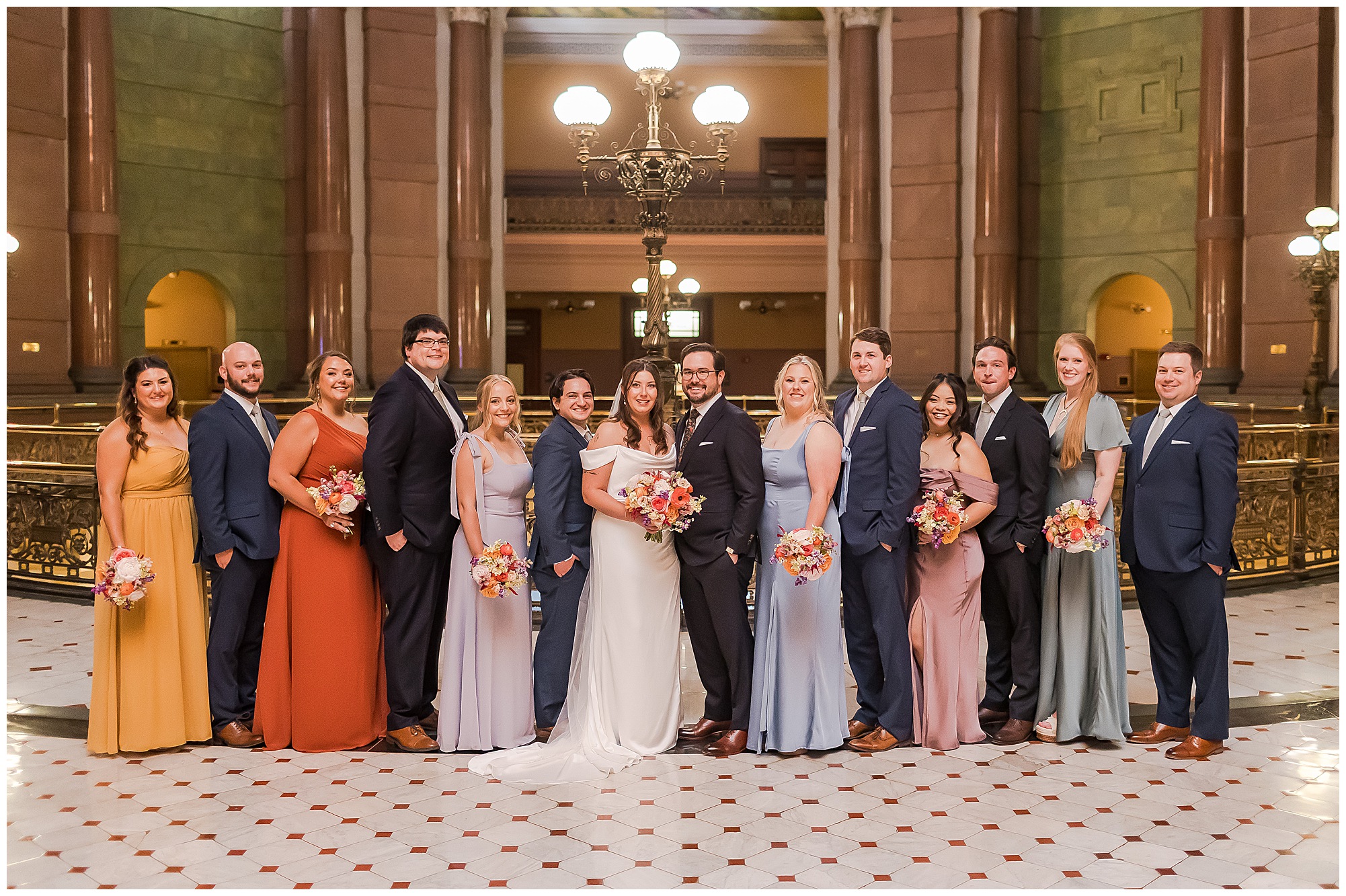Before the ceremony, Maggie & Keenan shared one of my favorite moments of the day: their first look. And not just anywhere — they chose the breezeway next to the Illinois State Senate chambers at the Capitol. This spot held so much meaning for them since their jobs in and around the Capitol are how they met. Watching Keenan turn around and see Maggie for the first time was such a genuine, emotional moment — the kind you don’t forget. We continued photos inside the Senate chambers with their bridal party and then made our way into the rotunda, where the architecture alone feels like art. The bridesmaids’ dresses and florals added the perfect pop of color against the grand space. We had plans to step outside, but a sudden downpour had other ideas — honestly though, being “stuck” inside the Capitol wasn’t the worst backup plan. Maggie & Keenan were more than ready to be married, rain or shine, and it showed in every frame.