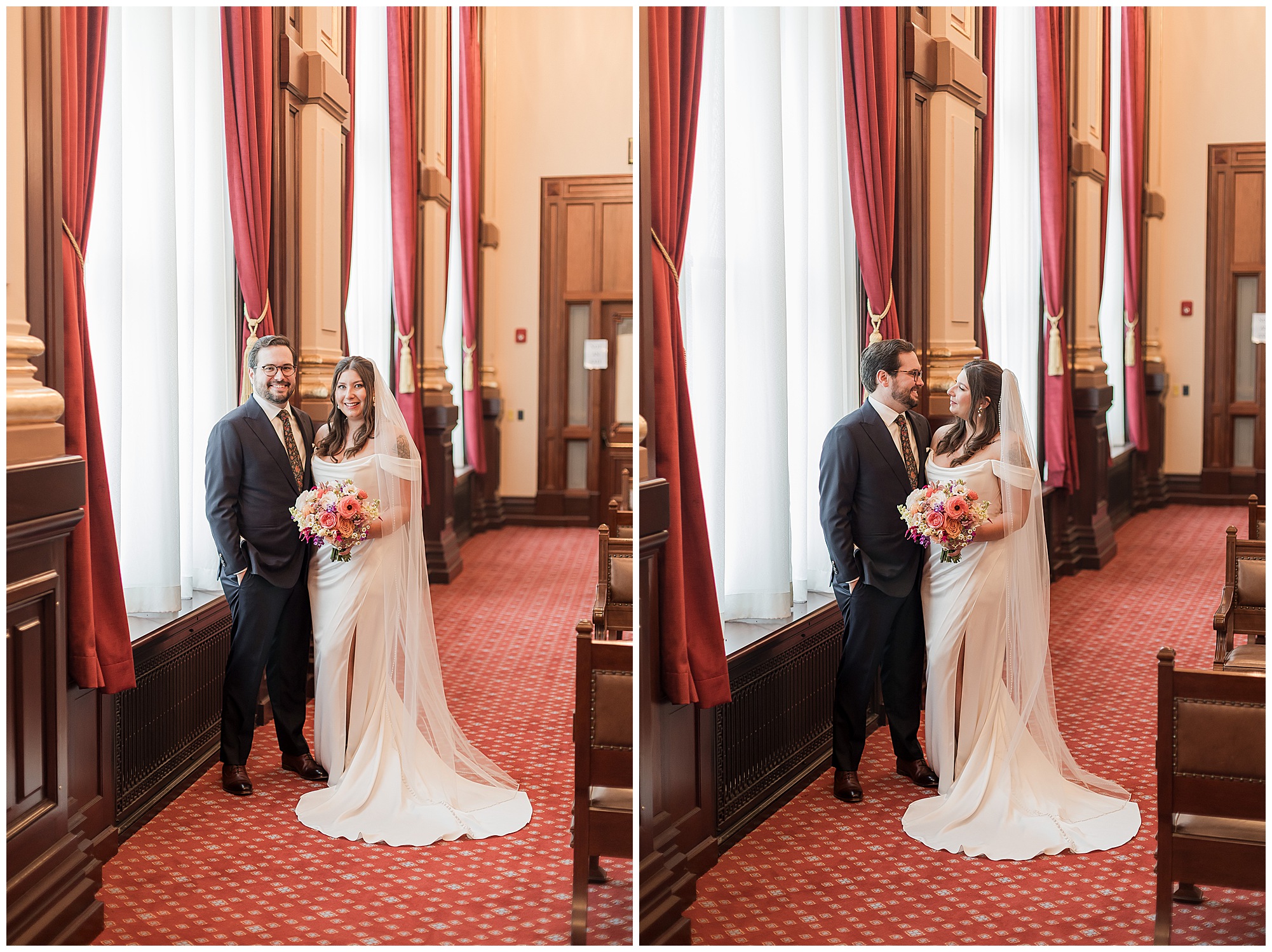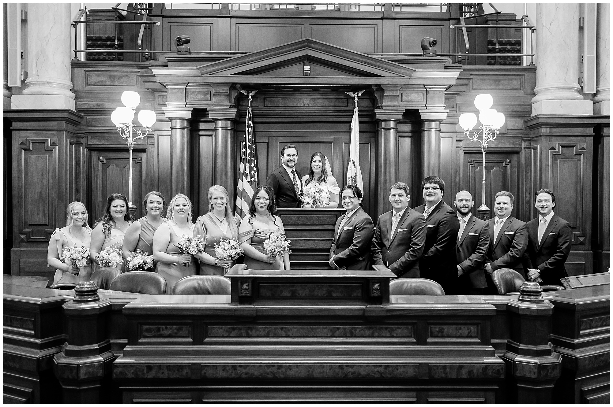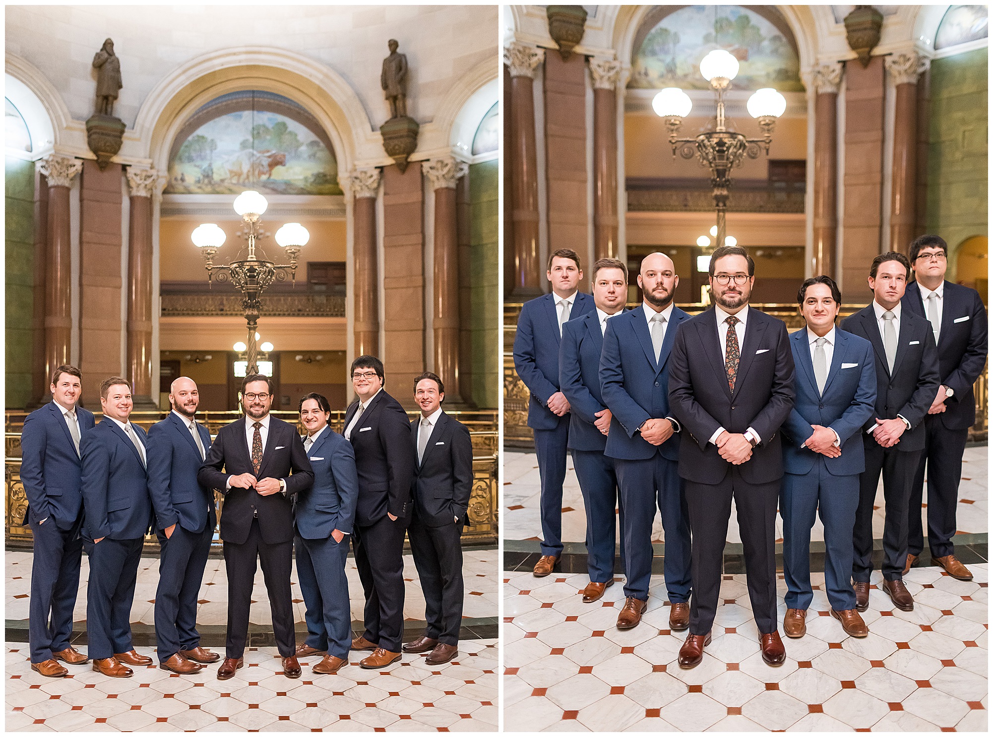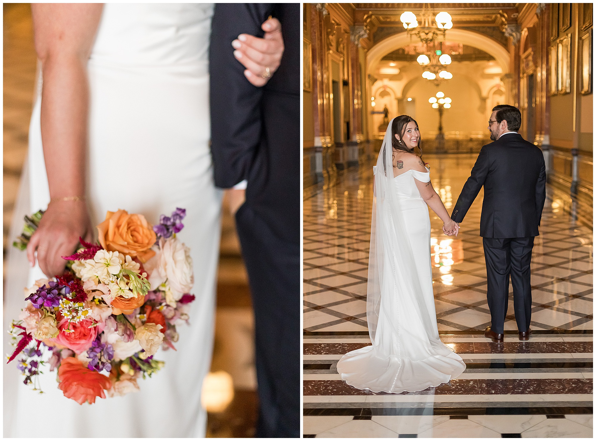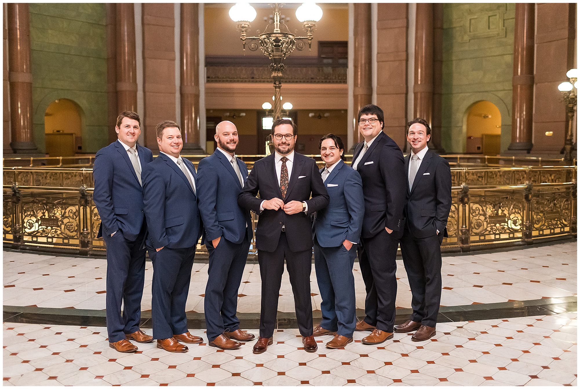 Before the ceremony, Maggie & Keenan shared one of my favorite moments of the day: their first look. And not just anywhere — they chose the breezeway next to the Illinois State Senate chambers at the Capitol. This spot held so much meaning for them since their jobs in and around the Capitol are how they met. Watching Keenan turn around and see Maggie for the first time was such a genuine, emotional moment — the kind you don’t forget. We continued photos inside the Senate chambers with their bridal party and then made our way into the rotunda, where the architecture alone feels like art. The bridesmaids’ dresses and florals added the perfect pop of color against the grand space. We had plans to step outside, but a sudden downpour had other ideas — honestly though, being “stuck” inside the Capitol wasn’t the worst backup plan. Maggie & Keenan were more than ready to be married, rain or shine, and it showed in every frame.