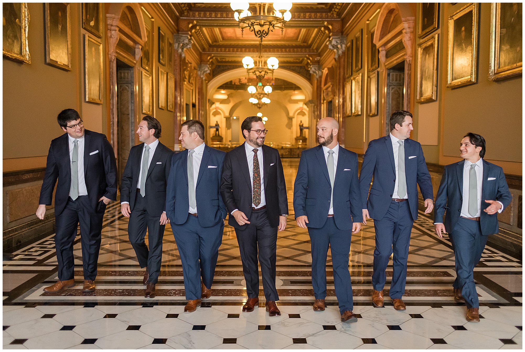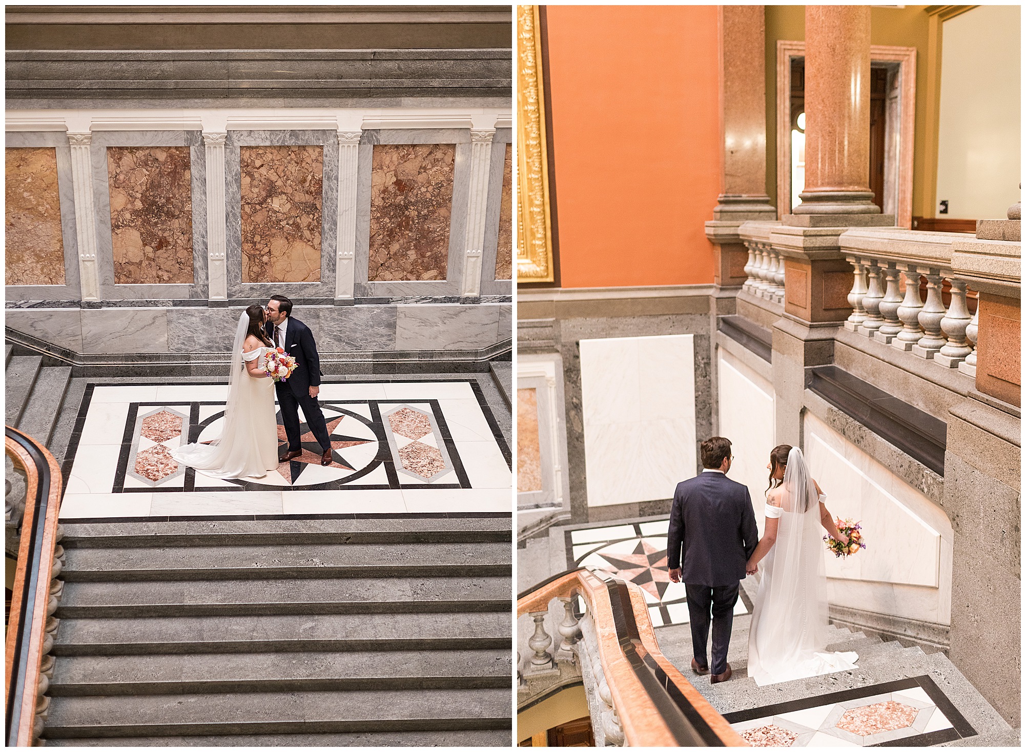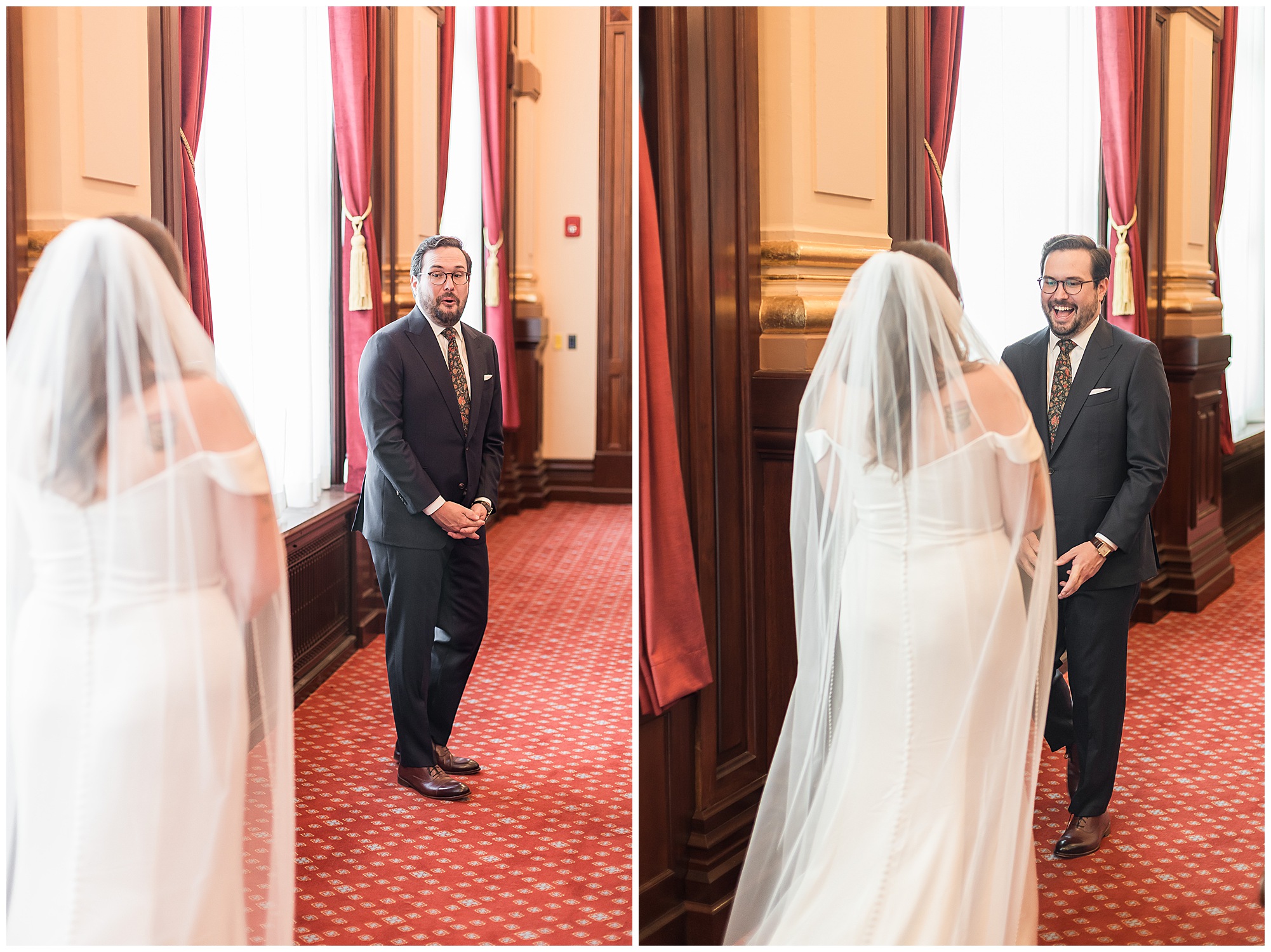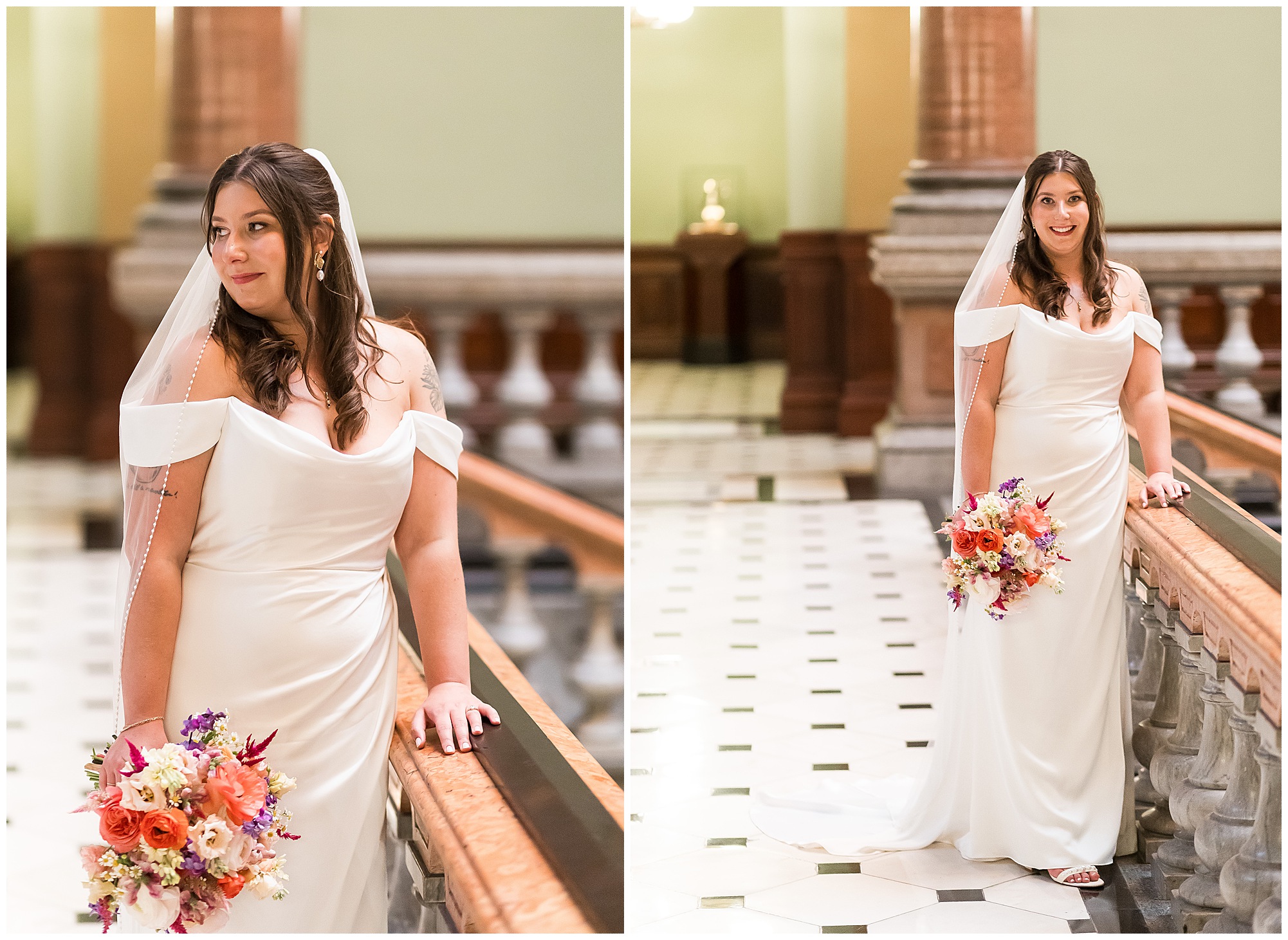 Before the ceremony, Maggie & Keenan shared one of my favorite moments of the day: their first look. And not just anywhere — they chose the breezeway next to the Illinois State Senate chambers at the Capitol. This spot held so much meaning for them since their jobs in and around the Capitol are how they met. Watching Keenan turn around and see Maggie for the first time was such a genuine, emotional moment — the kind you don’t forget. We continued photos inside the Senate chambers with their bridal party and then made our way into the rotunda, where the architecture alone feels like art. The bridesmaids’ dresses and florals added the perfect pop of color against the grand space. We had plans to step outside, but a sudden downpour had other ideas — honestly though, being “stuck” inside the Capitol wasn’t the worst backup plan. Maggie & Keenan were more than ready to be married, rain or shine, and it showed in every frame.