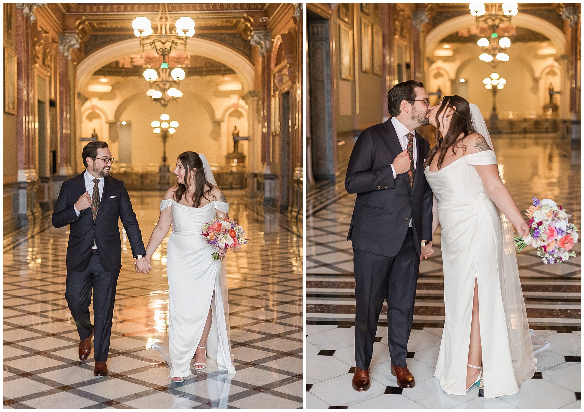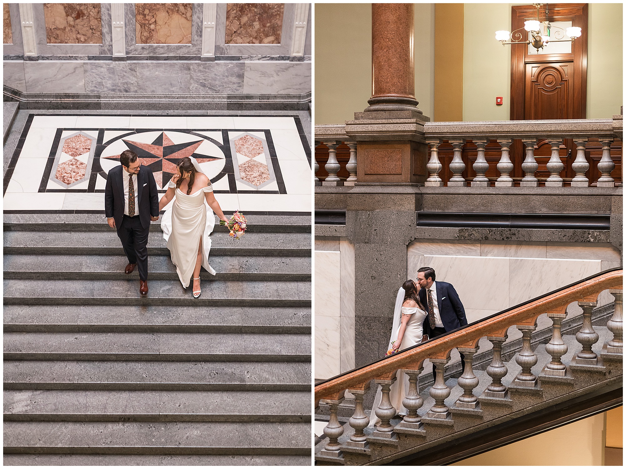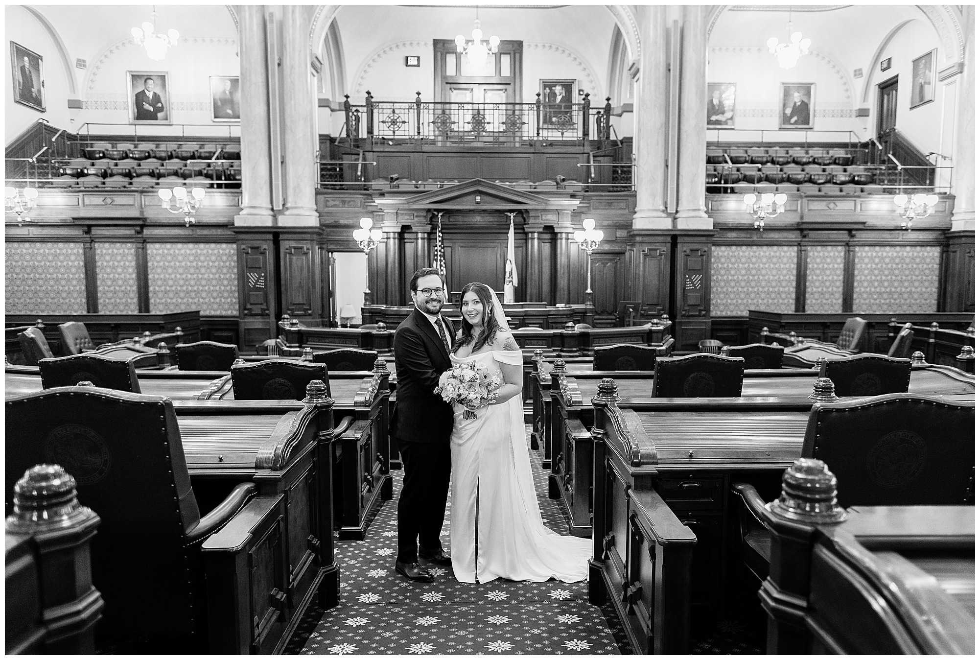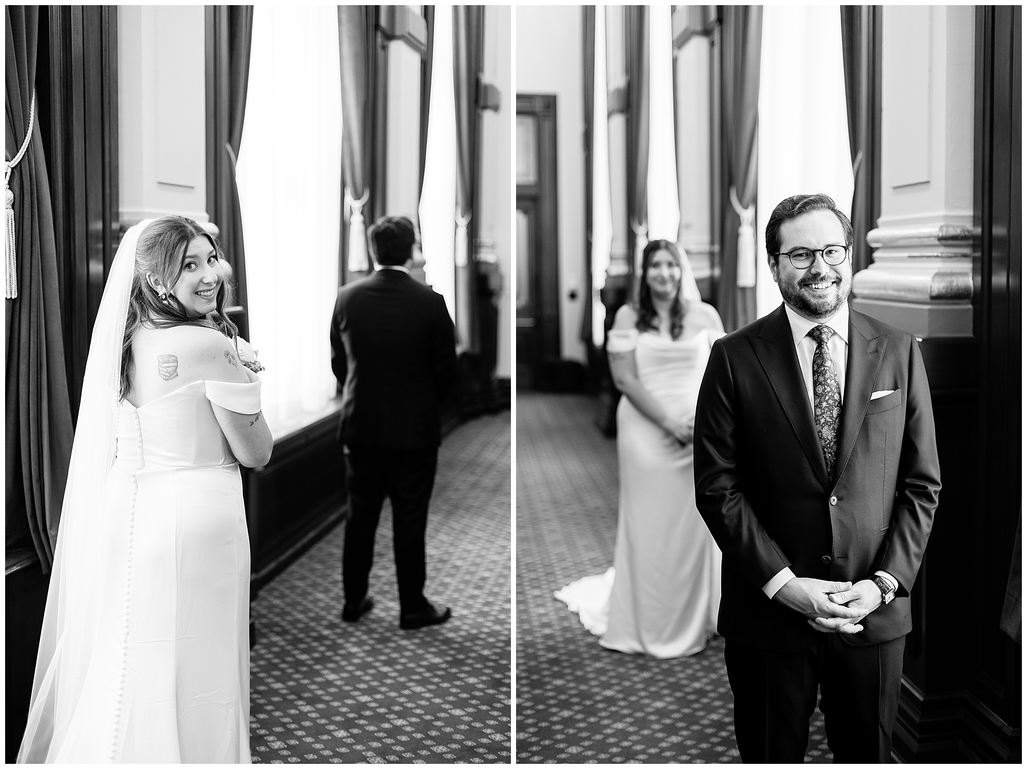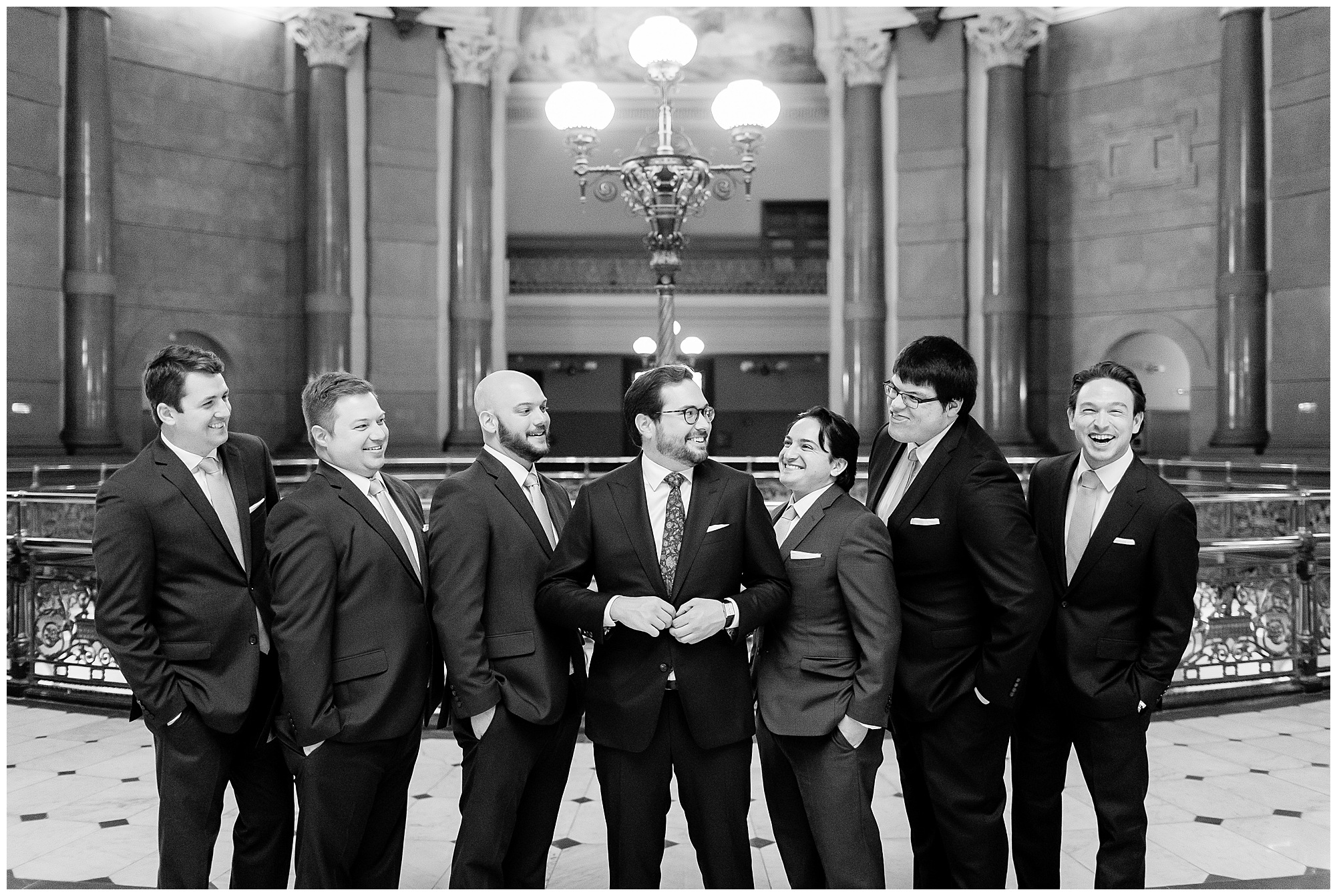Before the ceremony, Maggie & Keenan shared one of my favorite moments of the day: their first look. And not just anywhere — they chose the breezeway next to the Illinois State Senate chambers at the Capitol. This spot held so much meaning for them since their jobs in and around the Capitol are how they met. Watching Keenan turn around and see Maggie for the first time was such a genuine, emotional moment — the kind you don’t forget. We continued photos inside the Senate chambers with their bridal party and then made our way into the rotunda, where the architecture alone feels like art. The bridesmaids’ dresses and florals added the perfect pop of color against the grand space. We had plans to step outside, but a sudden downpour had other ideas — honestly though, being “stuck” inside the Capitol wasn’t the worst backup plan. Maggie & Keenan were more than ready to be married, rain or shine, and it showed in every frame.